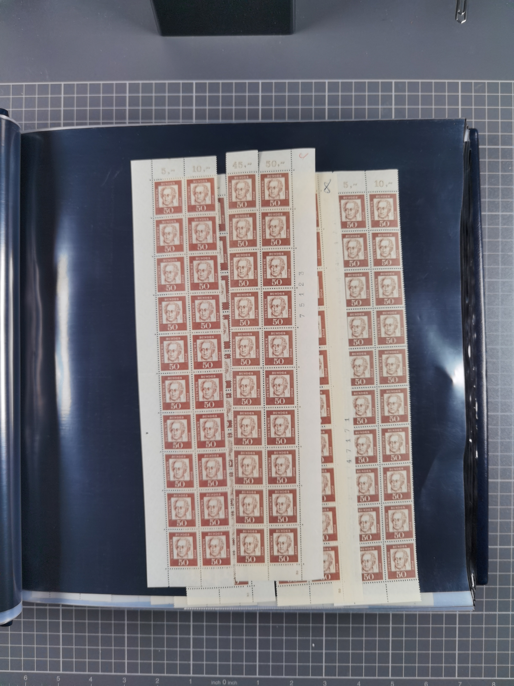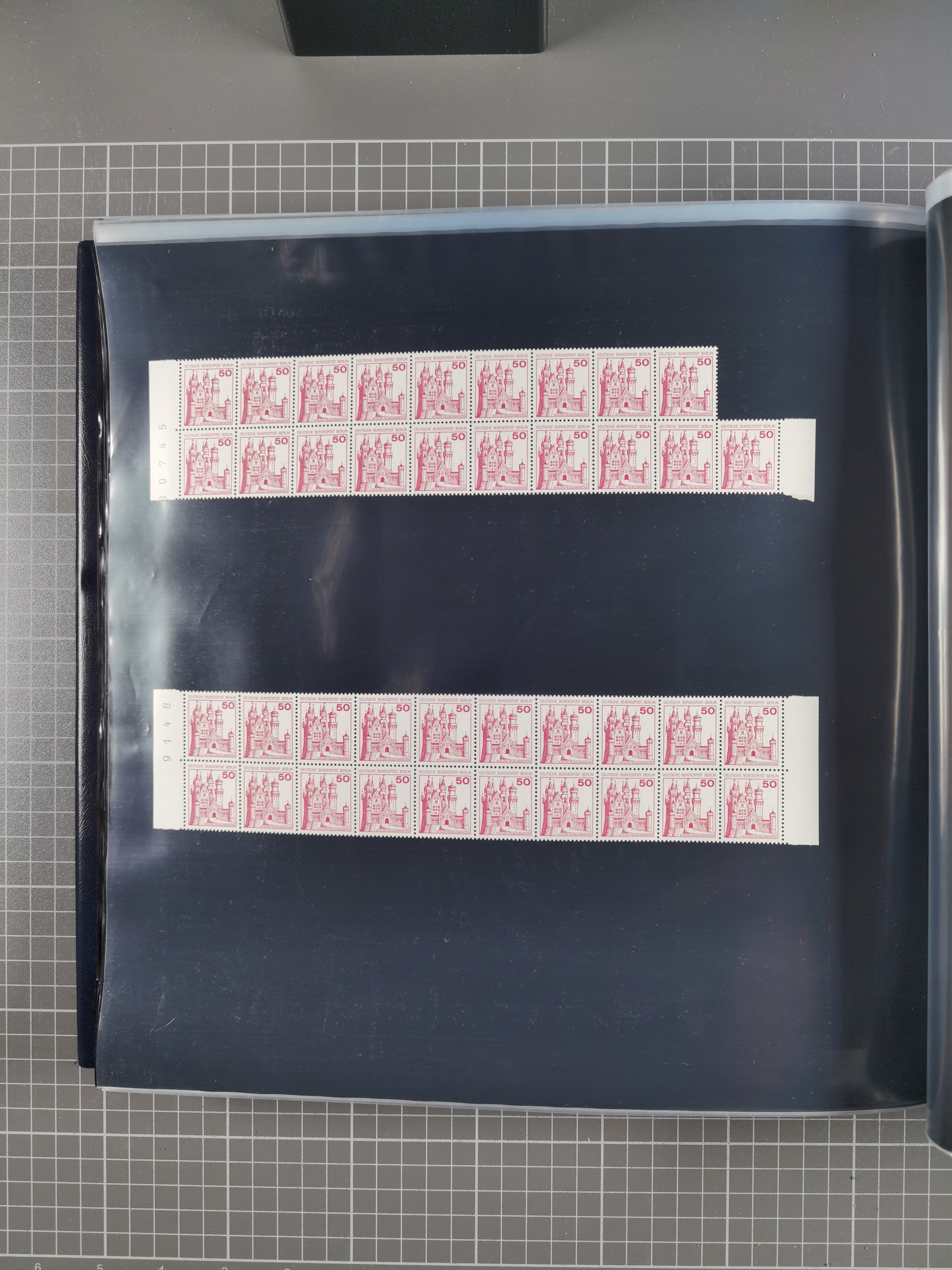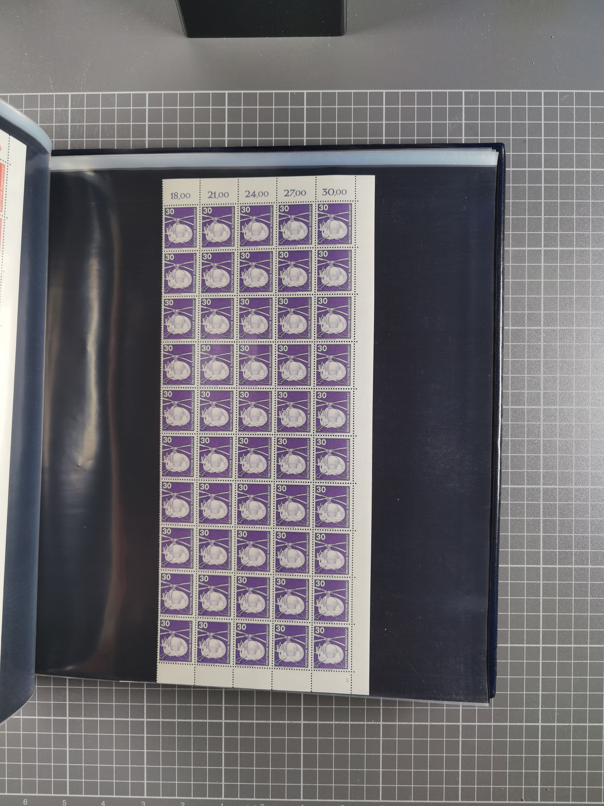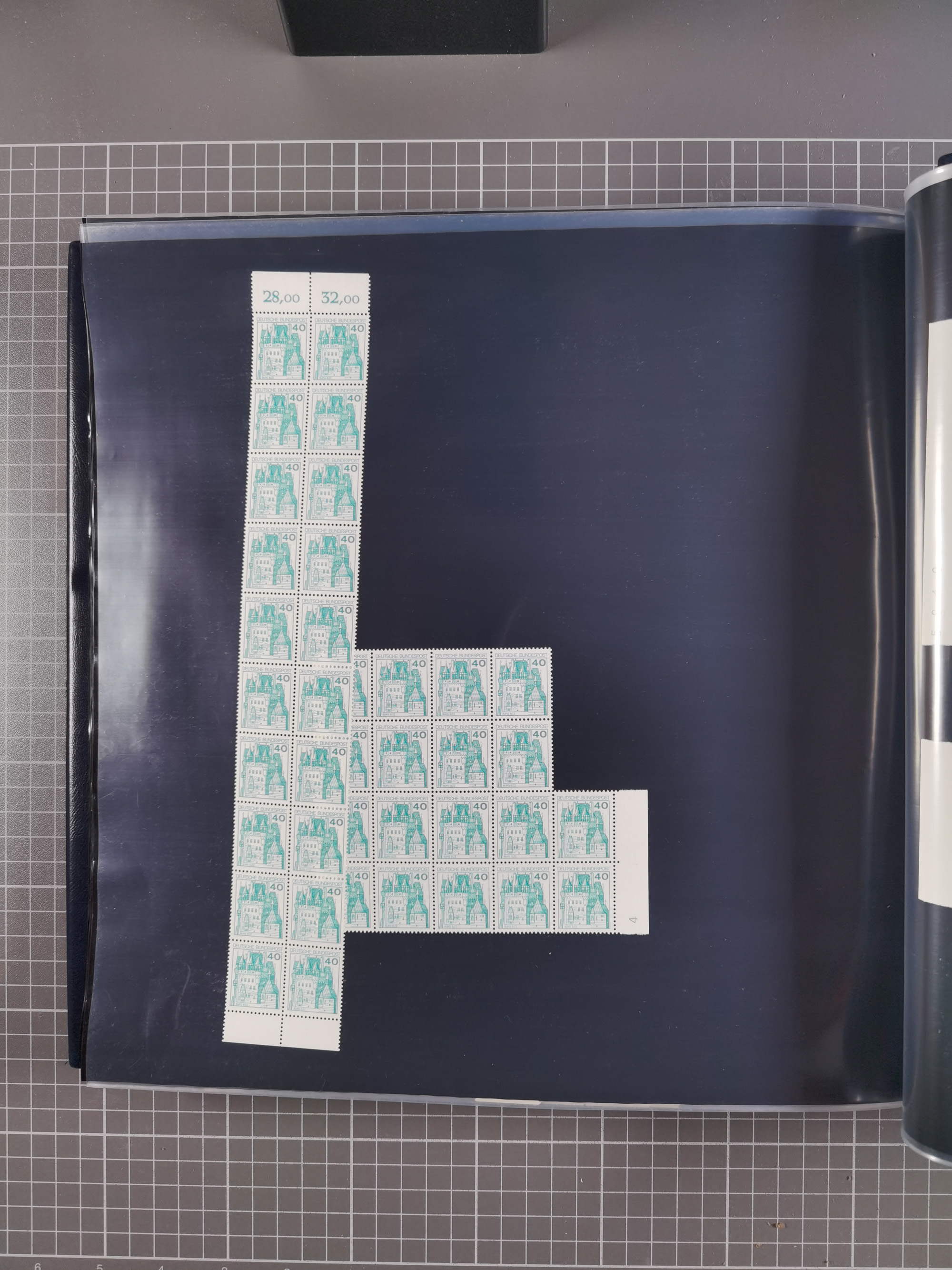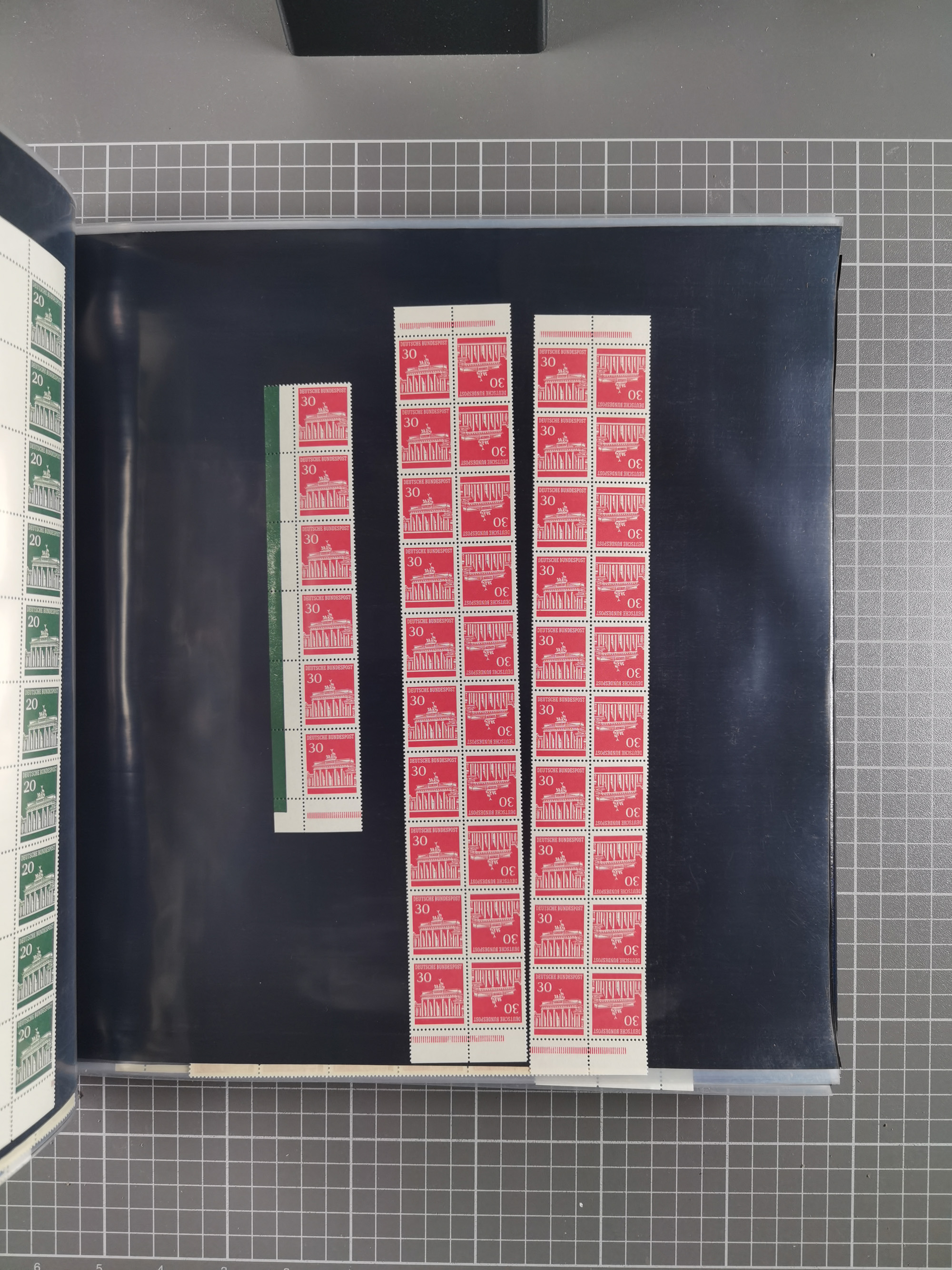 1960/75. postfrische Bogenteile der Dauerserien ab Bedeutende Deutsche, dabei Formnummern und Berlin mit u.a. Mi.-Nr. 246-49 jeweils im 20er-Bogenteil rechts mit 10 waagerechten Paaren, in Bogenmappe