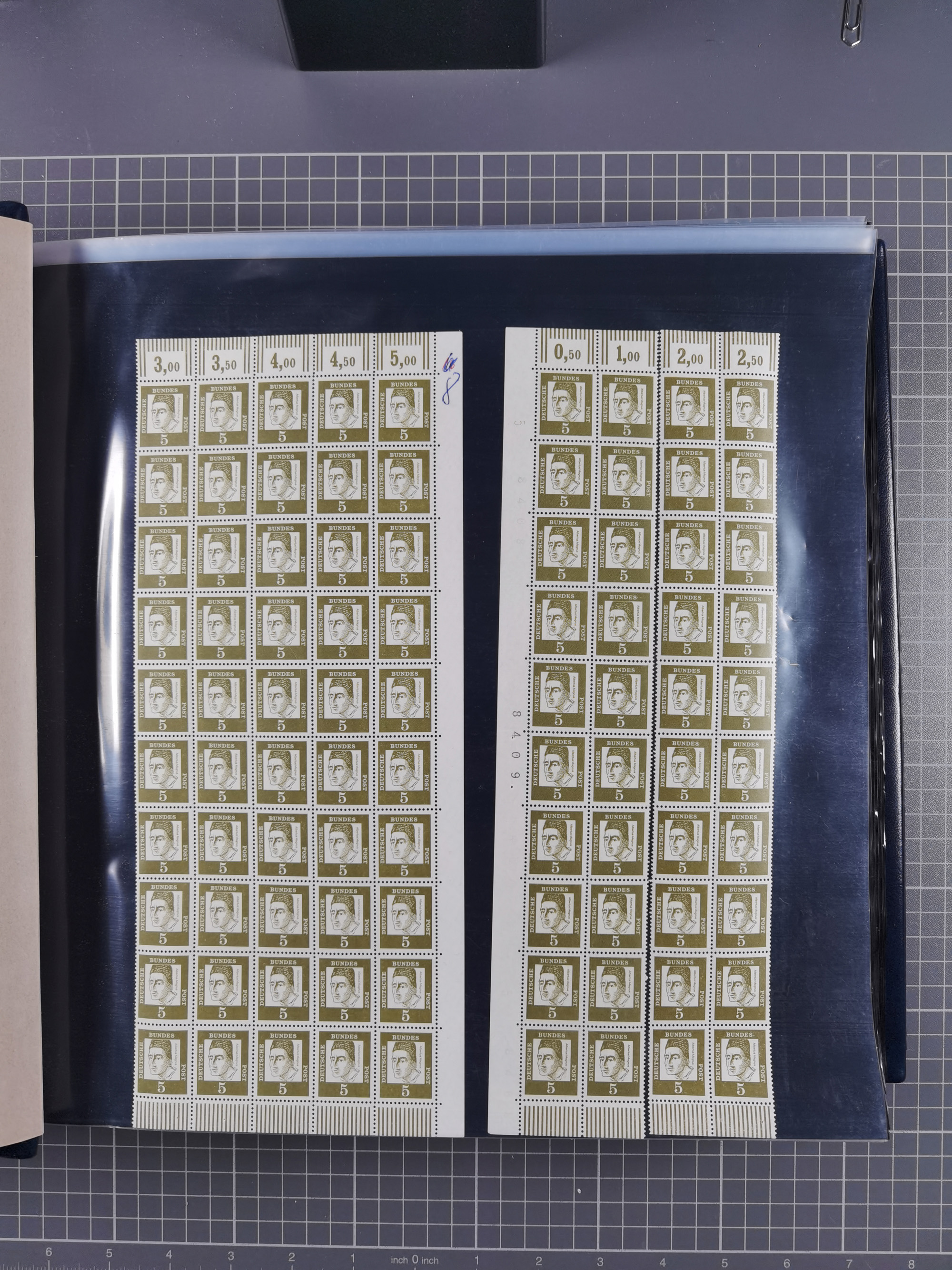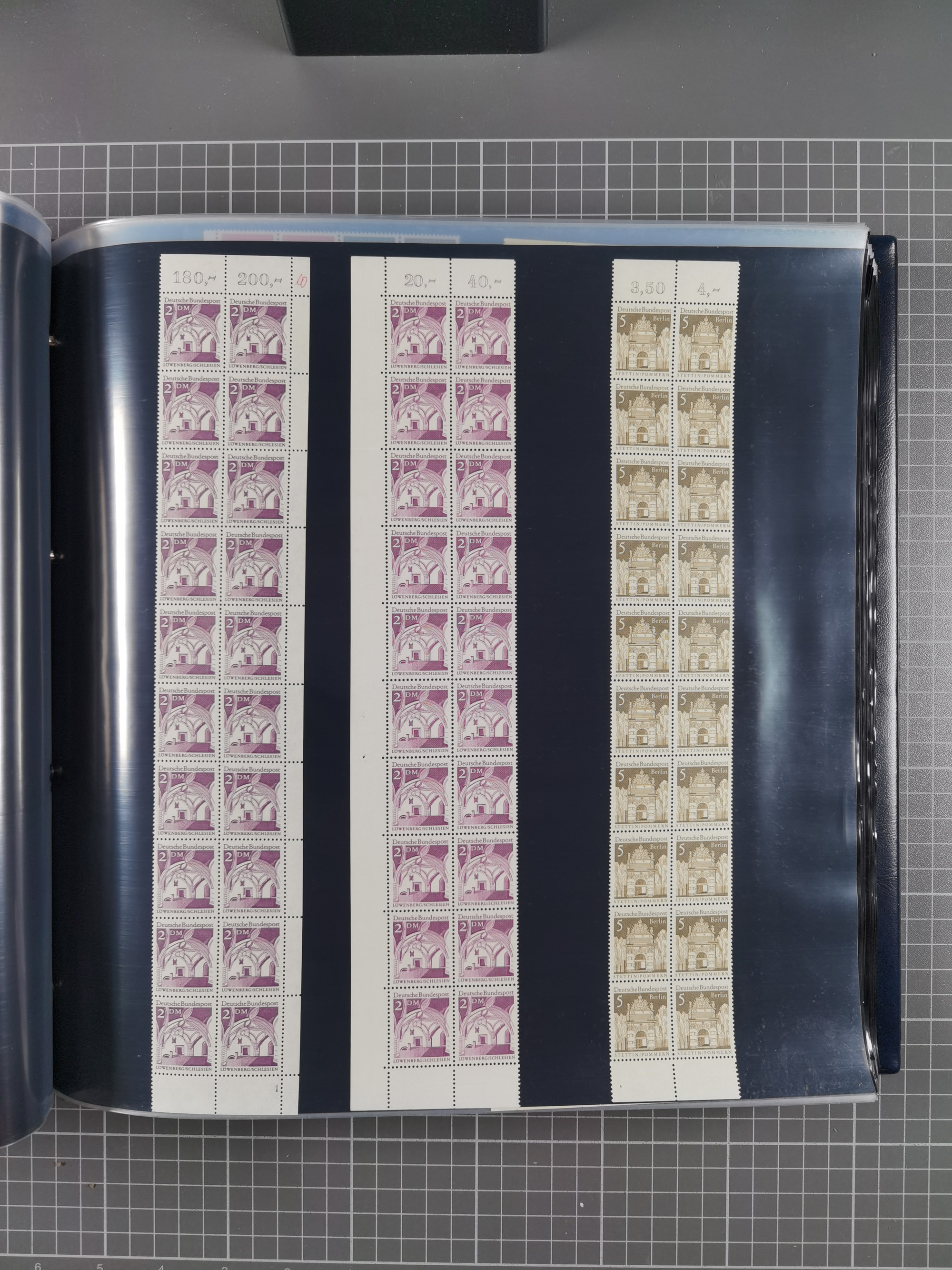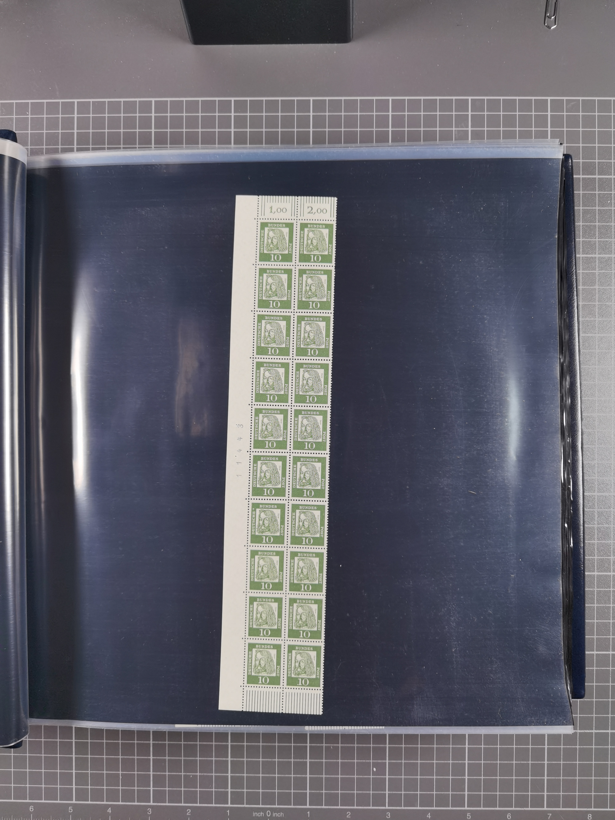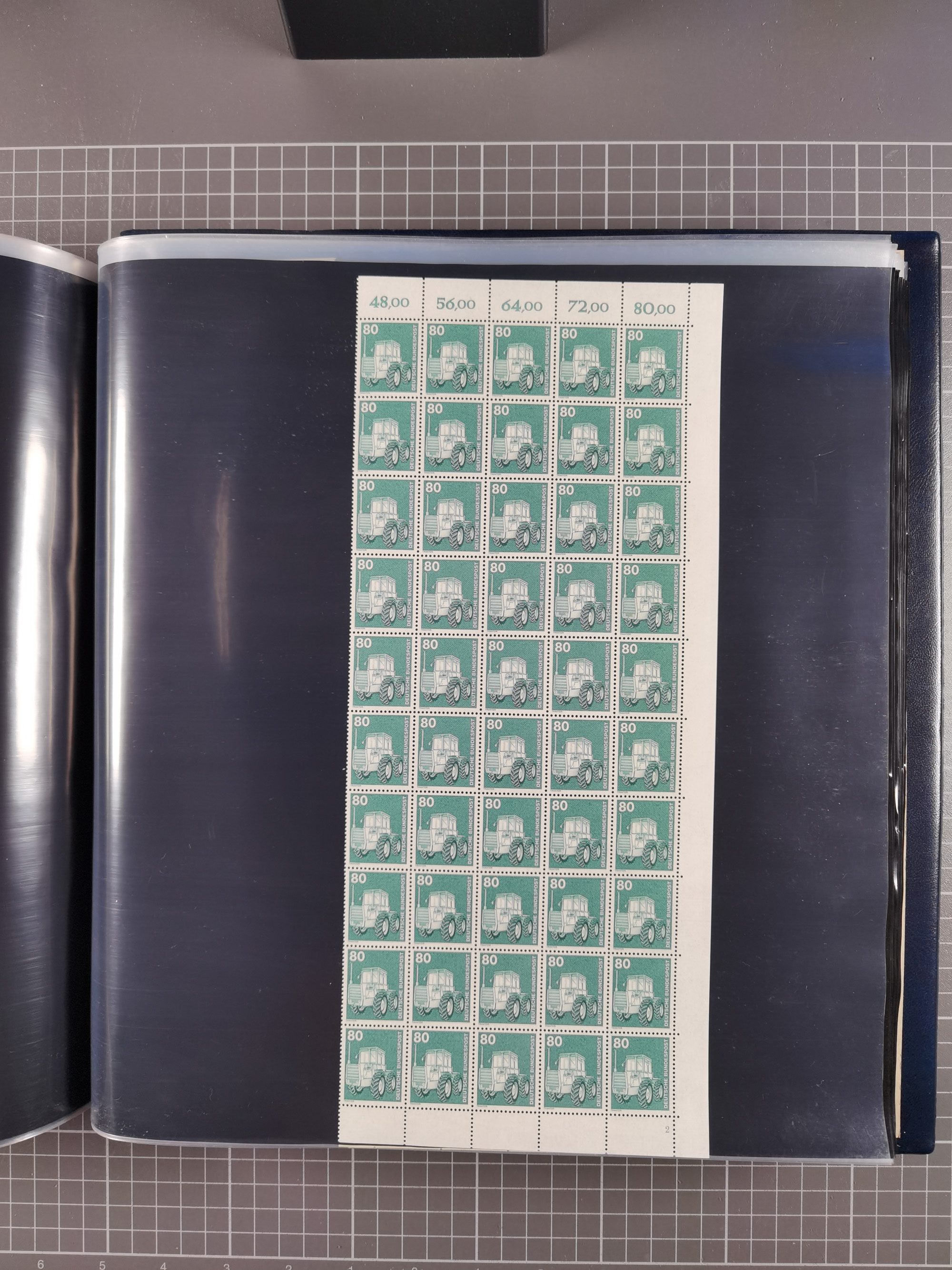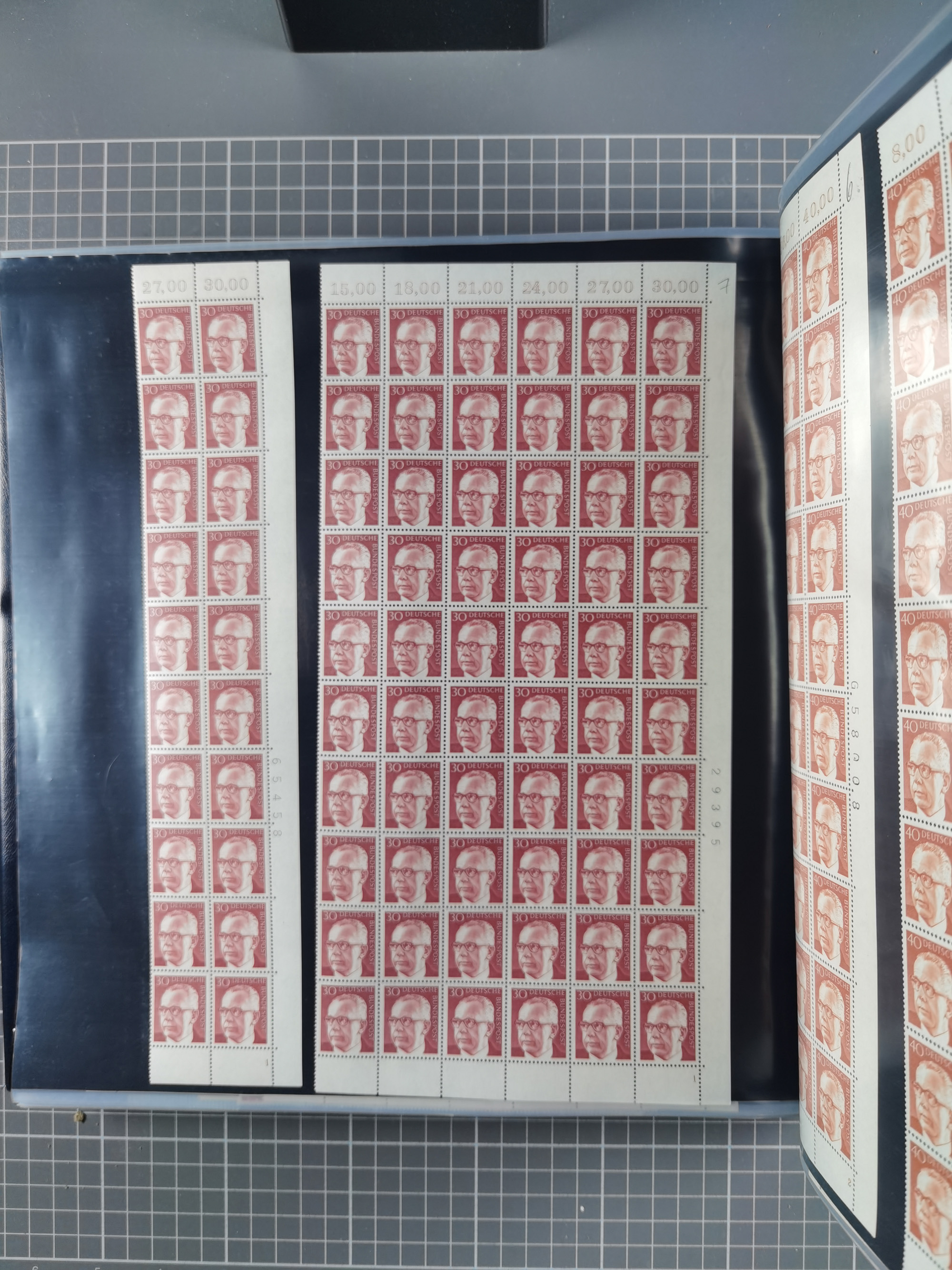 1960/75. postfrische Bogenteile der Dauerserien ab Bedeutende Deutsche, dabei Formnummern und Berlin mit u.a. Mi.-Nr. 246-49 jeweils im 20er-Bogenteil rechts mit 10 waagerechten Paaren, in Bogenmappe
