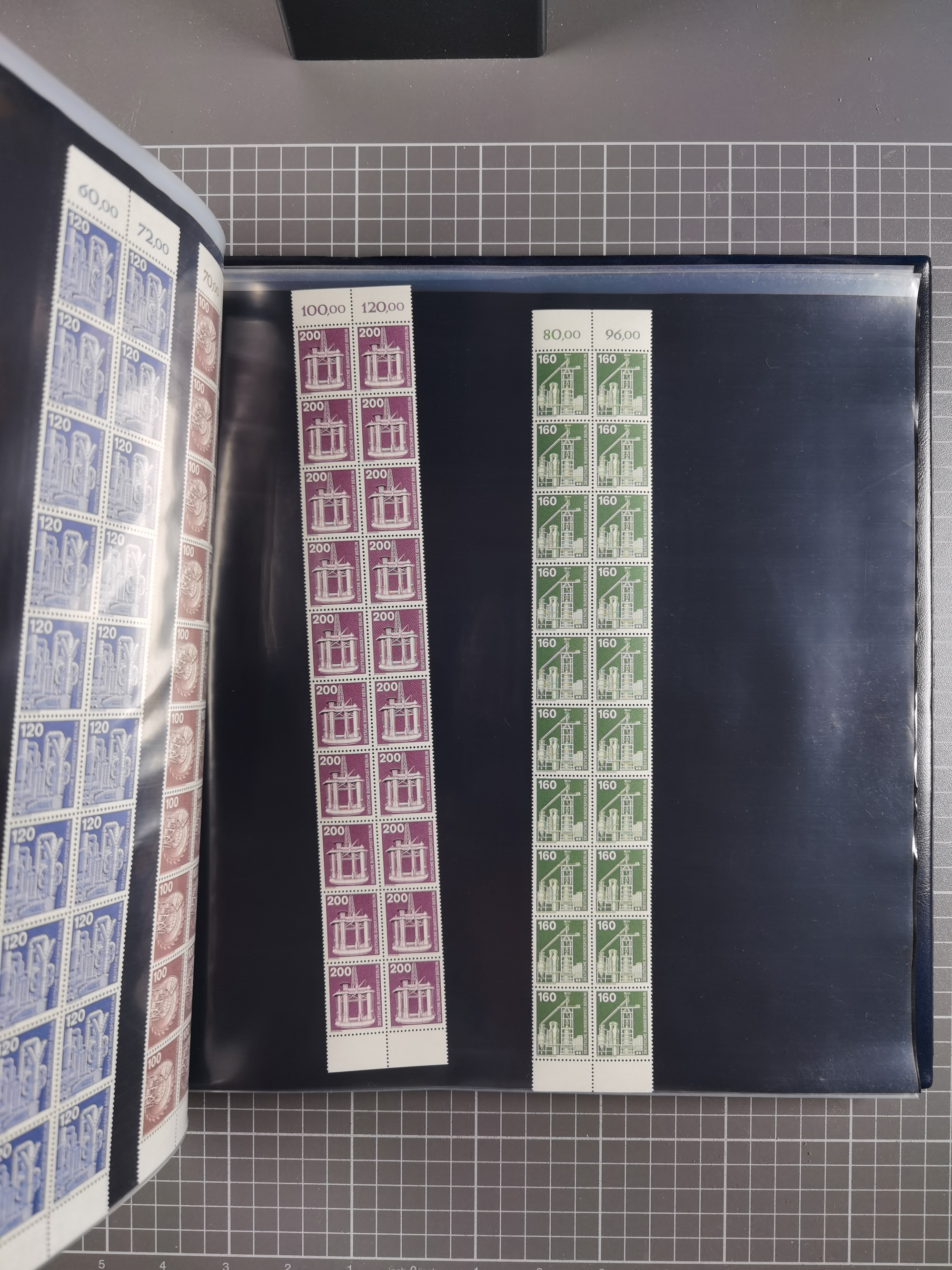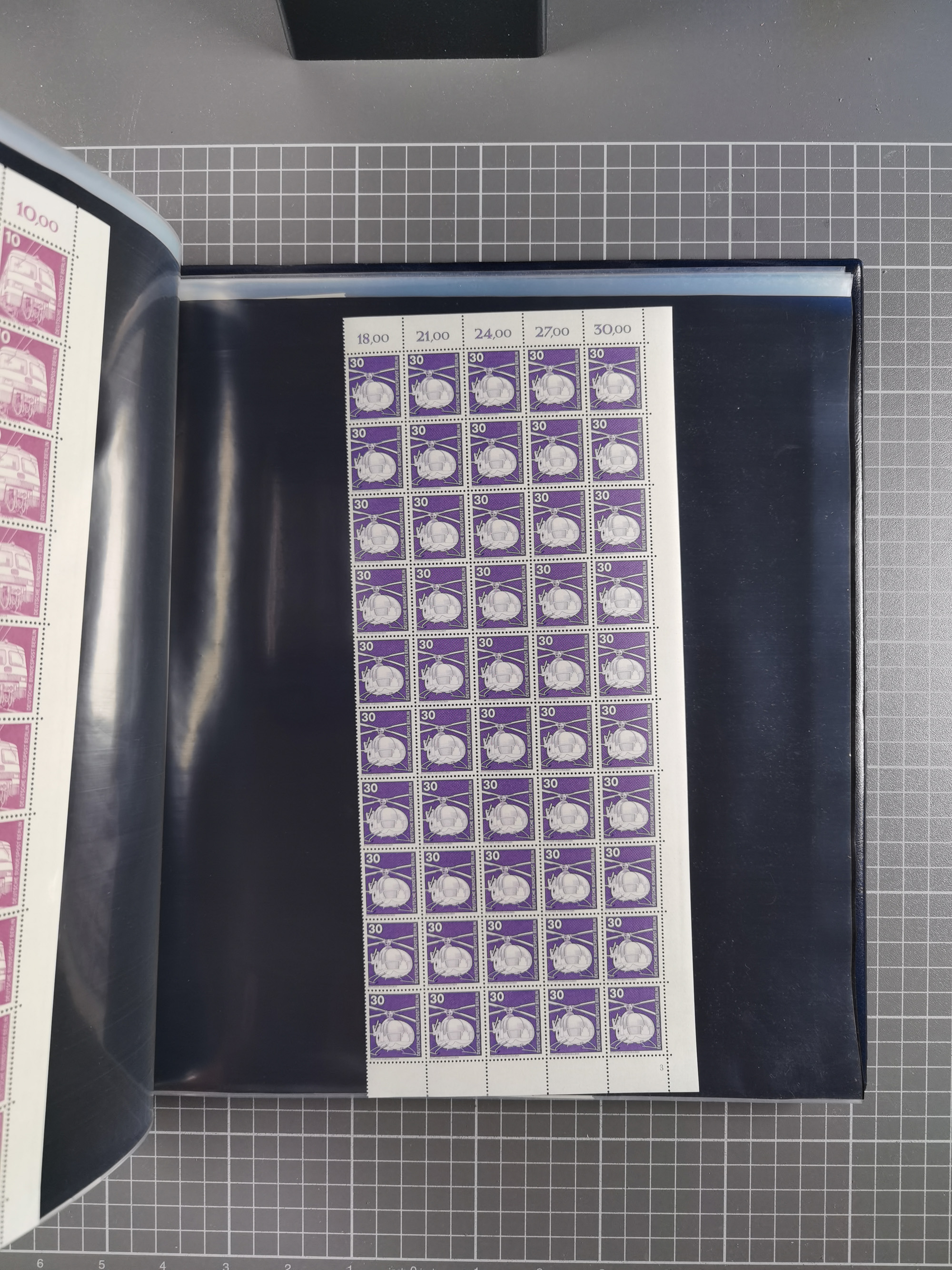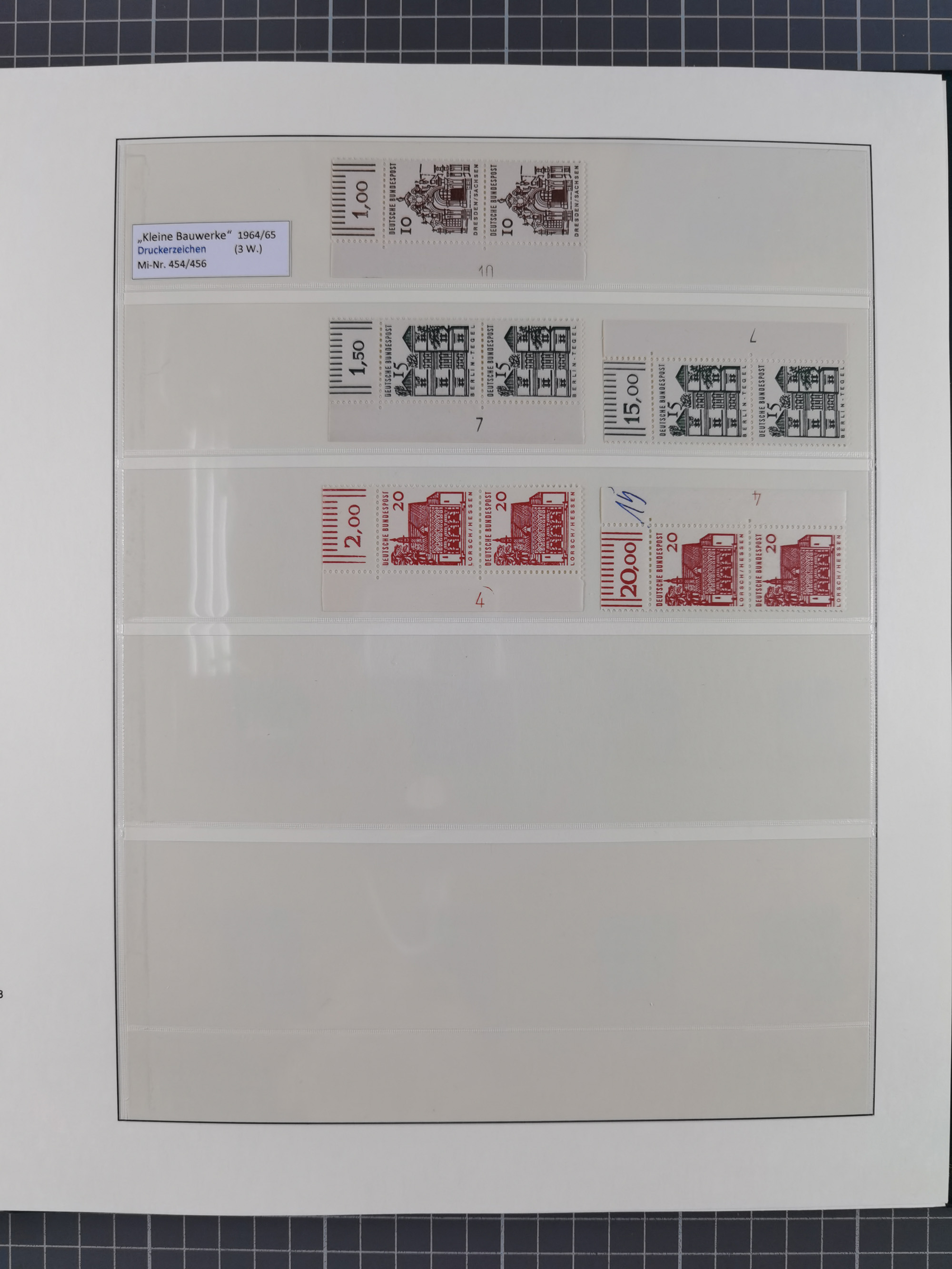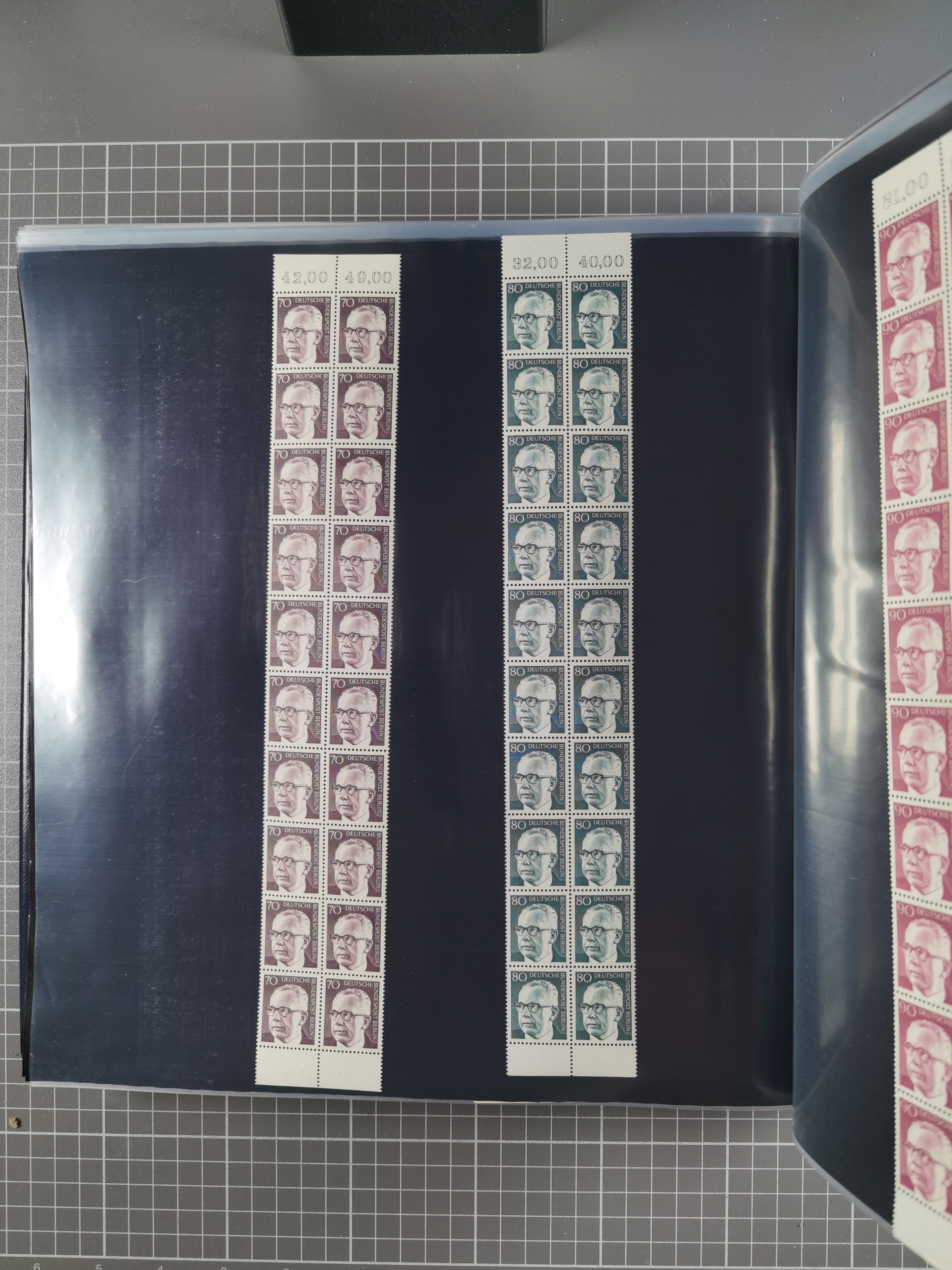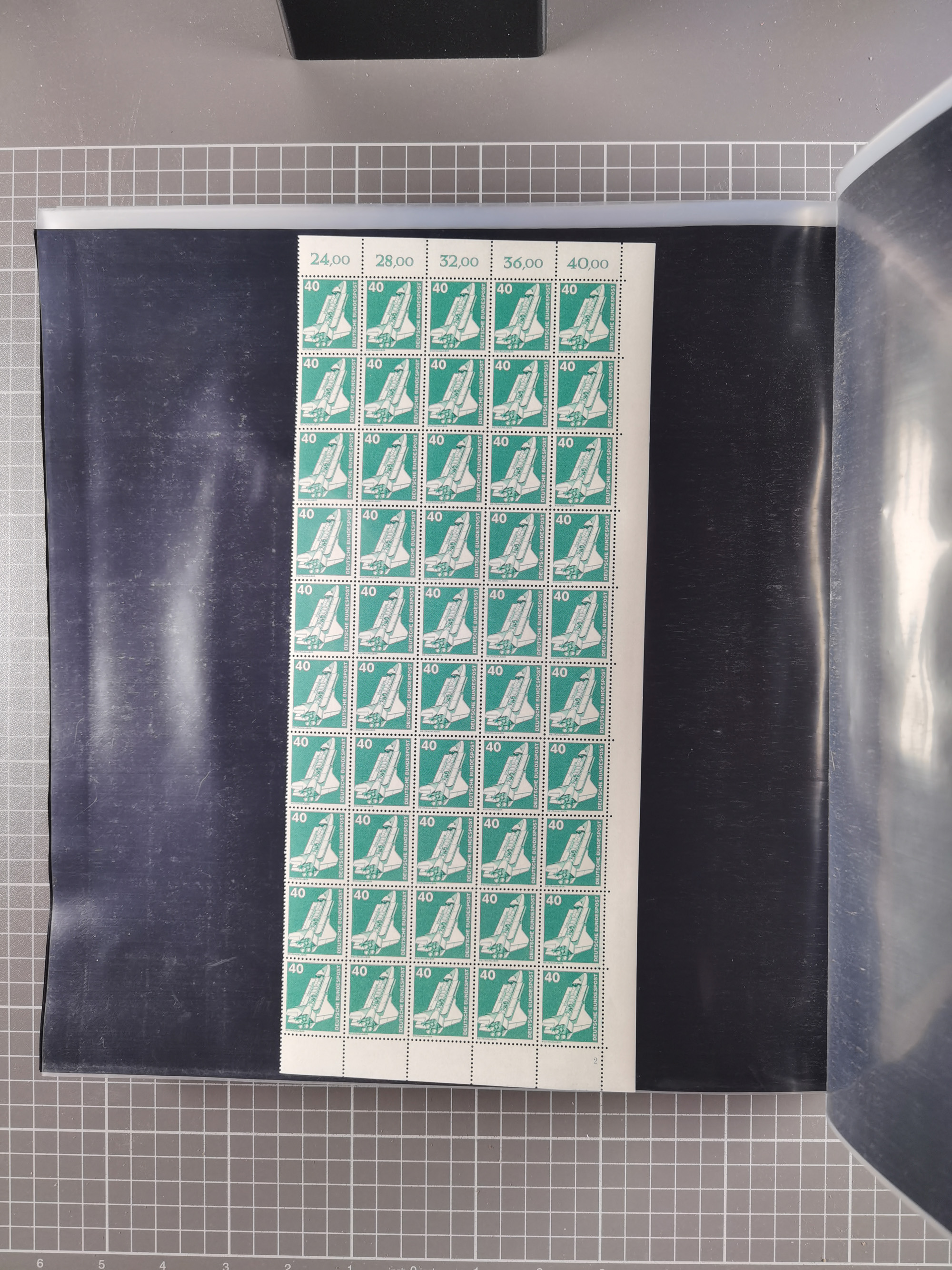 1960/75. postfrische Bogenteile der Dauerserien ab Bedeutende Deutsche, dabei Formnummern und Berlin mit u.a. Mi.-Nr. 246-49 jeweils im 20er-Bogenteil rechts mit 10 waagerechten Paaren, in Bogenmappe