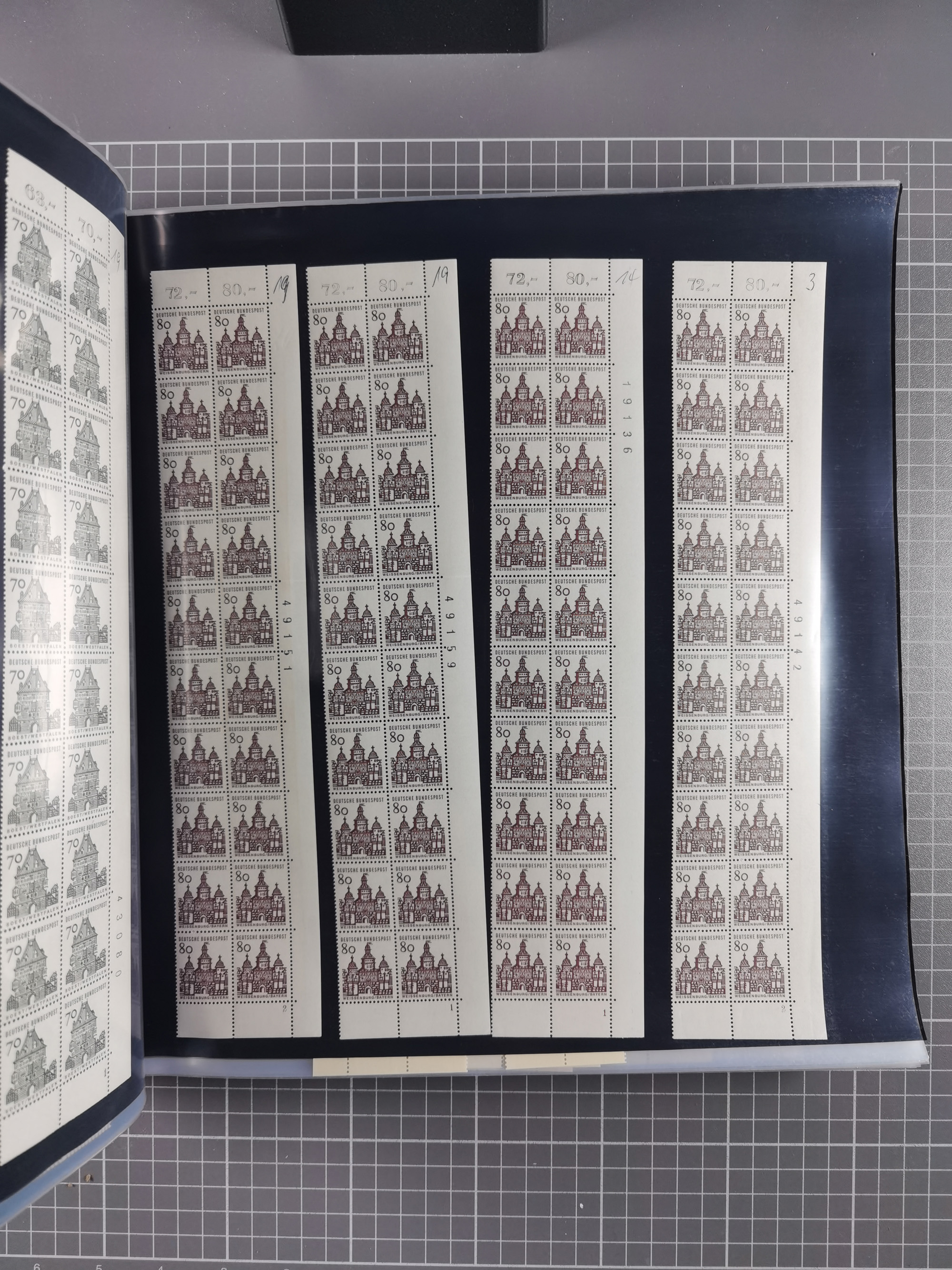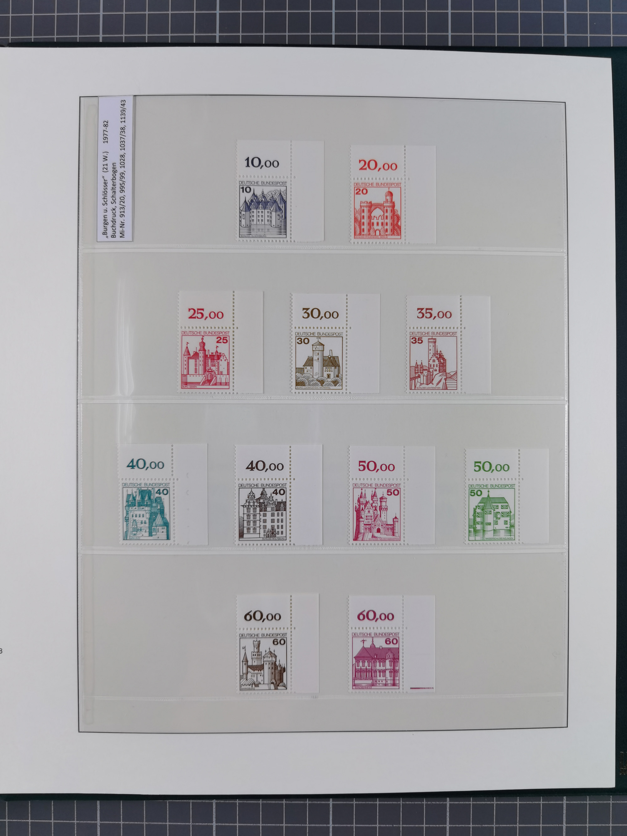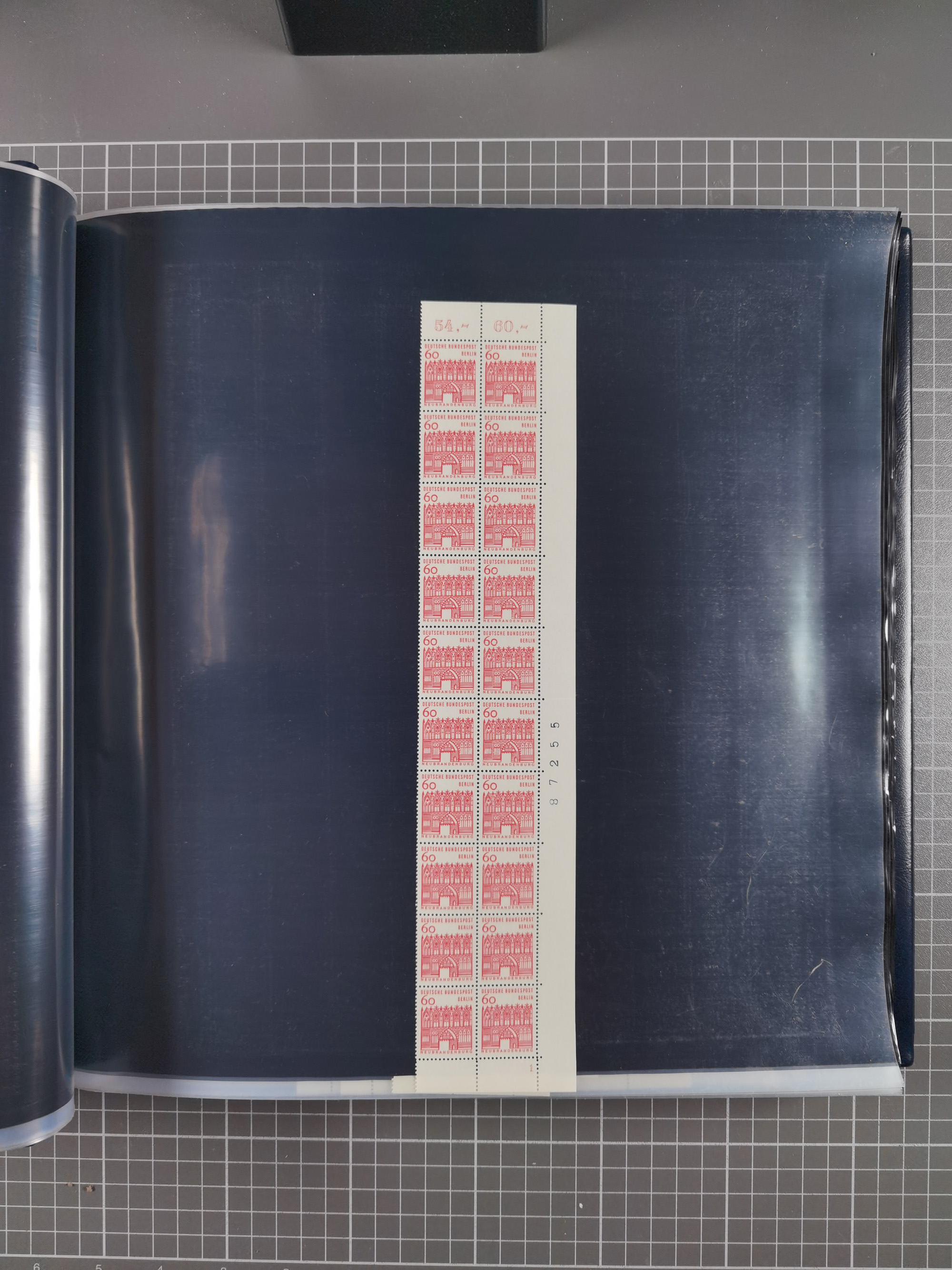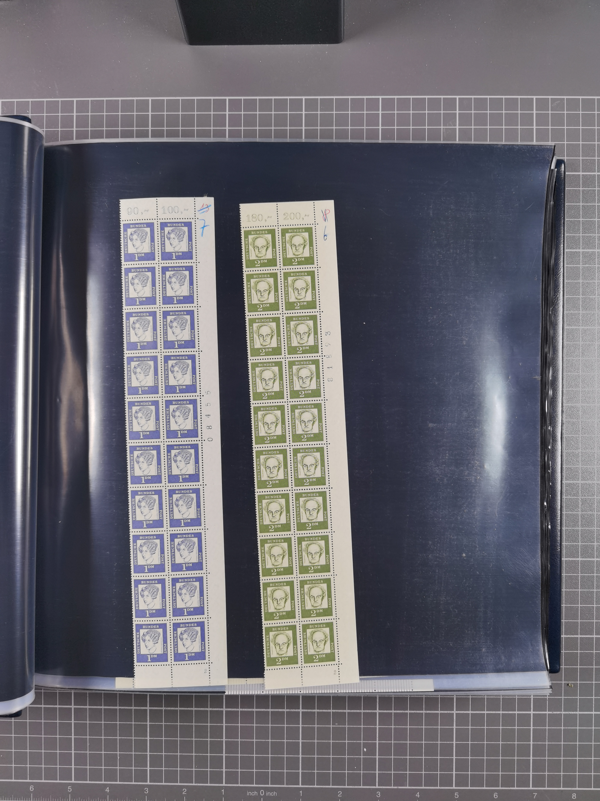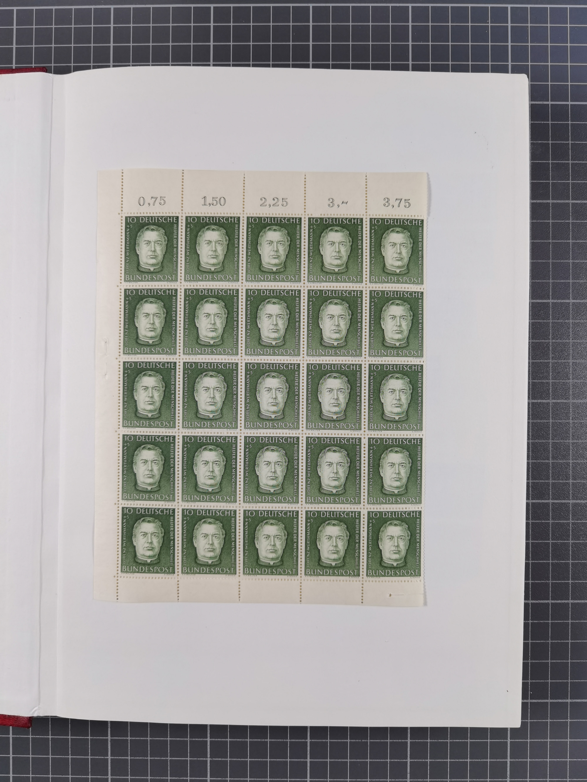 1960/75. postfrische Bogenteile der Dauerserien ab Bedeutende Deutsche, dabei Formnummern und Berlin mit u.a. Mi.-Nr. 246-49 jeweils im 20er-Bogenteil rechts mit 10 waagerechten Paaren, in Bogenmappe