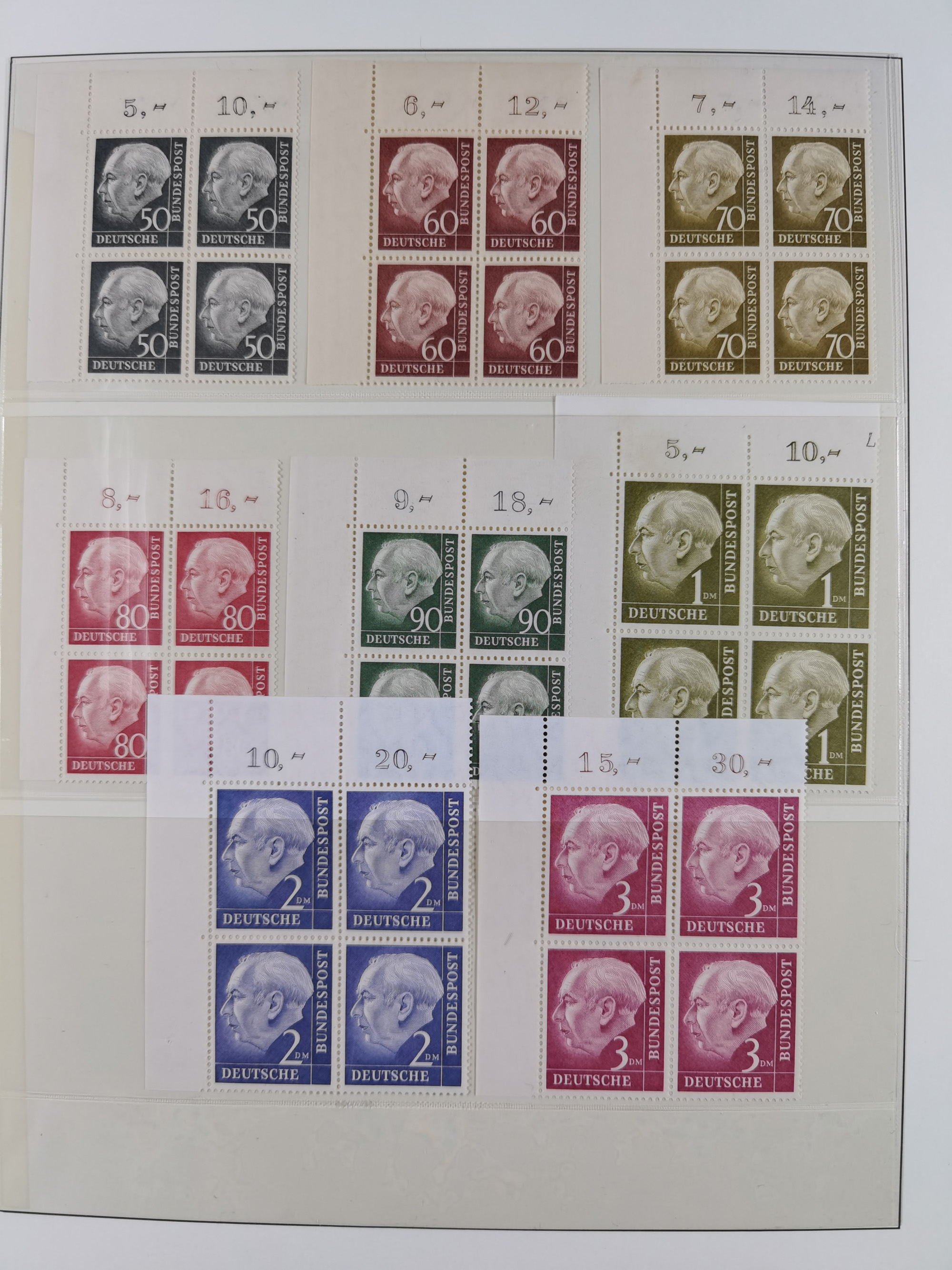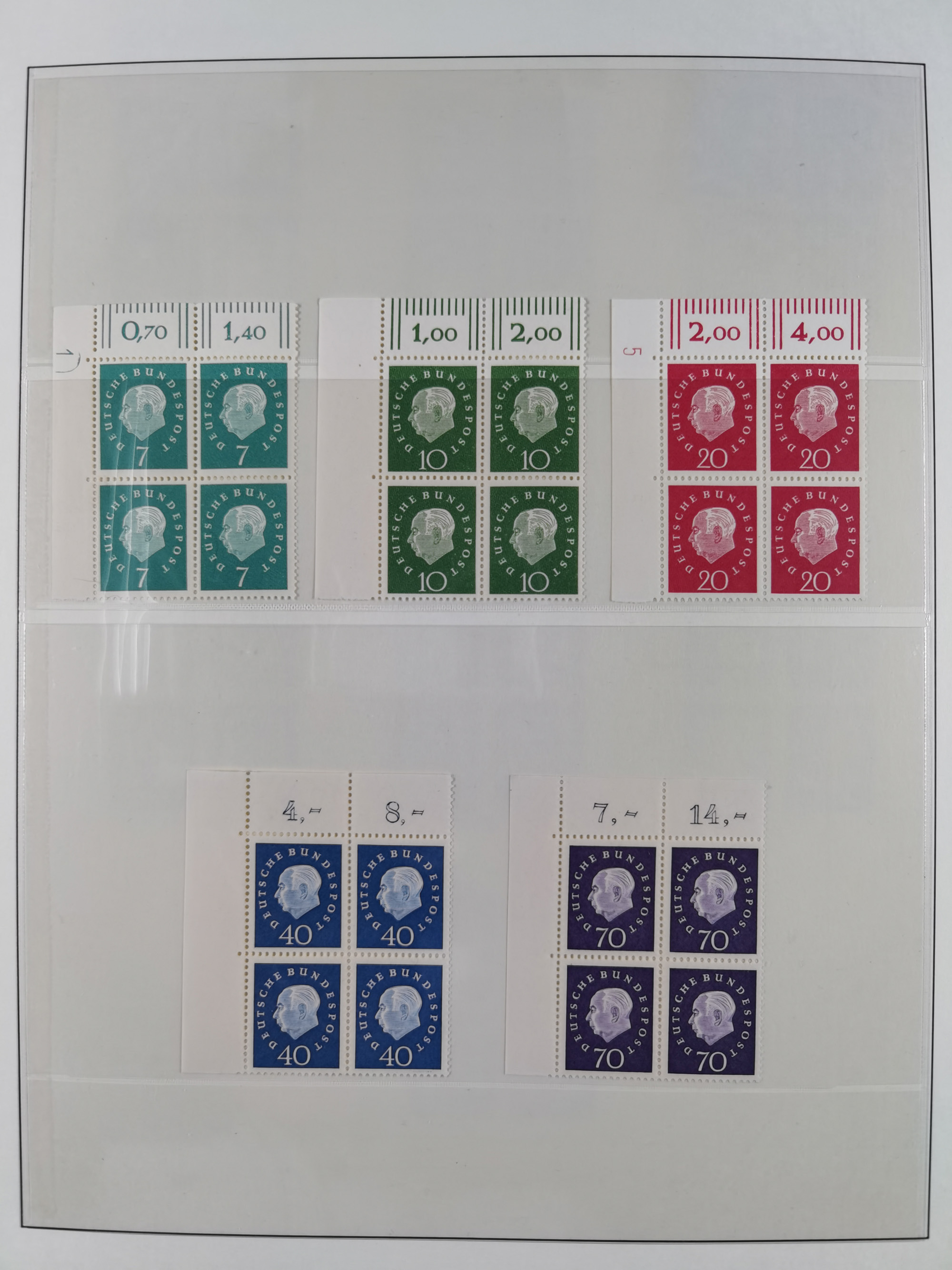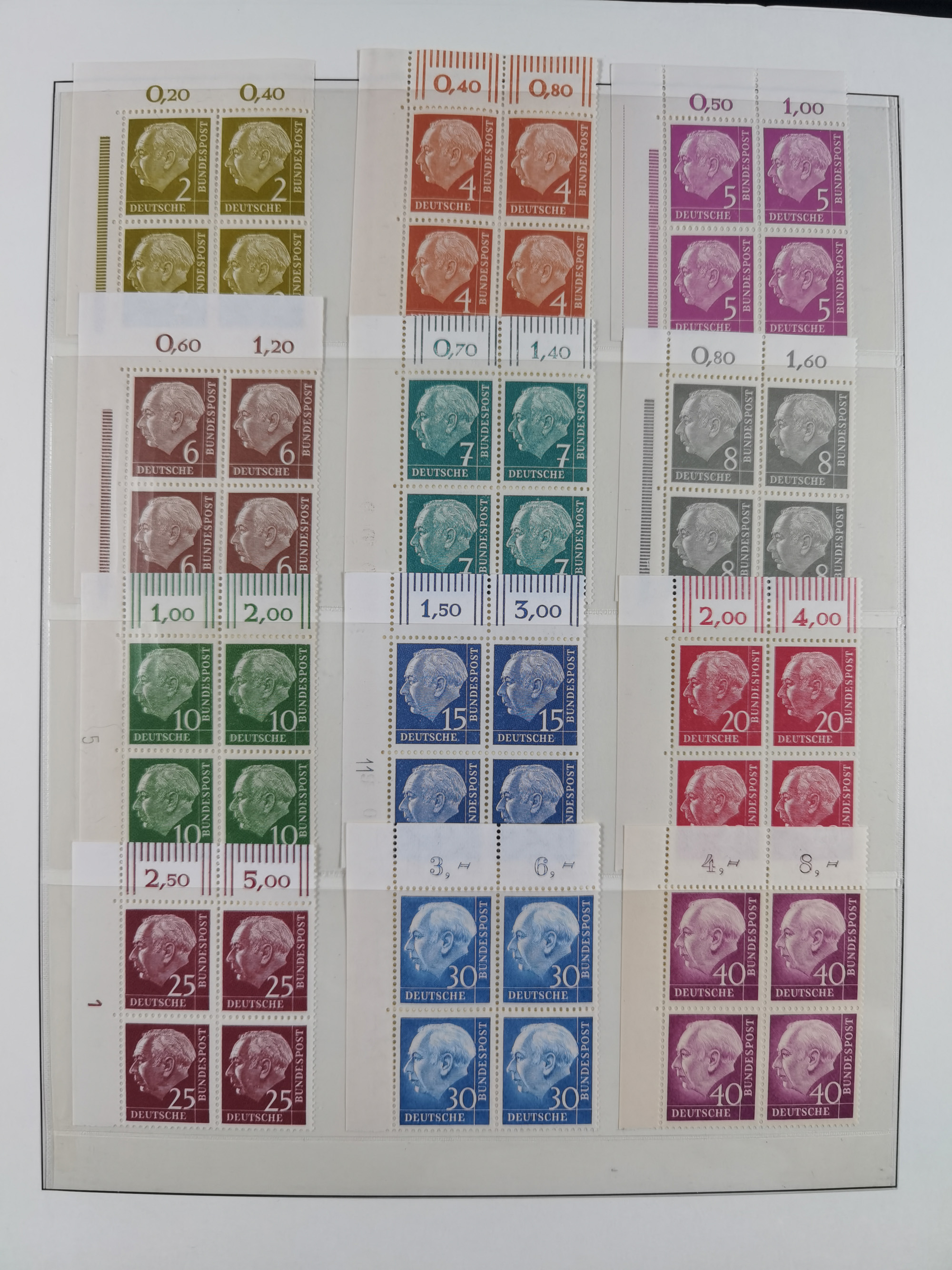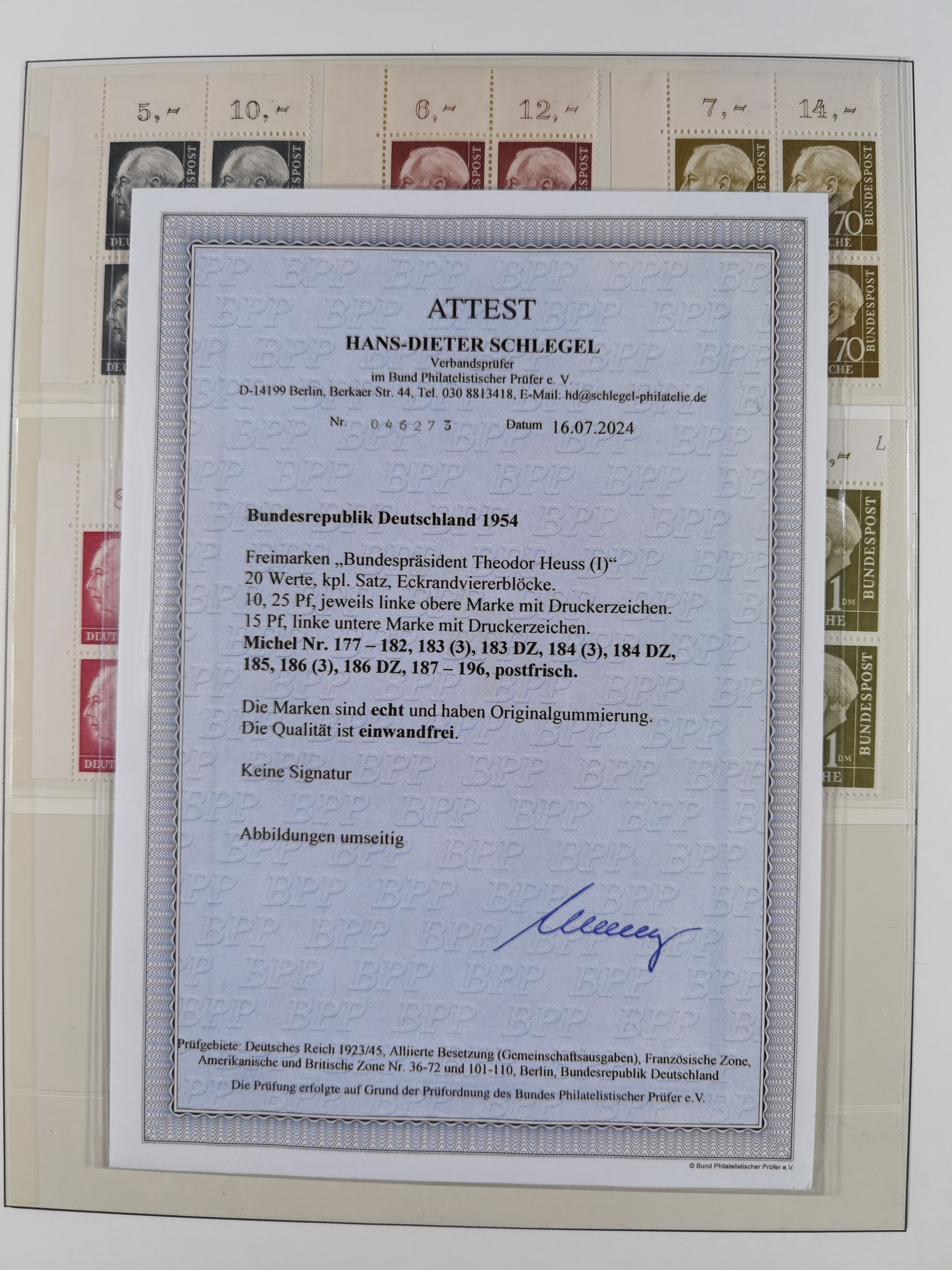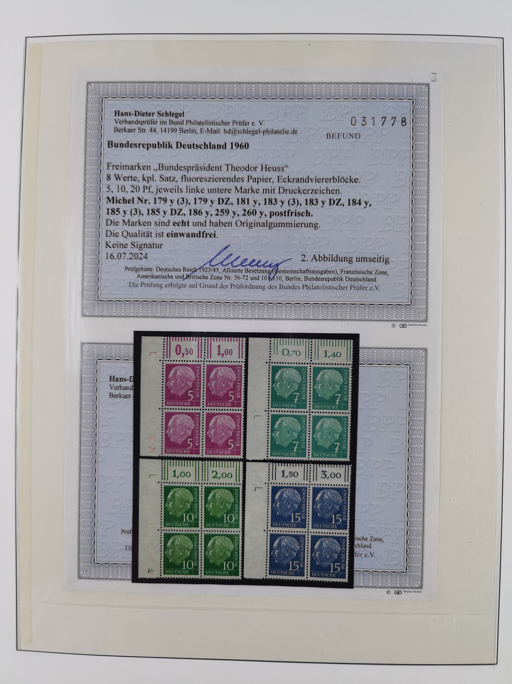 1951/94, postfrische Sammlung Dauerserien, dabei Posthorn in waagerechten oder senkrechten Paaren mit 3 Attesten und 6 Befunden A. Schlegel BPP, Heuss I Eckrandviererblocks, teils mit Druckerzeichen (Attest H.-D. Schlegel BPP). Heuss lumogen mit DZ Befund H.-D. Schlegel BPP. Heuss II Befund H-D Schlegel BPP. Danach Heuss III bis bedeutende Frauen 1994 alles Eckrandviererblocks oben links mit vielen Druckerzeichen und sonstigen Randbesonderheiten, im Lindner-Falzlosalbum.