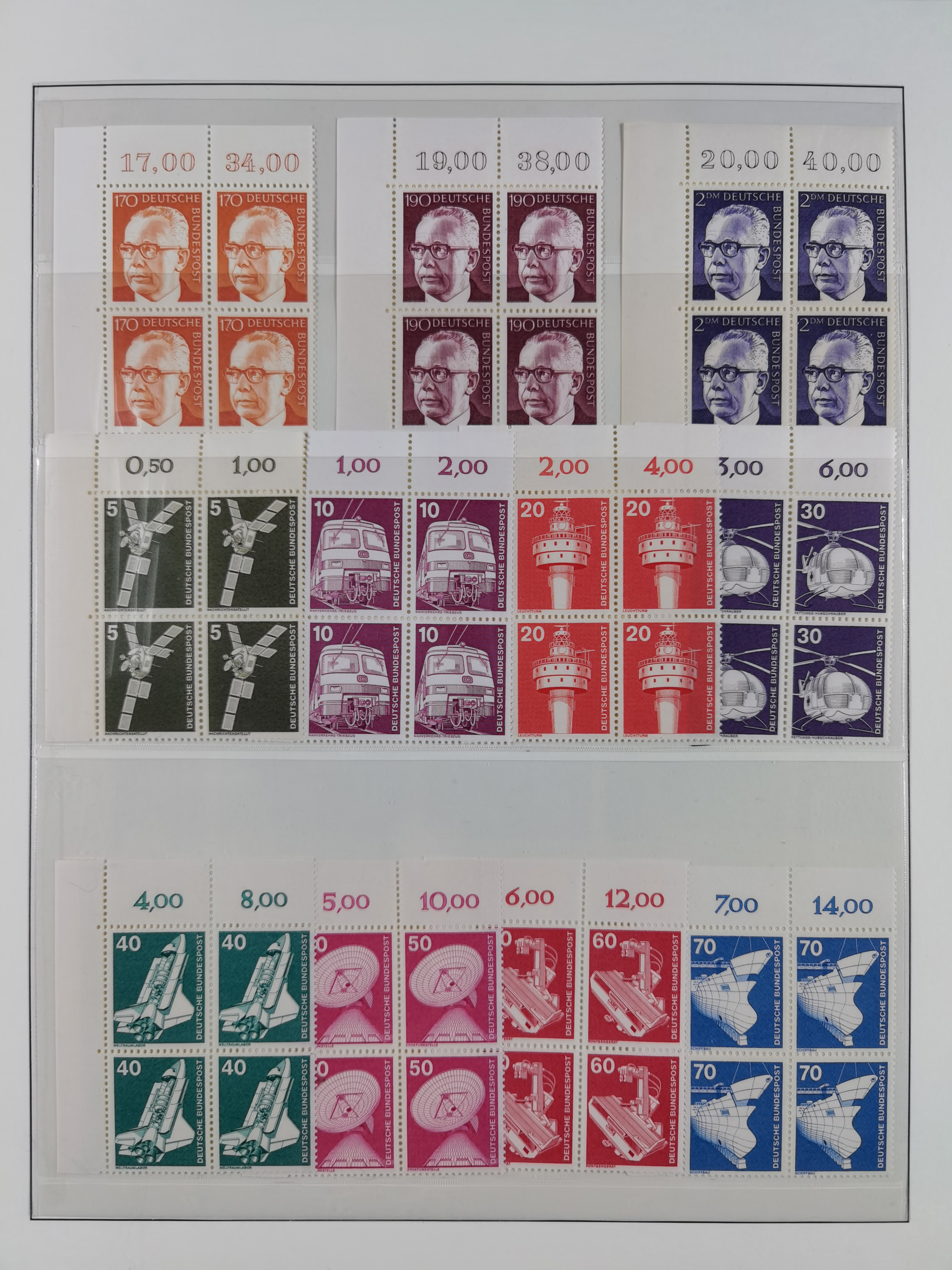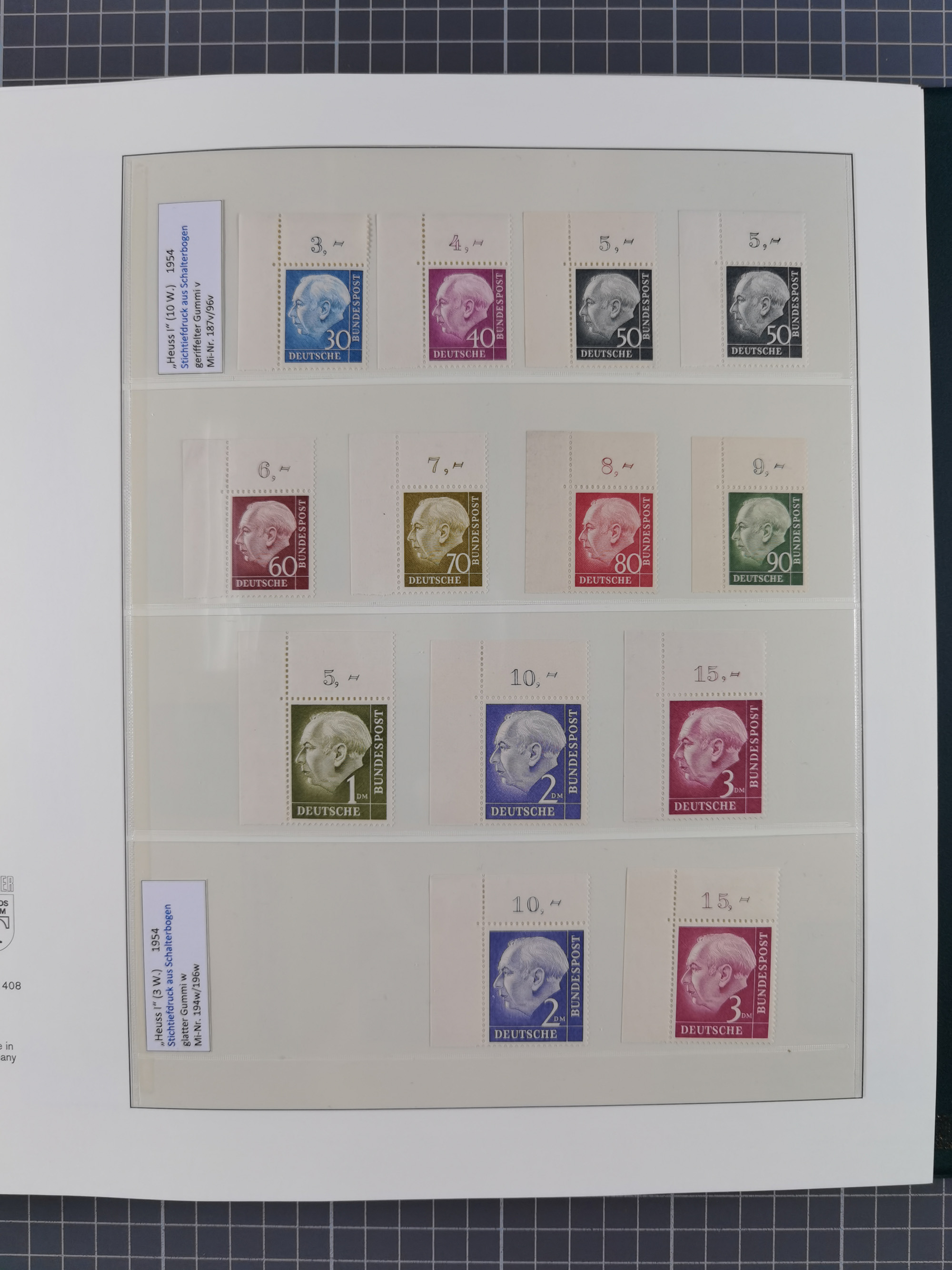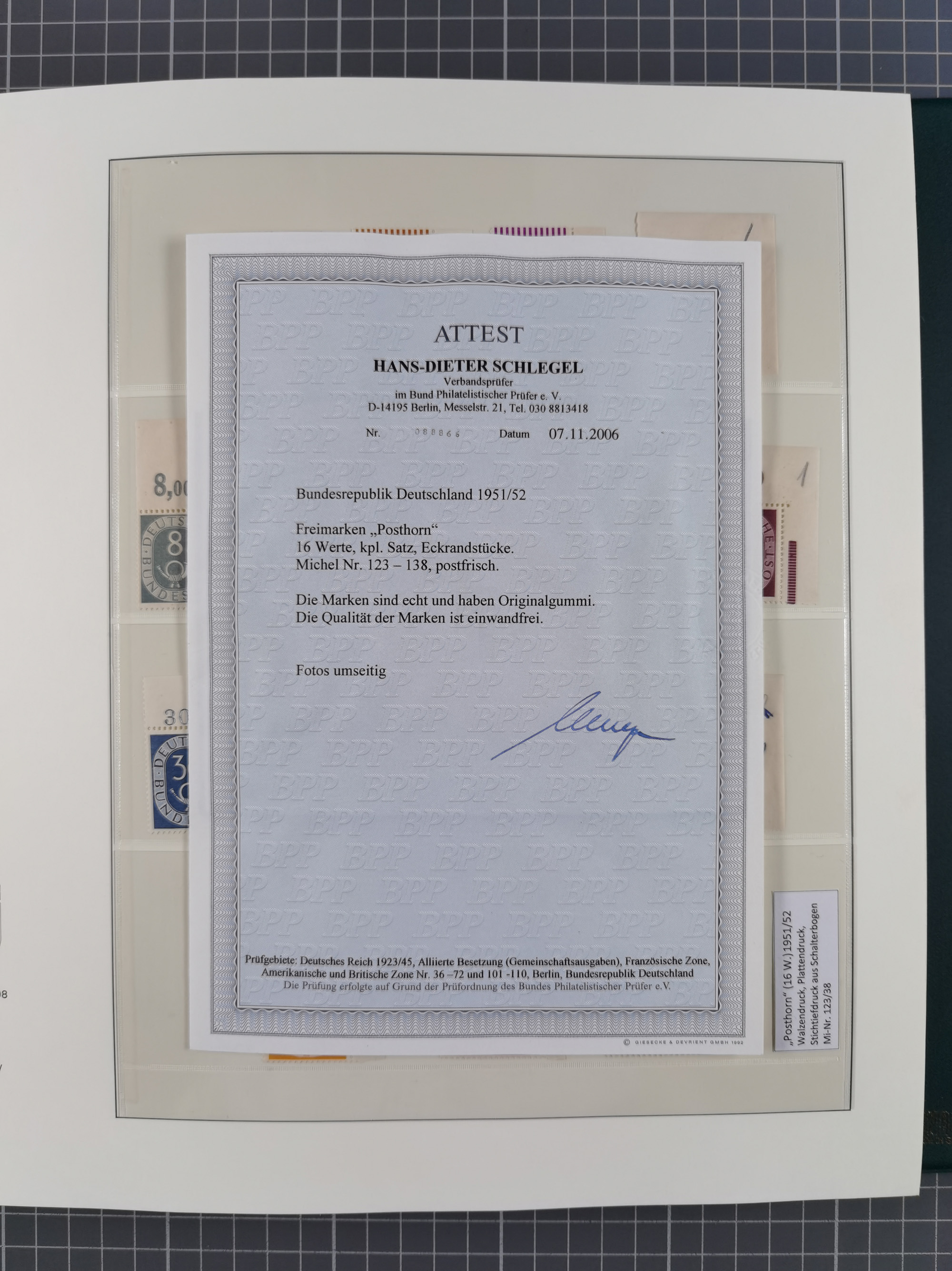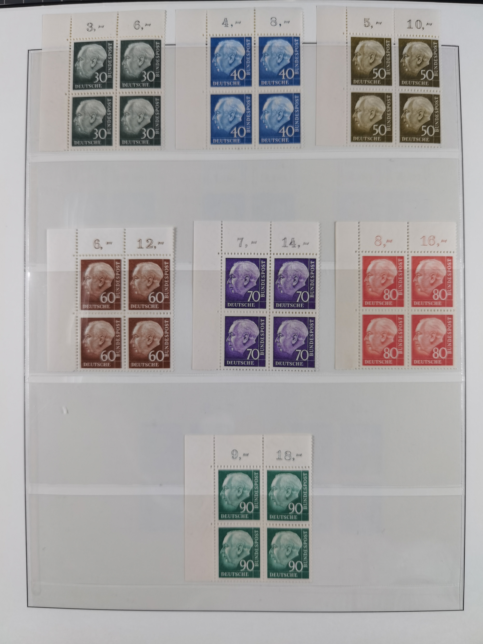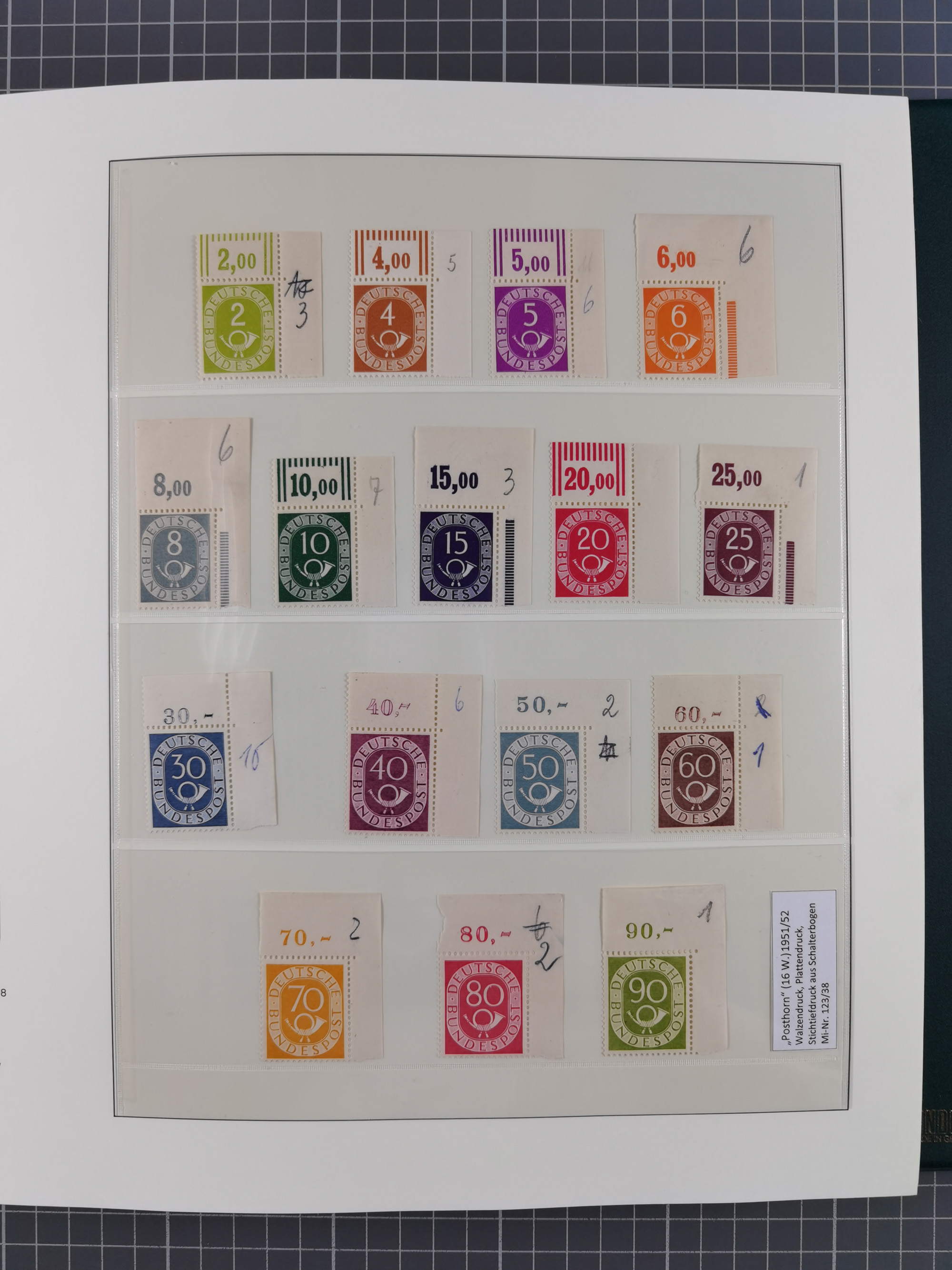 1951/94, postfrische Sammlung Dauerserien, dabei Posthorn in waagerechten oder senkrechten Paaren mit 3 Attesten und 6 Befunden A. Schlegel BPP, Heuss I Eckrandviererblocks, teils mit Druckerzeichen (Attest H.-D. Schlegel BPP). Heuss lumogen mit DZ Befund H.-D. Schlegel BPP. Heuss II Befund H-D Schlegel BPP. Danach Heuss III bis bedeutende Frauen 1994 alles Eckrandviererblocks oben links mit vielen Druckerzeichen und sonstigen Randbesonderheiten, im Lindner-Falzlosalbum.