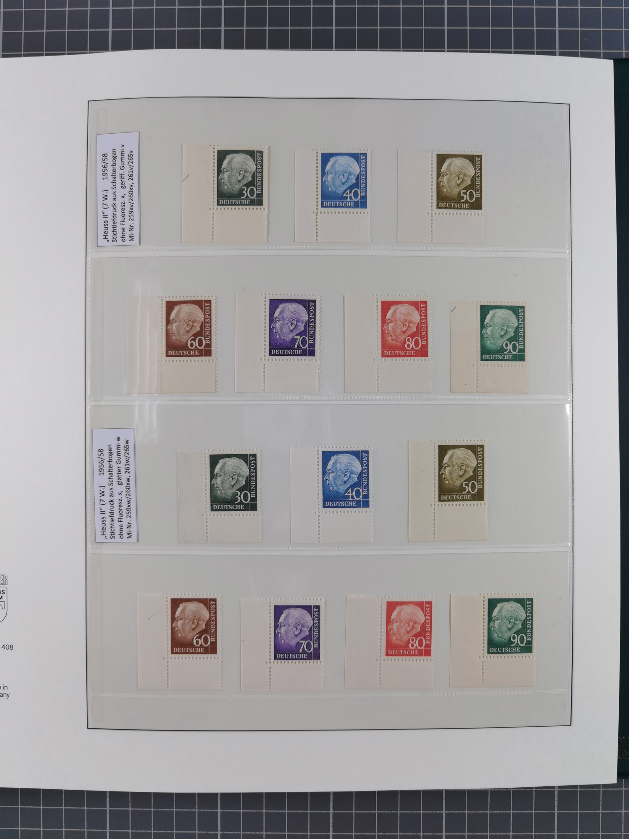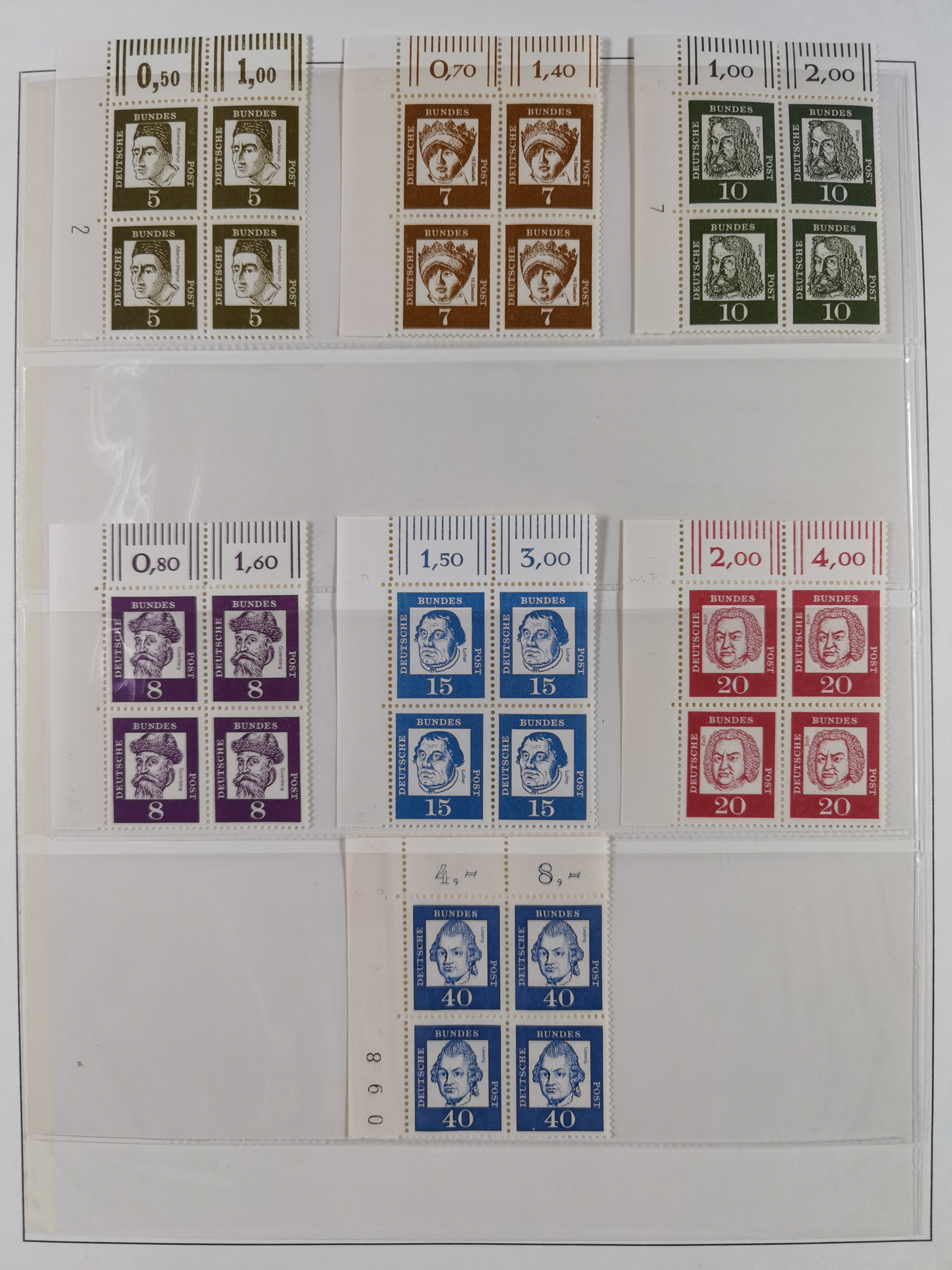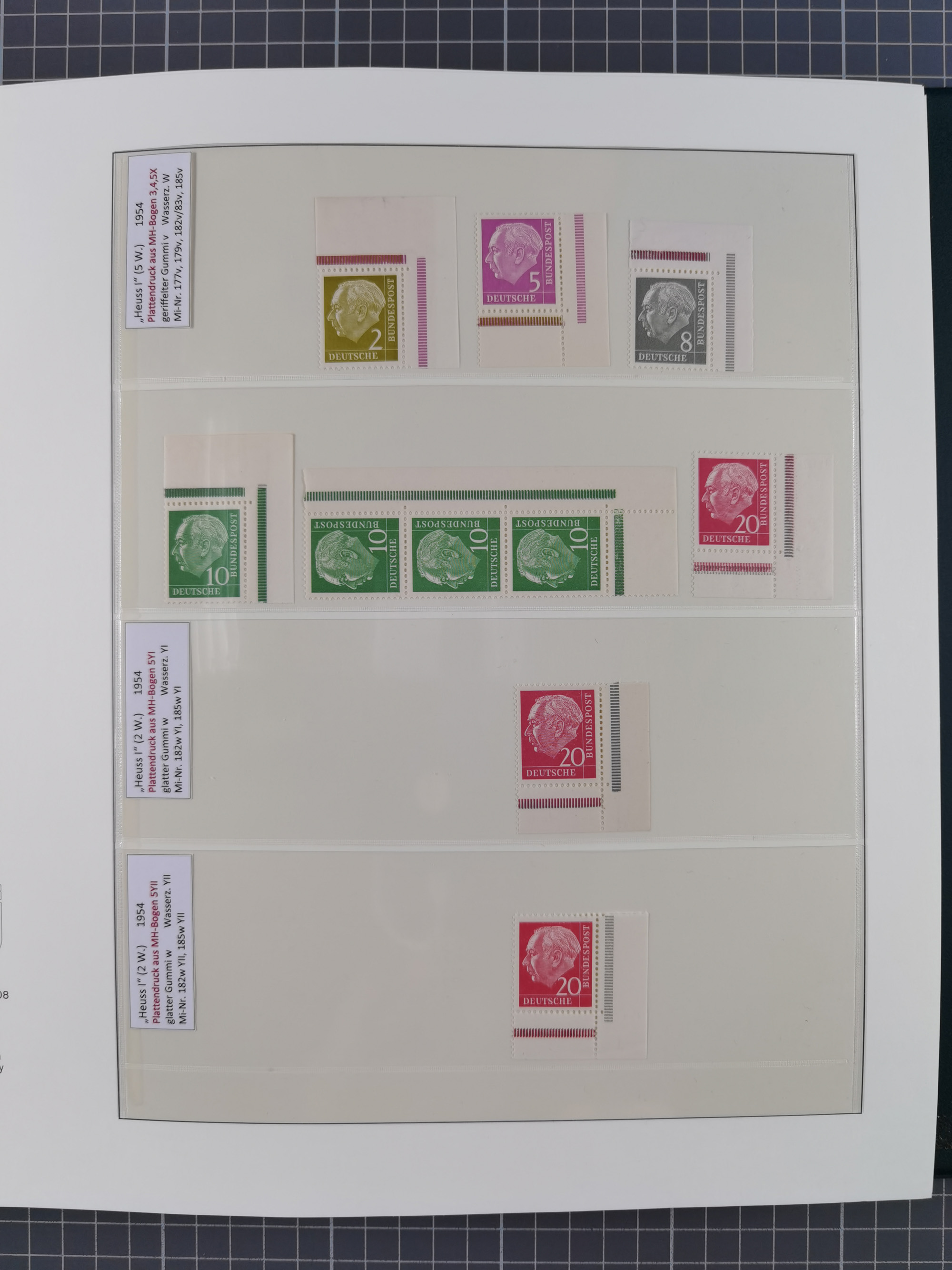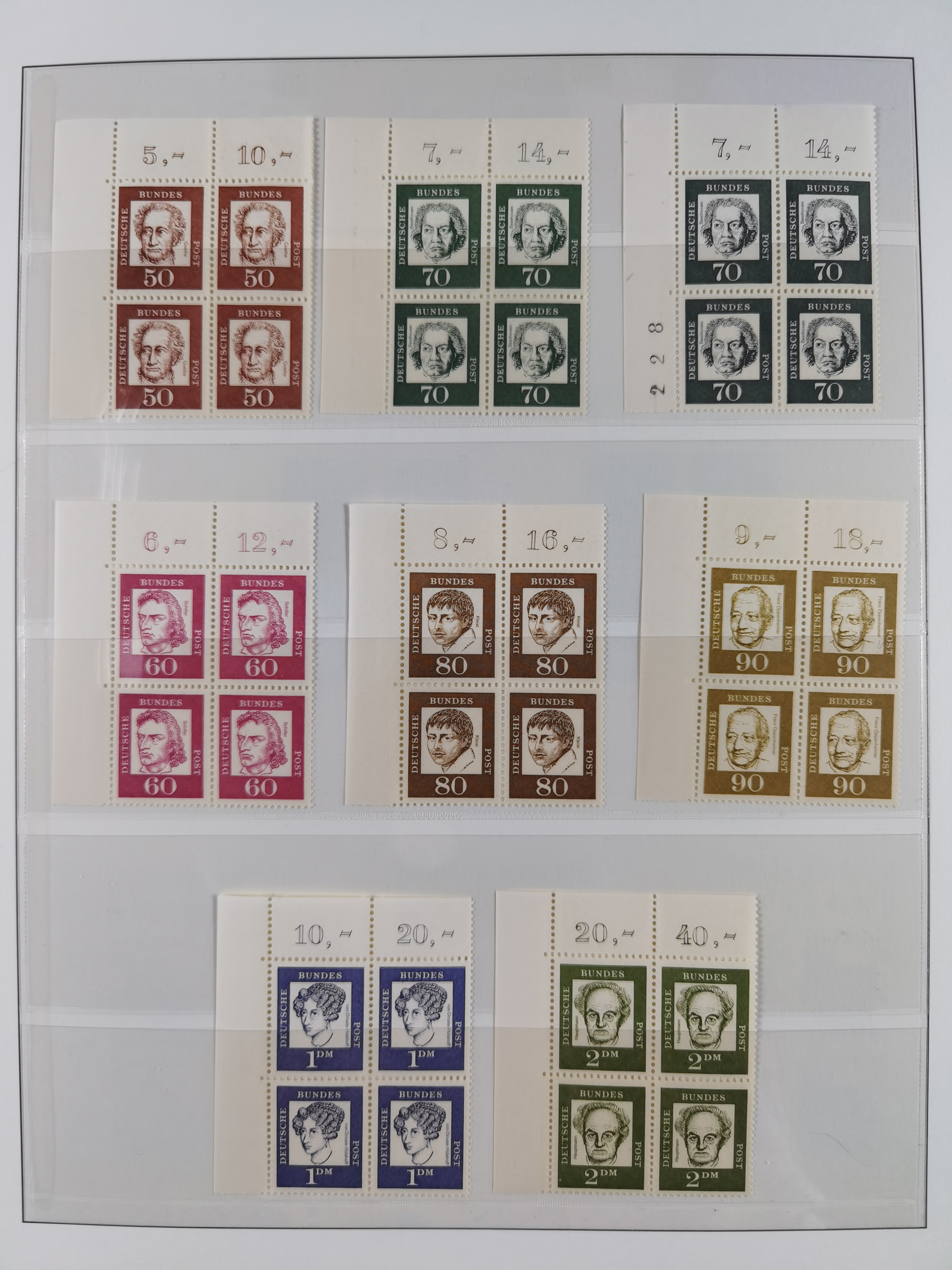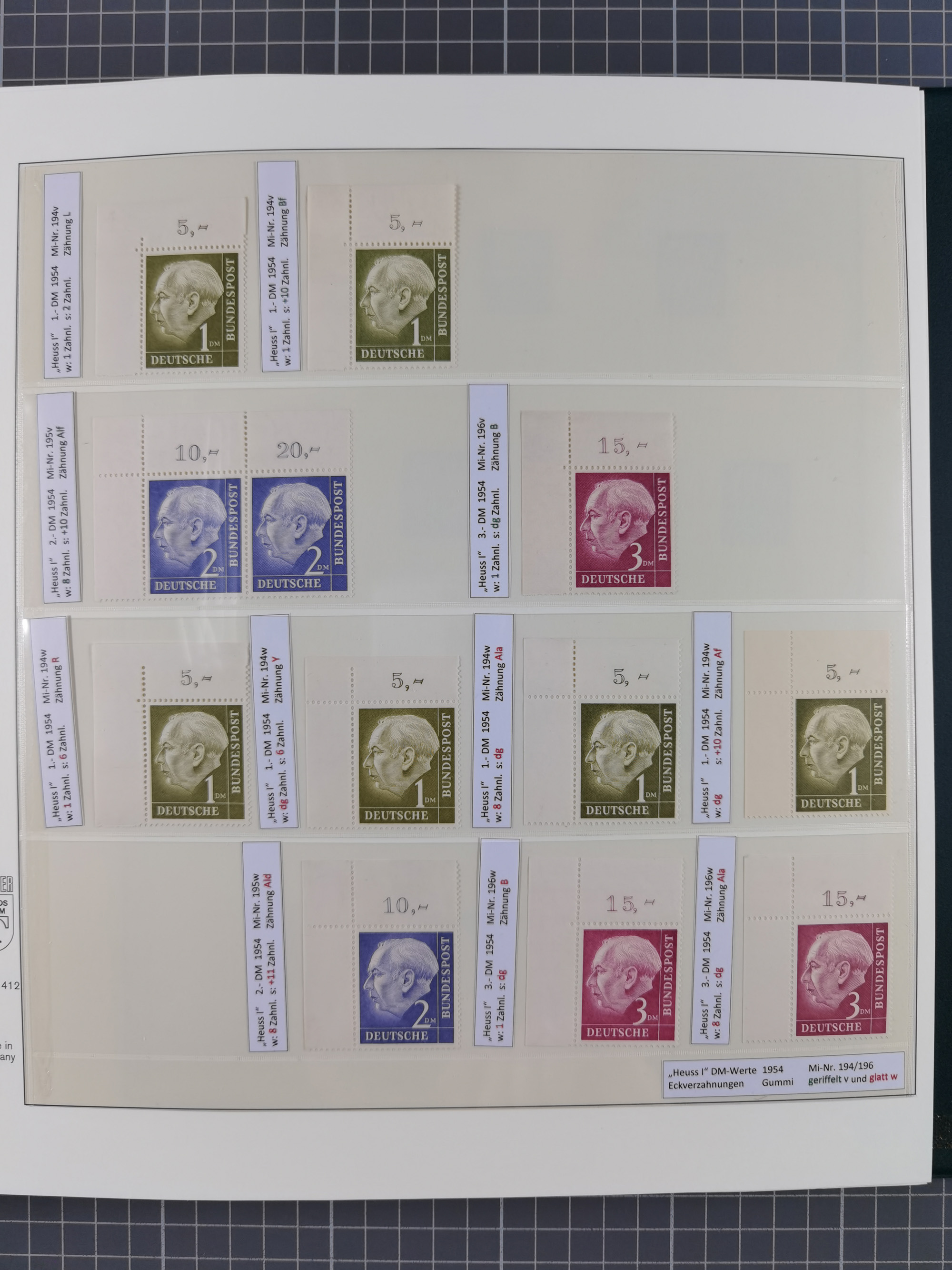 1951/94, postfrische Sammlung Dauerserien, dabei Posthorn in waagerechten oder senkrechten Paaren mit 3 Attesten und 6 Befunden A. Schlegel BPP, Heuss I Eckrandviererblocks, teils mit Druckerzeichen (Attest H.-D. Schlegel BPP). Heuss lumogen mit DZ Befund H.-D. Schlegel BPP. Heuss II Befund H-D Schlegel BPP. Danach Heuss III bis bedeutende Frauen 1994 alles Eckrandviererblocks oben links mit vielen Druckerzeichen und sonstigen Randbesonderheiten, im Lindner-Falzlosalbum.