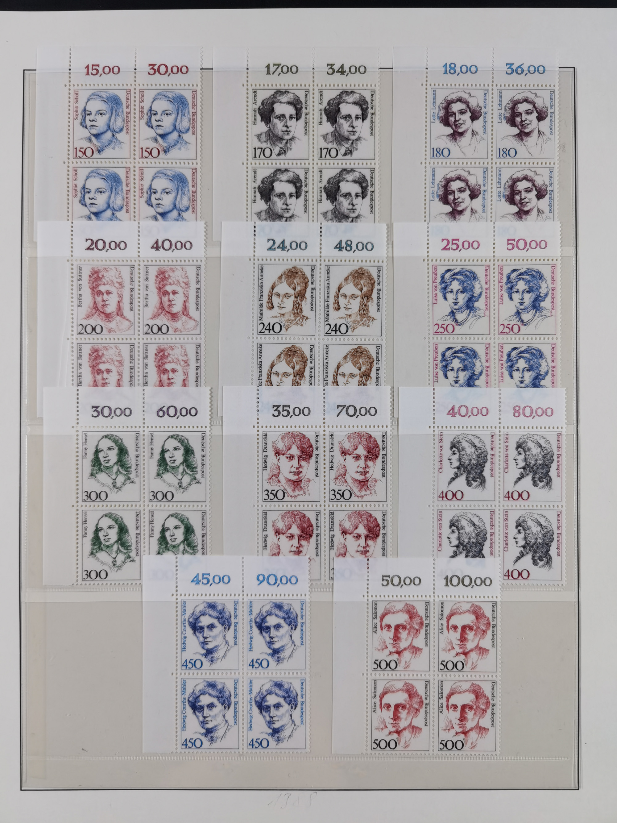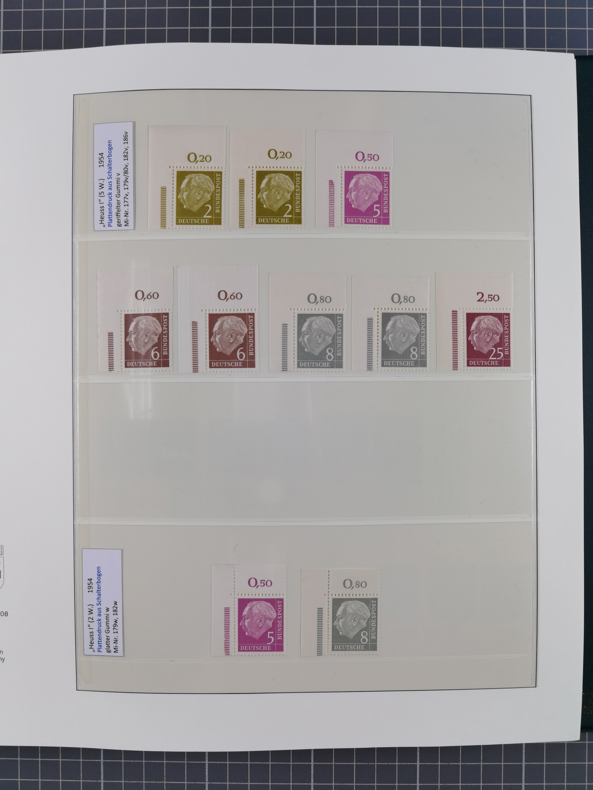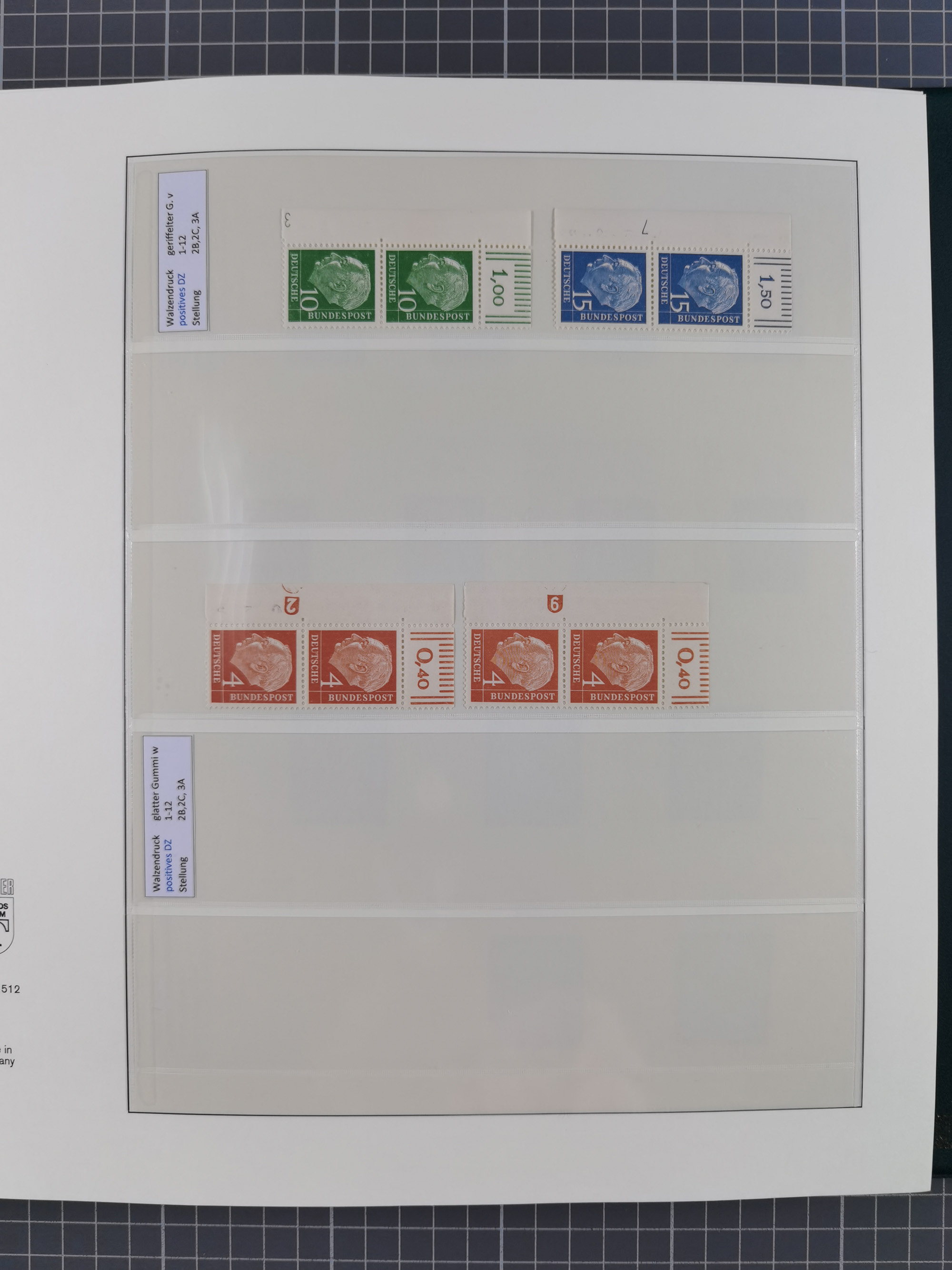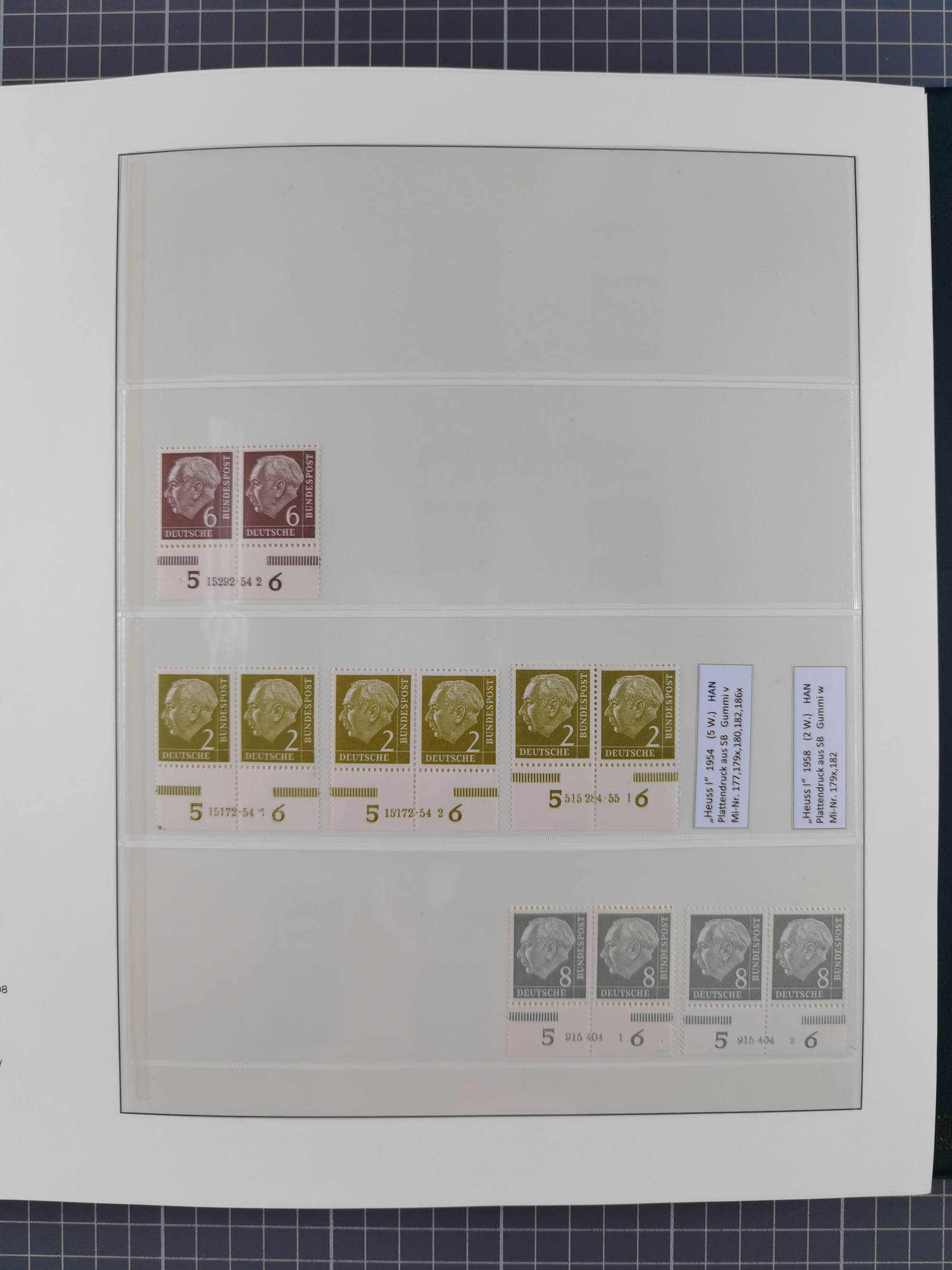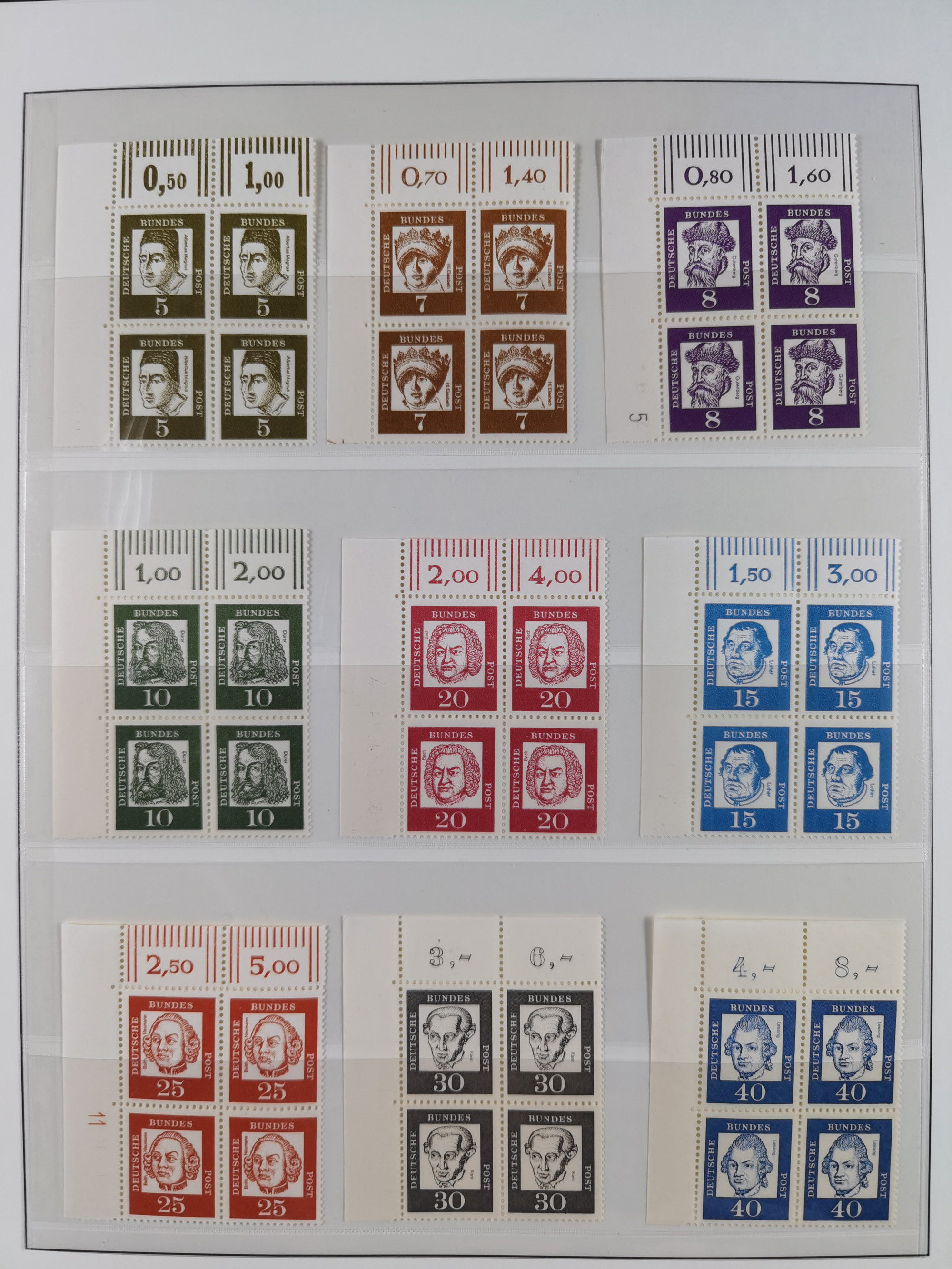 1951/94, postfrische Sammlung Dauerserien, dabei Posthorn in waagerechten oder senkrechten Paaren mit 3 Attesten und 6 Befunden A. Schlegel BPP, Heuss I Eckrandviererblocks, teils mit Druckerzeichen (Attest H.-D. Schlegel BPP). Heuss lumogen mit DZ Befund H.-D. Schlegel BPP. Heuss II Befund H-D Schlegel BPP. Danach Heuss III bis bedeutende Frauen 1994 alles Eckrandviererblocks oben links mit vielen Druckerzeichen und sonstigen Randbesonderheiten, im Lindner-Falzlosalbum.