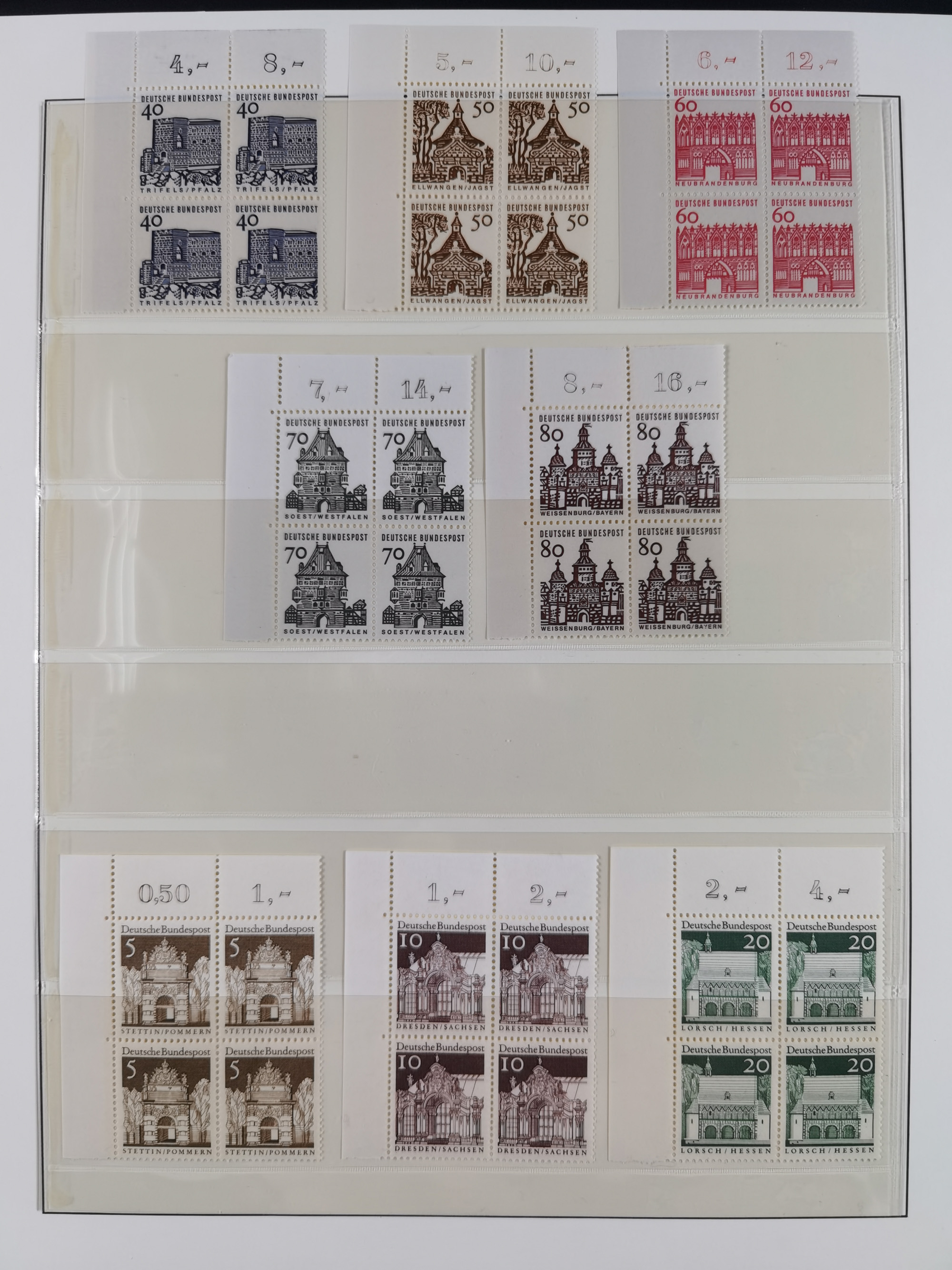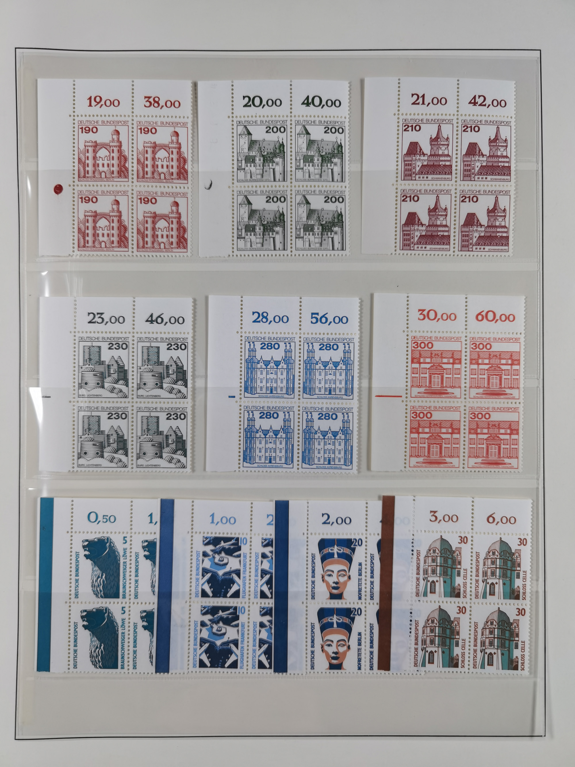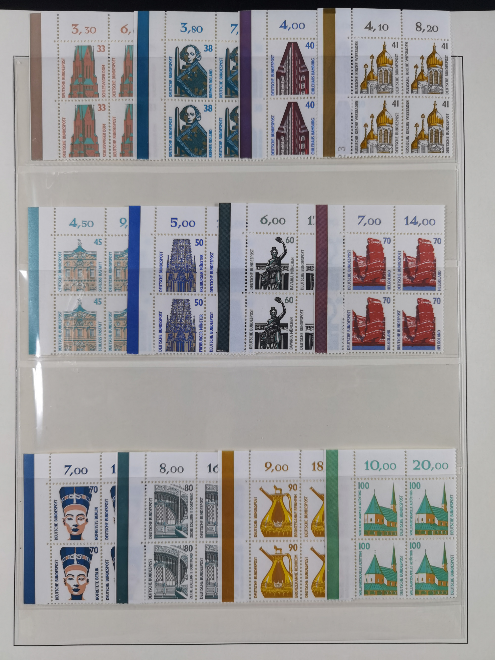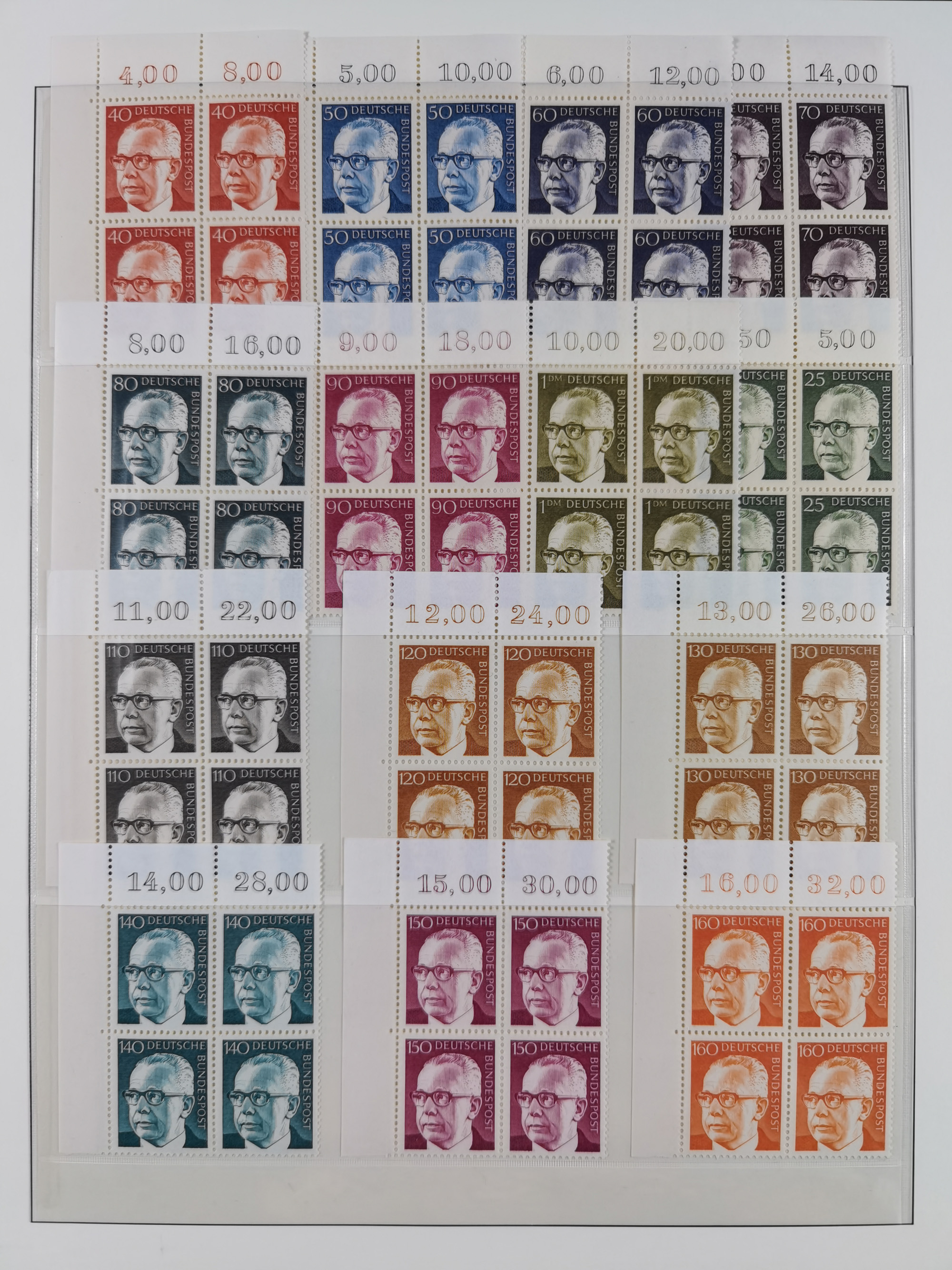 1951/94, postfrische Sammlung Dauerserien, dabei Posthorn in waagerechten oder senkrechten Paaren mit 3 Attesten und 6 Befunden A. Schlegel BPP, Heuss I Eckrandviererblocks, teils mit Druckerzeichen (Attest H.-D. Schlegel BPP). Heuss lumogen mit DZ Befund H.-D. Schlegel BPP. Heuss II Befund H-D Schlegel BPP. Danach Heuss III bis bedeutende Frauen 1994 alles Eckrandviererblocks oben links mit vielen Druckerzeichen und sonstigen Randbesonderheiten, im Lindner-Falzlosalbum.