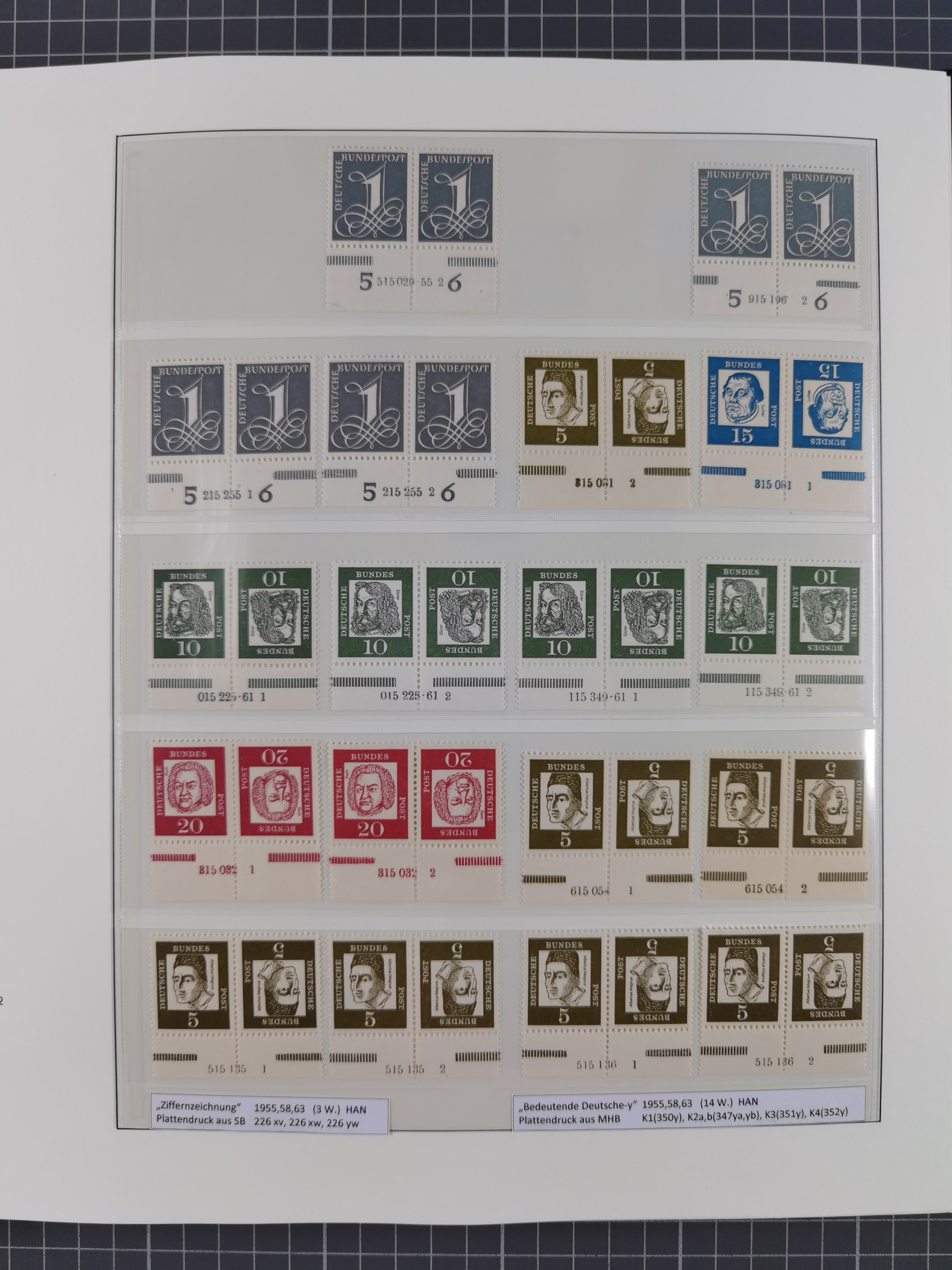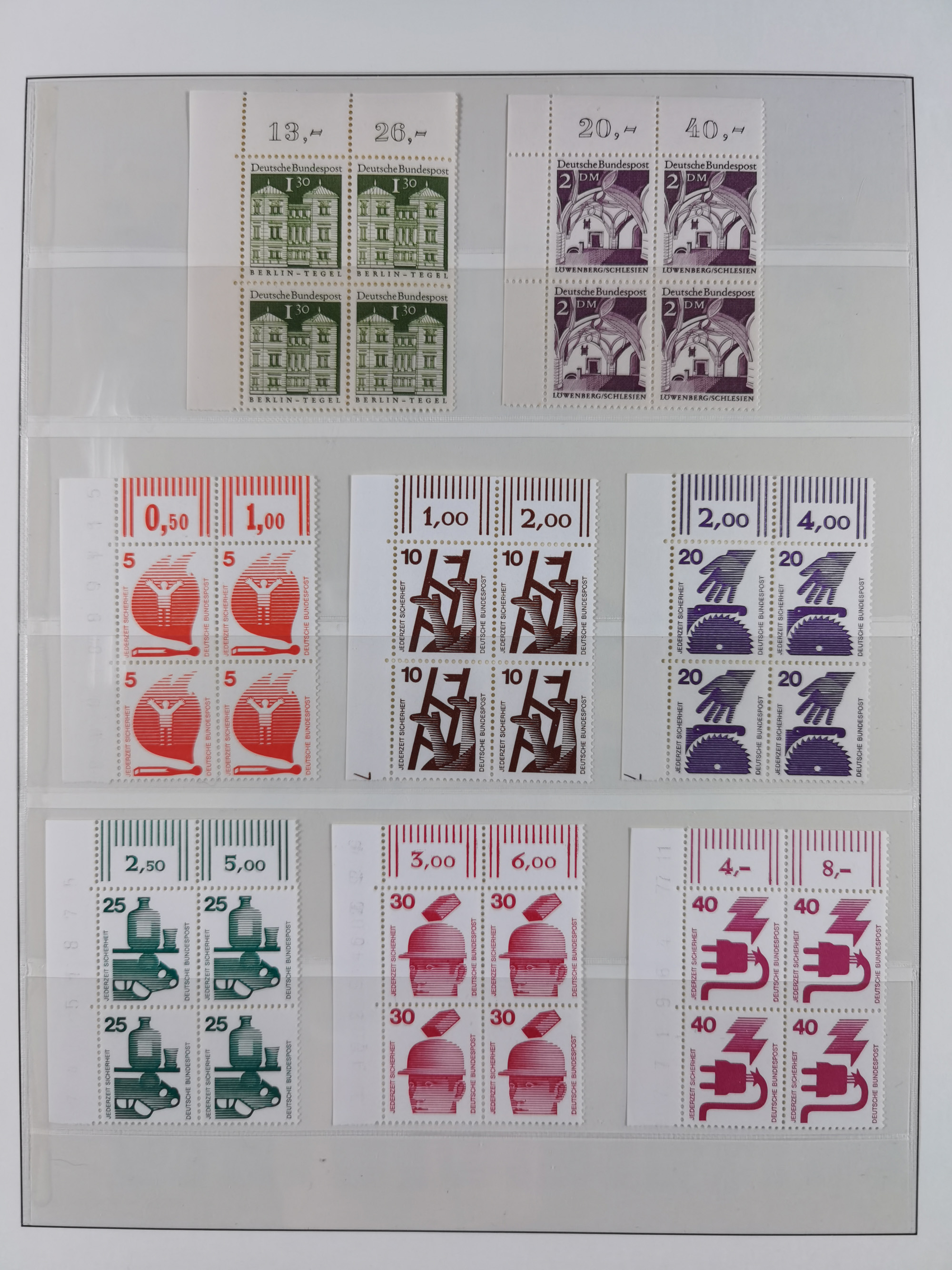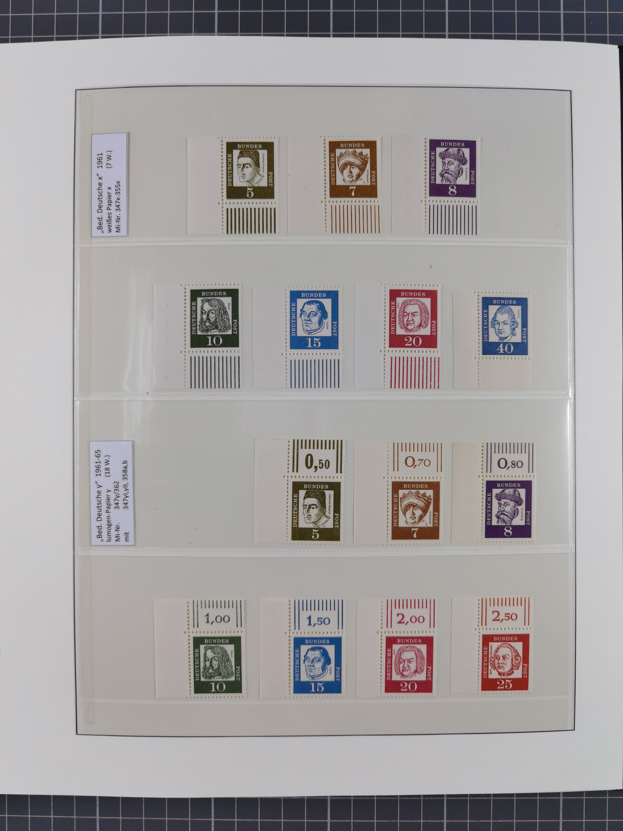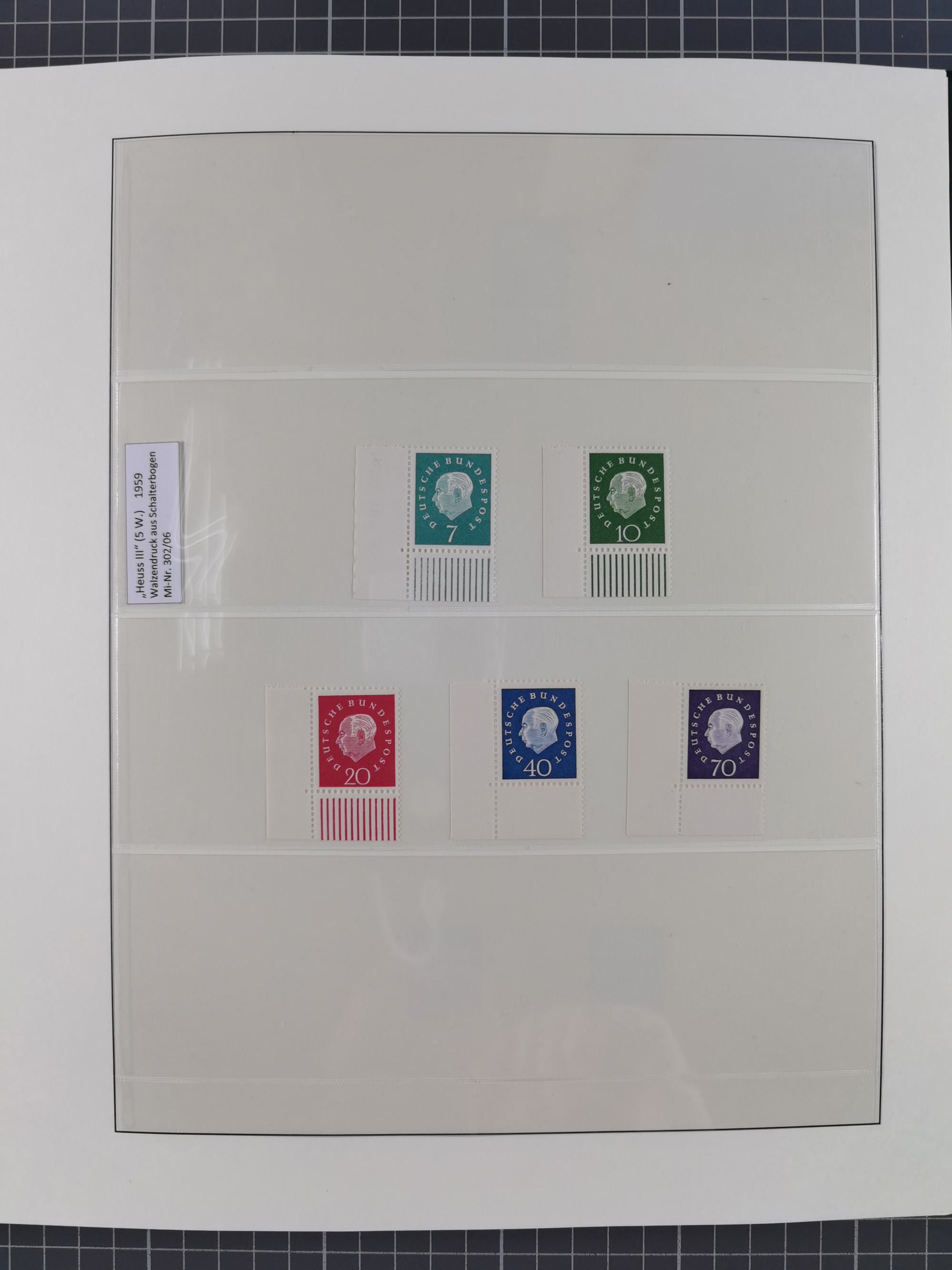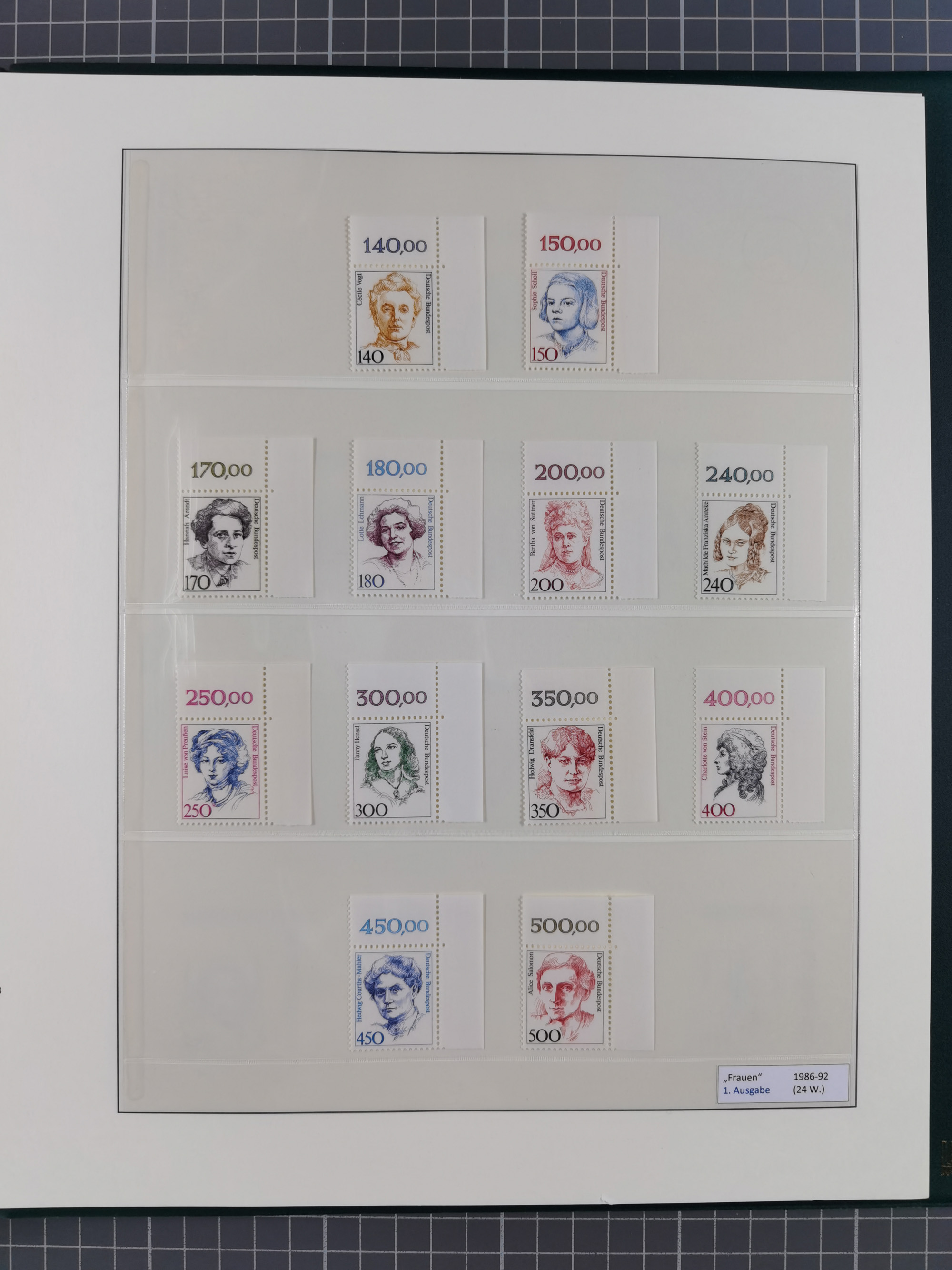1951/94, postfrische Sammlung Dauerserien, dabei Posthorn in waagerechten oder senkrechten Paaren mit 3 Attesten und 6 Befunden A. Schlegel BPP, Heuss I Eckrandviererblocks, teils mit Druckerzeichen (Attest H.-D. Schlegel BPP). Heuss lumogen mit DZ Befund H.-D. Schlegel BPP. Heuss II Befund H-D Schlegel BPP. Danach Heuss III bis bedeutende Frauen 1994 alles Eckrandviererblocks oben links mit vielen Druckerzeichen und sonstigen Randbesonderheiten, im Lindner-Falzlosalbum.