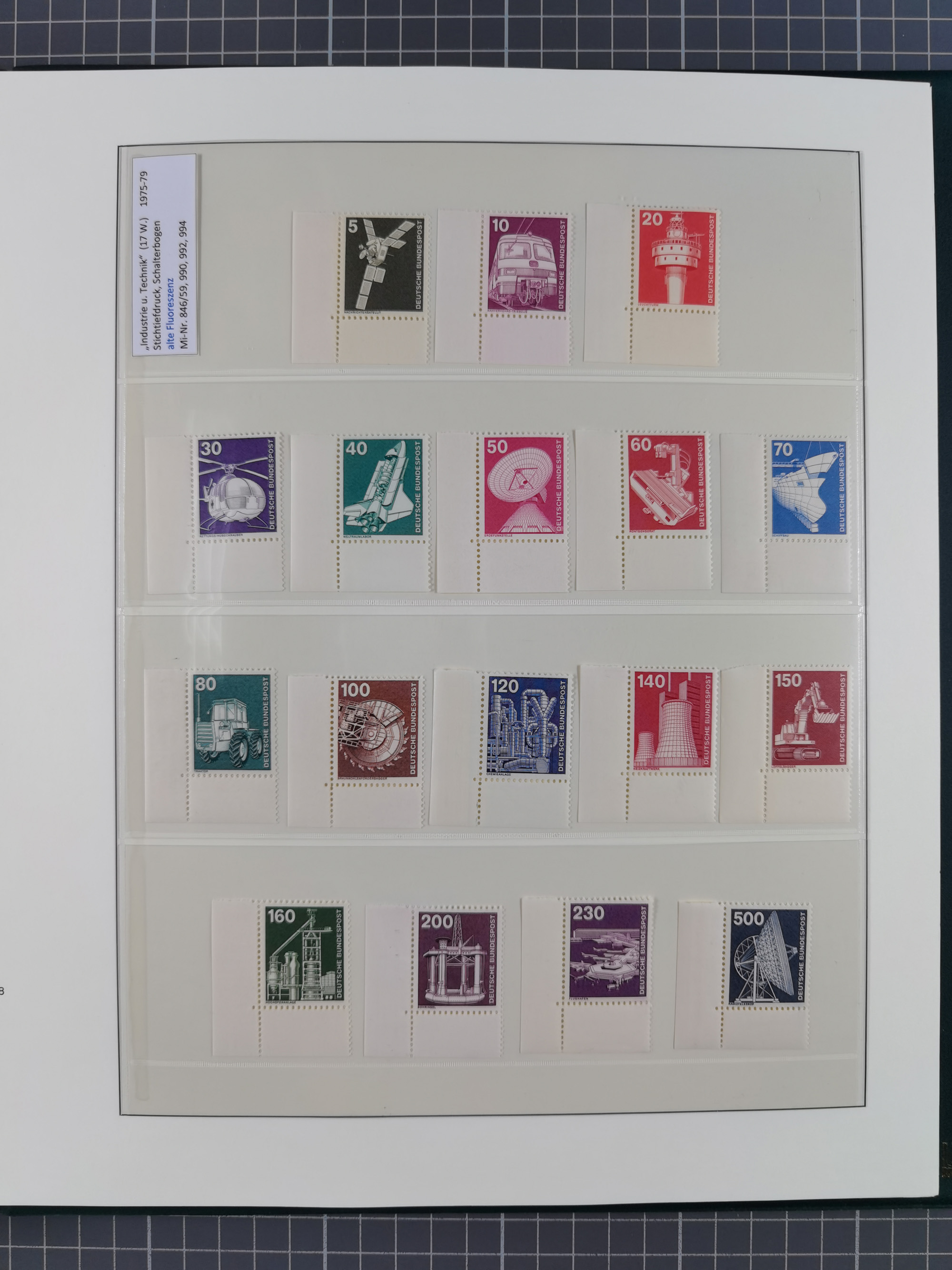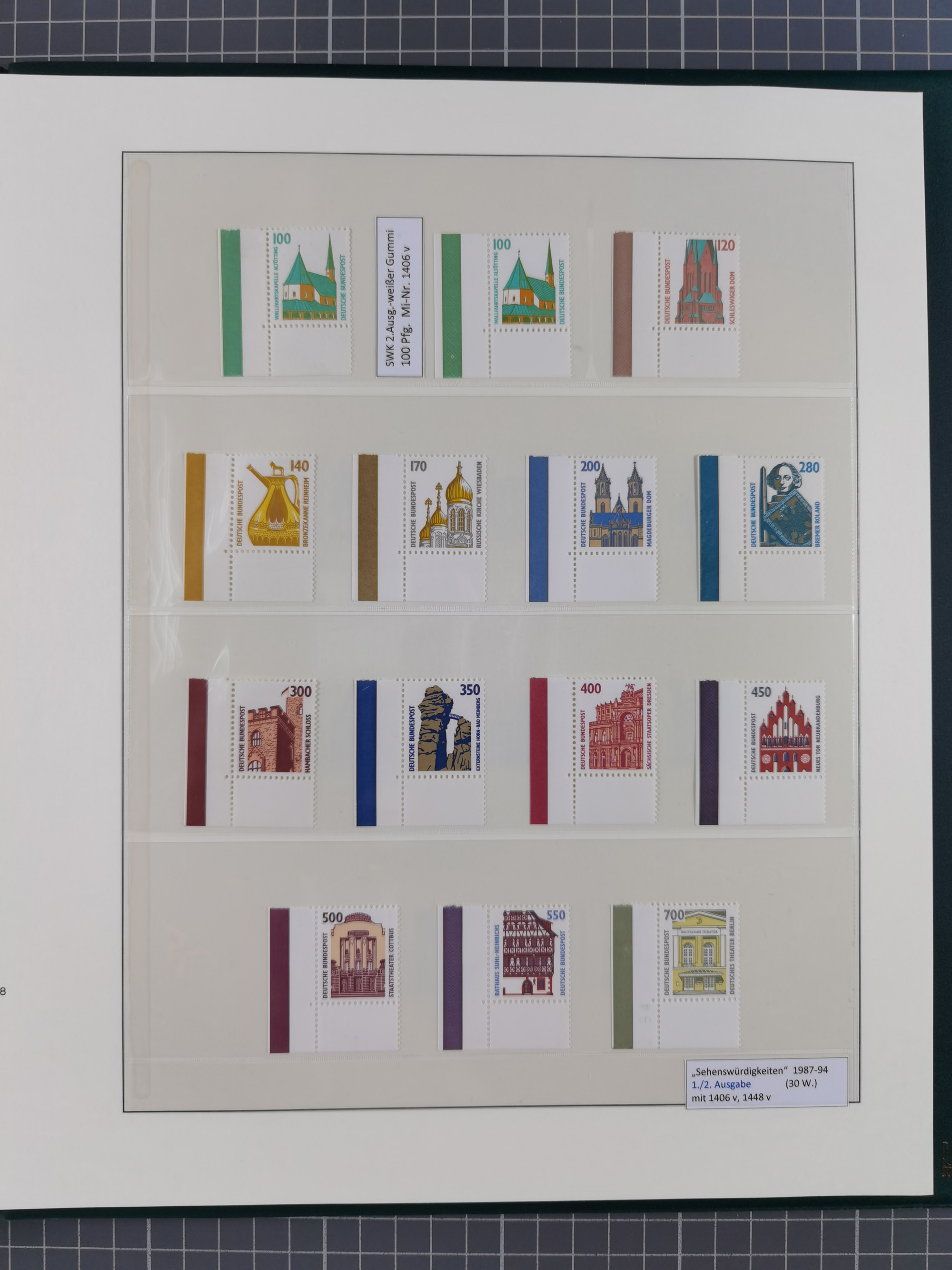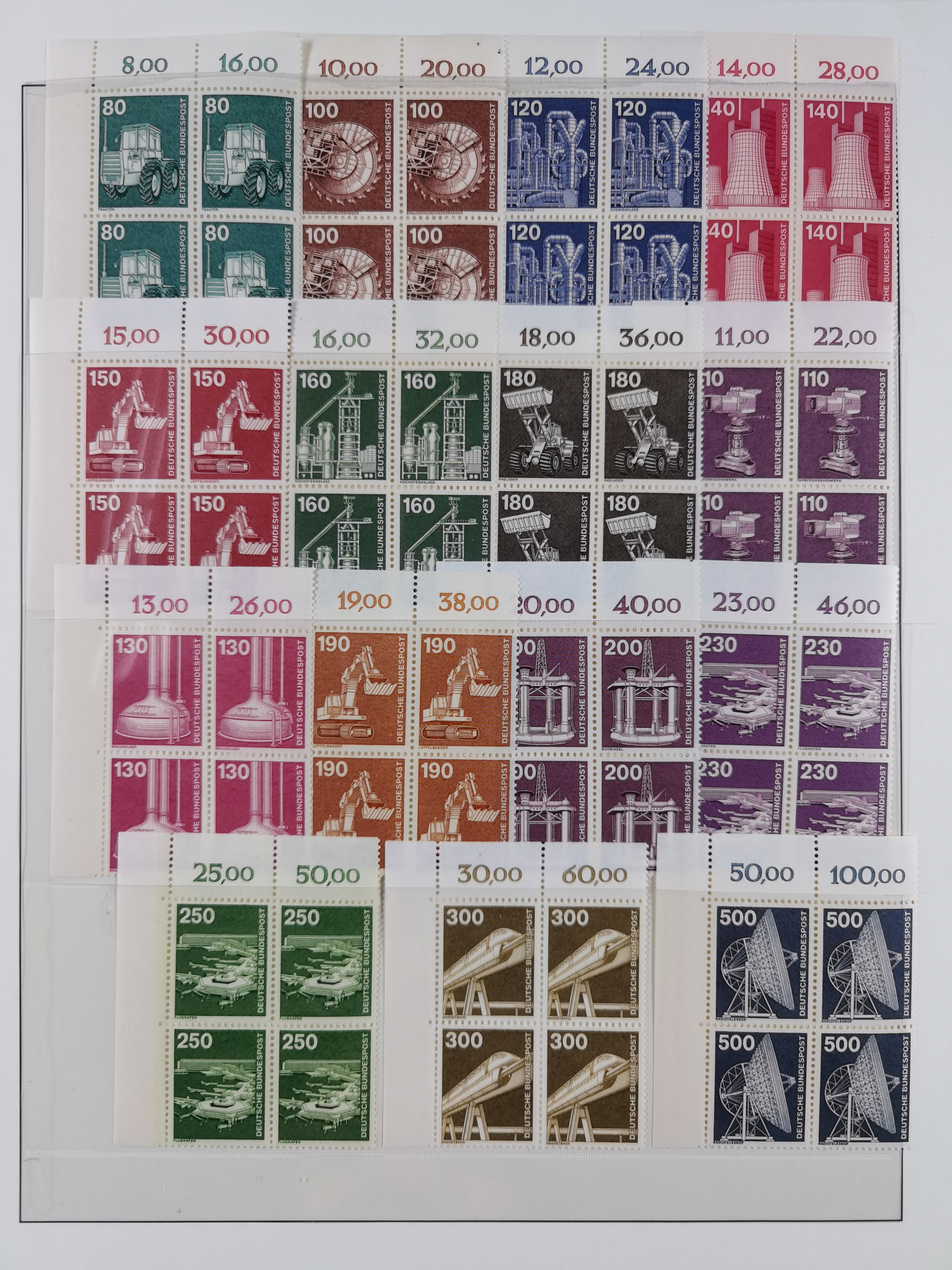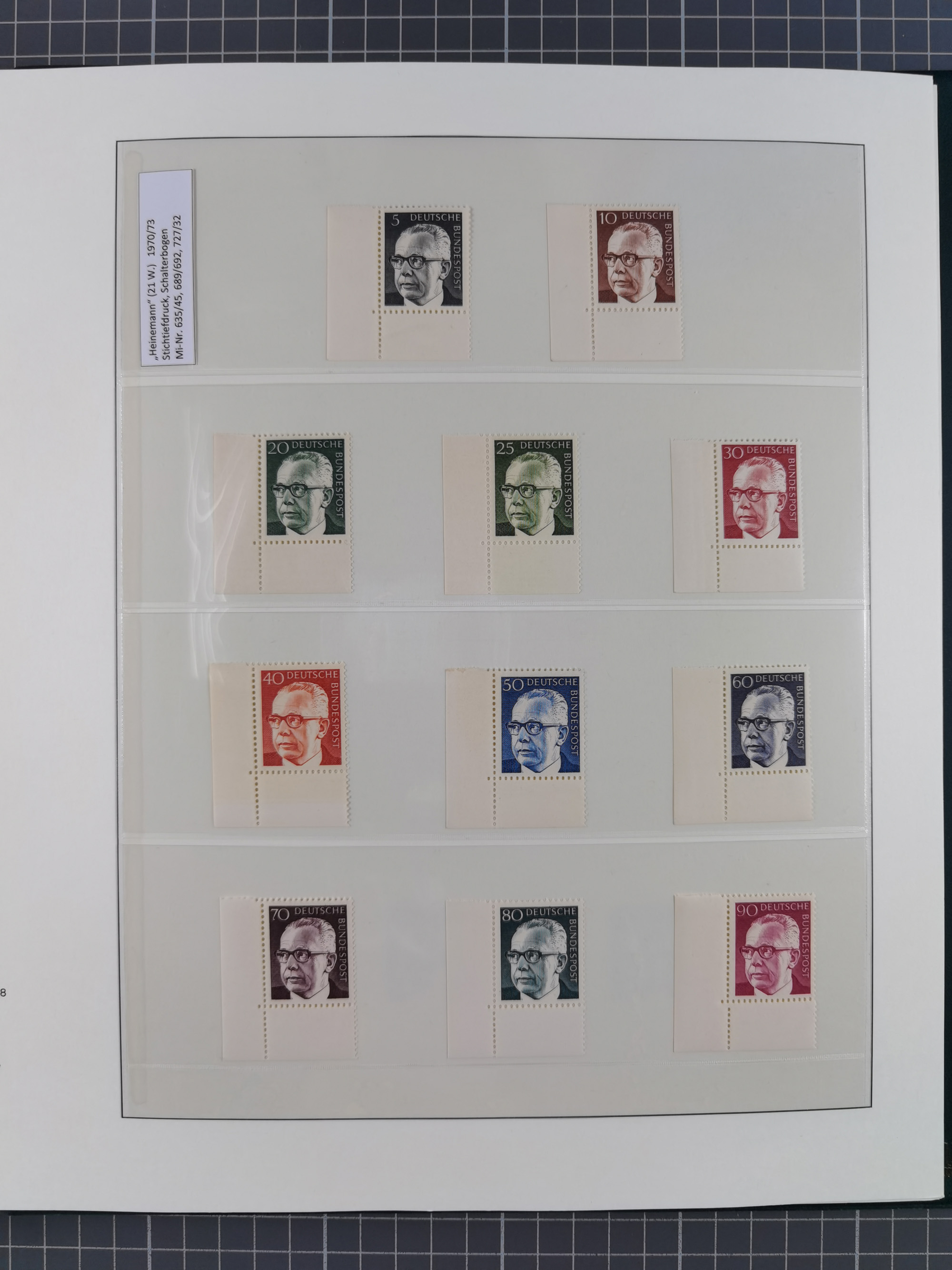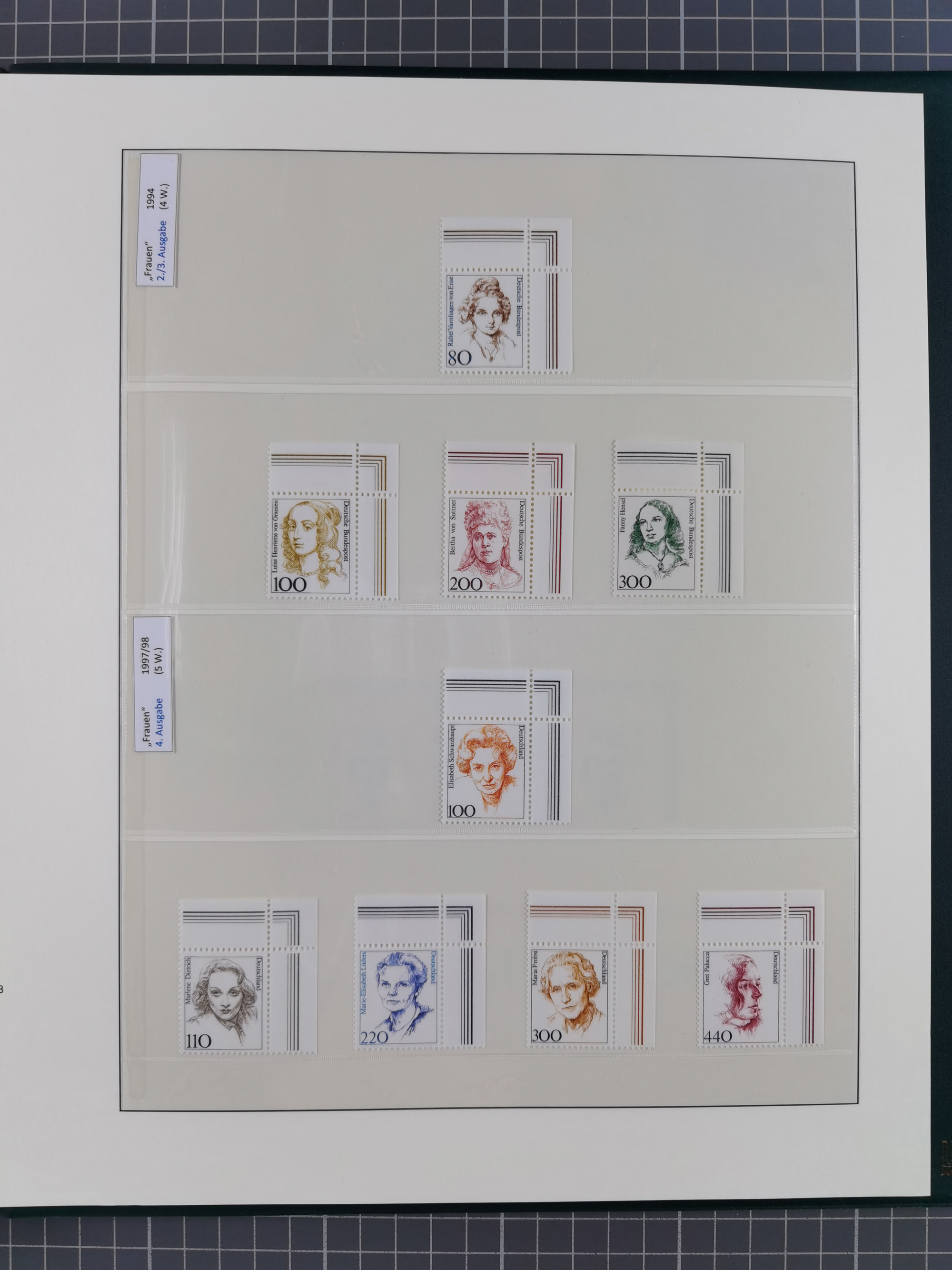 1951/94, postfrische Sammlung Dauerserien, dabei Posthorn in waagerechten oder senkrechten Paaren mit 3 Attesten und 6 Befunden A. Schlegel BPP, Heuss I Eckrandviererblocks, teils mit Druckerzeichen (Attest H.-D. Schlegel BPP). Heuss lumogen mit DZ Befund H.-D. Schlegel BPP. Heuss II Befund H-D Schlegel BPP. Danach Heuss III bis bedeutende Frauen 1994 alles Eckrandviererblocks oben links mit vielen Druckerzeichen und sonstigen Randbesonderheiten, im Lindner-Falzlosalbum.