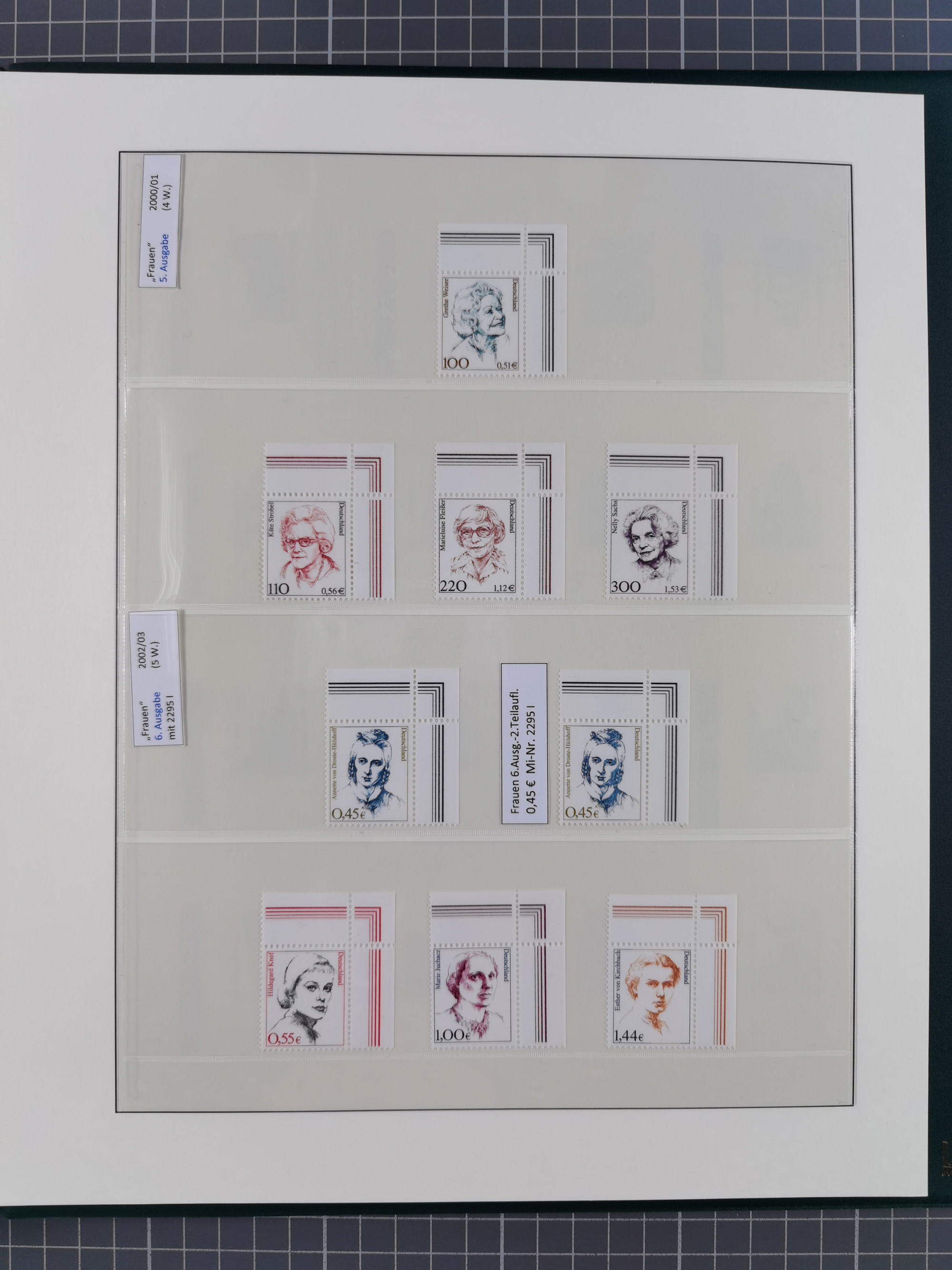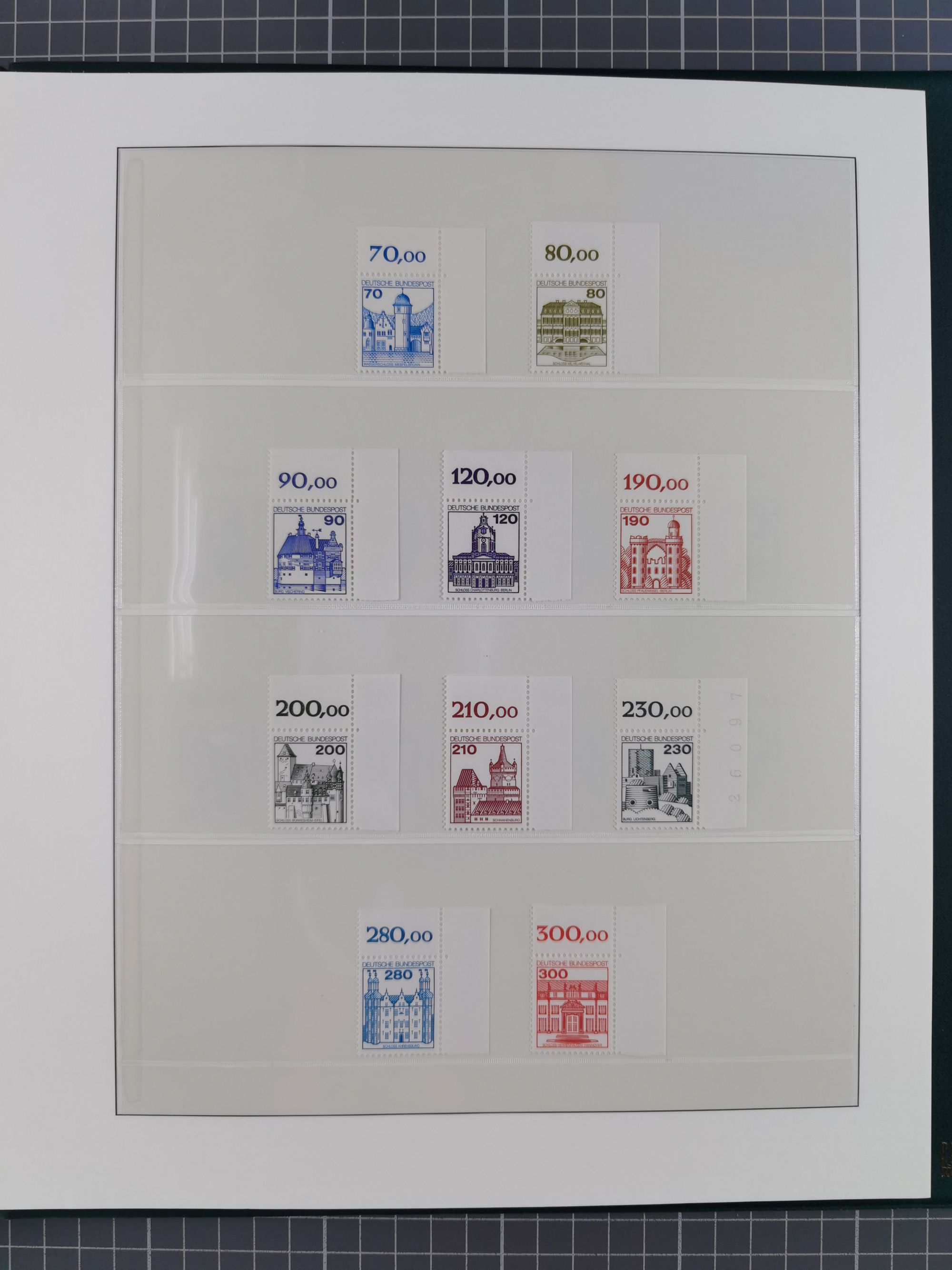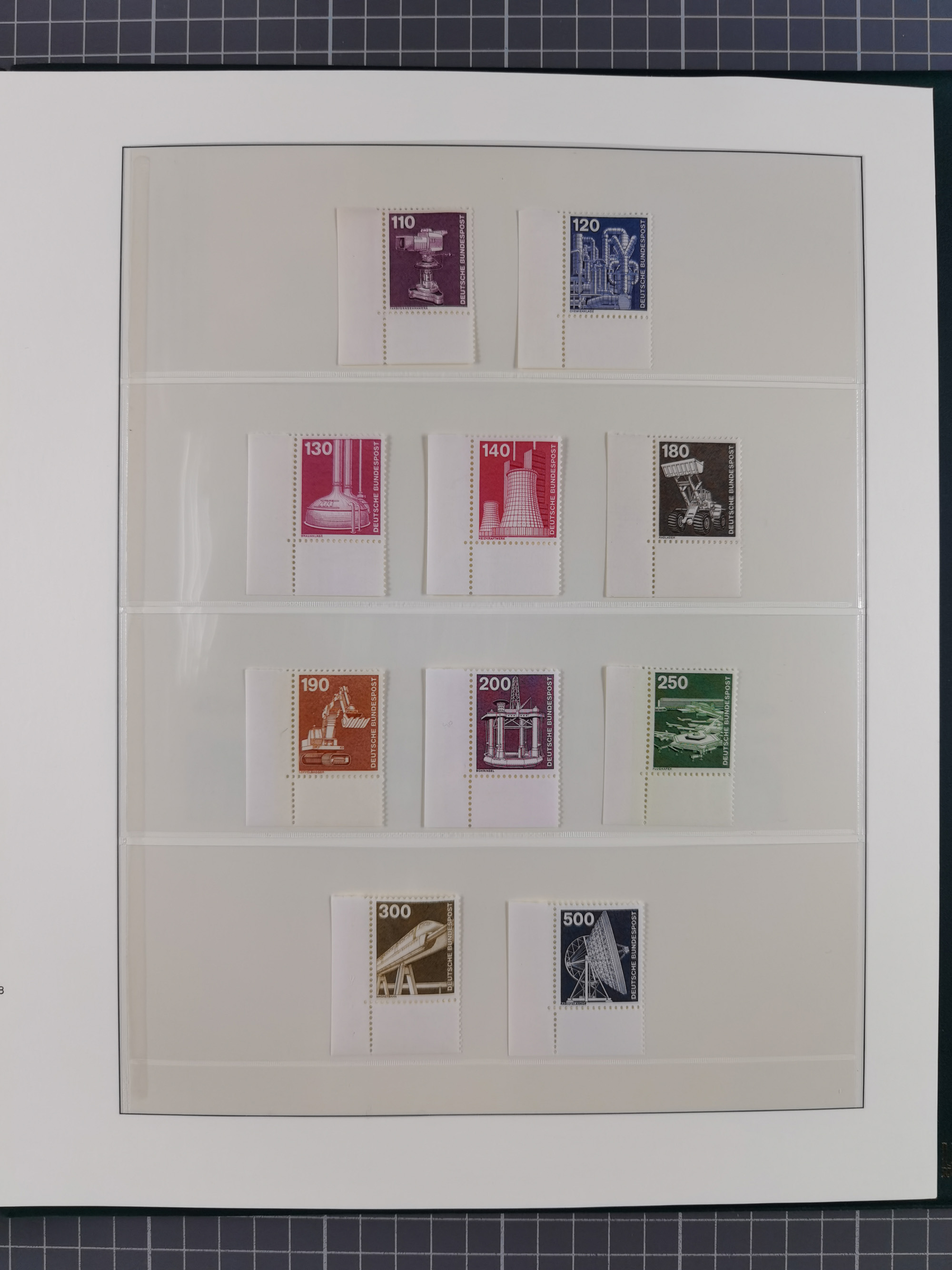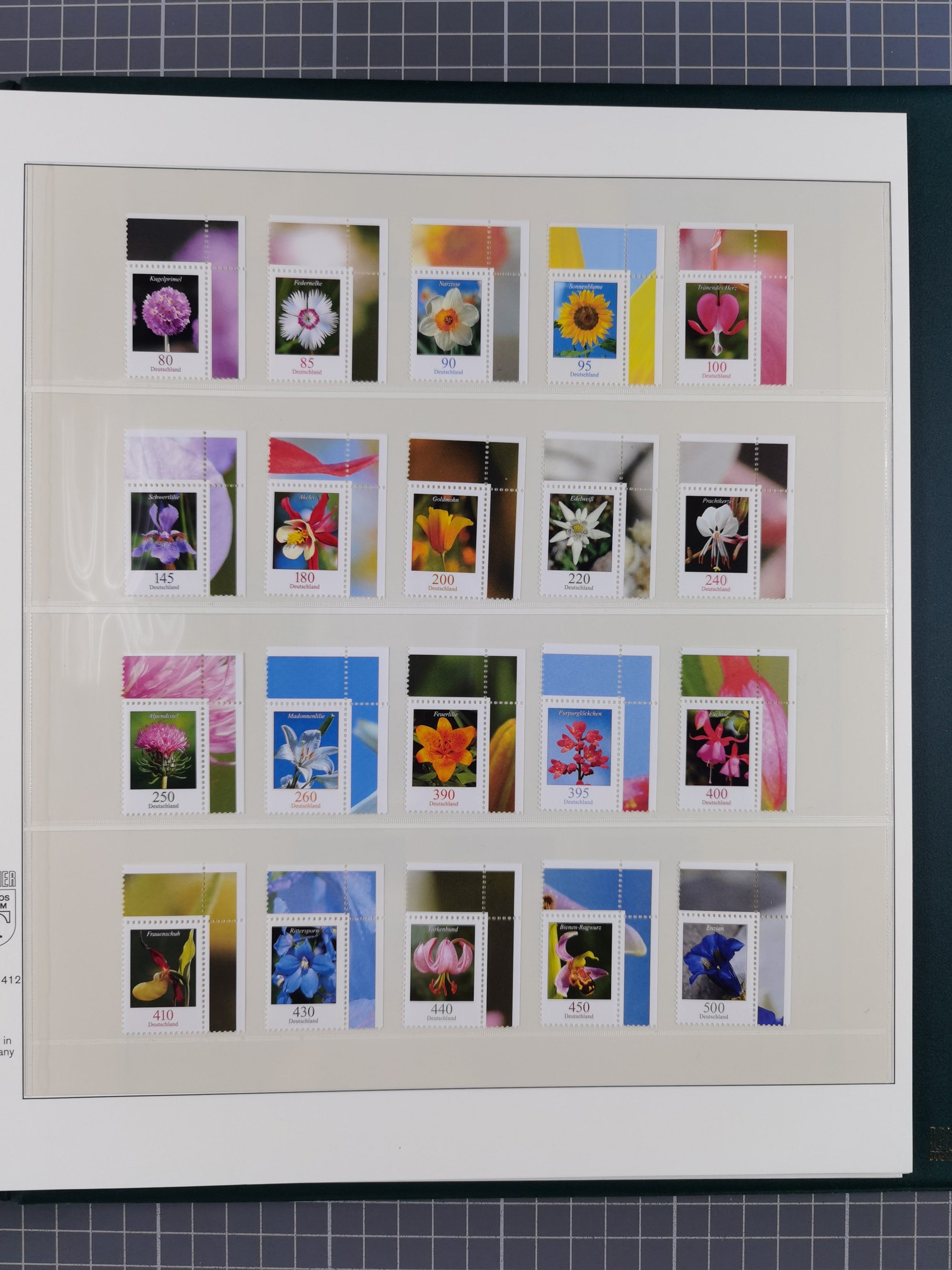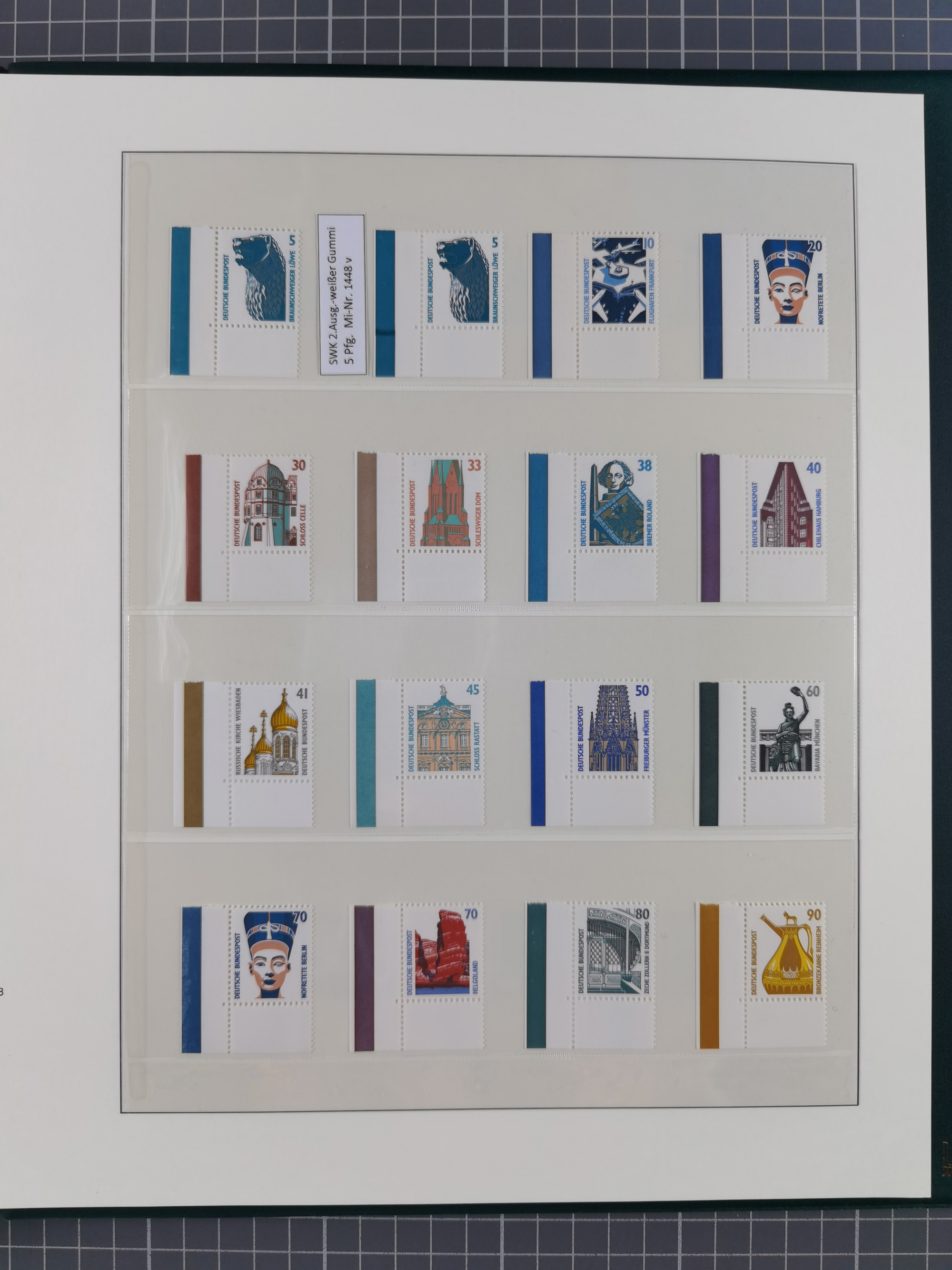 1951/94, postfrische Sammlung Dauerserien, dabei Posthorn in waagerechten oder senkrechten Paaren mit 3 Attesten und 6 Befunden A. Schlegel BPP, Heuss I Eckrandviererblocks, teils mit Druckerzeichen (Attest H.-D. Schlegel BPP). Heuss lumogen mit DZ Befund H.-D. Schlegel BPP. Heuss II Befund H-D Schlegel BPP. Danach Heuss III bis bedeutende Frauen 1994 alles Eckrandviererblocks oben links mit vielen Druckerzeichen und sonstigen Randbesonderheiten, im Lindner-Falzlosalbum.