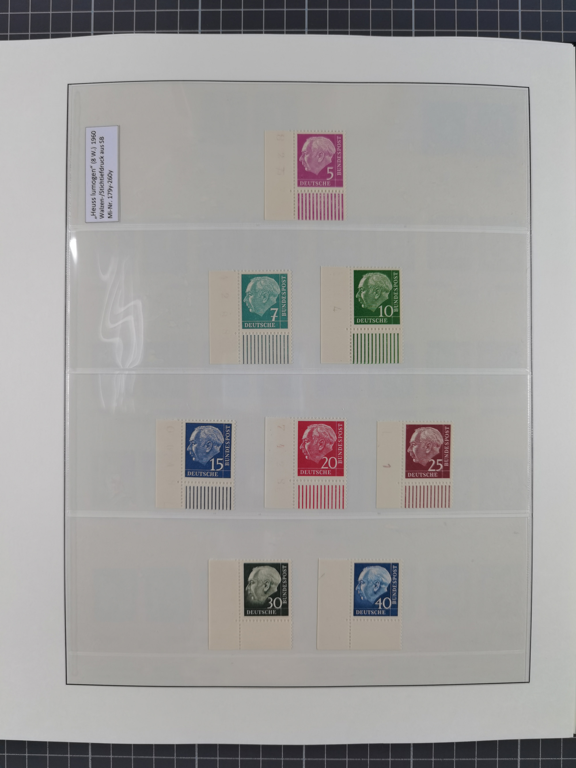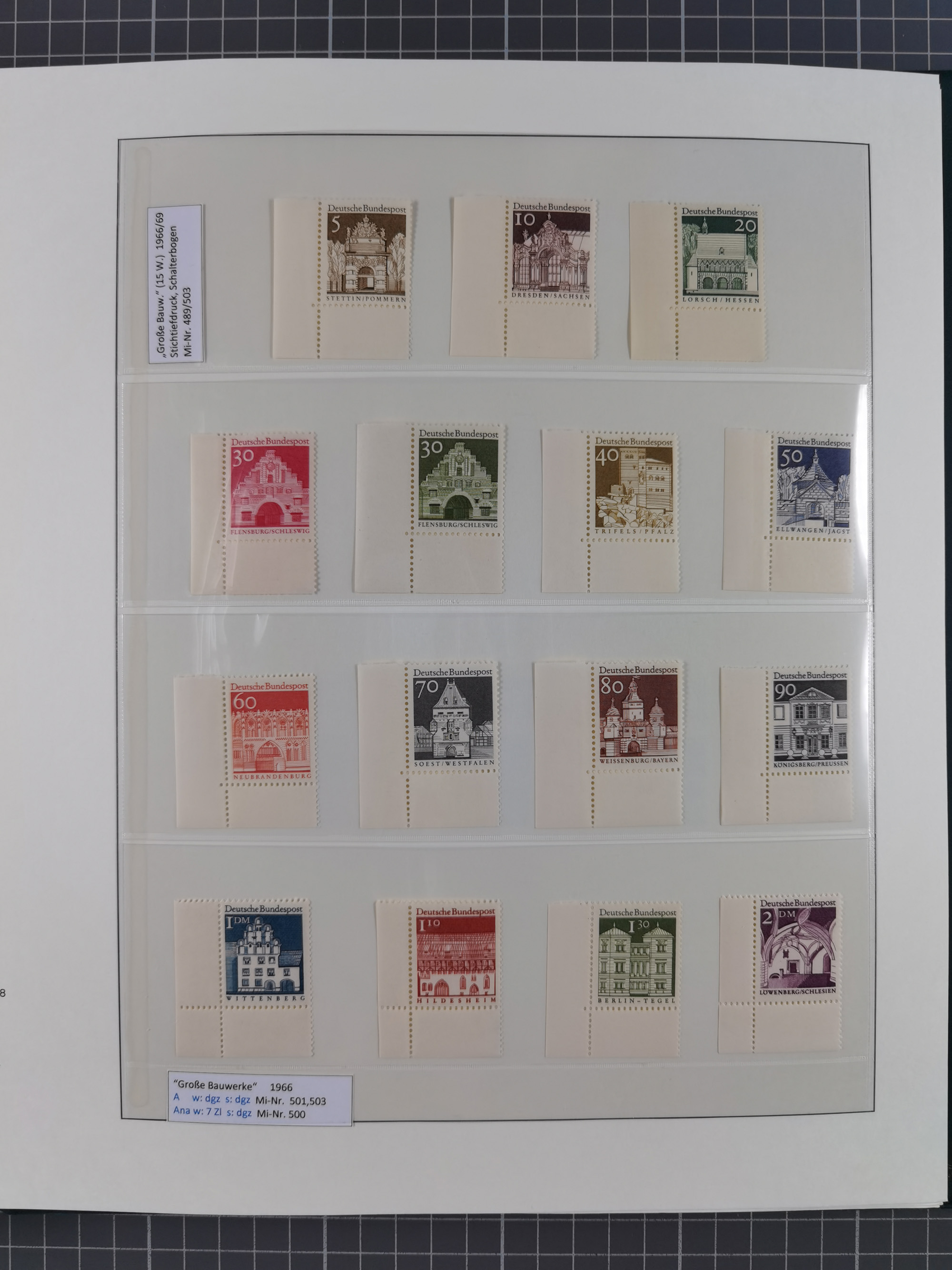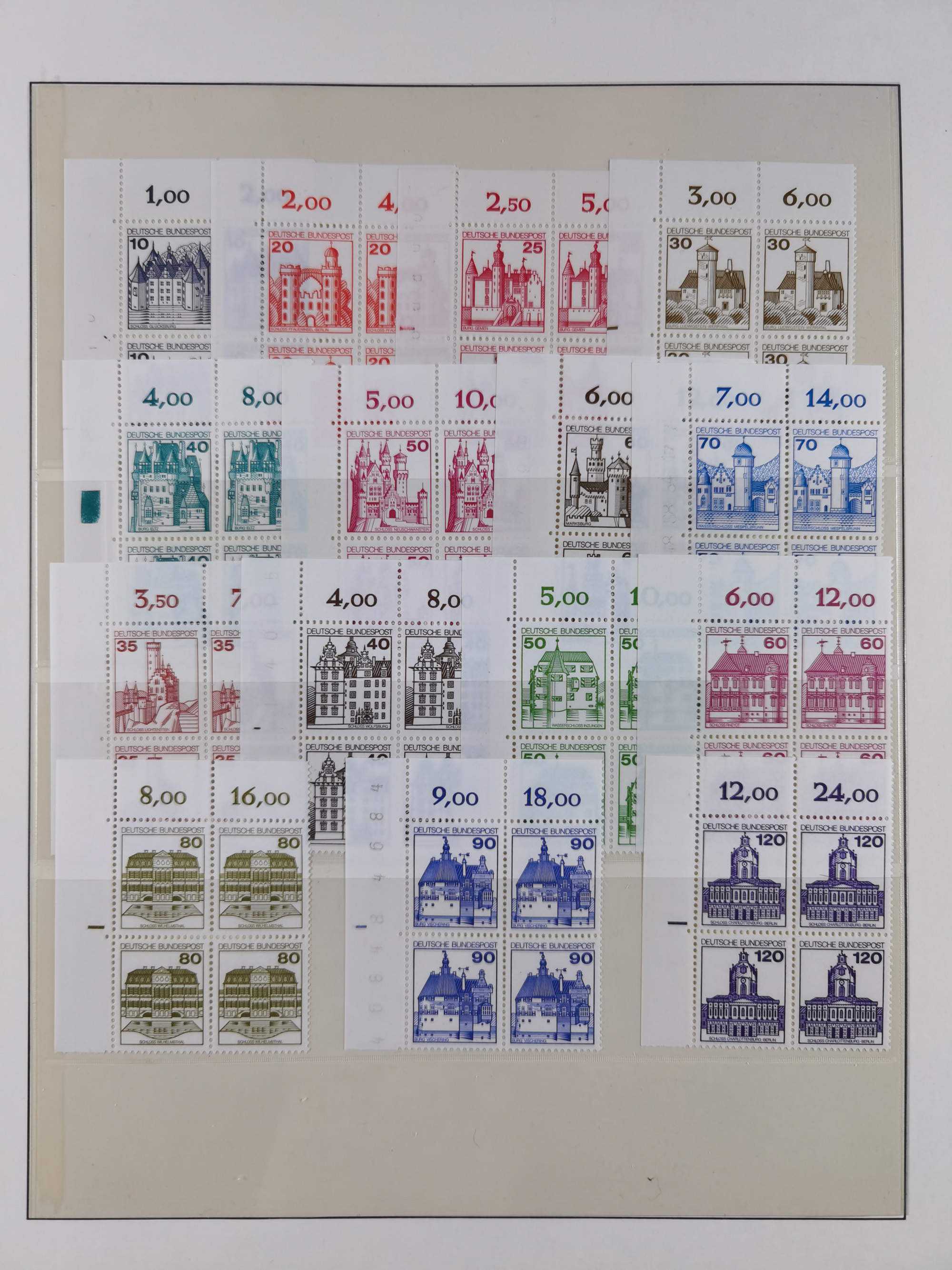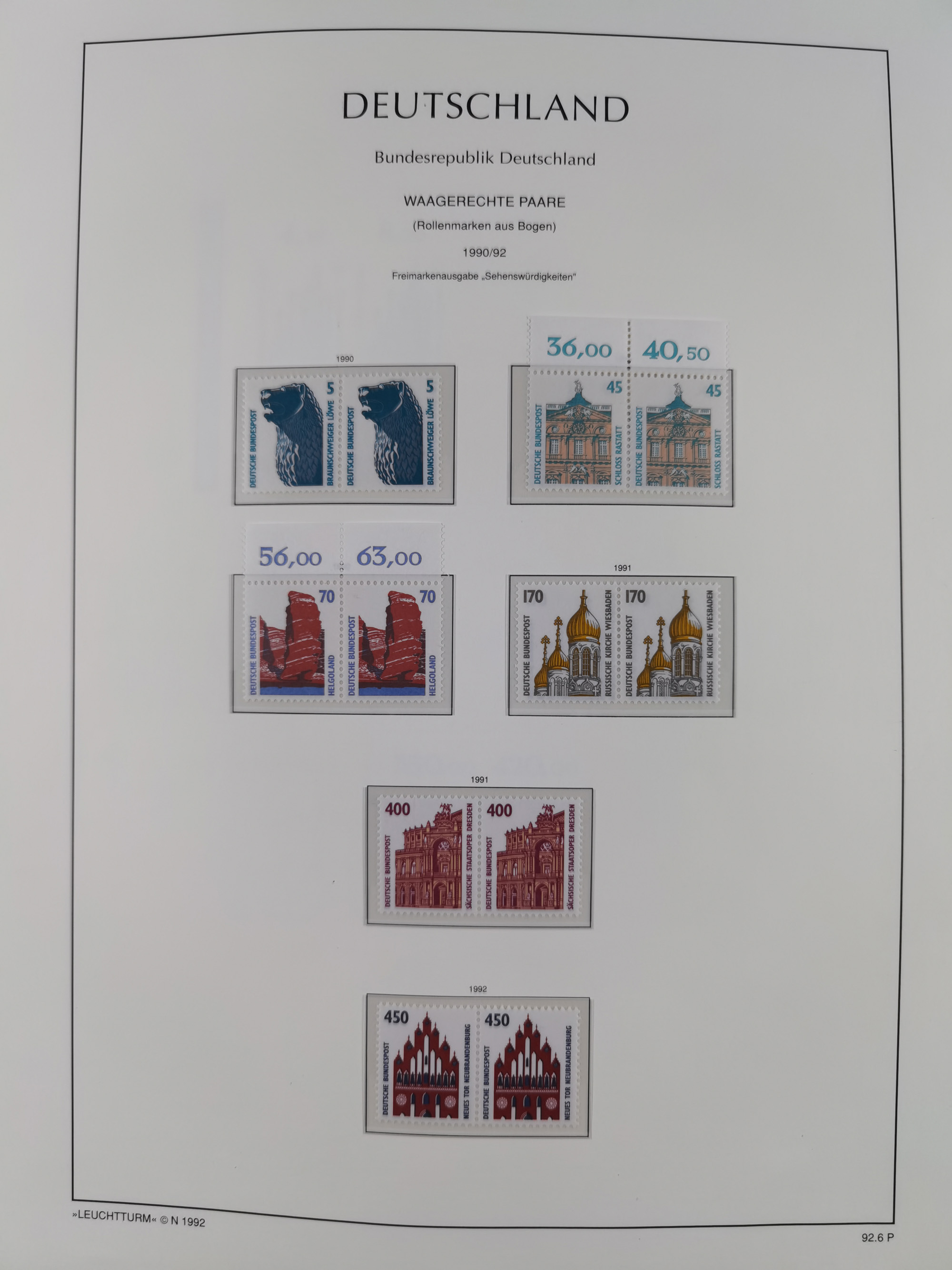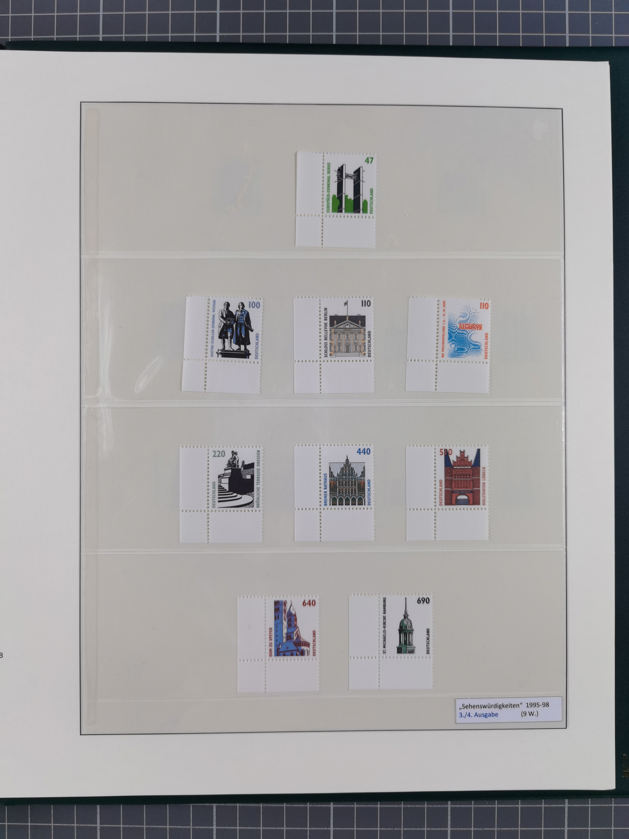 1951/94, postfrische Sammlung Dauerserien, dabei Posthorn in waagerechten oder senkrechten Paaren mit 3 Attesten und 6 Befunden A. Schlegel BPP, Heuss I Eckrandviererblocks, teils mit Druckerzeichen (Attest H.-D. Schlegel BPP). Heuss lumogen mit DZ Befund H.-D. Schlegel BPP. Heuss II Befund H-D Schlegel BPP. Danach Heuss III bis bedeutende Frauen 1994 alles Eckrandviererblocks oben links mit vielen Druckerzeichen und sonstigen Randbesonderheiten, im Lindner-Falzlosalbum.