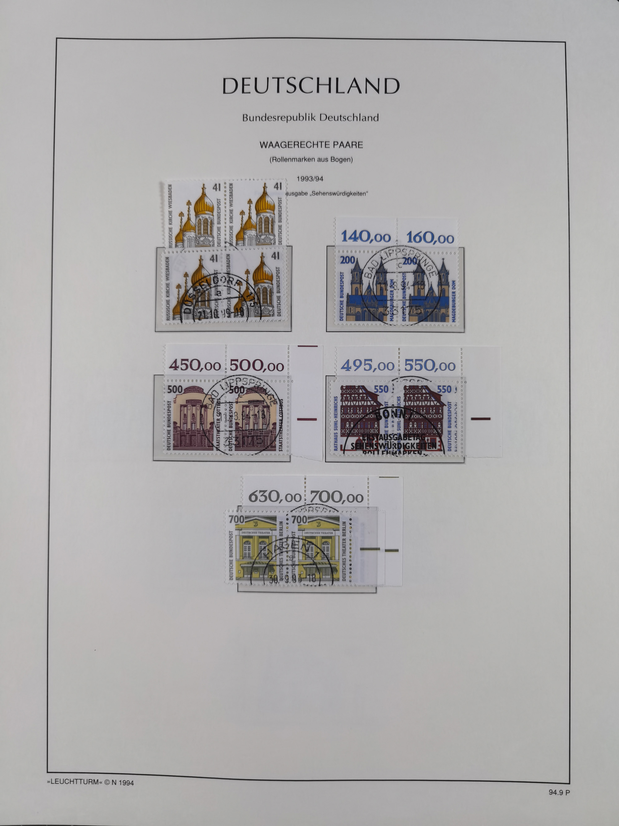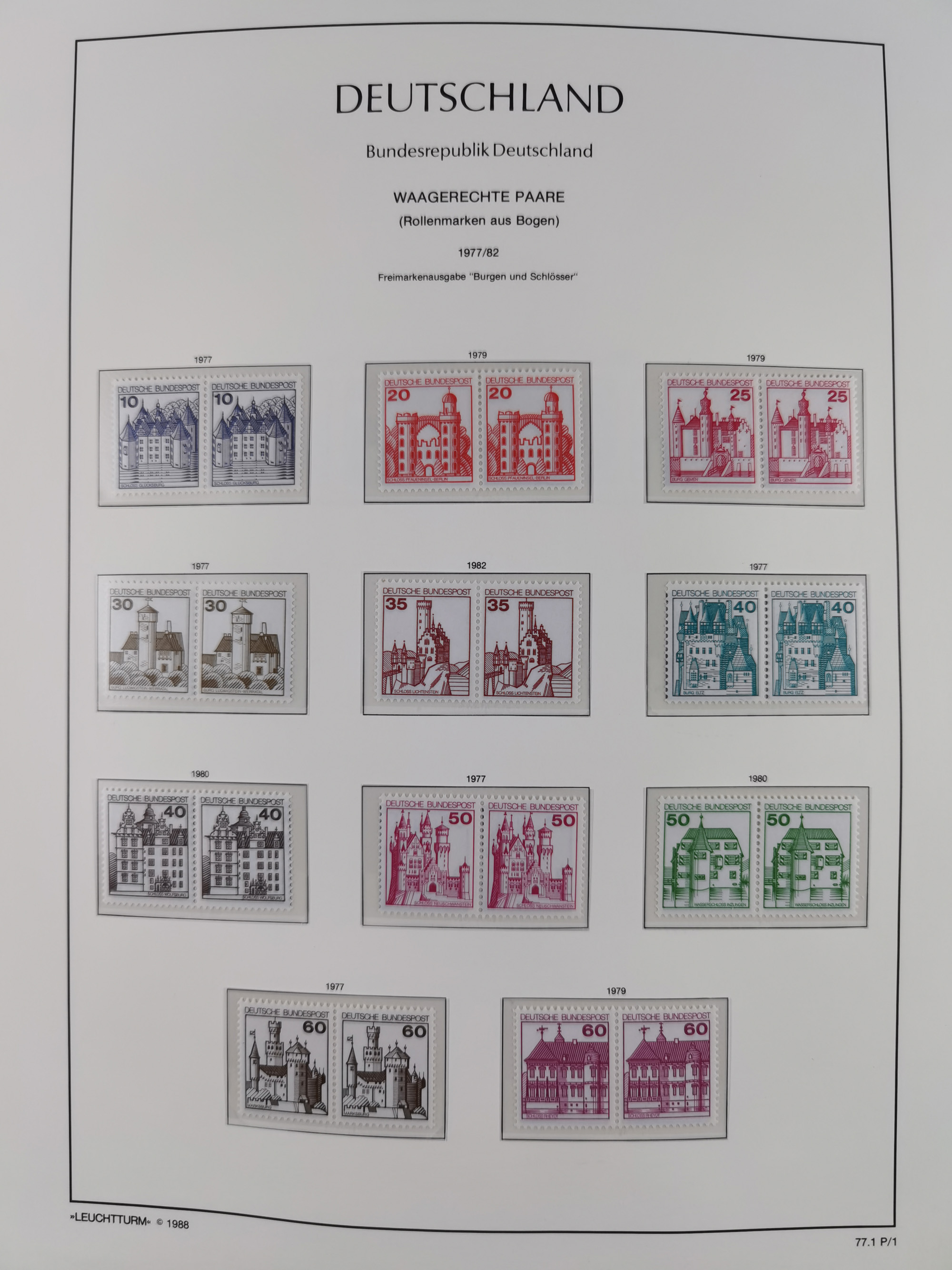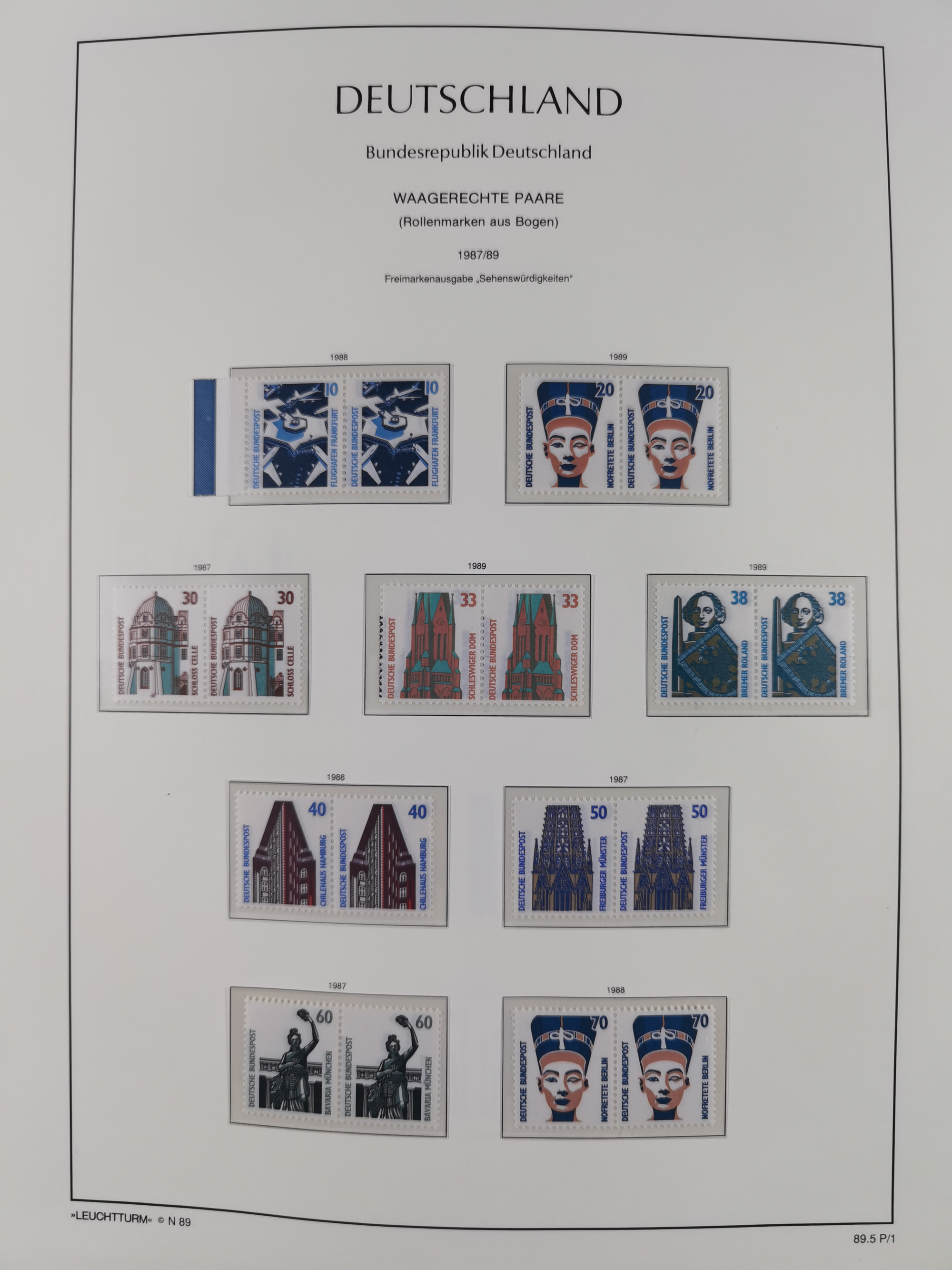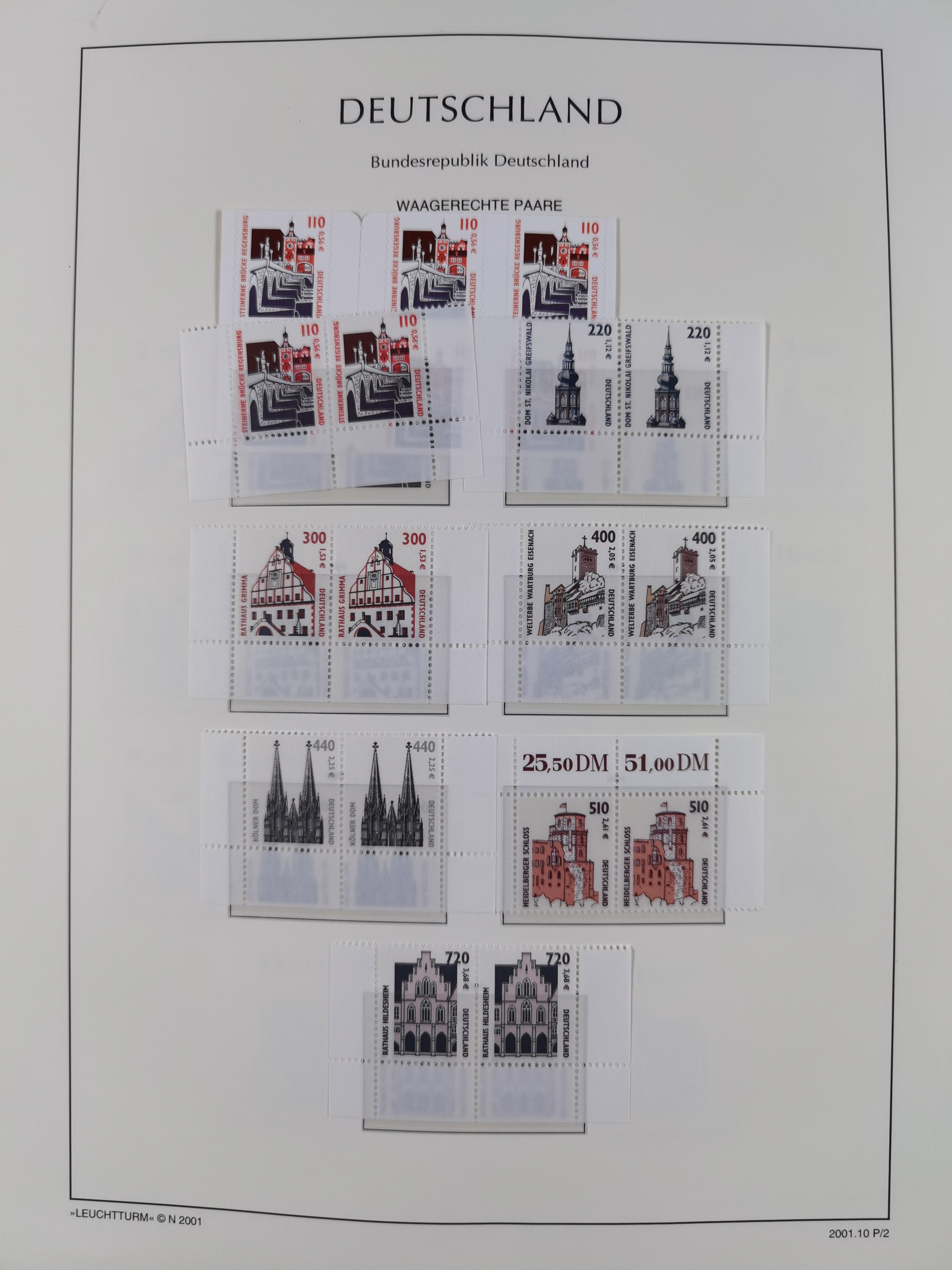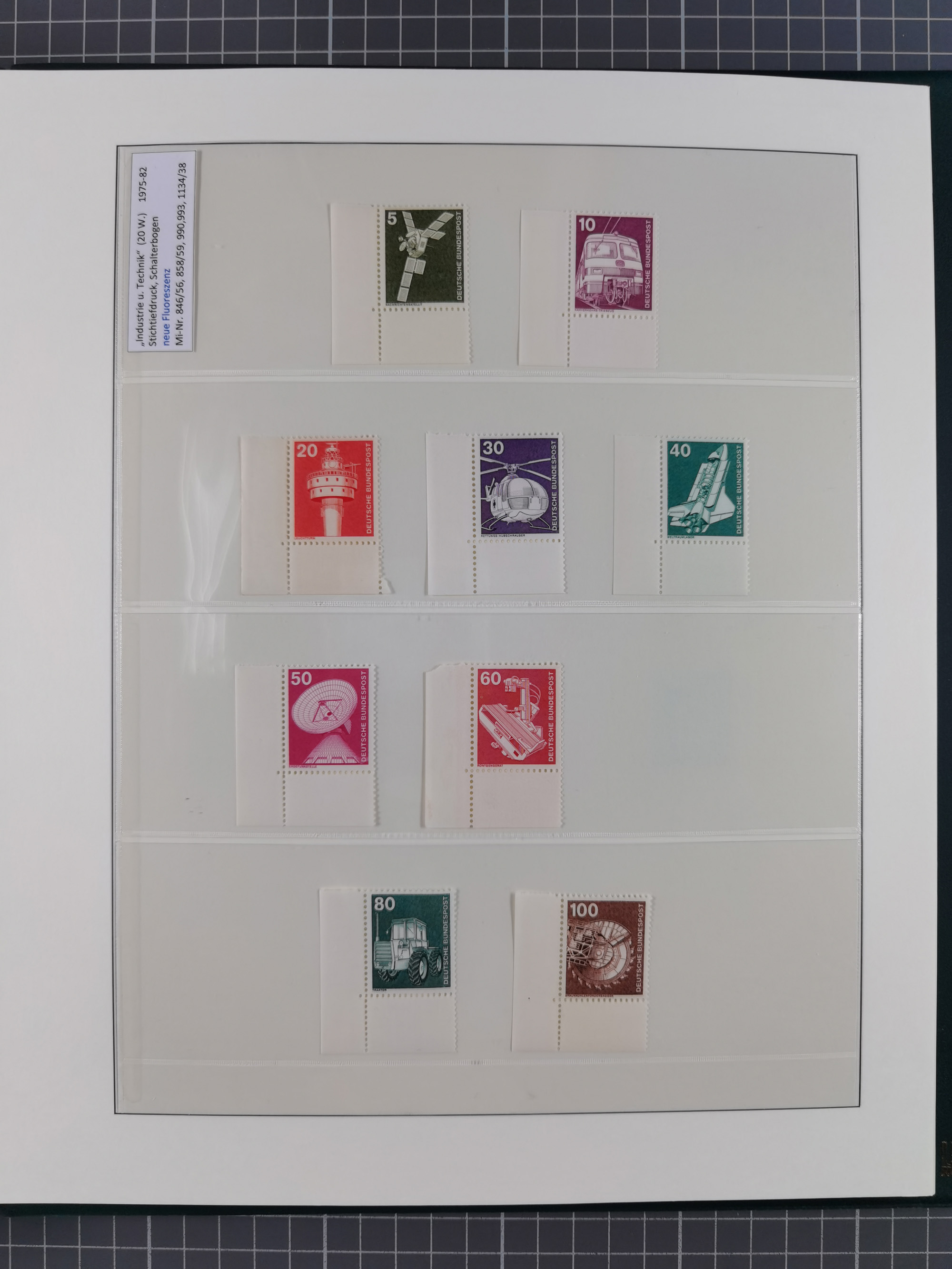 1951/94, postfrische Sammlung Dauerserien, dabei Posthorn in waagerechten oder senkrechten Paaren mit 3 Attesten und 6 Befunden A. Schlegel BPP, Heuss I Eckrandviererblocks, teils mit Druckerzeichen (Attest H.-D. Schlegel BPP). Heuss lumogen mit DZ Befund H.-D. Schlegel BPP. Heuss II Befund H-D Schlegel BPP. Danach Heuss III bis bedeutende Frauen 1994 alles Eckrandviererblocks oben links mit vielen Druckerzeichen und sonstigen Randbesonderheiten, im Lindner-Falzlosalbum.