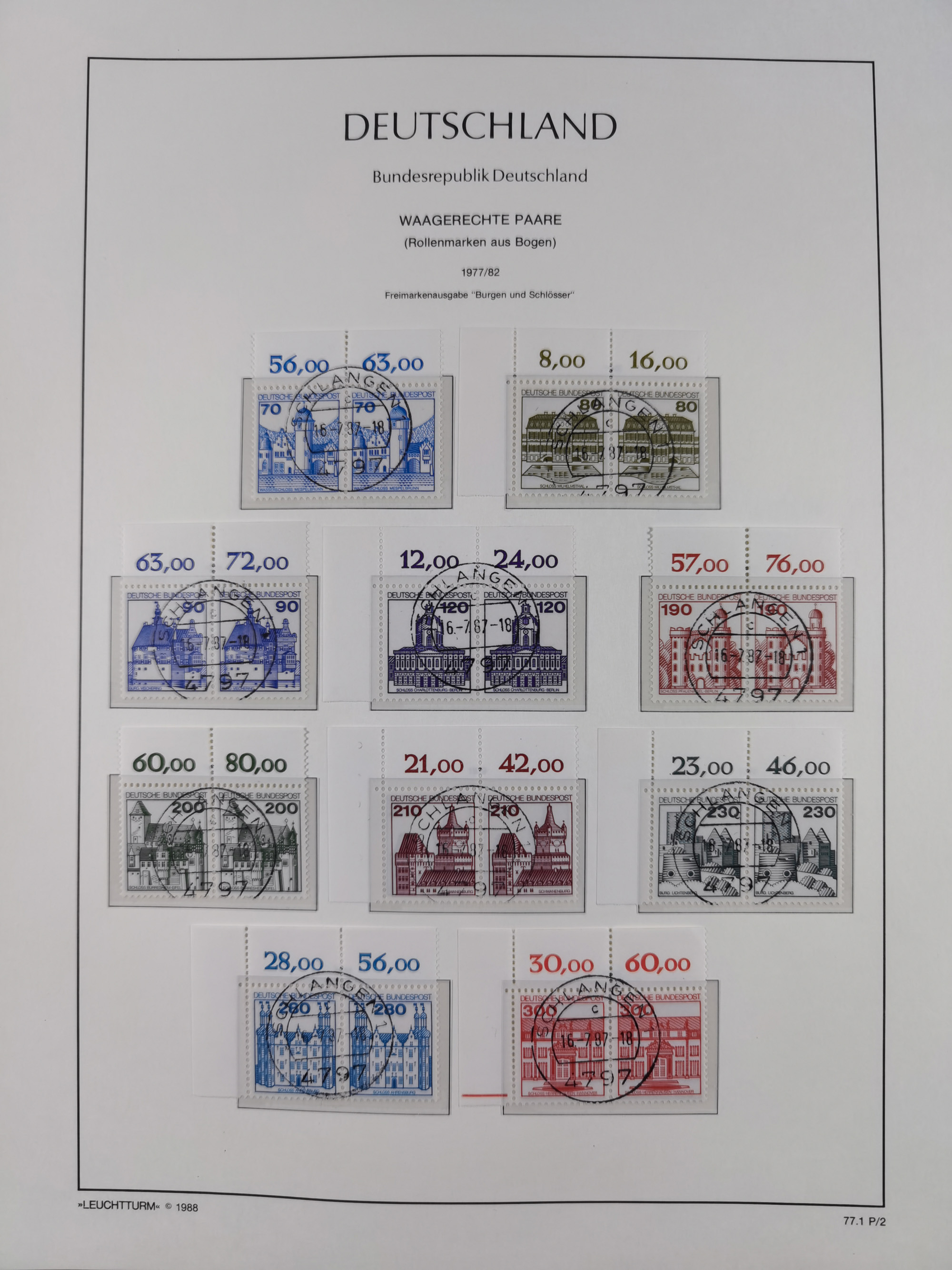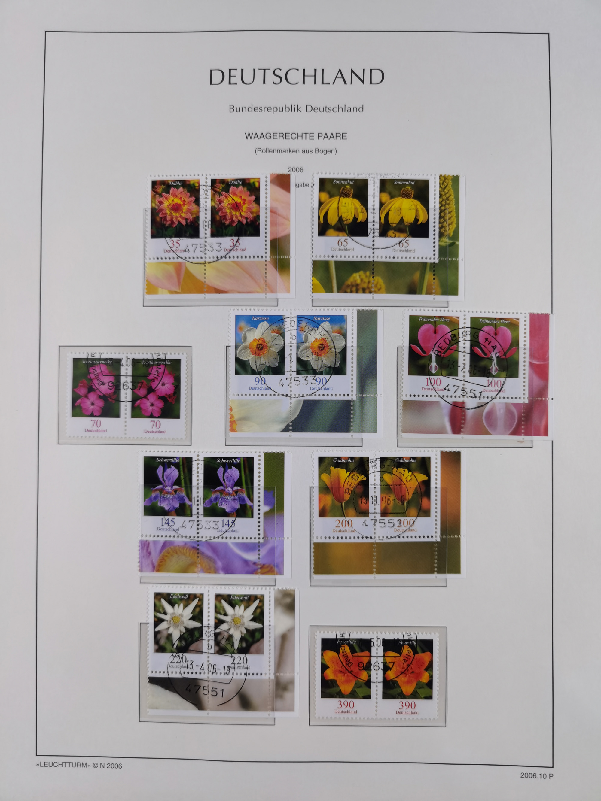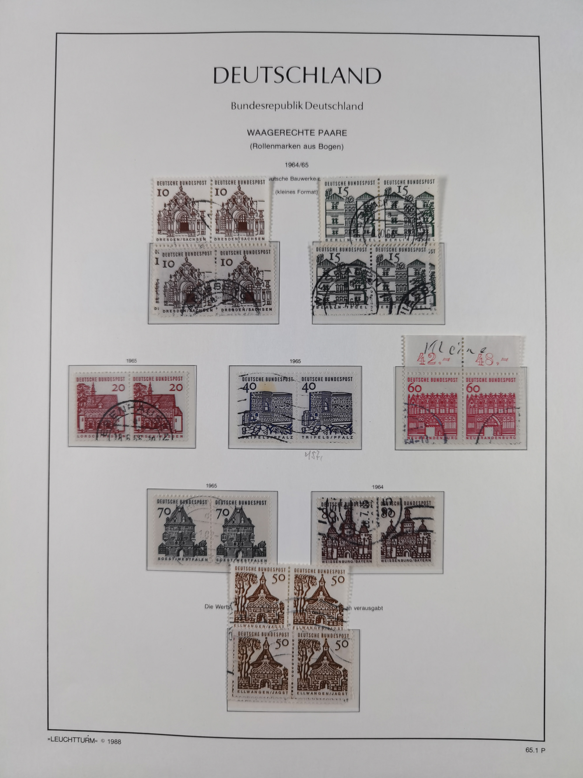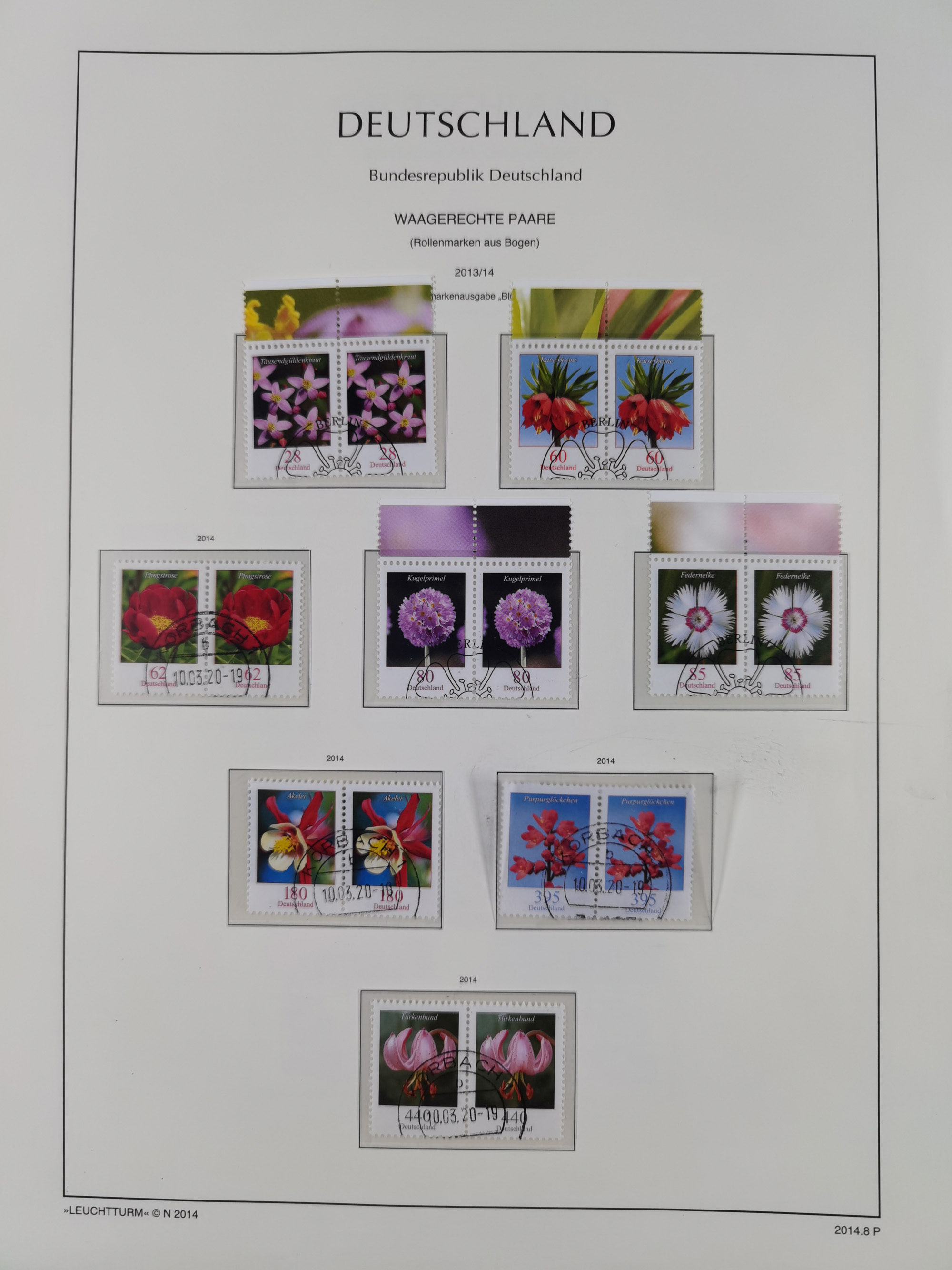 1949/2014, meist gestempelter Bestand mit Dauerserien-Besonderheiten, Paaren, Einheiten und Marken mit Rändern. Der Schwerpunkt liegt bei Bund mit u.a. gestempelte Paare, Viererblocks (u.a. 2x 50 Pfg.) und 6er-Block der 50 Pfg. und reichlich Material im modernen Bereich mit u.a. Blumen-Ausgabe mit vielen Einheiten, Bogenecken usw., in sechs Alben
