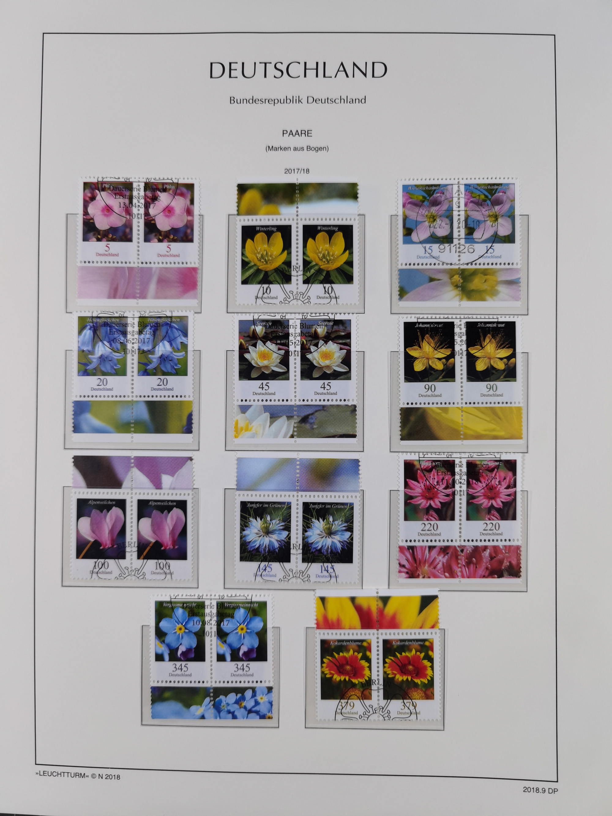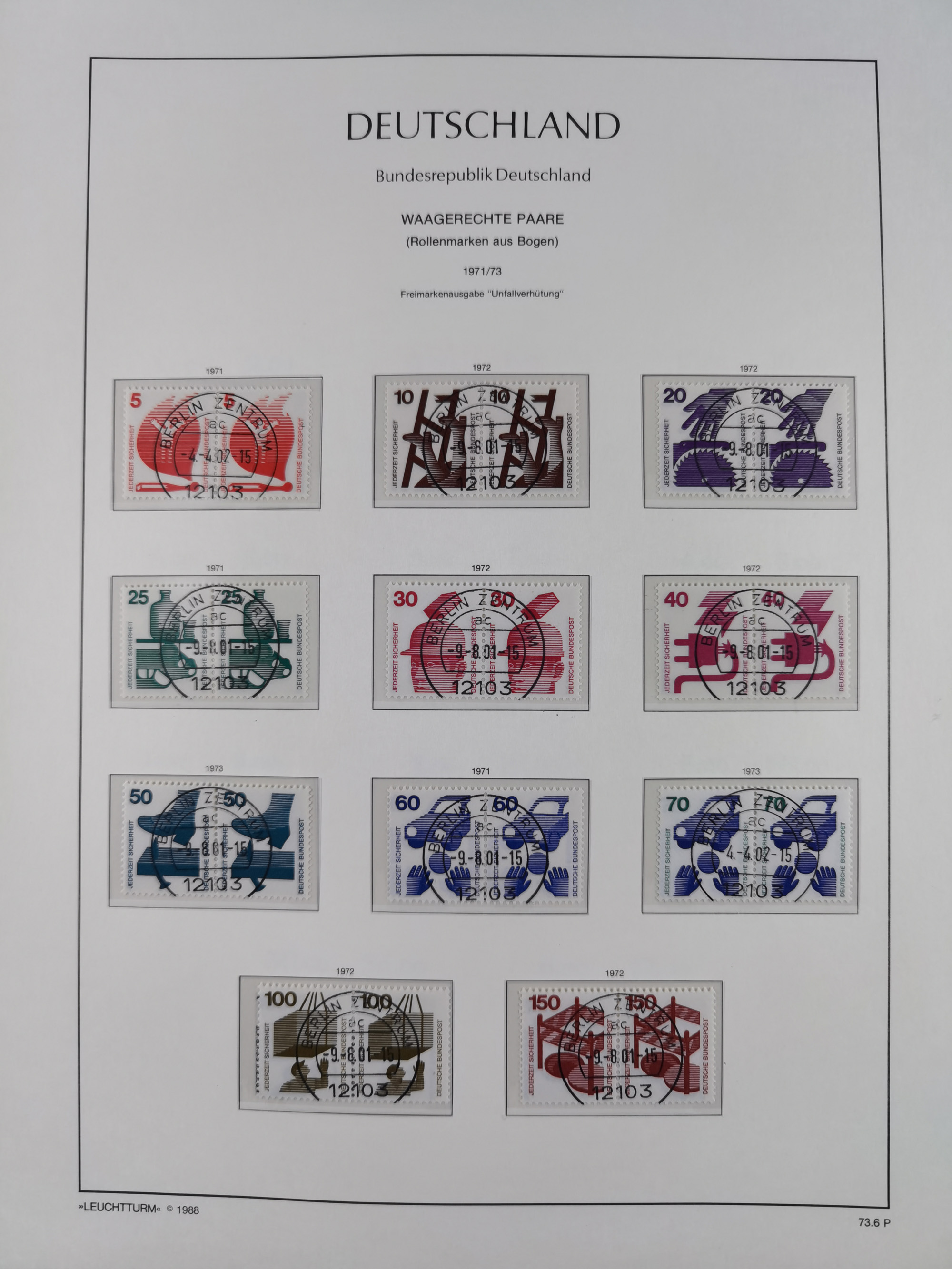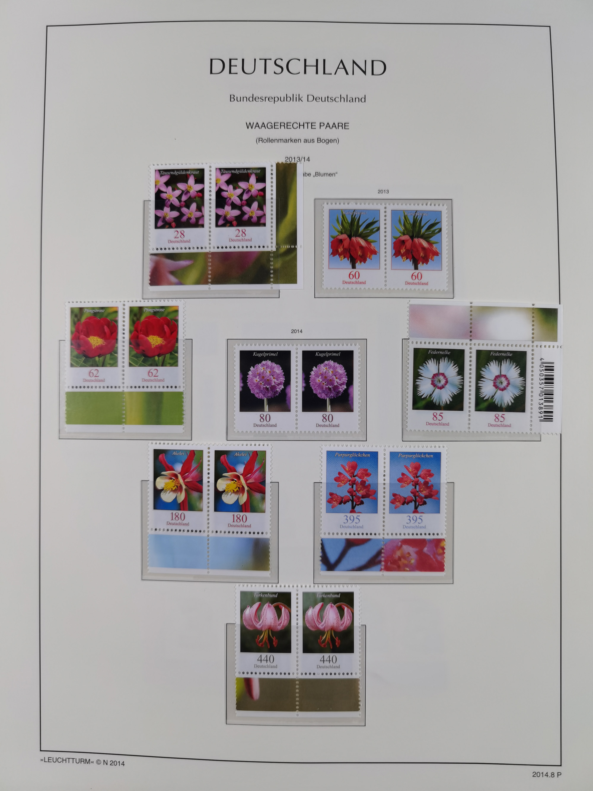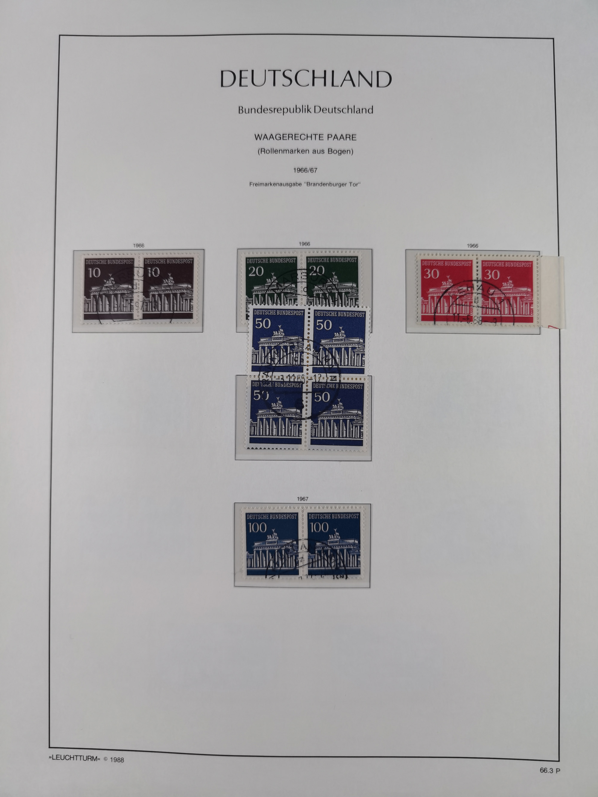 1949/2014, meist gestempelter Bestand mit Dauerserien-Besonderheiten, Paaren, Einheiten und Marken mit Rändern. Der Schwerpunkt liegt bei Bund mit u.a. gestempelte Paare, Viererblocks (u.a. 2x 50 Pfg.) und 6er-Block der 50 Pfg. und reichlich Material im modernen Bereich mit u.a. Blumen-Ausgabe mit vielen Einheiten, Bogenecken usw., in sechs Alben