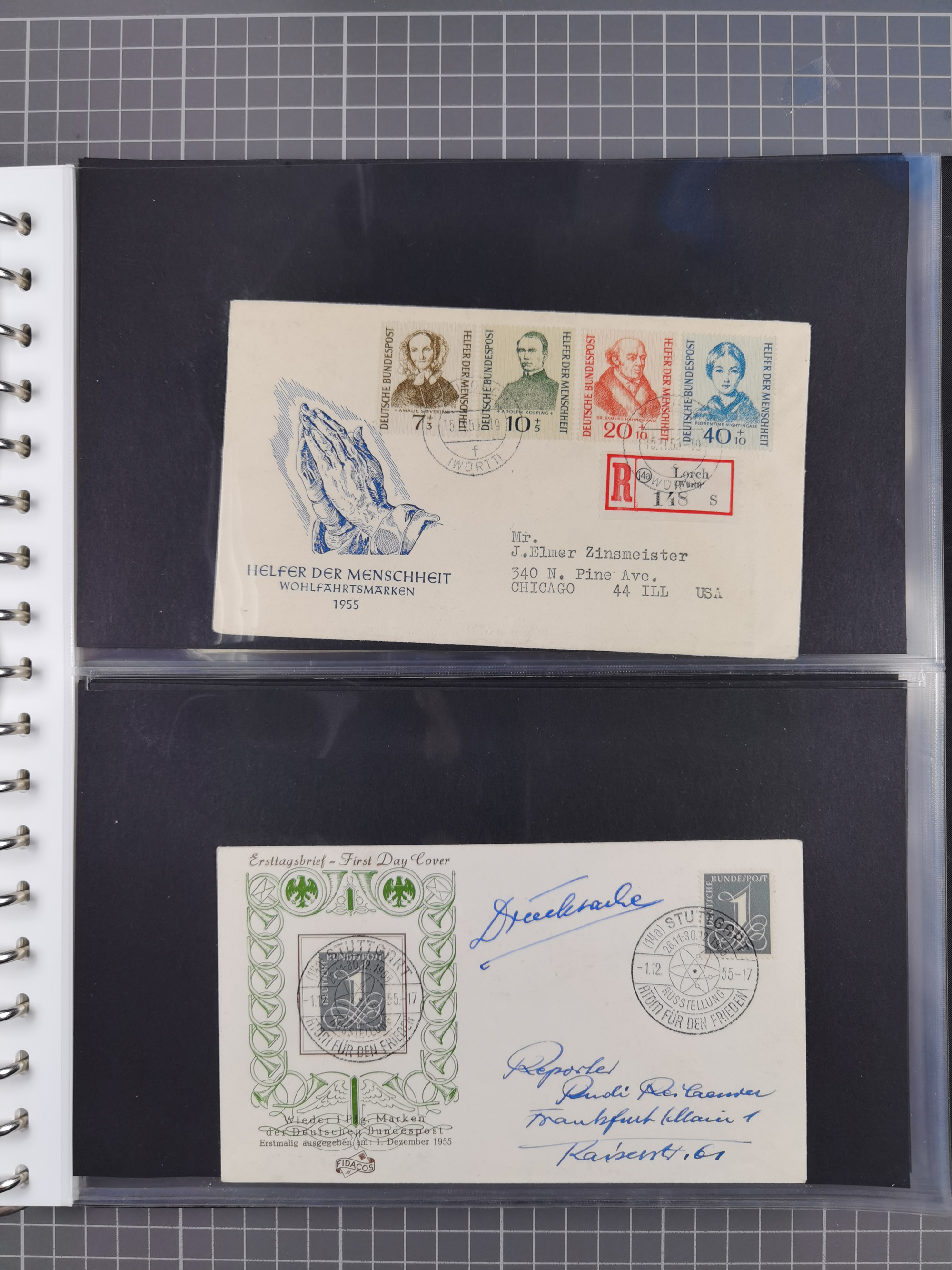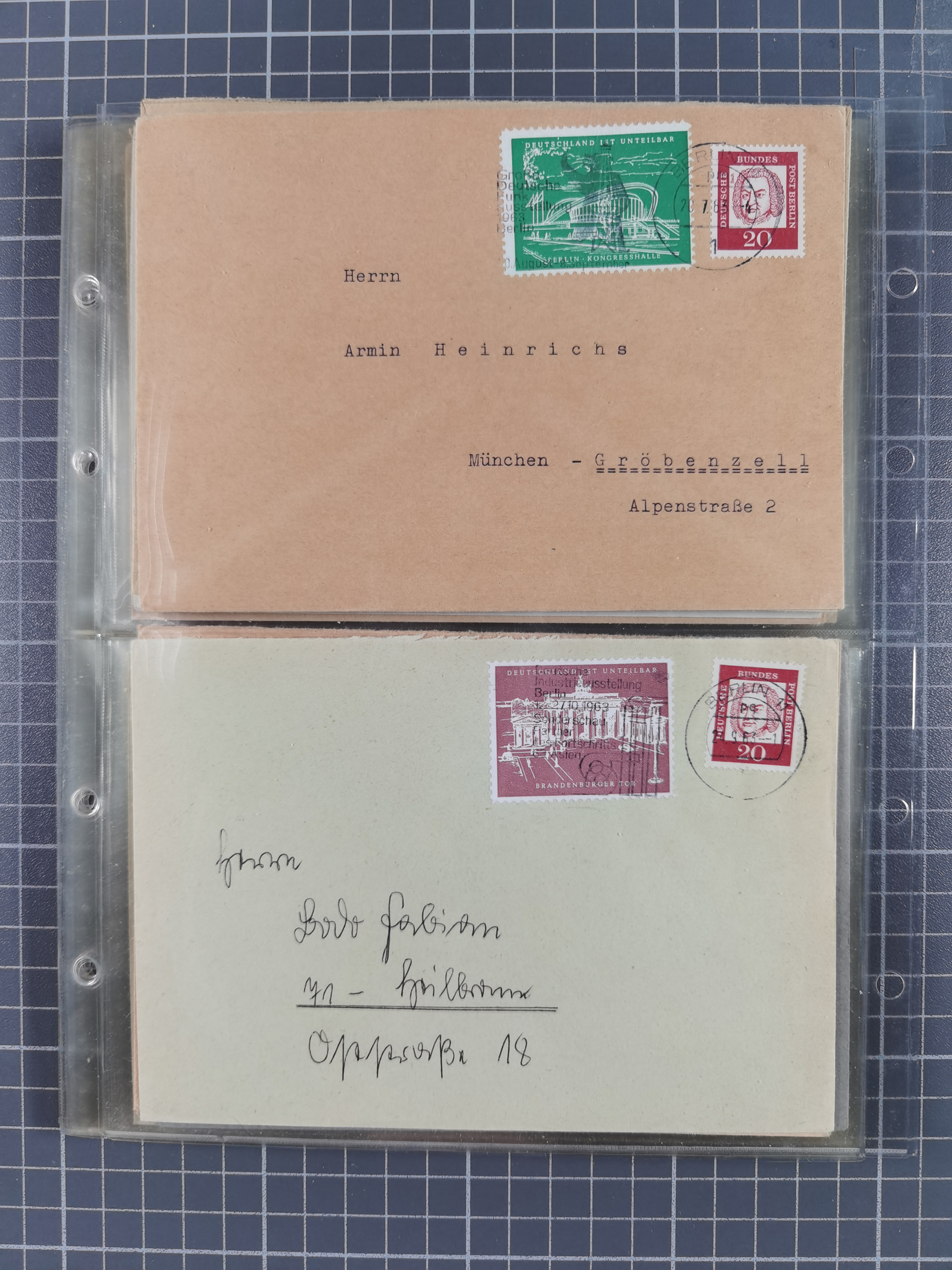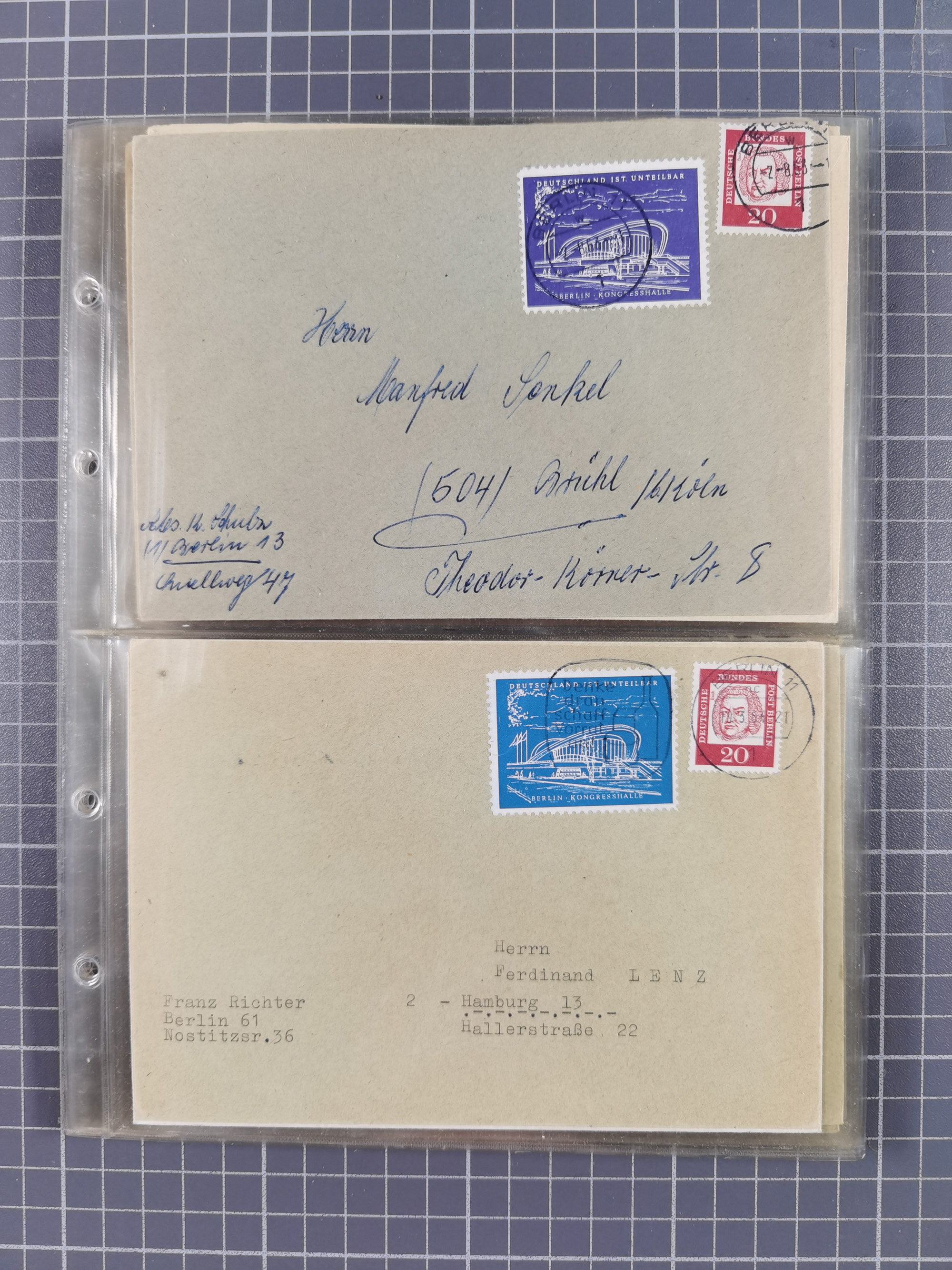 1949/2001, umfangreiche Sammlung mit geschätzt 5000 Briefen und Karten mit vielen besseren Einzel- und Mehrfachfrankaturen, R-Briefen, Portostufen, Luftpost, Auslandspost, Einheiten und besseren FDC. Dabei u.a. Mi.-Nr. 111-12FDC, 115 MEF auf R-Brief, 116 MEF auf R-Brief, Mi.-Nr. 121-22 je im Paar auf R-Brief “Bonn-Bundeshaus”, 139 MEF, 146 (3) MEF auf R-Auslandsbrief, 159-59 FDC, 156 (5) MEF, 188 im waagerechten Paar auf LP-Brief mit Portomarken, Heftchenblatt 8YI auf Eilbotenbrief, 225 MEF auf R-Brief, 260 im waagerechten Paar auf Eilbotenbrief und 263 im waagerechten Paar auf Erstflugbrief
