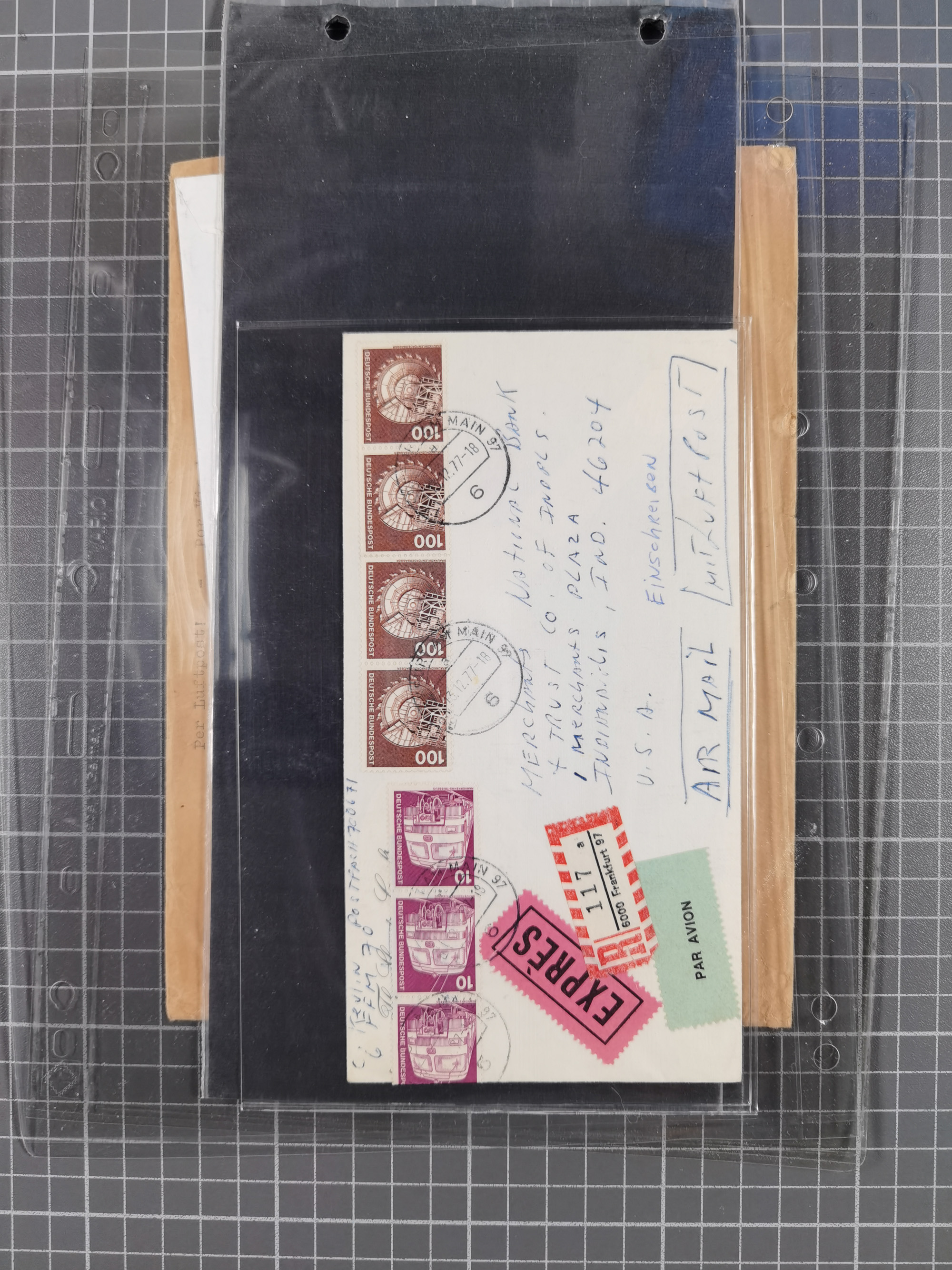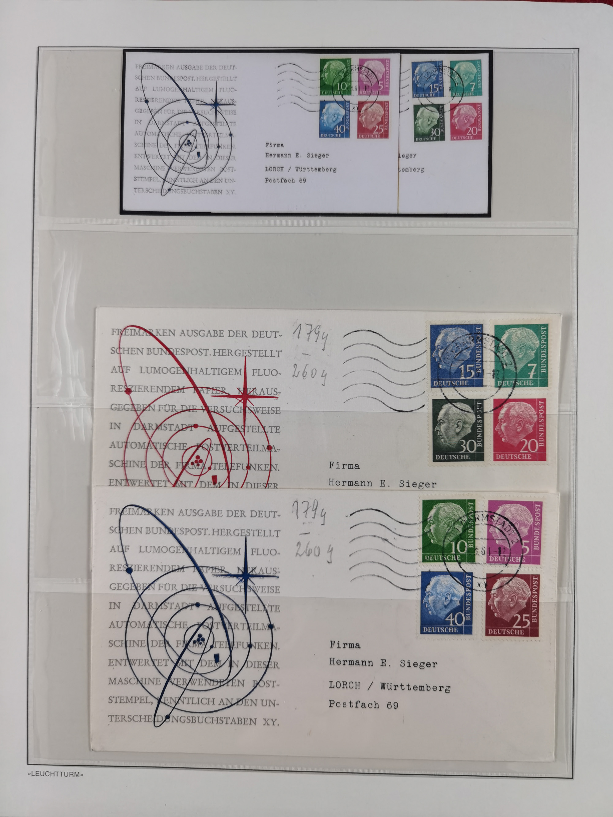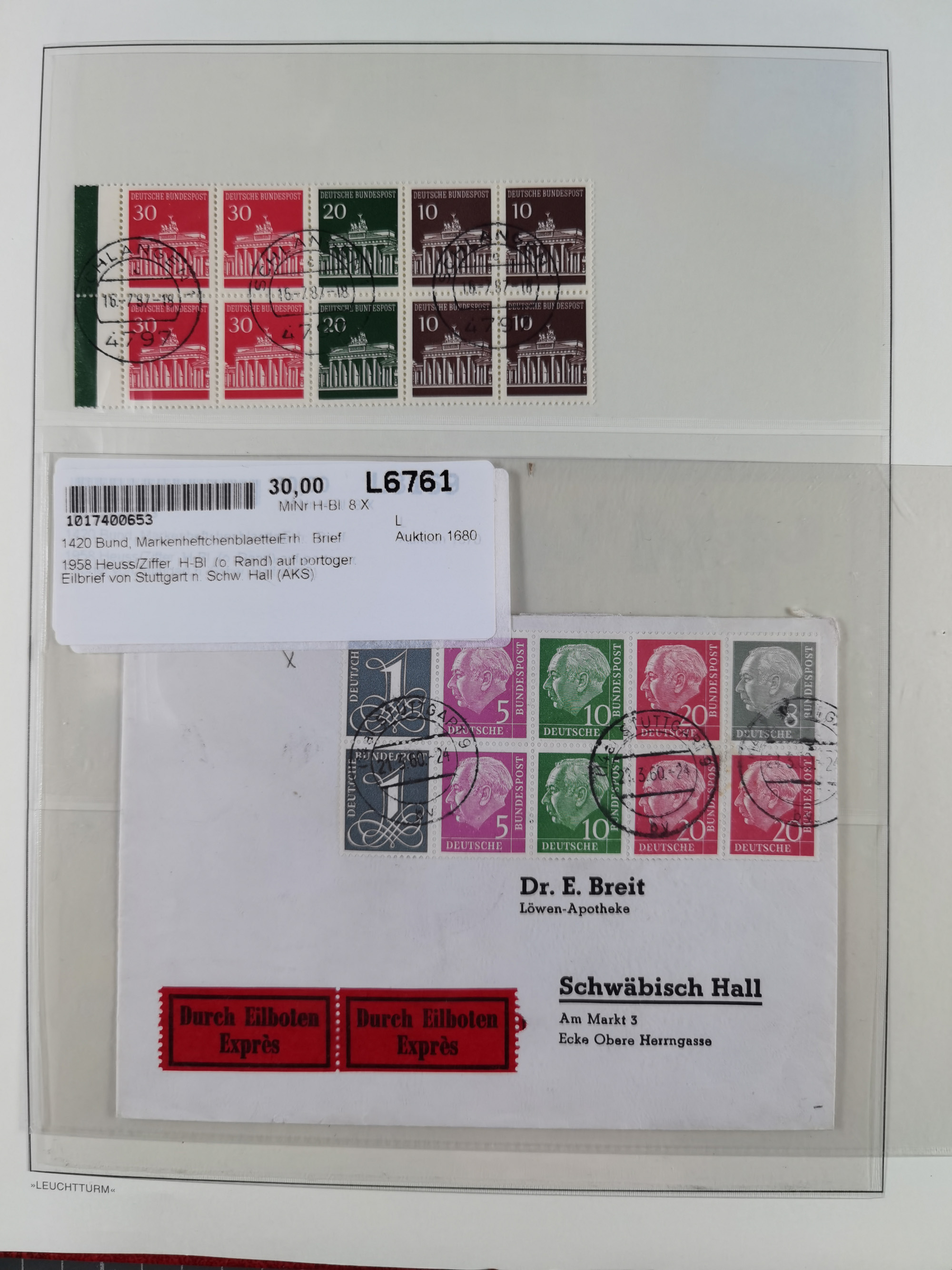 1949/2001, umfangreiche Sammlung mit geschätzt 5000 Briefen und Karten mit vielen besseren Einzel- und Mehrfachfrankaturen, R-Briefen, Portostufen, Luftpost, Auslandspost, Einheiten und besseren FDC. Dabei u.a. Mi.-Nr. 111-12FDC, 115 MEF auf R-Brief, 116 MEF auf R-Brief, Mi.-Nr. 121-22 je im Paar auf R-Brief “Bonn-Bundeshaus”, 139 MEF, 146 (3) MEF auf R-Auslandsbrief, 159-59 FDC, 156 (5) MEF, 188 im waagerechten Paar auf LP-Brief mit Portomarken, Heftchenblatt 8YI auf Eilbotenbrief, 225 MEF auf R-Brief, 260 im waagerechten Paar auf Eilbotenbrief und 263 im waagerechten Paar auf Erstflugbrief