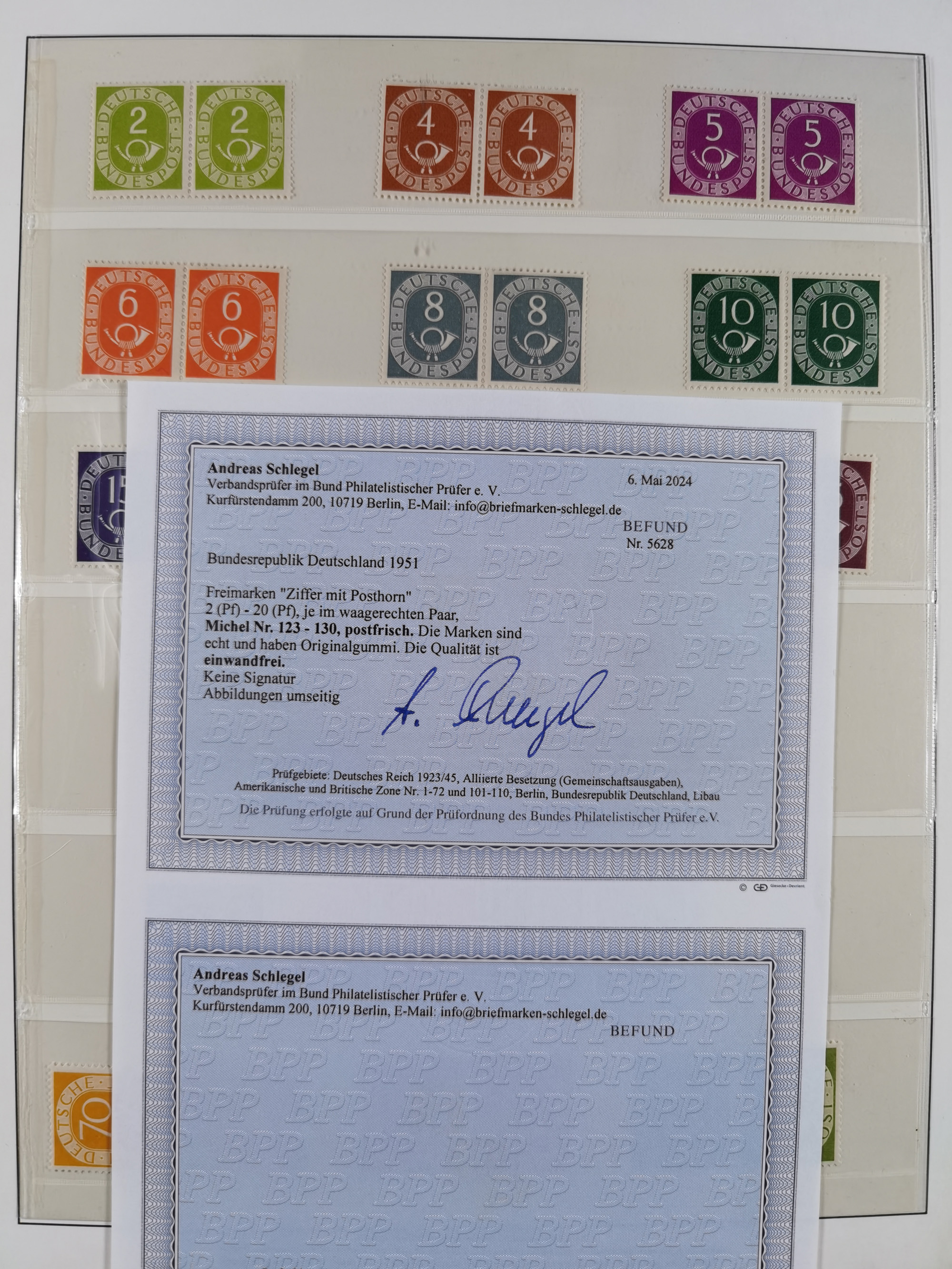 1949/82, in den Hauptnummern komplette postfrische Sammlung inkl. Posthornsatz und Heuss 50 und 60 Pfg. je mit Fotoattest Schlegel BPP, gute Erhaltung, in drei Vordruckalben
