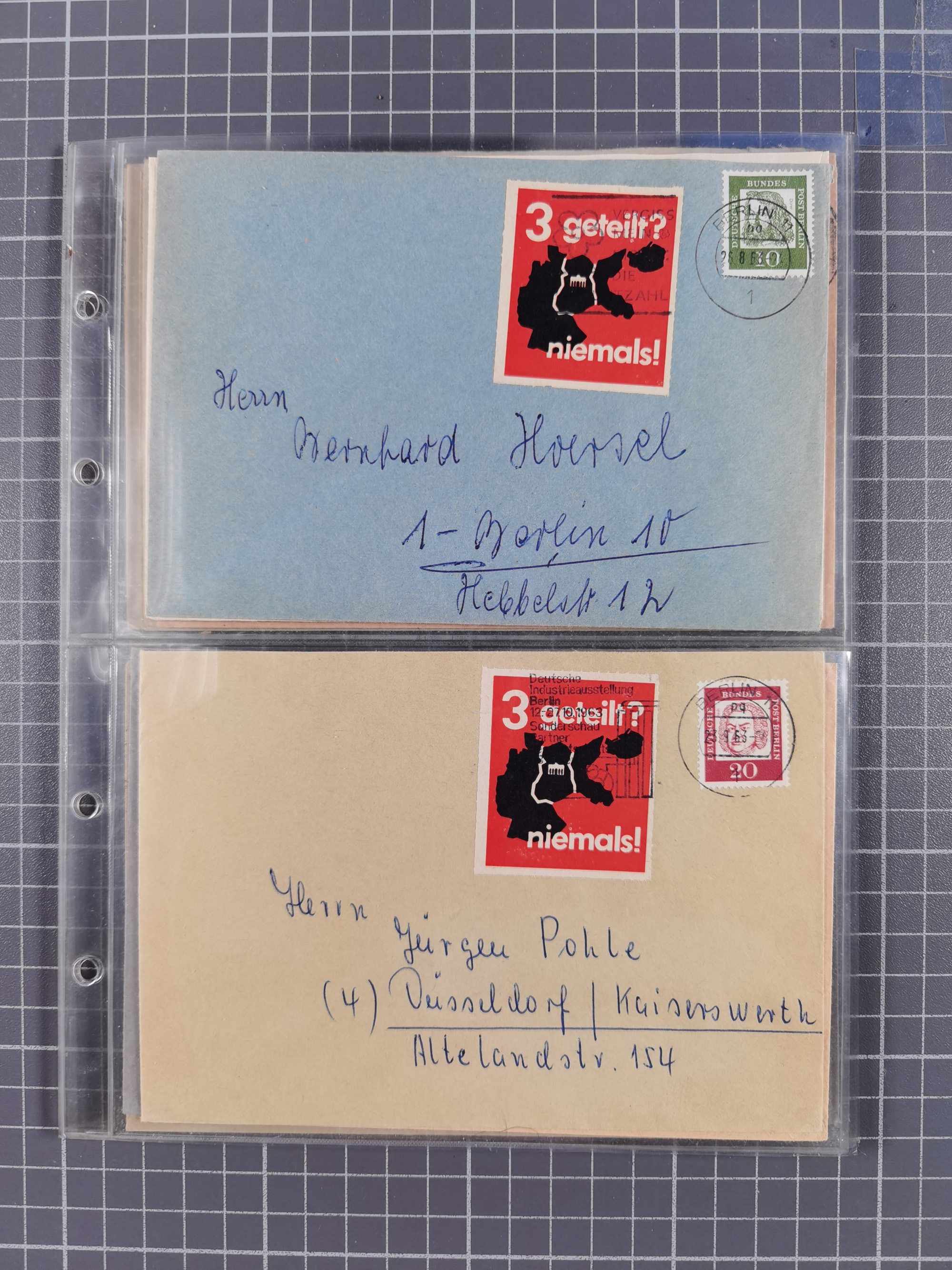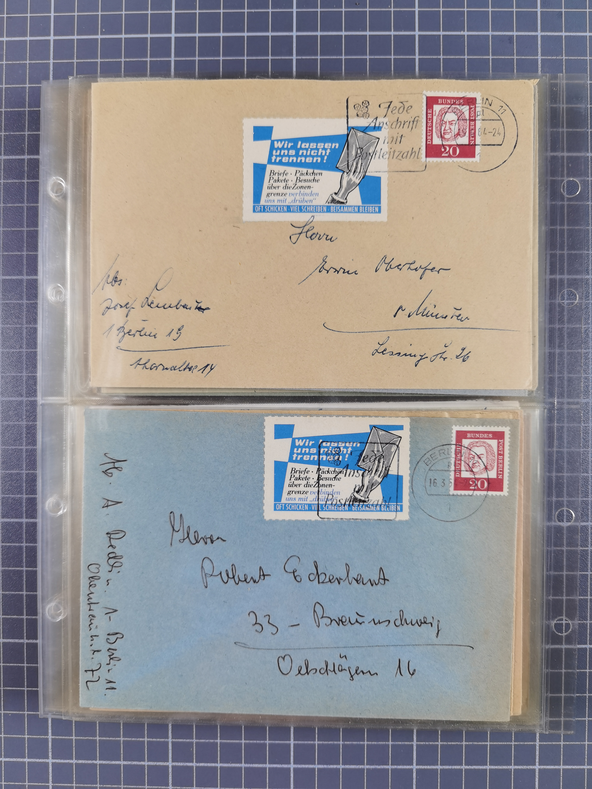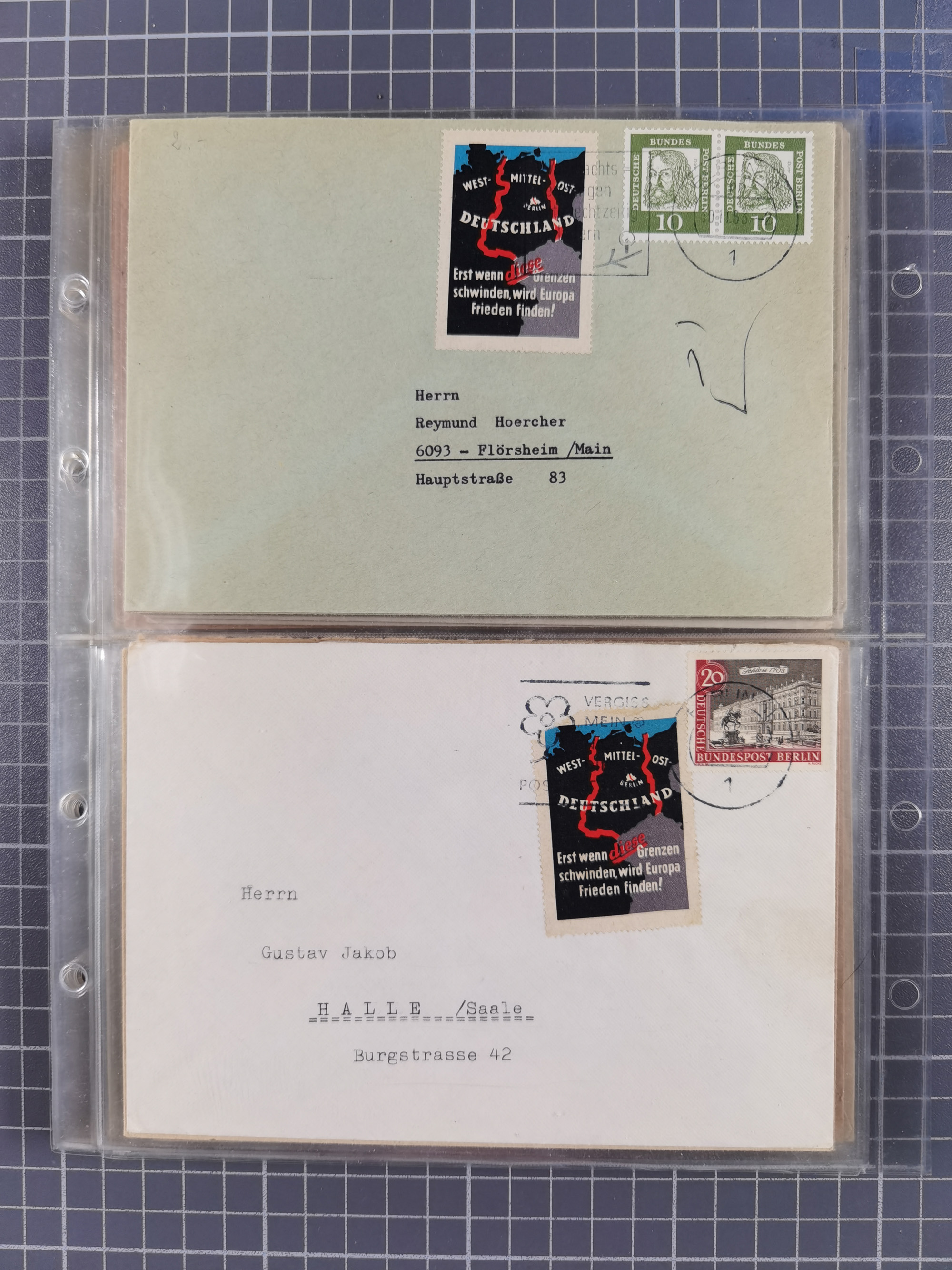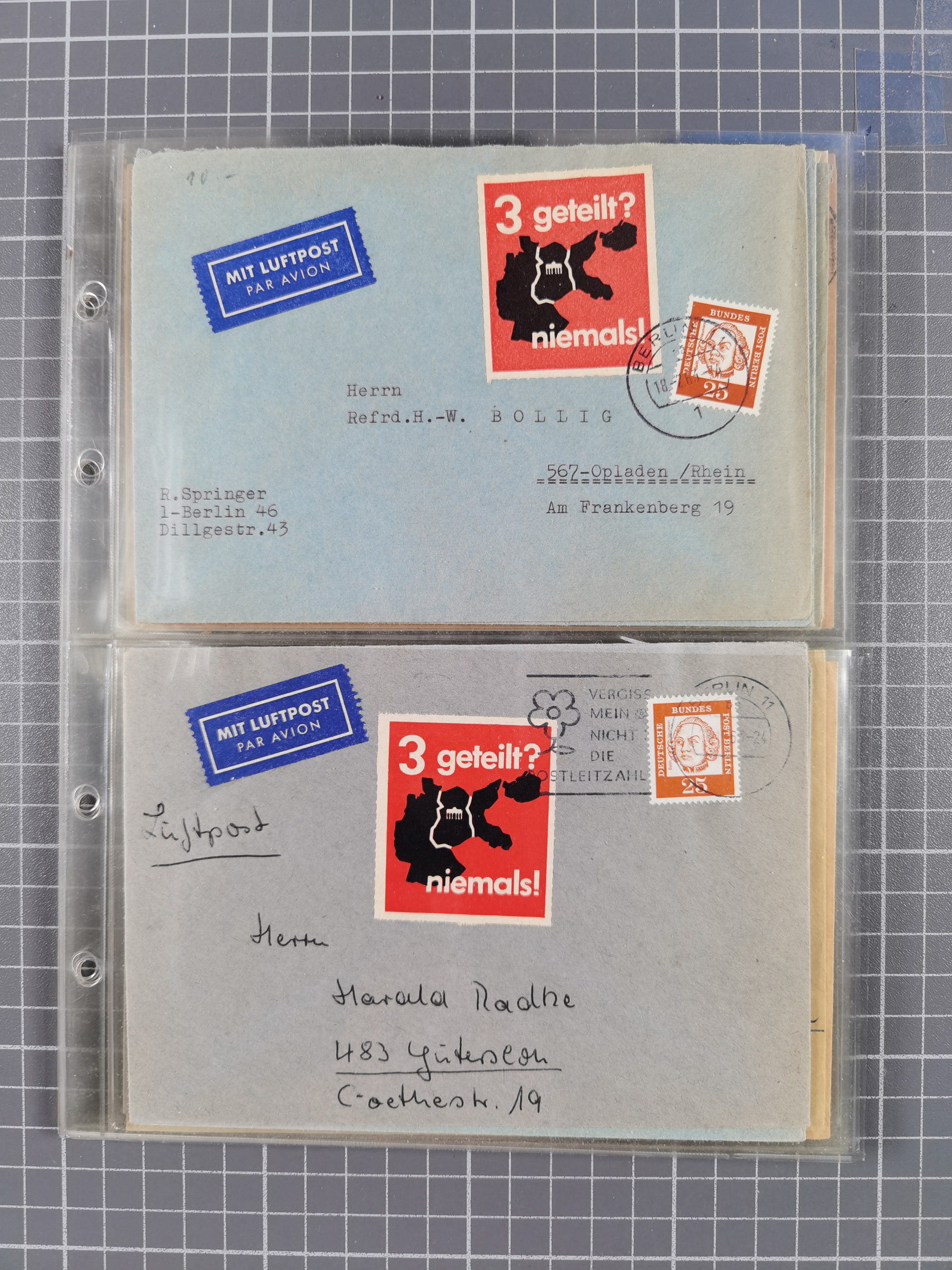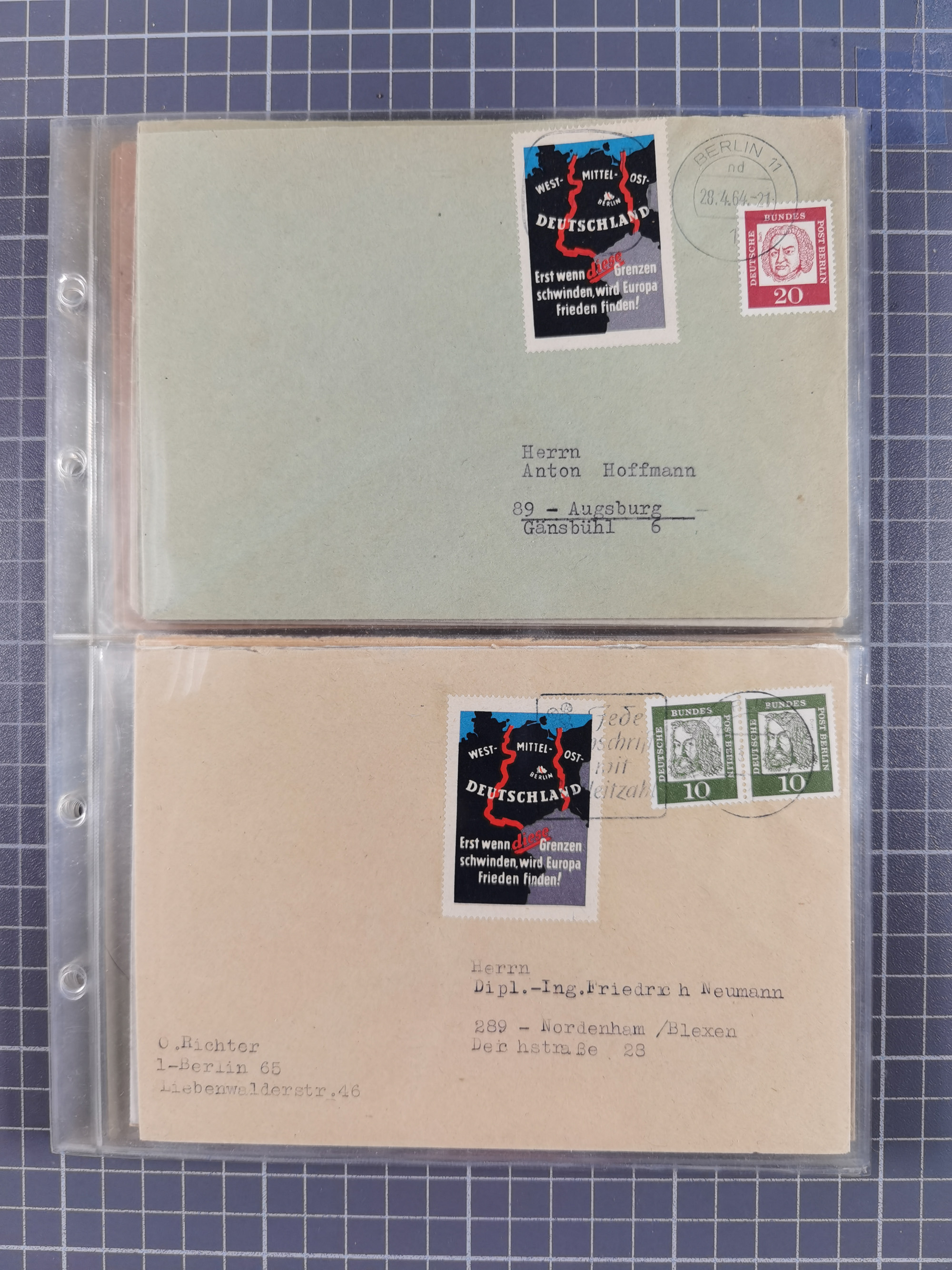 1962/64, Propaganda „Kalter Krieg", Sammlung von 277 Briefen, alle mit Propaganda-Vignetten versehen („Kampf um Wiedervereinigung". 17. Juni", „Die Mauer überwinden", Brücken bauen! Per Post oder Paket". „Wir lassen uns nicht trennen". 3 geteilt niemals!" usw. Alle Vignetten befinden sich auf Bedarfsbriefen und sind postalisch zusammen mit der Normalfrankatur abgestempelt, dabei auch 43 Luftpostbriefe, selten angeboten. Dazu noch 48 Belege Postkrieg".