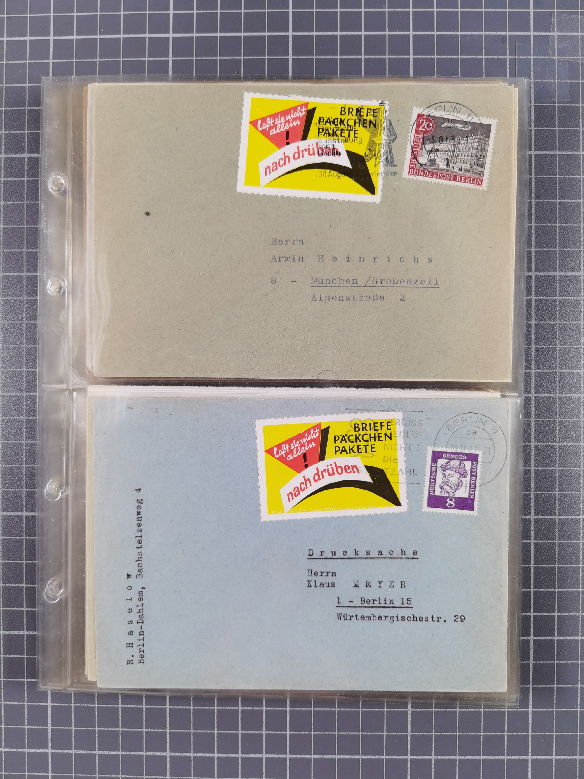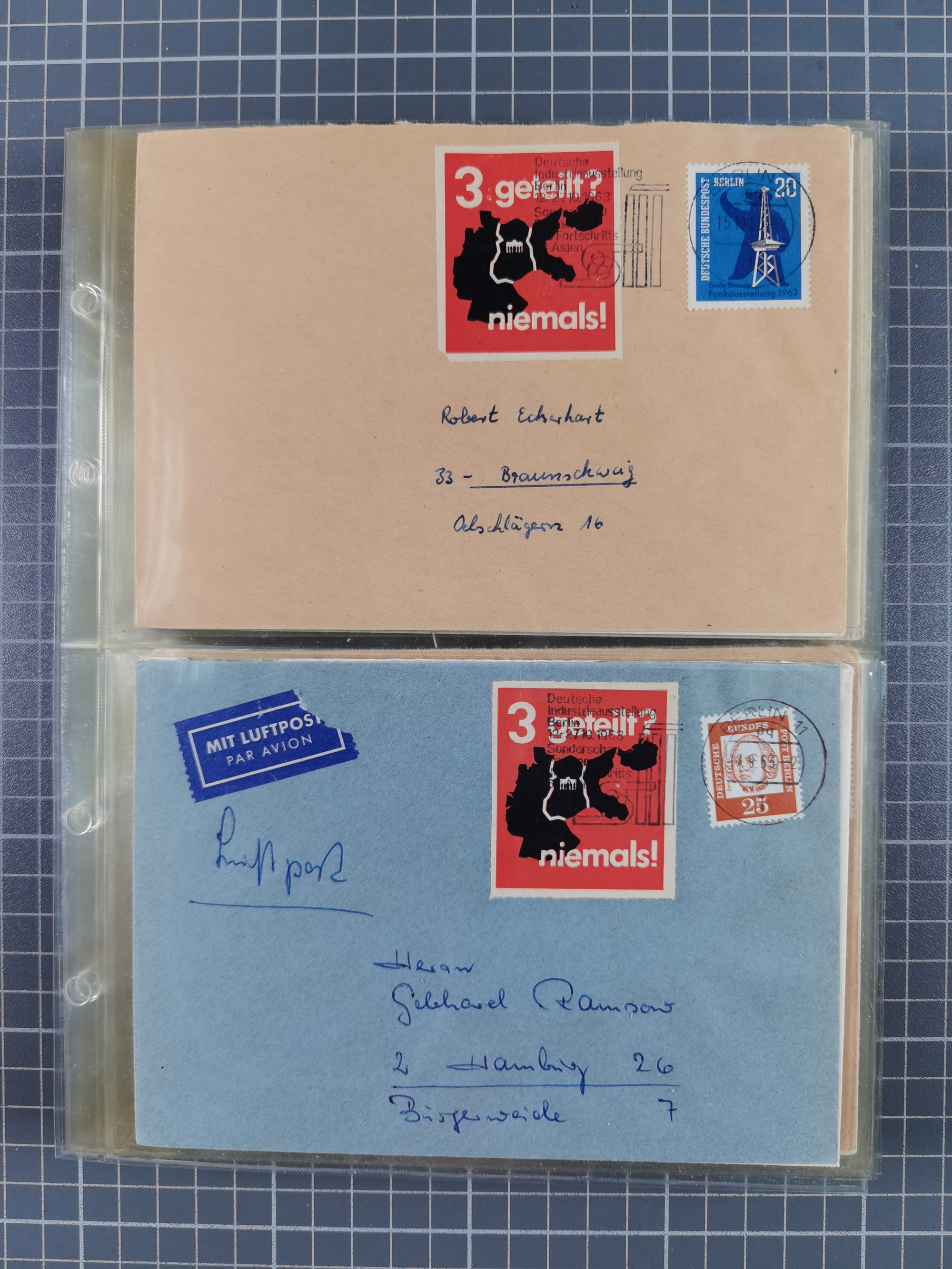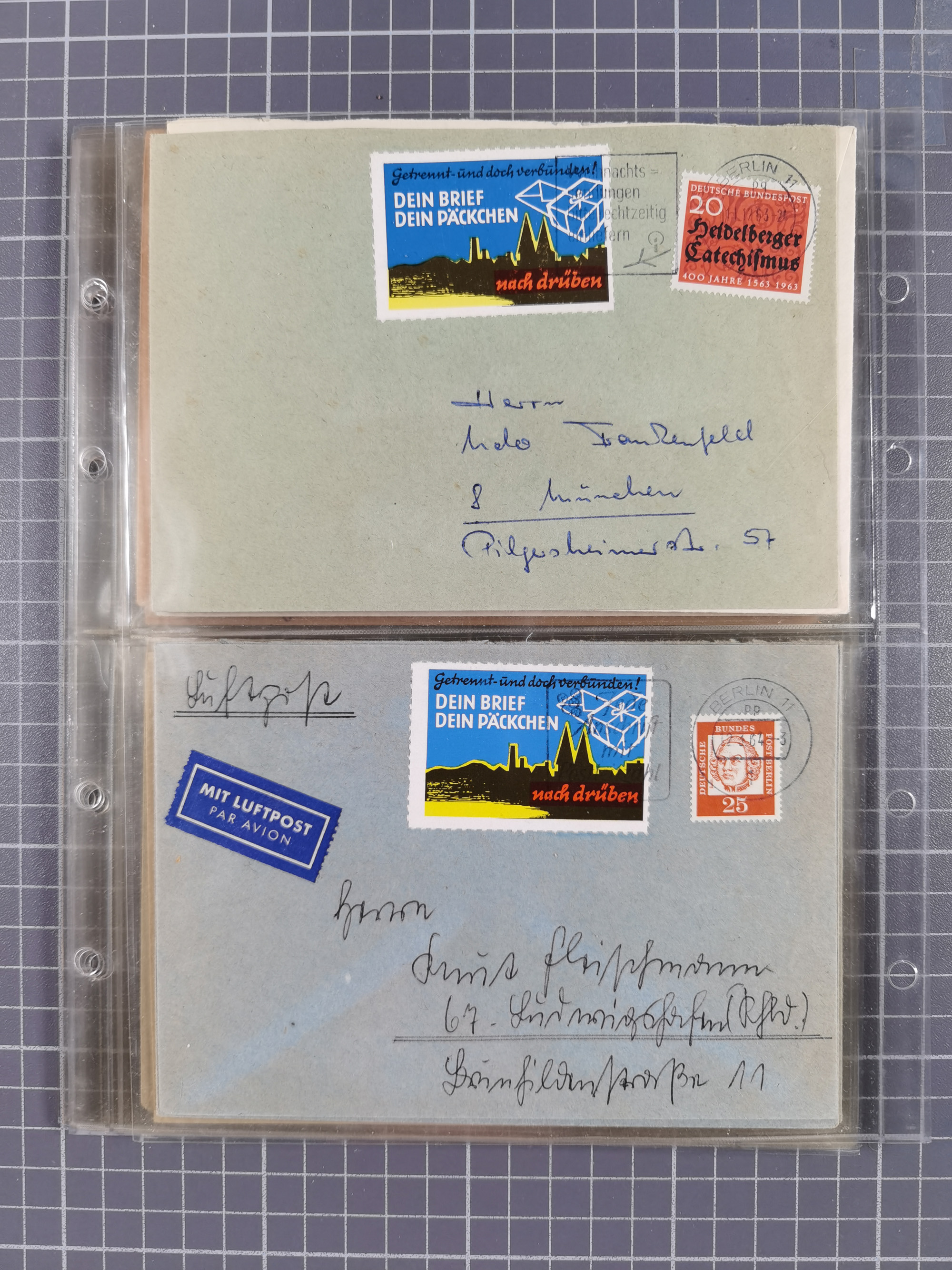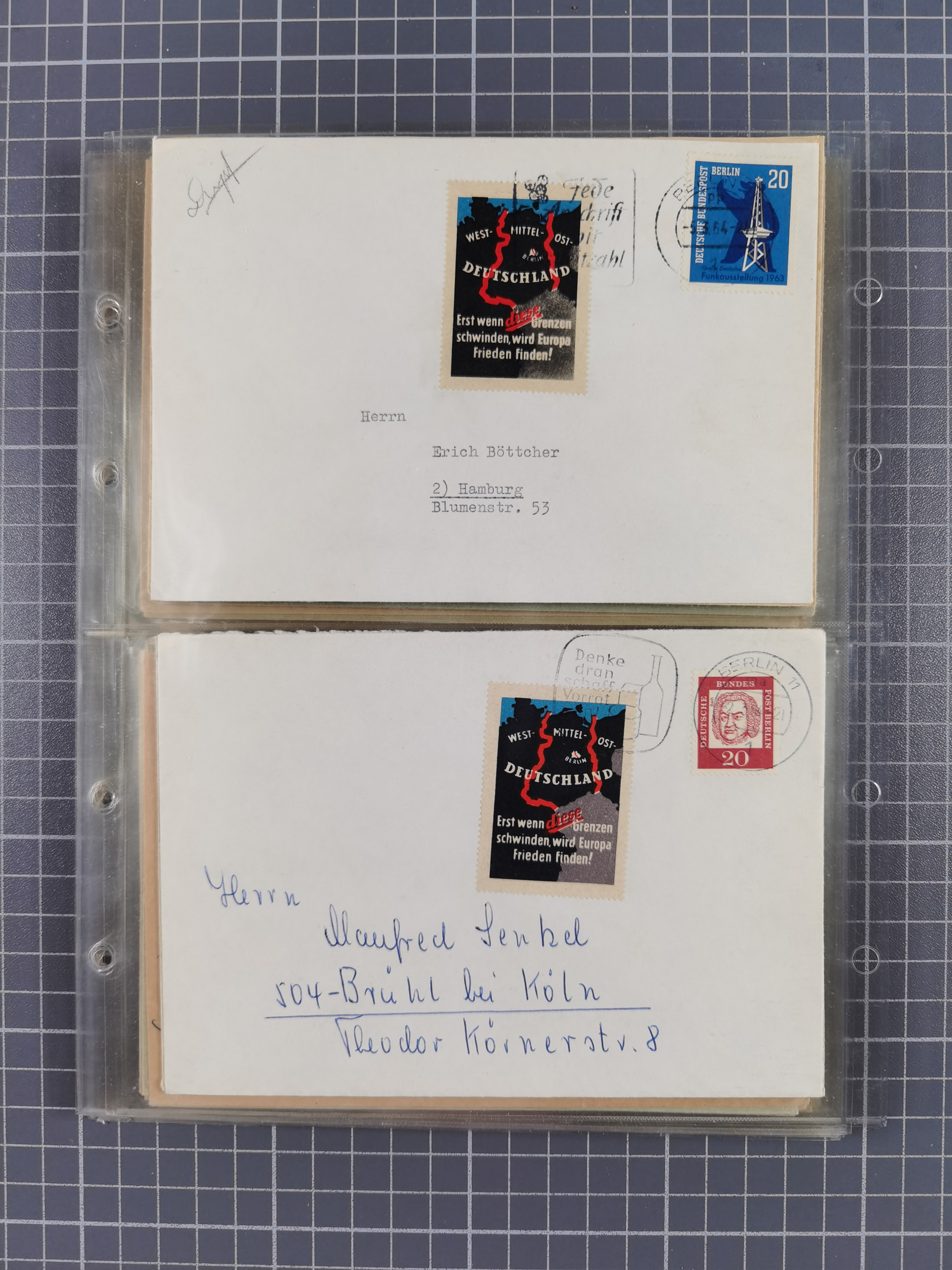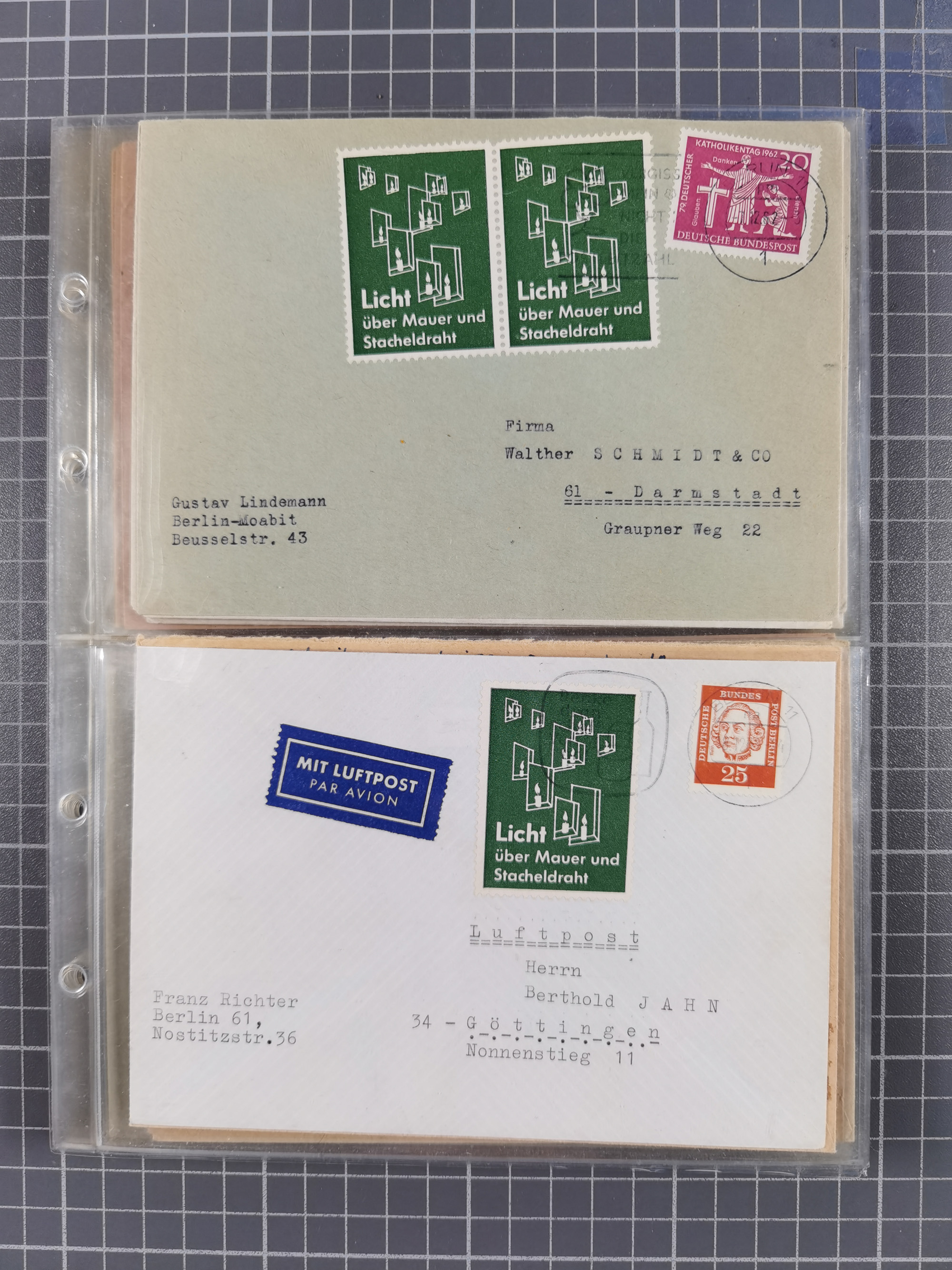 1962/64, Propaganda „Kalter Krieg", Sammlung von 277 Briefen, alle mit Propaganda-Vignetten versehen („Kampf um Wiedervereinigung". 17. Juni", „Die Mauer überwinden", Brücken bauen! Per Post oder Paket". „Wir lassen uns nicht trennen". 3 geteilt niemals!" usw. Alle Vignetten befinden sich auf Bedarfsbriefen und sind postalisch zusammen mit der Normalfrankatur abgestempelt, dabei auch 43 Luftpostbriefe, selten angeboten. Dazu noch 48 Belege Postkrieg".