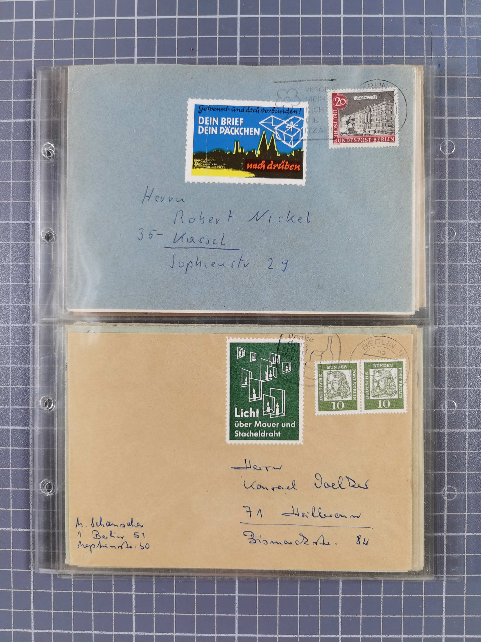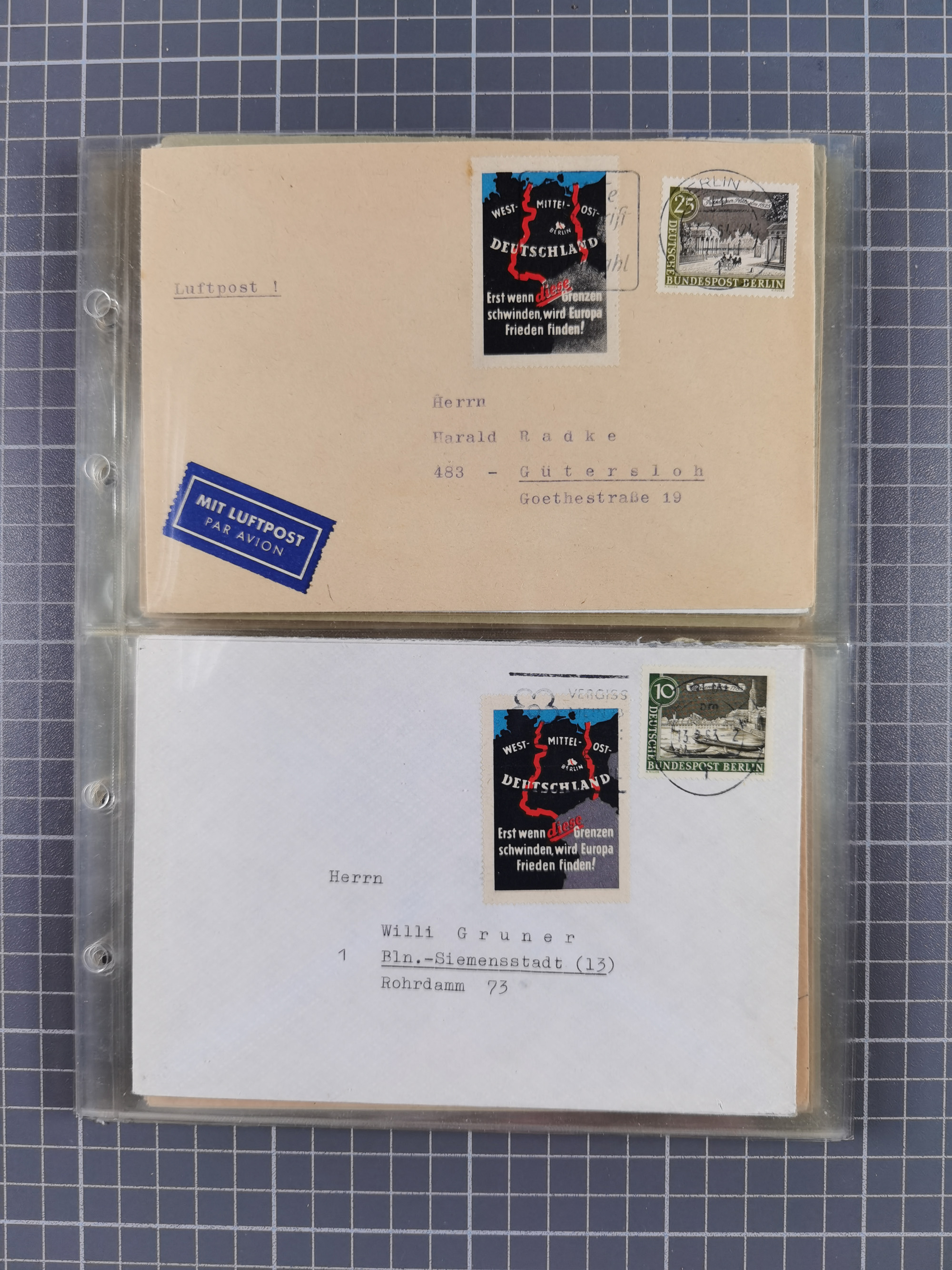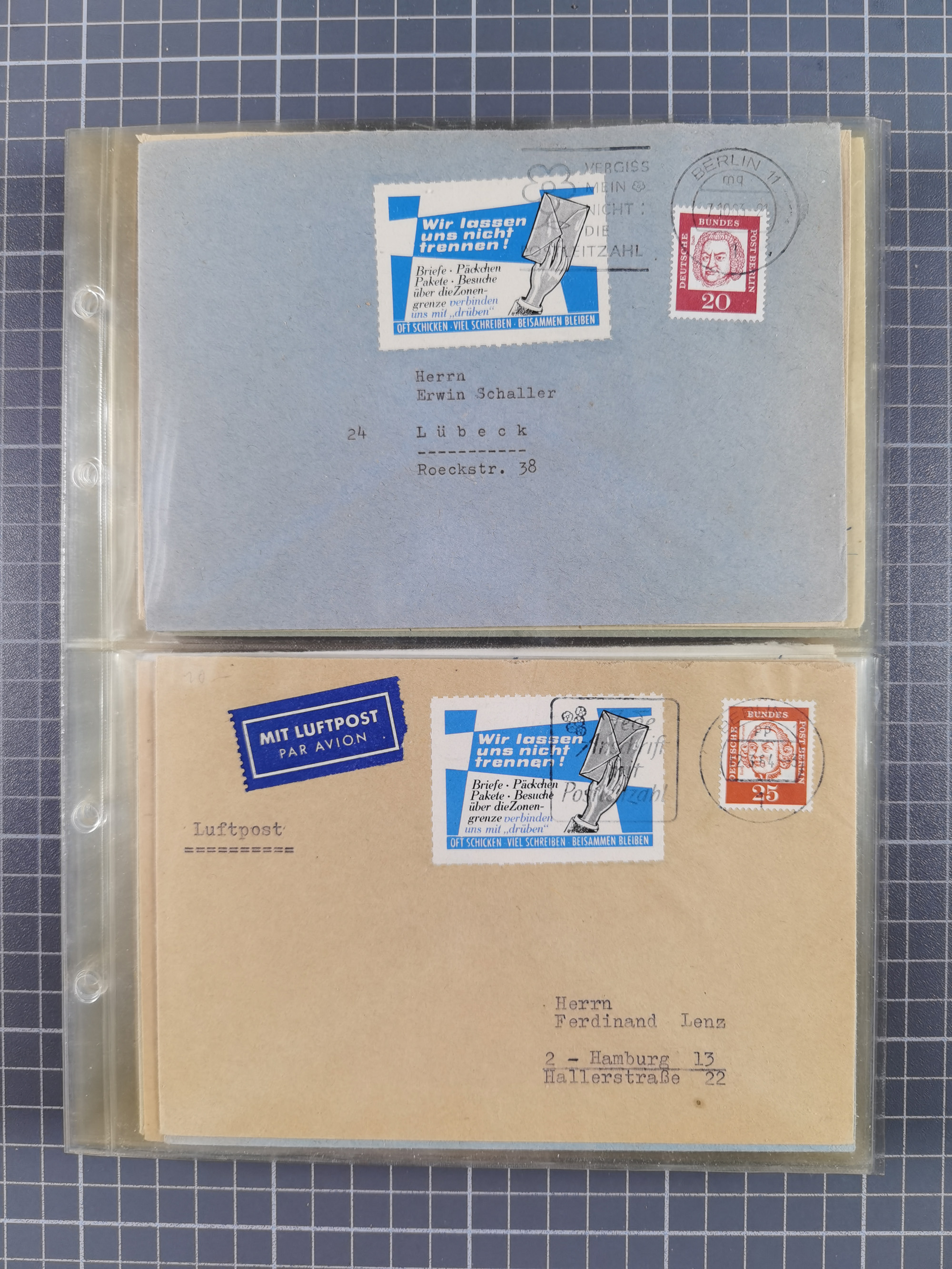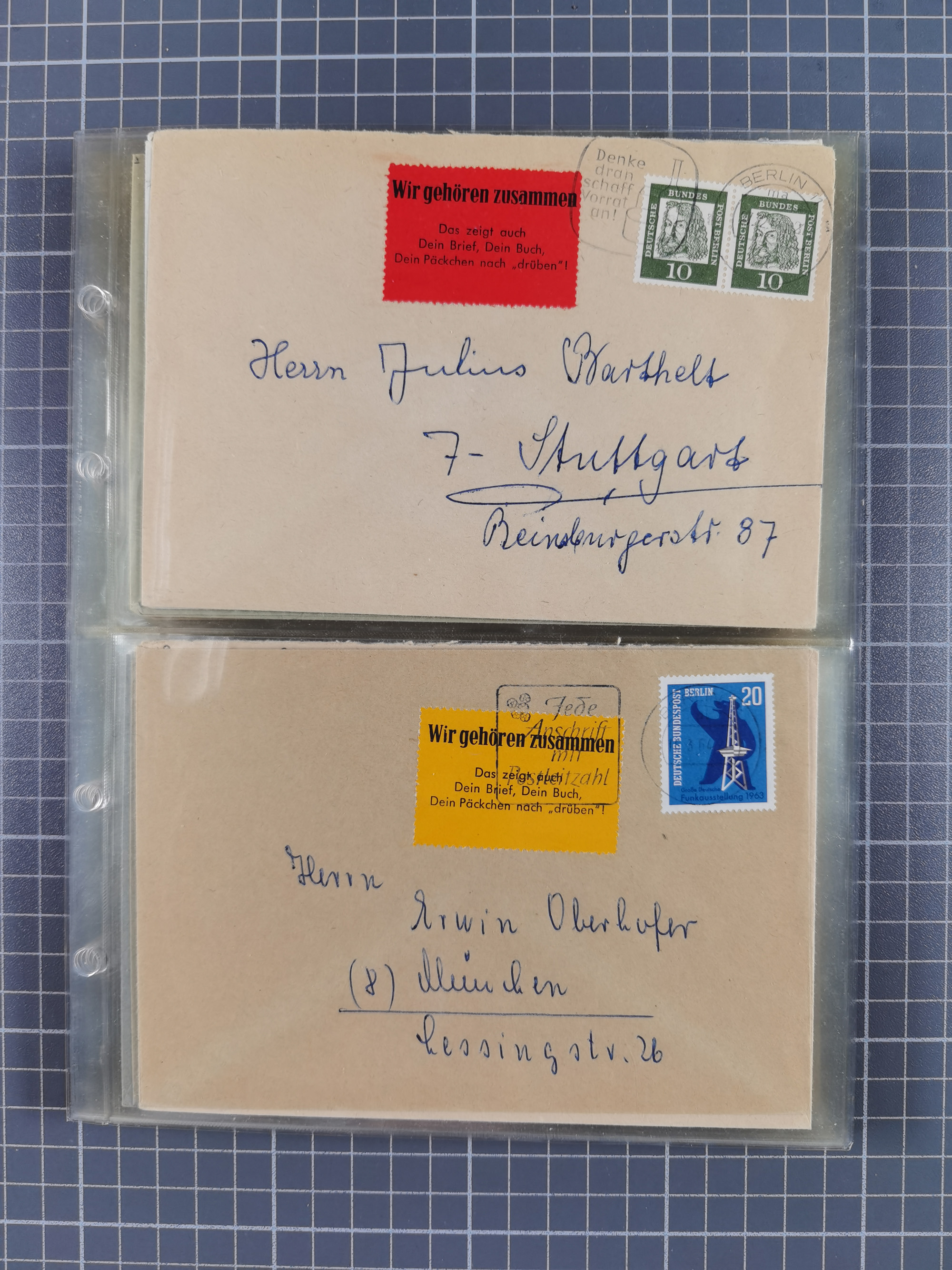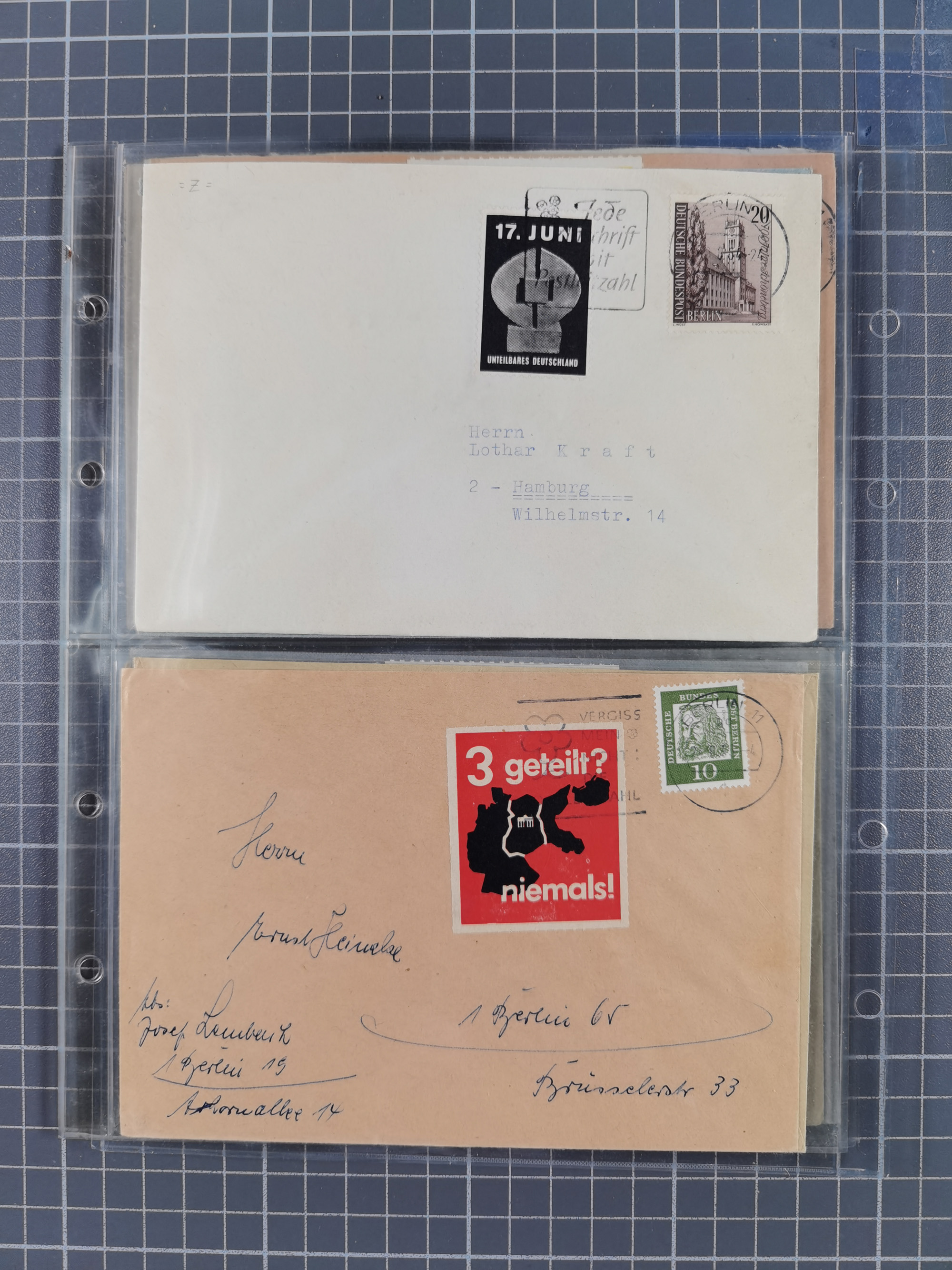 1962/64, Propaganda „Kalter Krieg", Sammlung von 277 Briefen, alle mit Propaganda-Vignetten versehen („Kampf um Wiedervereinigung". 17. Juni", „Die Mauer überwinden", Brücken bauen! Per Post oder Paket". „Wir lassen uns nicht trennen". 3 geteilt niemals!" usw. Alle Vignetten befinden sich auf Bedarfsbriefen und sind postalisch zusammen mit der Normalfrankatur abgestempelt, dabei auch 43 Luftpostbriefe, selten angeboten. Dazu noch 48 Belege Postkrieg".