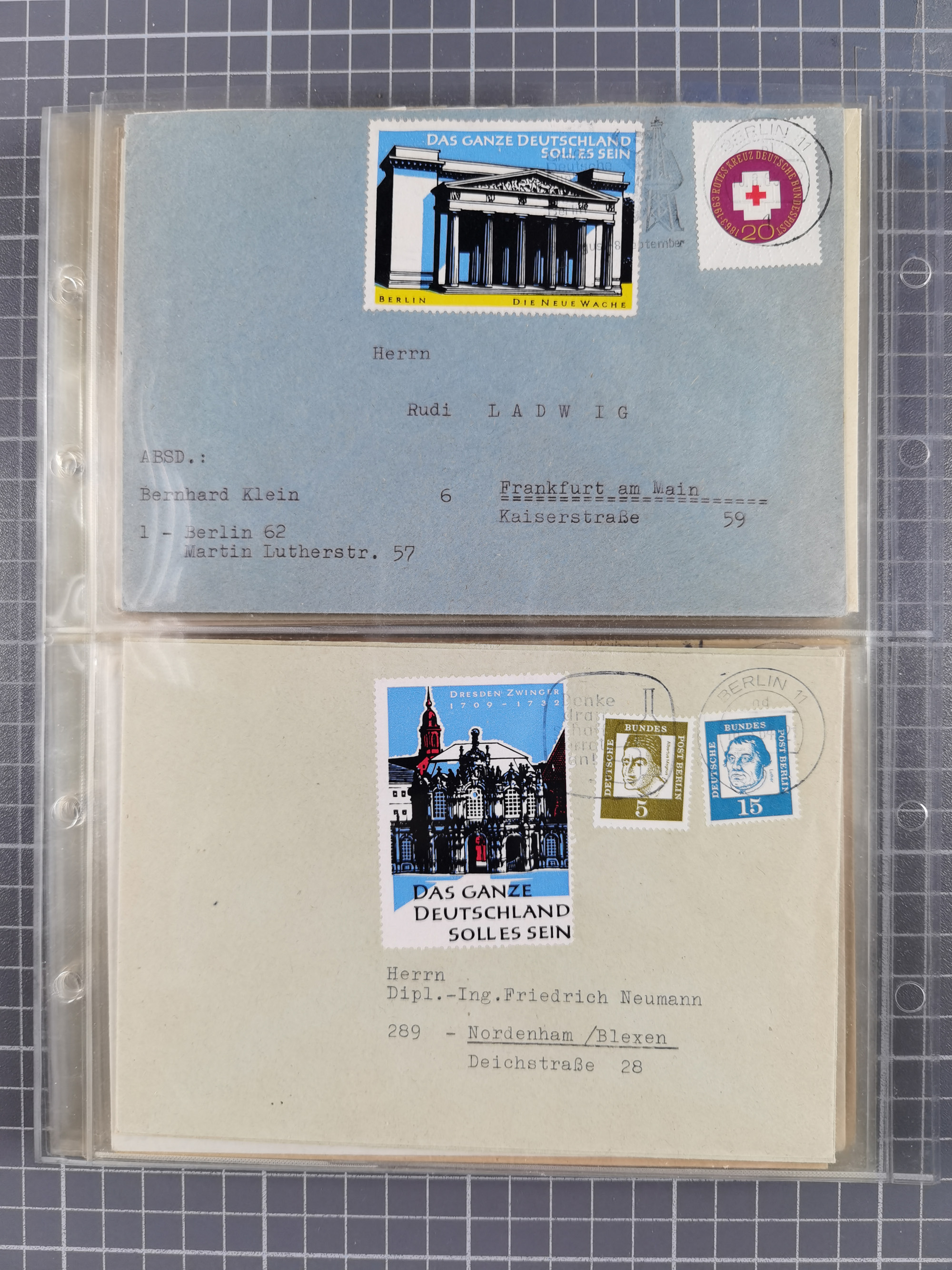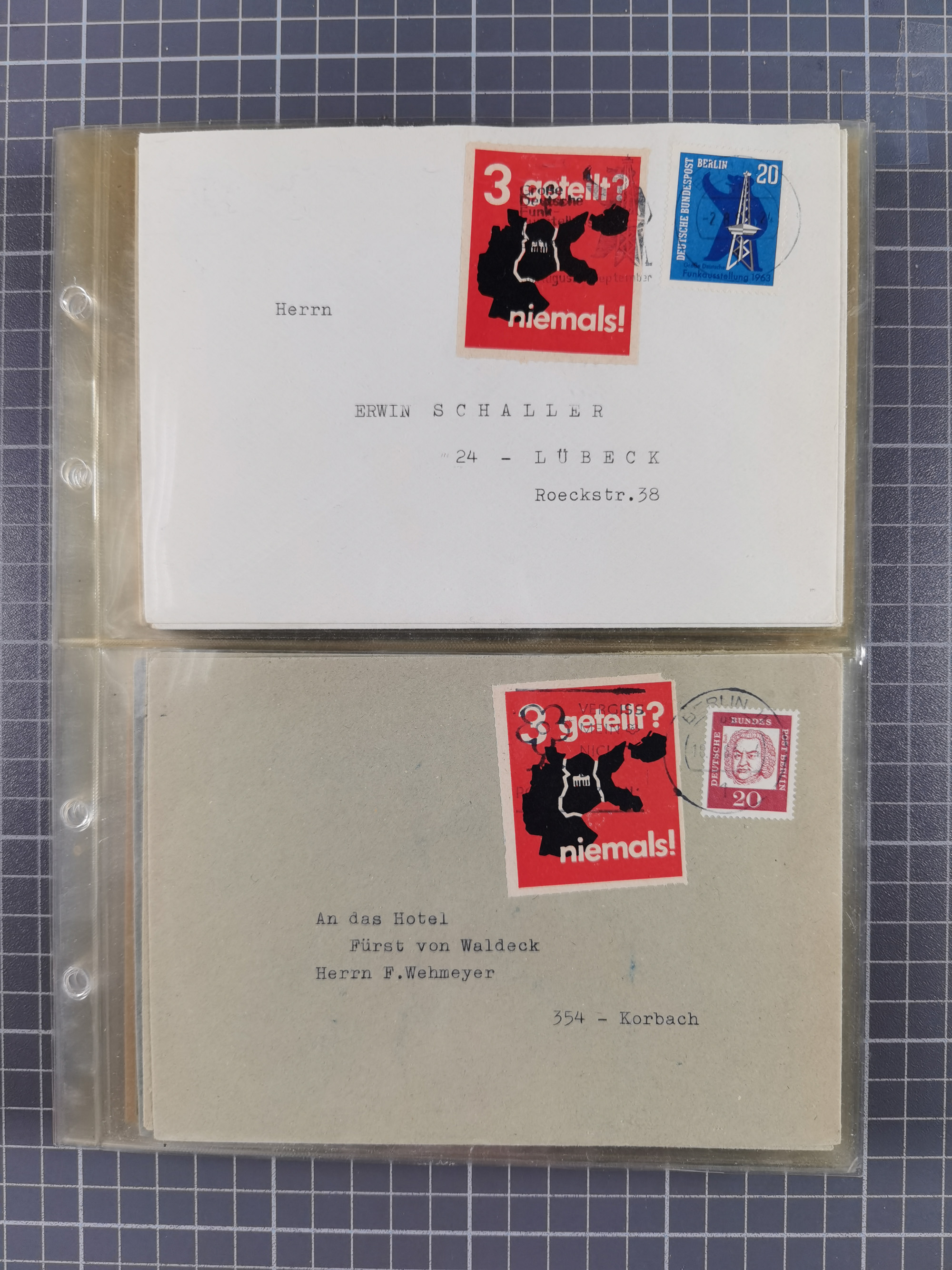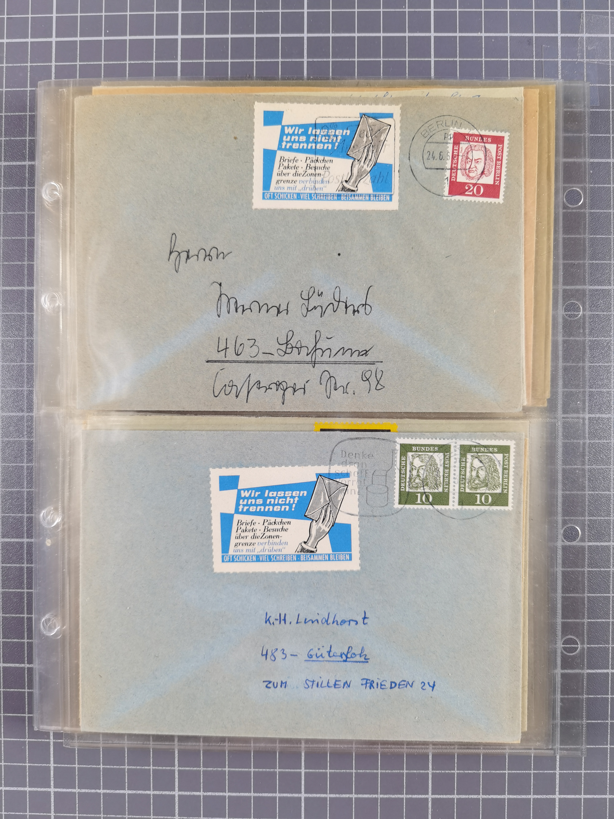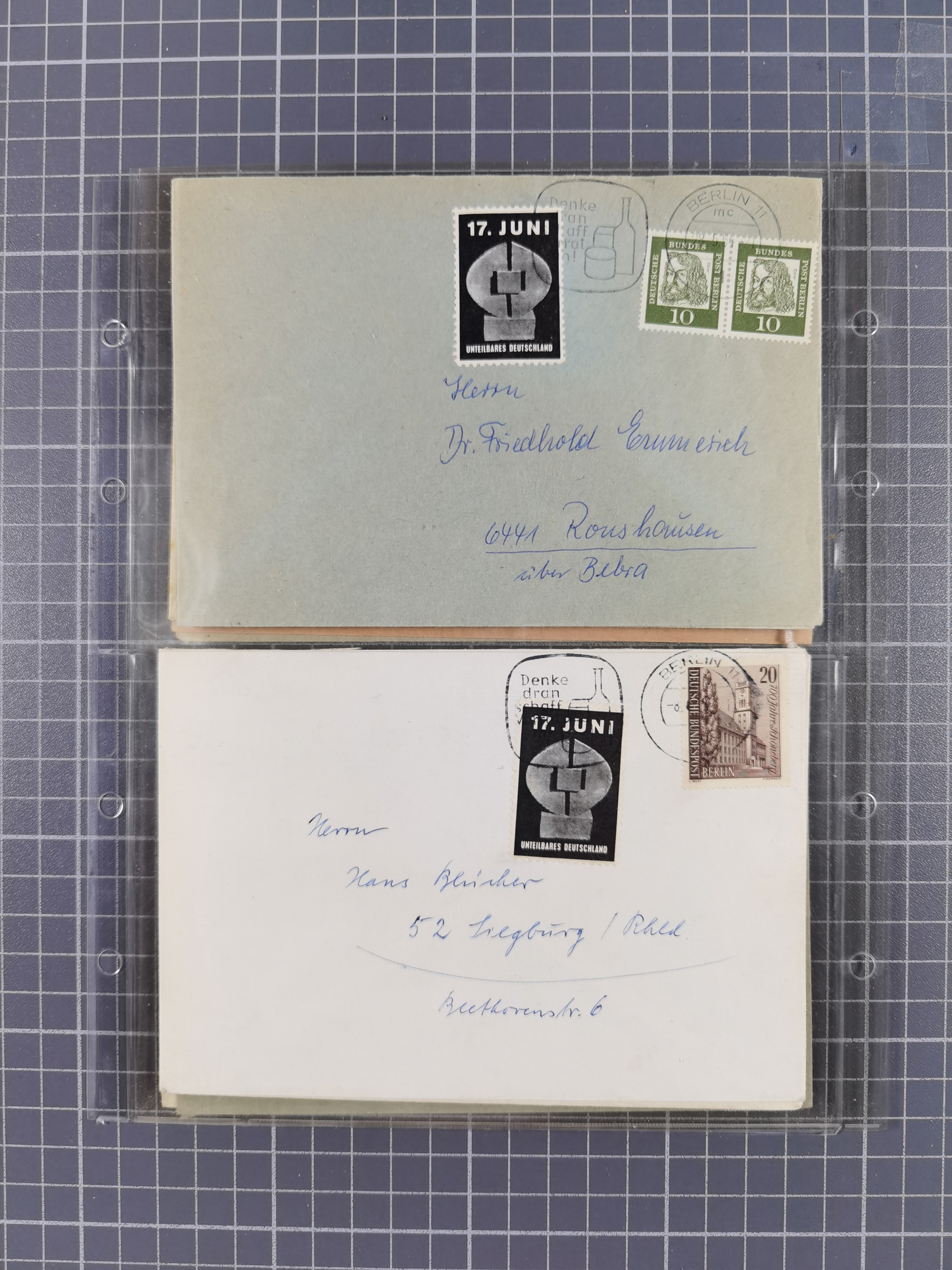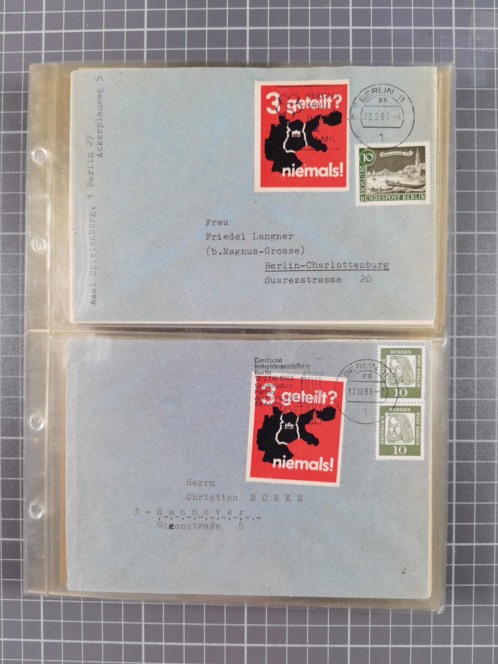 1962/64, Propaganda „Kalter Krieg", Sammlung von 277 Briefen, alle mit Propaganda-Vignetten versehen („Kampf um Wiedervereinigung". 17. Juni", „Die Mauer überwinden", Brücken bauen! Per Post oder Paket". „Wir lassen uns nicht trennen". 3 geteilt niemals!" usw. Alle Vignetten befinden sich auf Bedarfsbriefen und sind postalisch zusammen mit der Normalfrankatur abgestempelt, dabei auch 43 Luftpostbriefe, selten angeboten. Dazu noch 48 Belege Postkrieg".