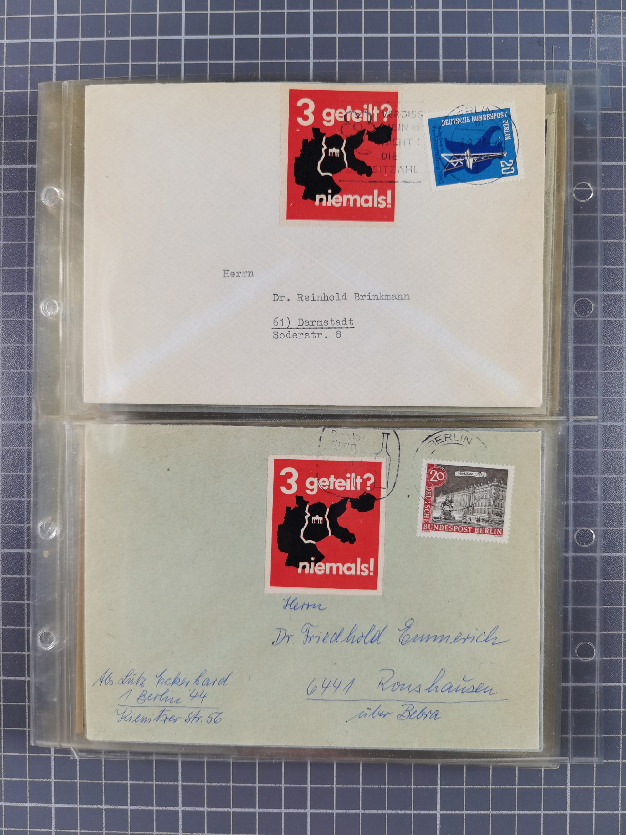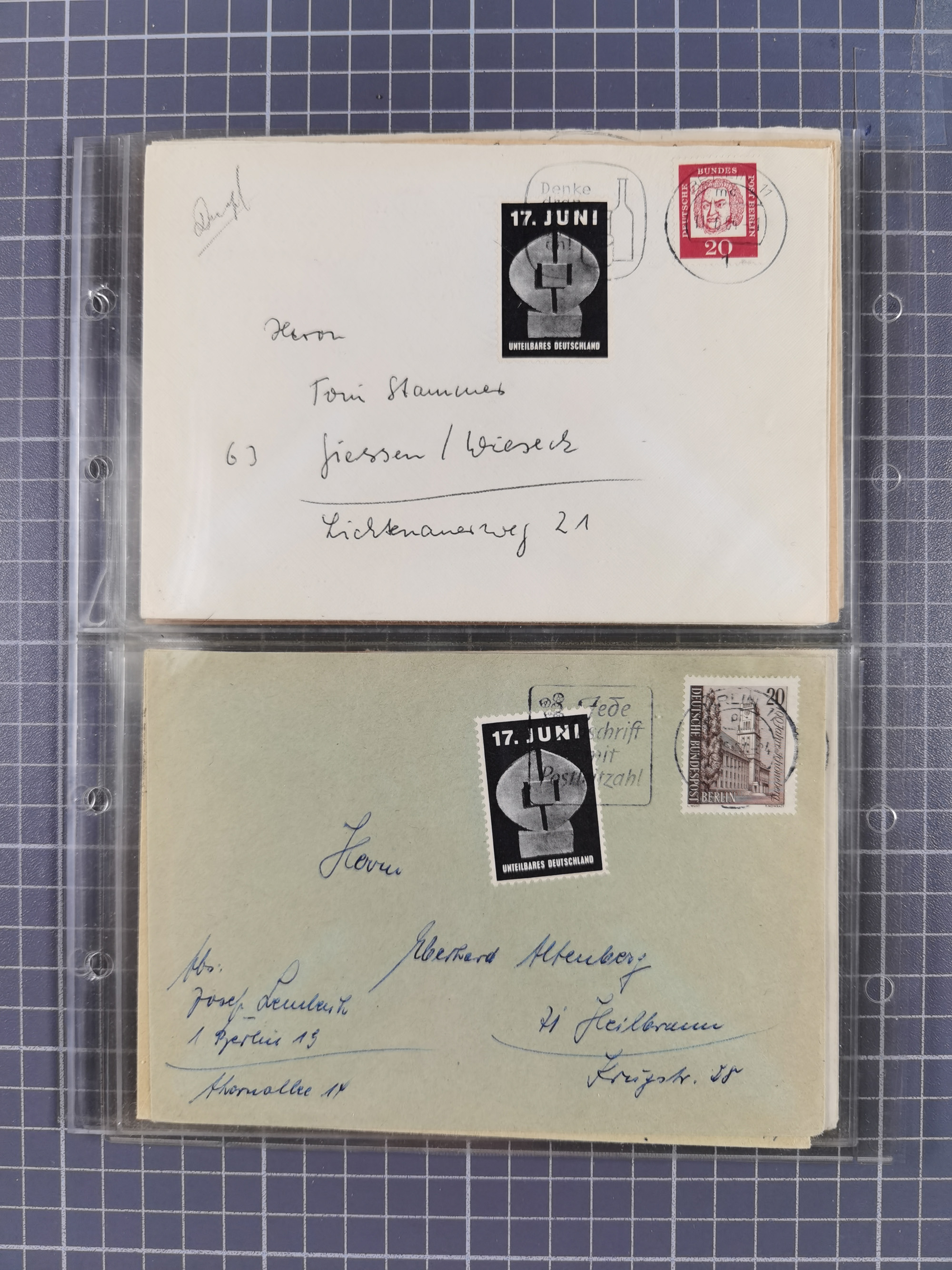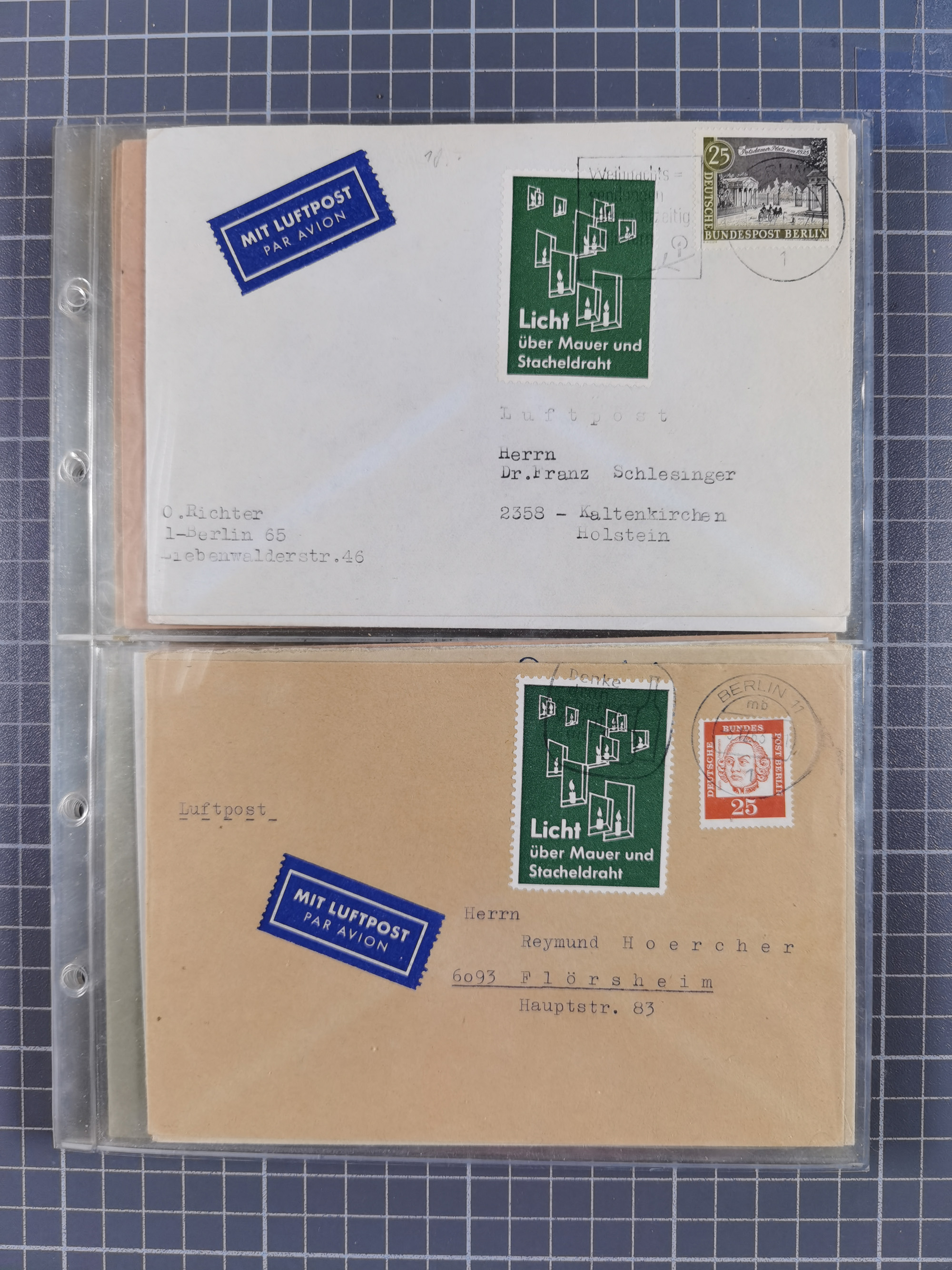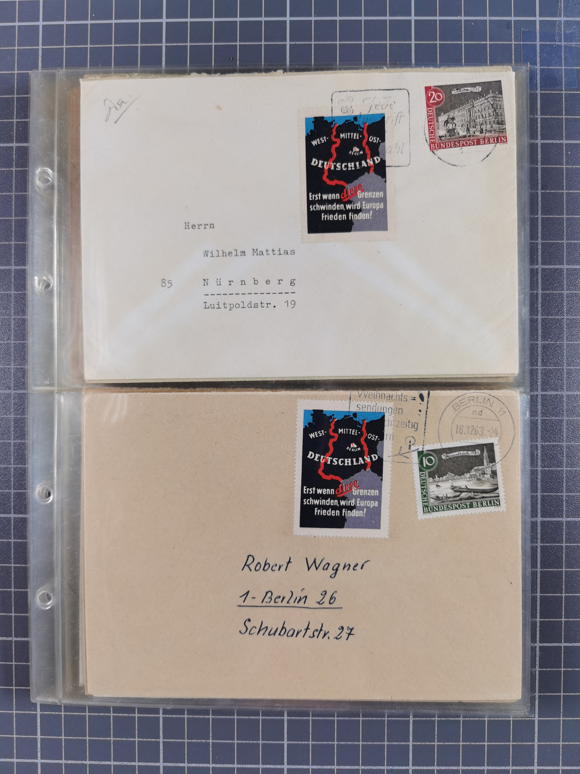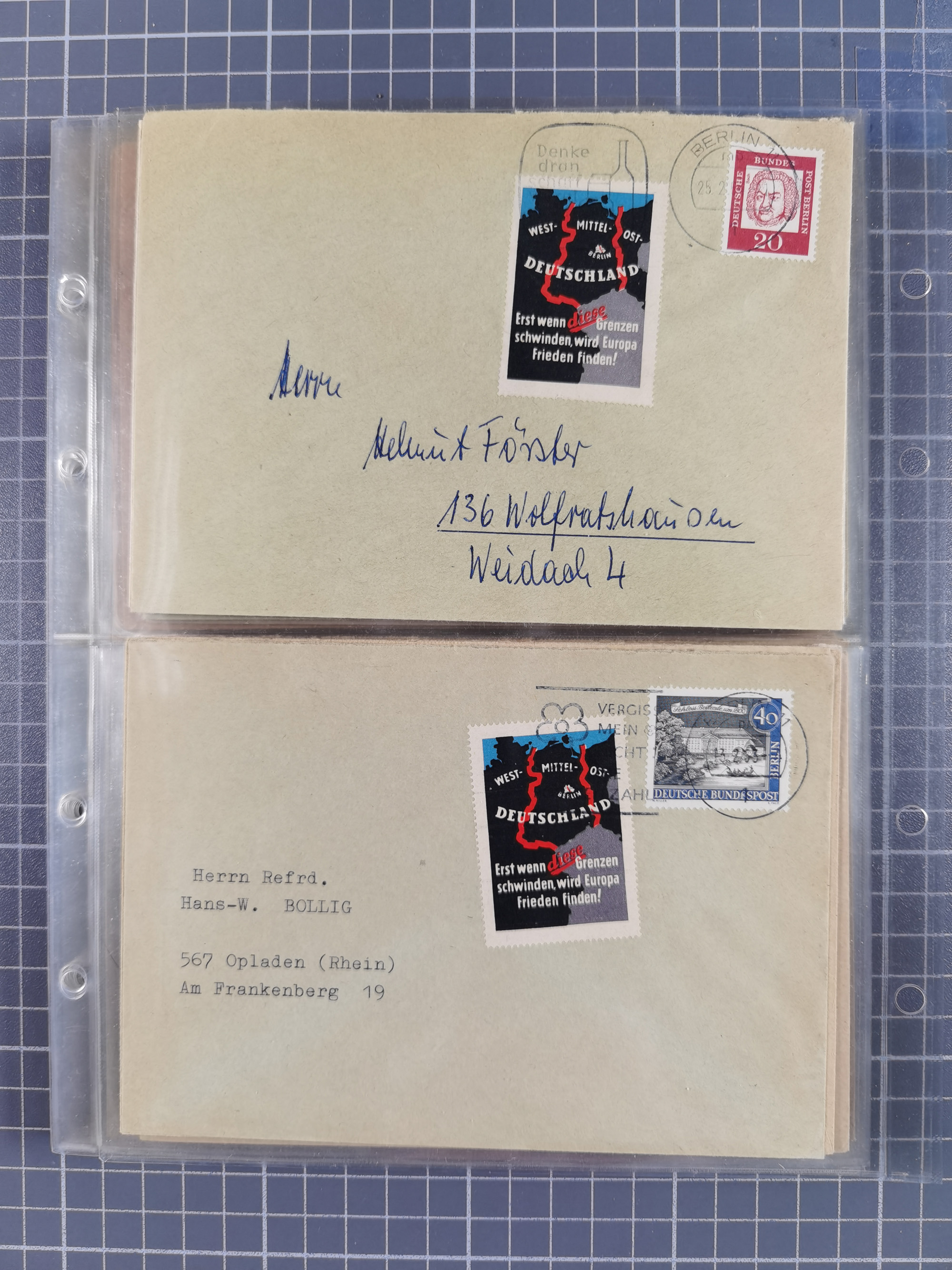 1962/64, Propaganda „Kalter Krieg", Sammlung von 277 Briefen, alle mit Propaganda-Vignetten versehen („Kampf um Wiedervereinigung". 17. Juni", „Die Mauer überwinden", Brücken bauen! Per Post oder Paket". „Wir lassen uns nicht trennen". 3 geteilt niemals!" usw. Alle Vignetten befinden sich auf Bedarfsbriefen und sind postalisch zusammen mit der Normalfrankatur abgestempelt, dabei auch 43 Luftpostbriefe, selten angeboten. Dazu noch 48 Belege Postkrieg".