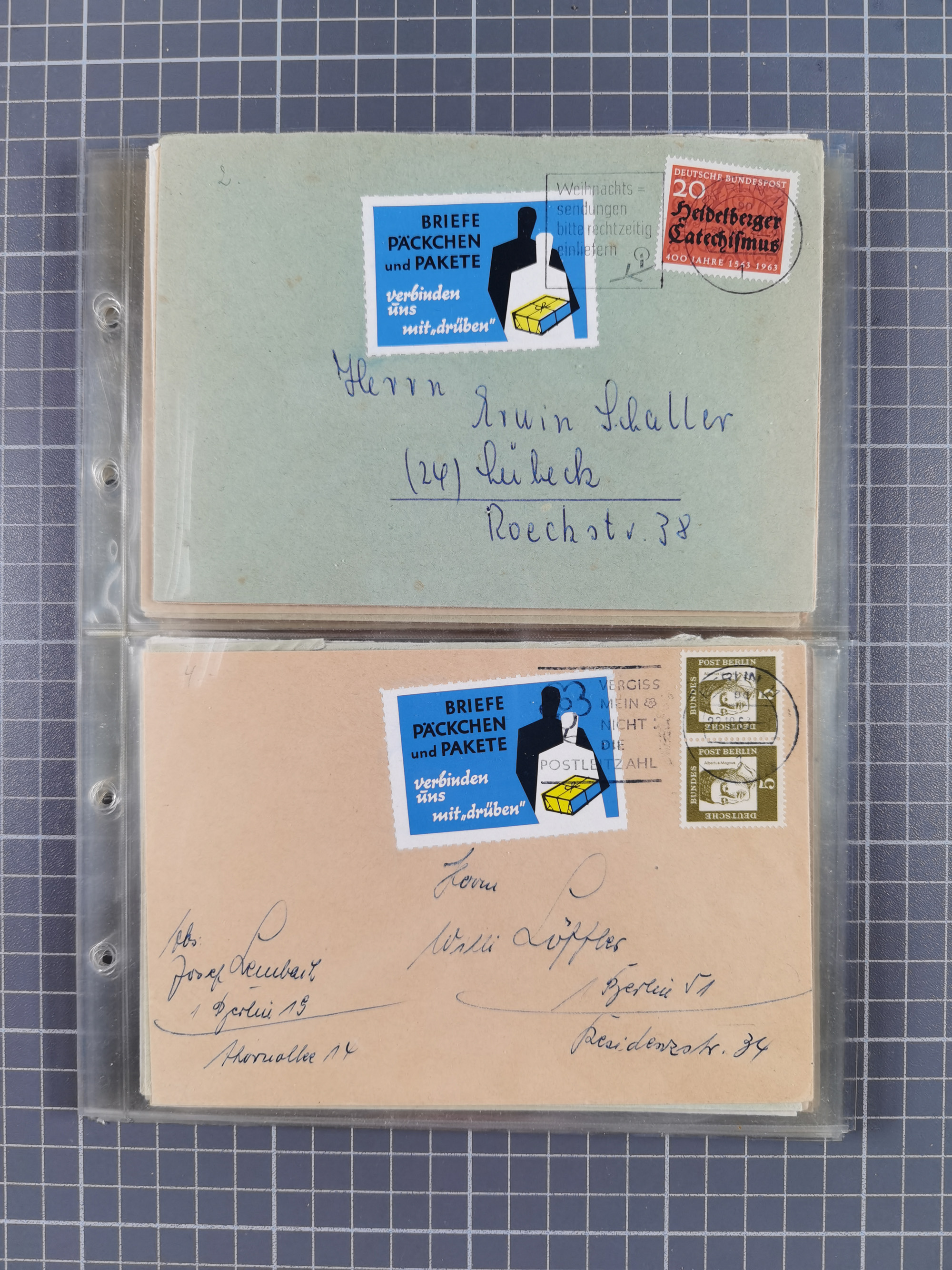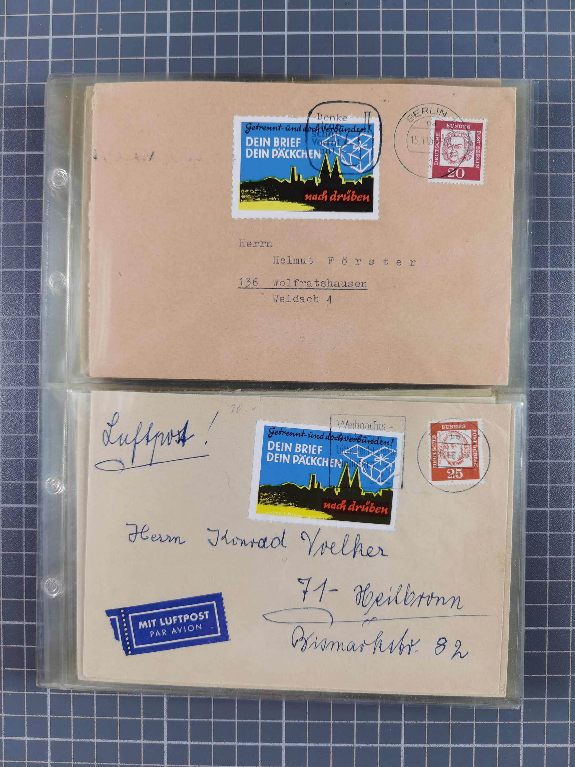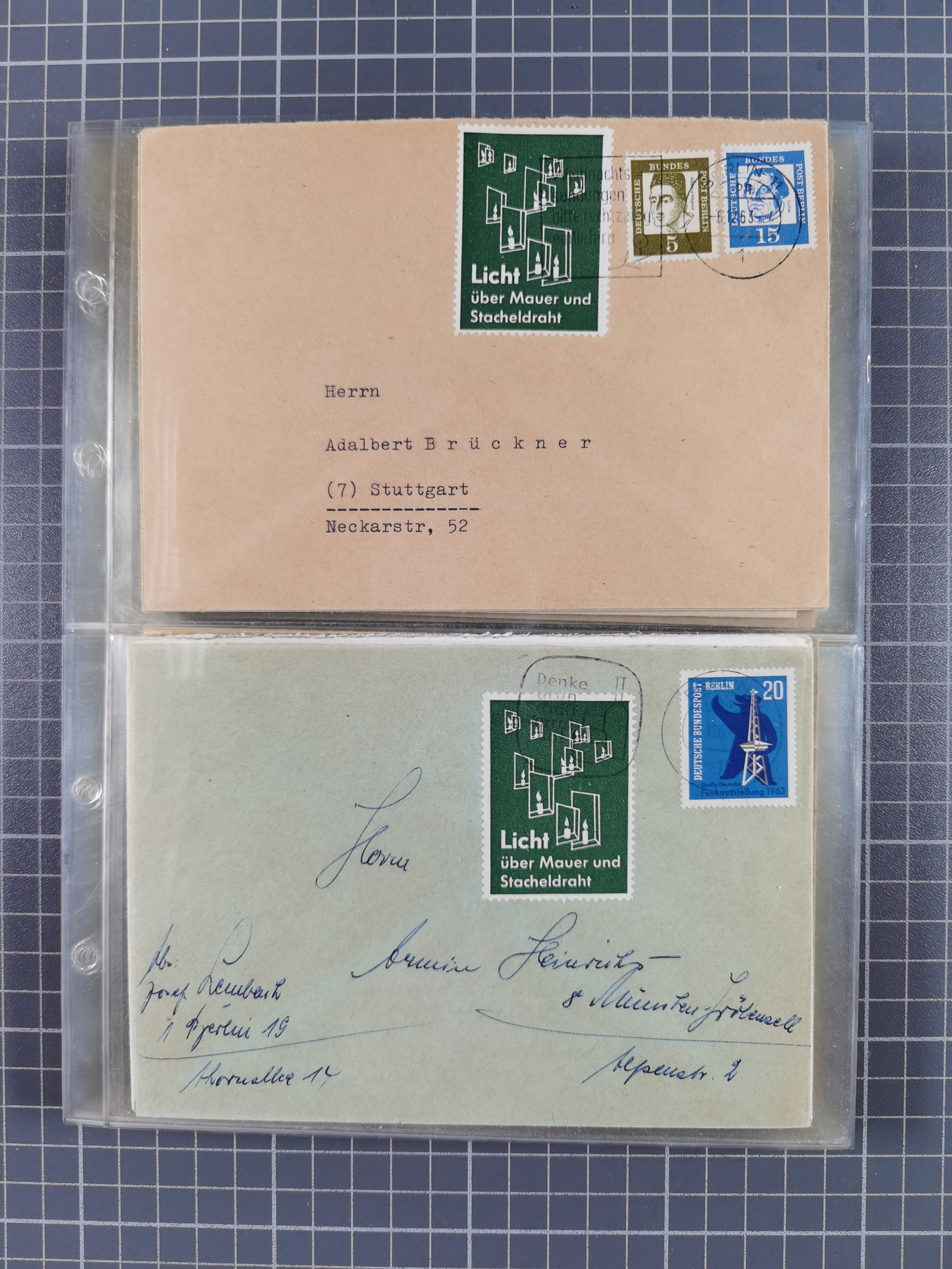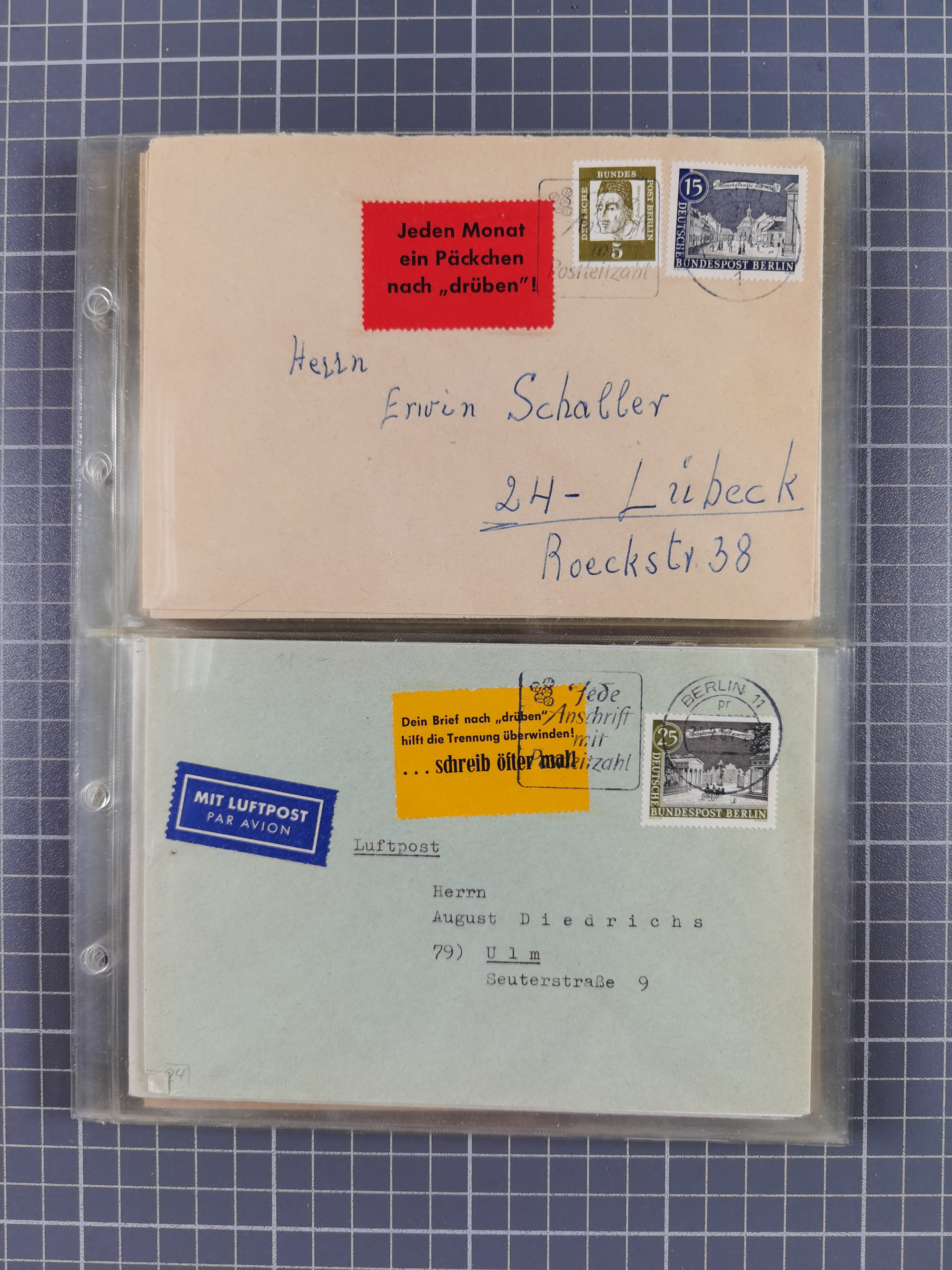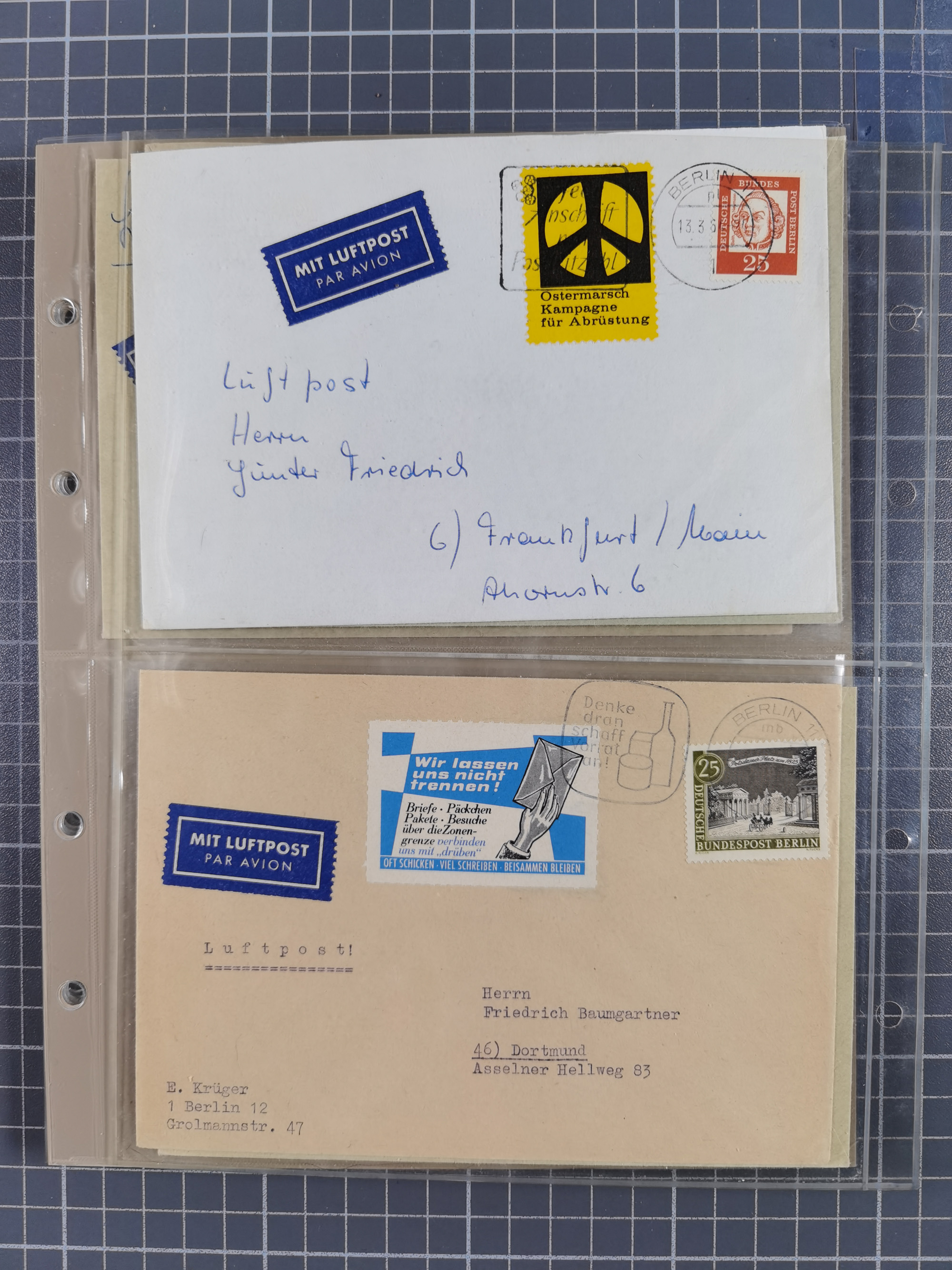 1962/64, Propaganda „Kalter Krieg", Sammlung von 277 Briefen, alle mit Propaganda-Vignetten versehen („Kampf um Wiedervereinigung". 17. Juni", „Die Mauer überwinden", Brücken bauen! Per Post oder Paket". „Wir lassen uns nicht trennen". 3 geteilt niemals!" usw. Alle Vignetten befinden sich auf Bedarfsbriefen und sind postalisch zusammen mit der Normalfrankatur abgestempelt, dabei auch 43 Luftpostbriefe, selten angeboten. Dazu noch 48 Belege Postkrieg".