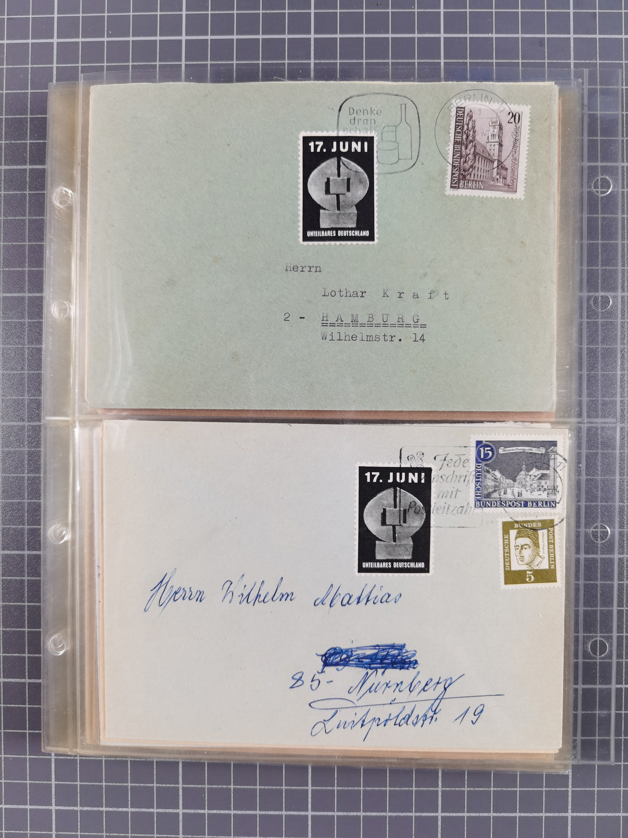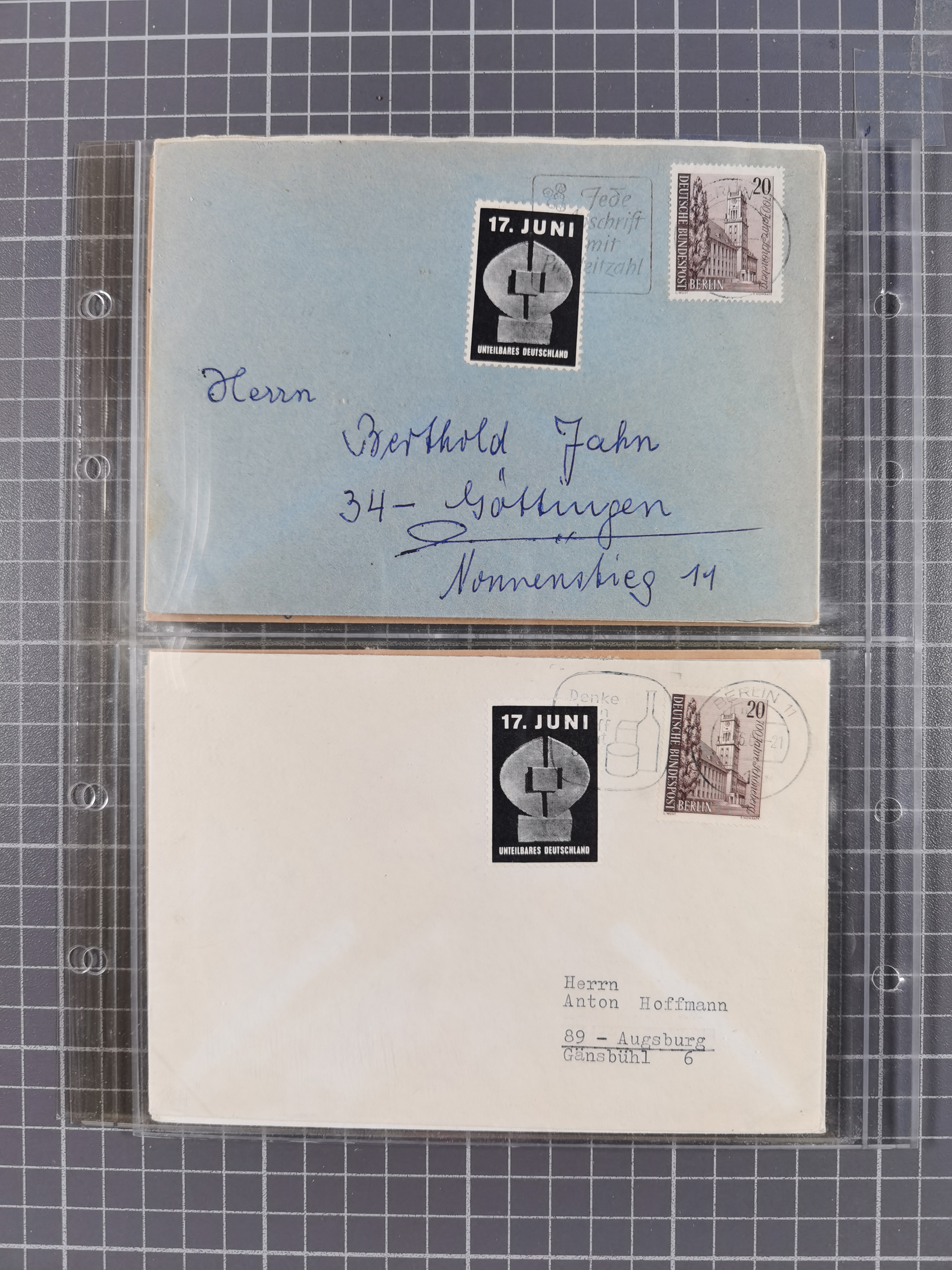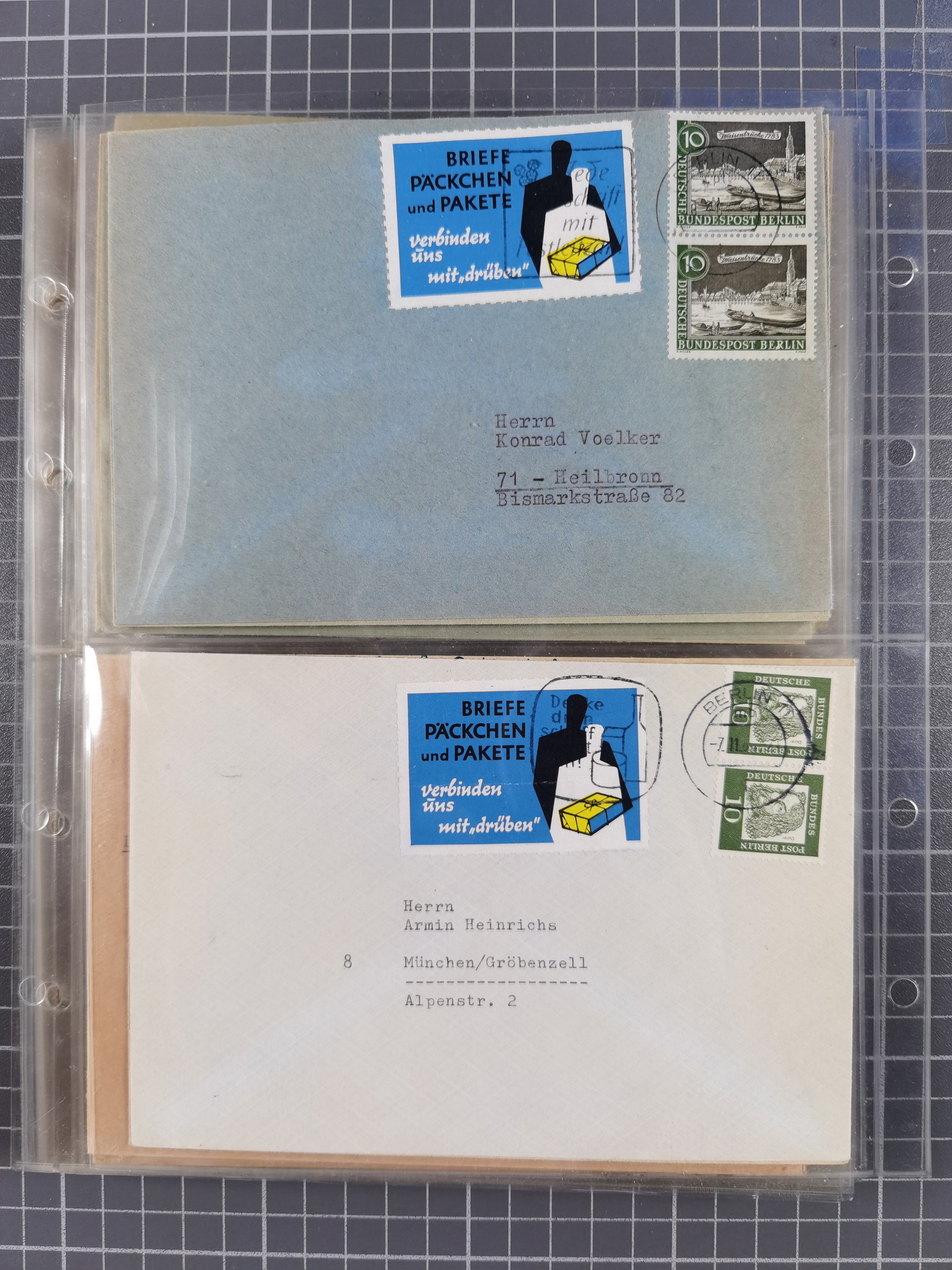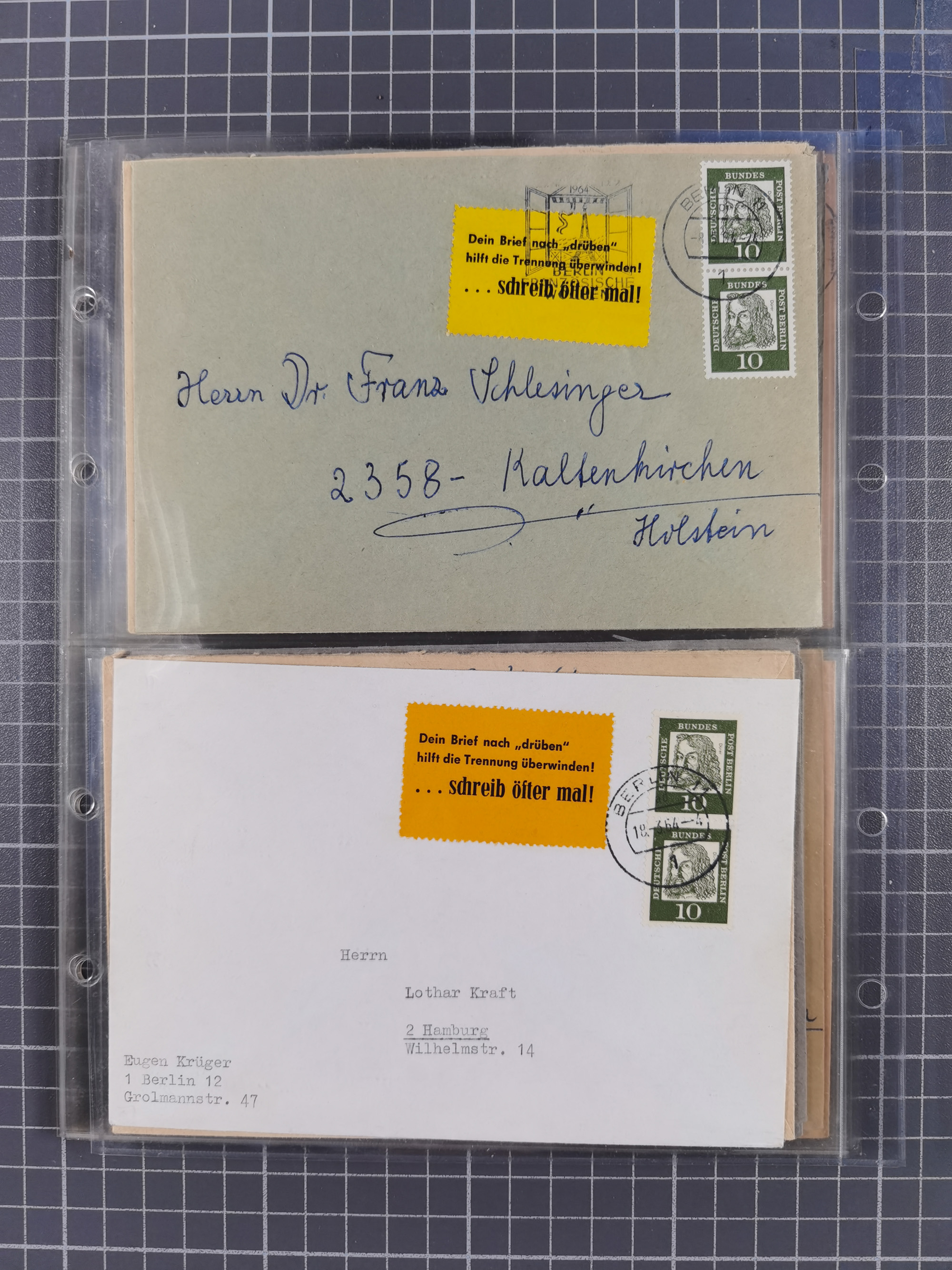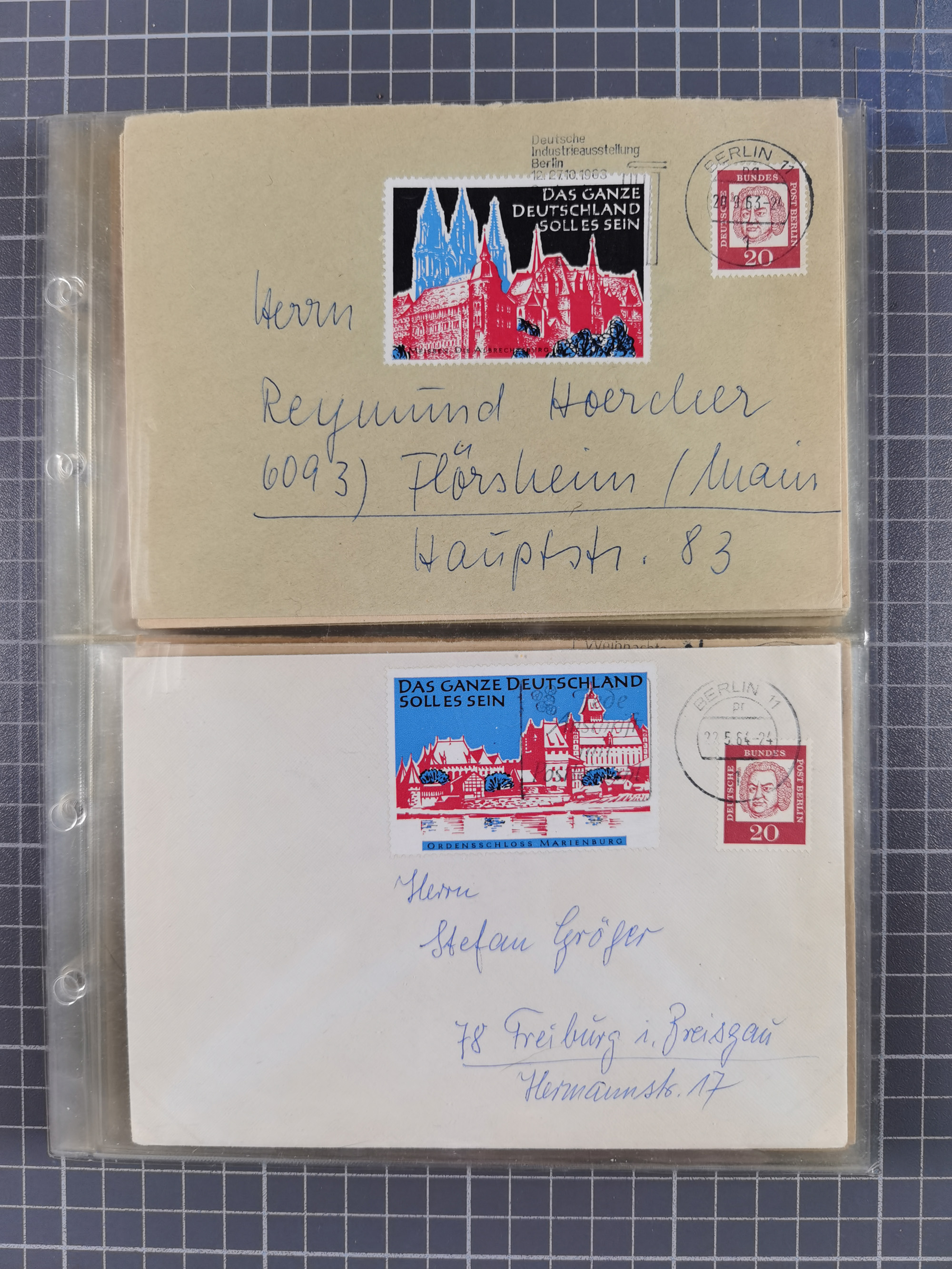 1962/64, Propaganda „Kalter Krieg", Sammlung von 277 Briefen, alle mit Propaganda-Vignetten versehen („Kampf um Wiedervereinigung". 17. Juni", „Die Mauer überwinden", Brücken bauen! Per Post oder Paket". „Wir lassen uns nicht trennen". 3 geteilt niemals!" usw. Alle Vignetten befinden sich auf Bedarfsbriefen und sind postalisch zusammen mit der Normalfrankatur abgestempelt, dabei auch 43 Luftpostbriefe, selten angeboten. Dazu noch 48 Belege Postkrieg".