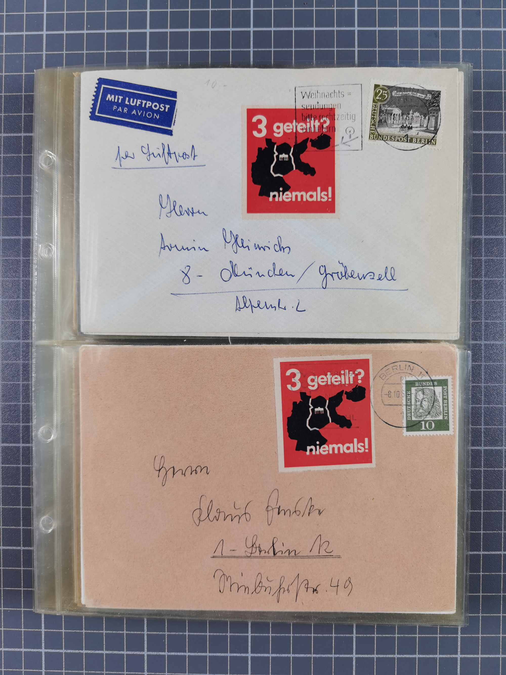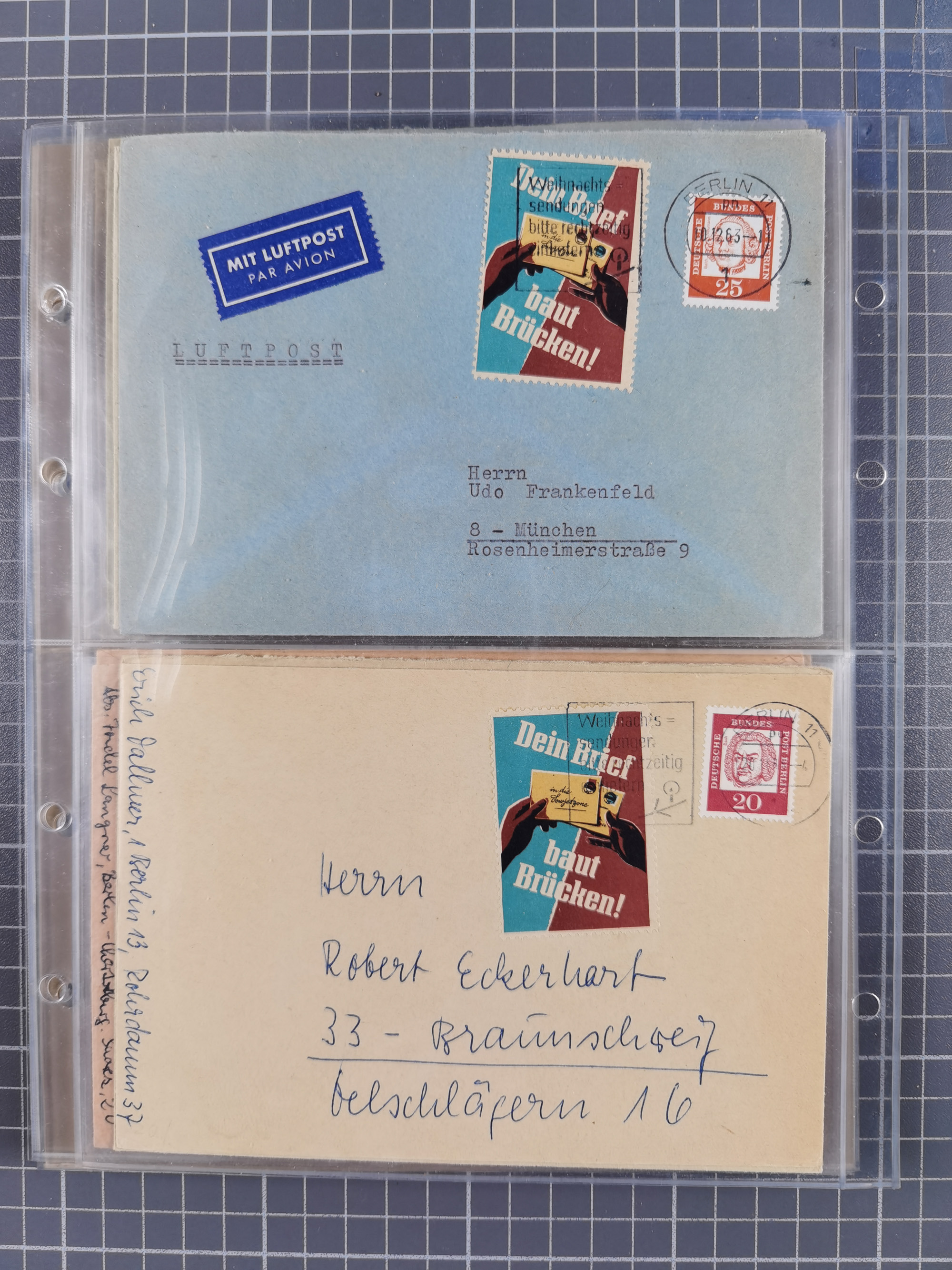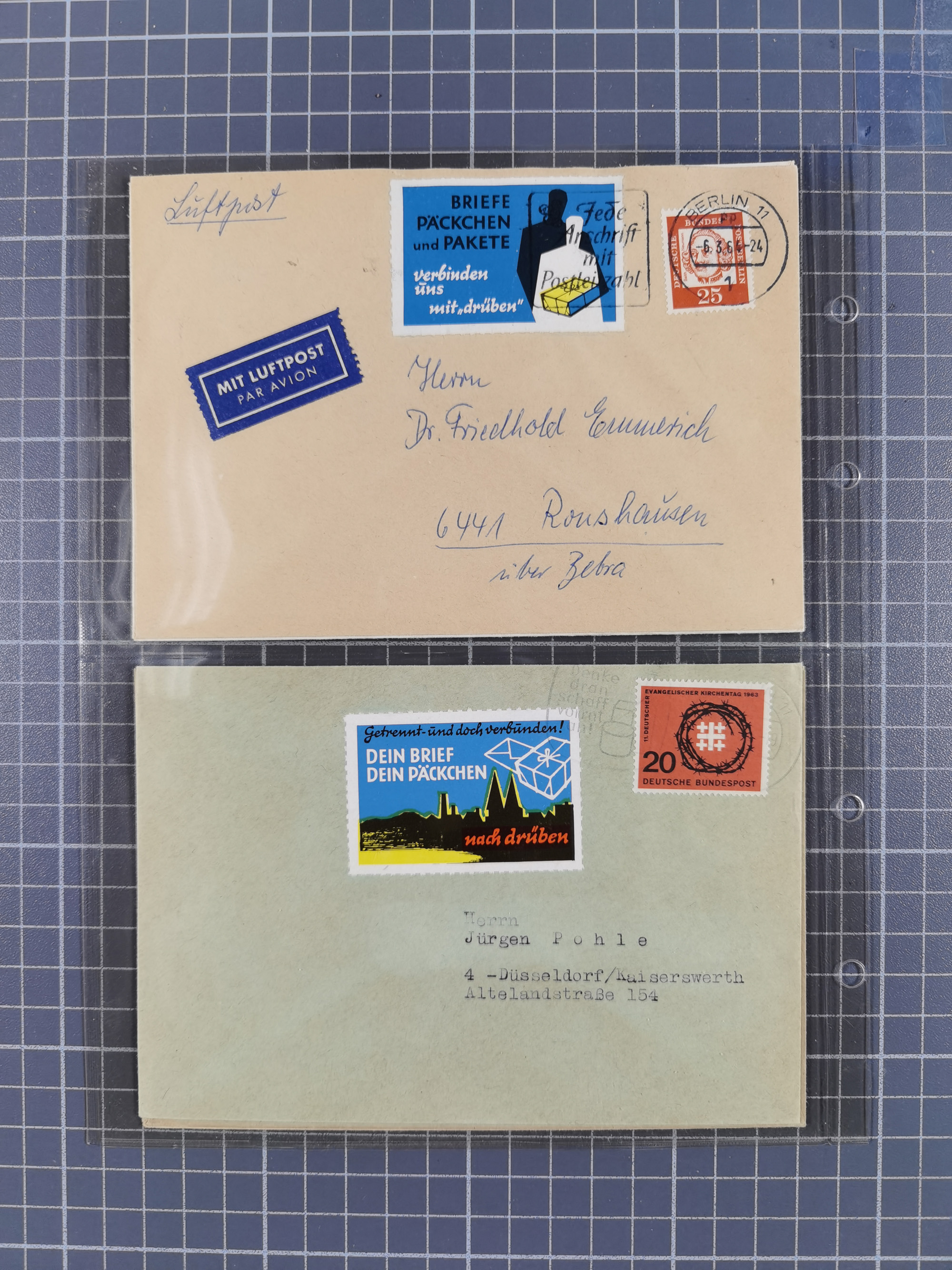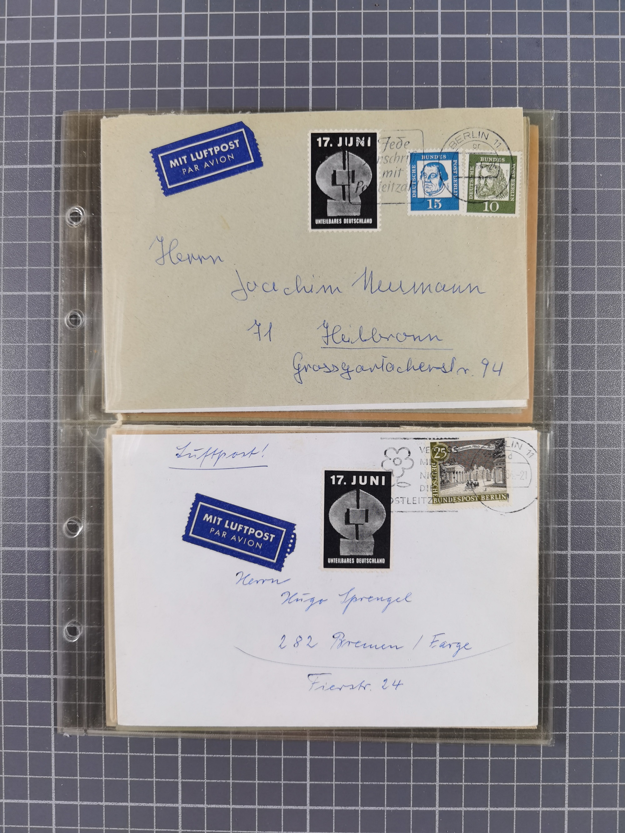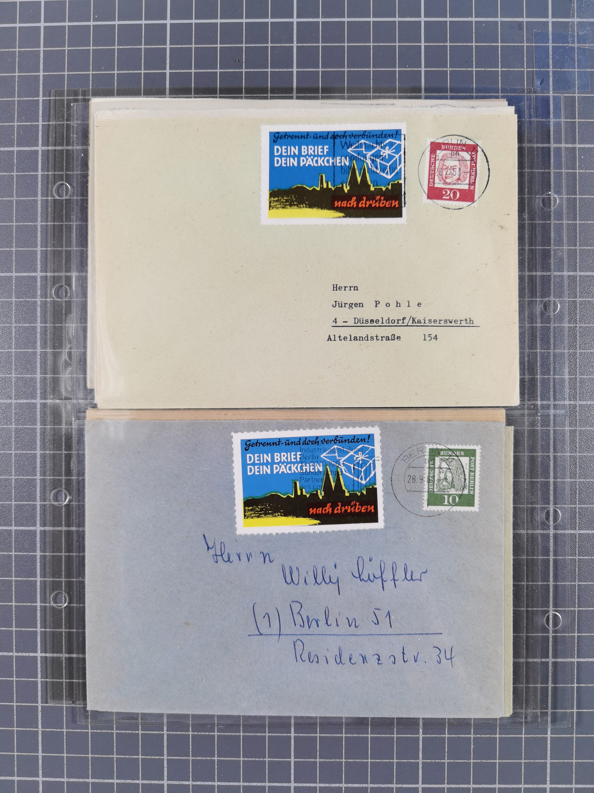 1962/64, Propaganda „Kalter Krieg", Sammlung von 277 Briefen, alle mit Propaganda-Vignetten versehen („Kampf um Wiedervereinigung". 17. Juni", „Die Mauer überwinden", Brücken bauen! Per Post oder Paket". „Wir lassen uns nicht trennen". 3 geteilt niemals!" usw. Alle Vignetten befinden sich auf Bedarfsbriefen und sind postalisch zusammen mit der Normalfrankatur abgestempelt, dabei auch 43 Luftpostbriefe, selten angeboten. Dazu noch 48 Belege Postkrieg".