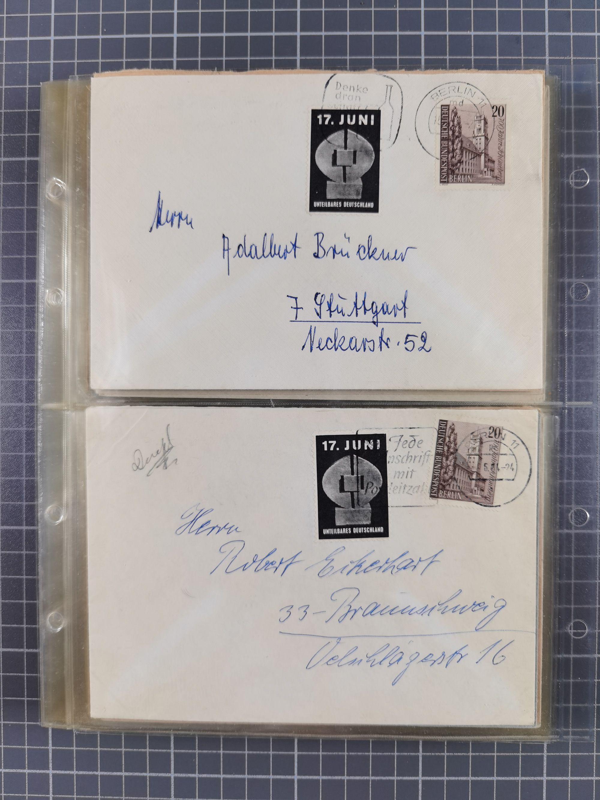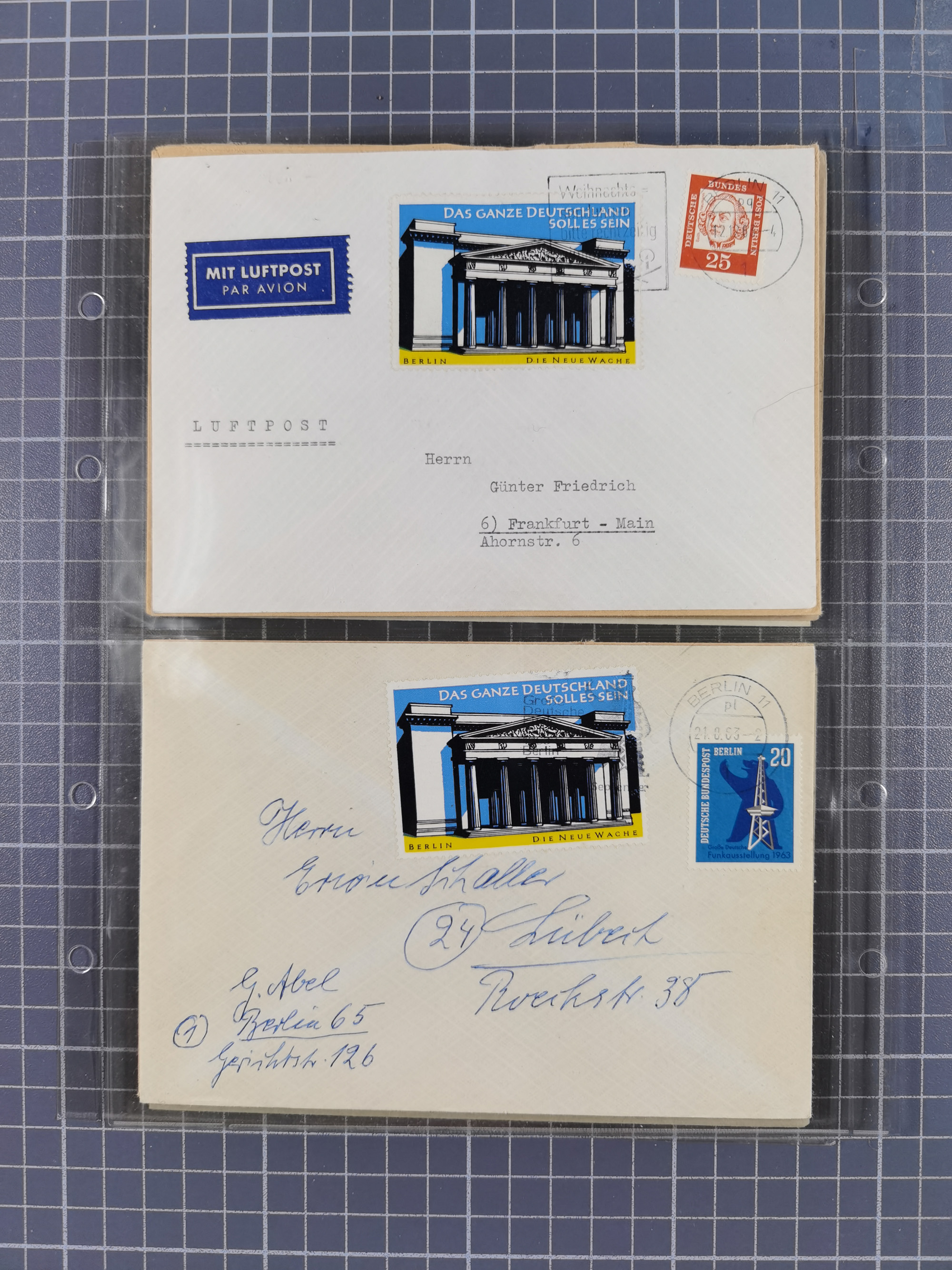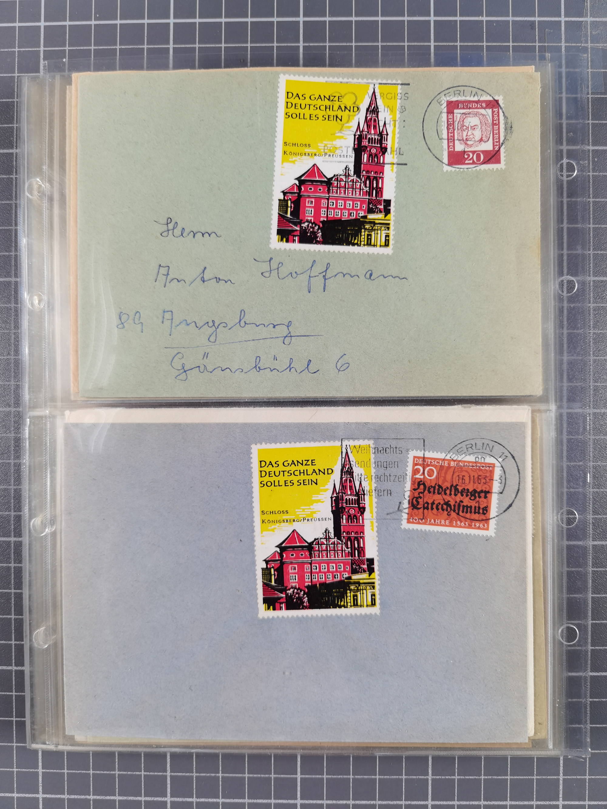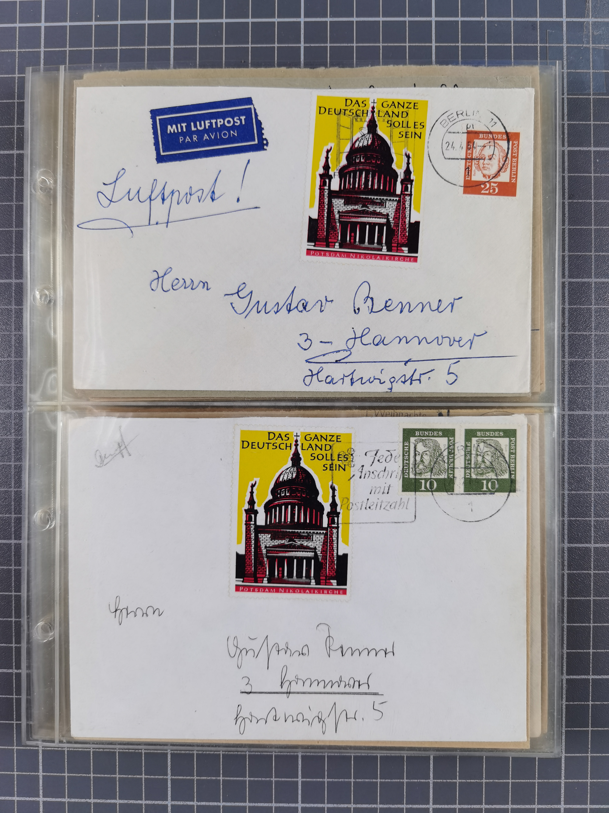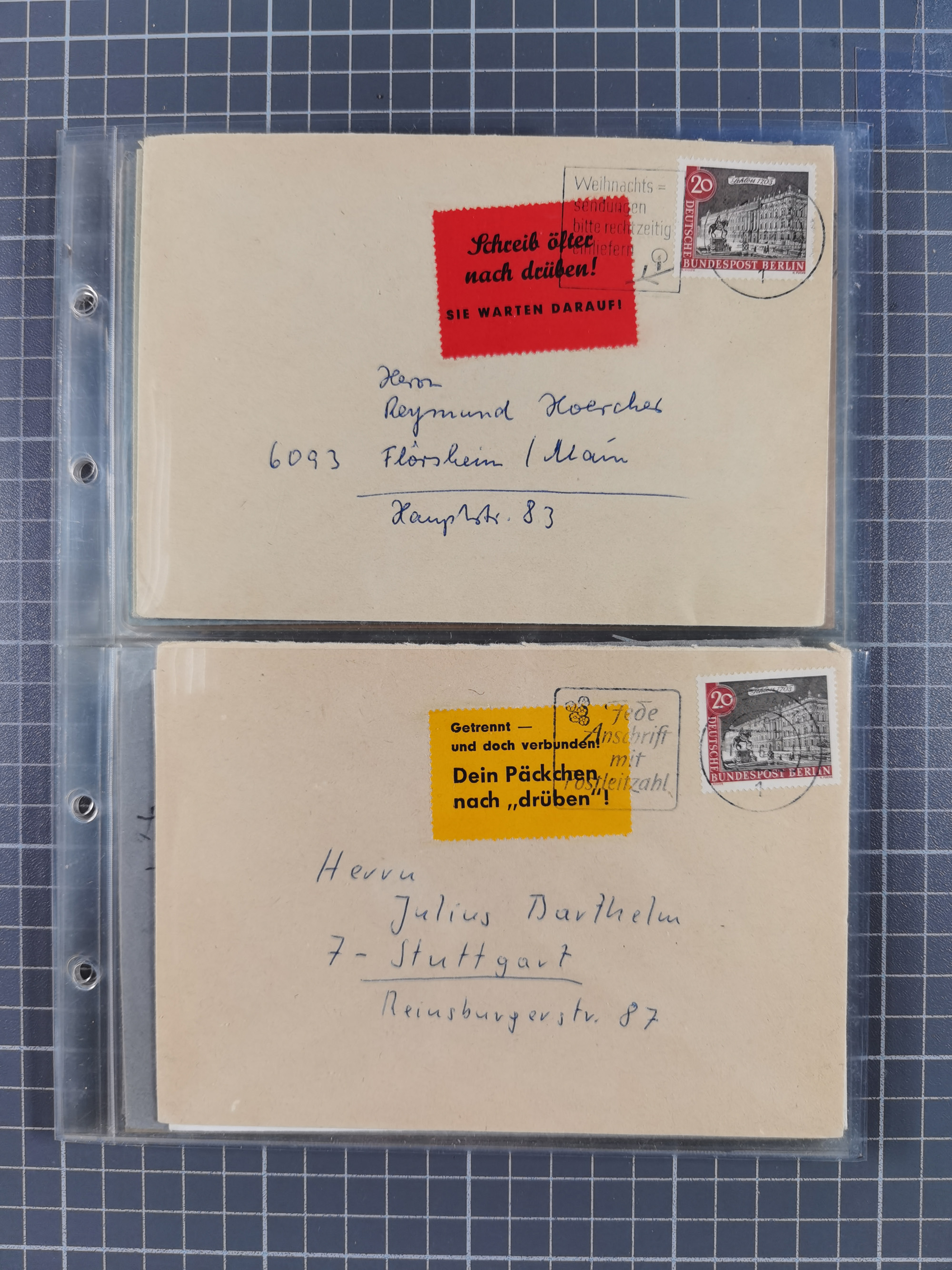 1962/64, Propaganda „Kalter Krieg", Sammlung von 277 Briefen, alle mit Propaganda-Vignetten versehen („Kampf um Wiedervereinigung". 17. Juni", „Die Mauer überwinden", Brücken bauen! Per Post oder Paket". „Wir lassen uns nicht trennen". 3 geteilt niemals!" usw. Alle Vignetten befinden sich auf Bedarfsbriefen und sind postalisch zusammen mit der Normalfrankatur abgestempelt, dabei auch 43 Luftpostbriefe, selten angeboten. Dazu noch 48 Belege Postkrieg".