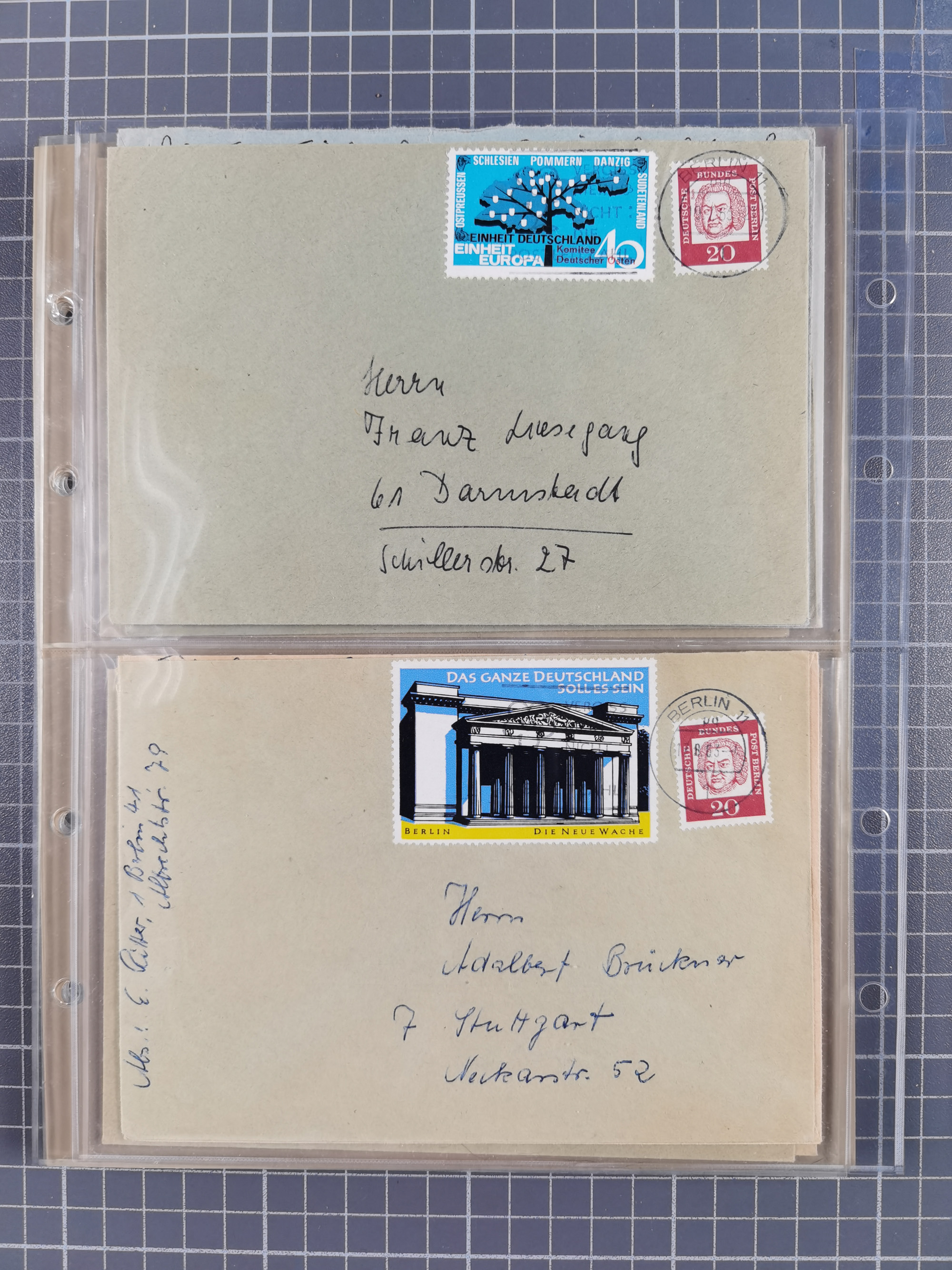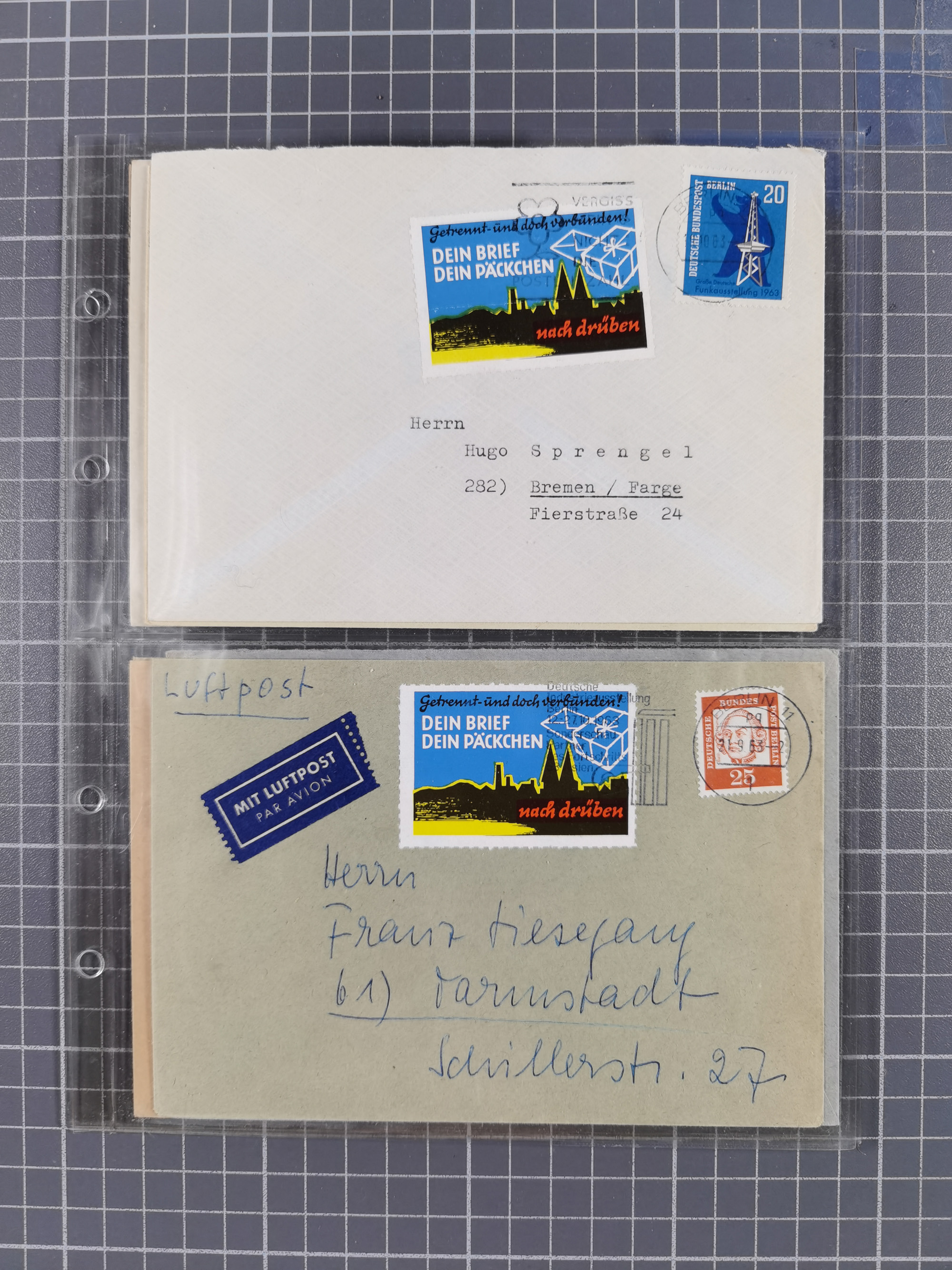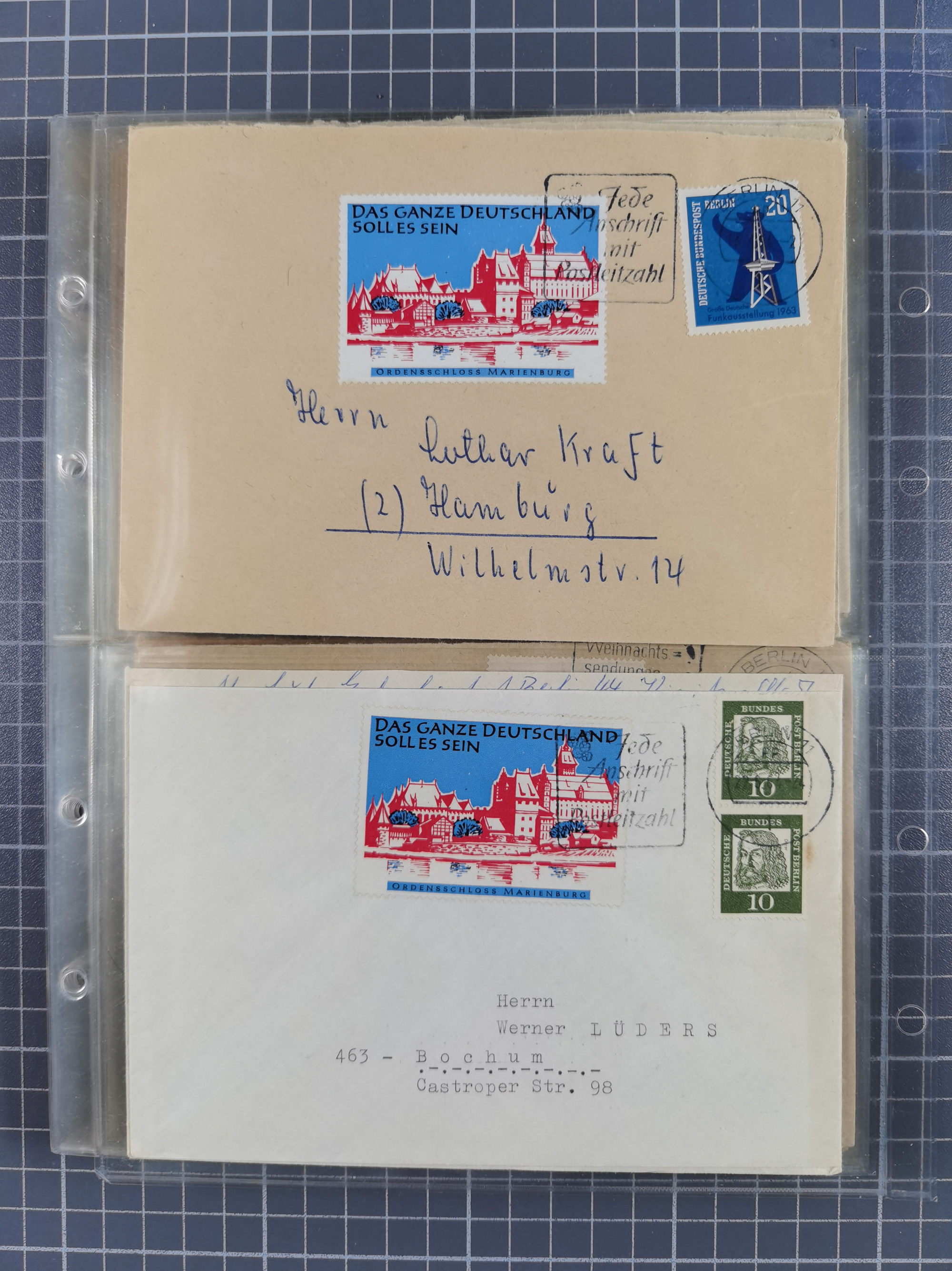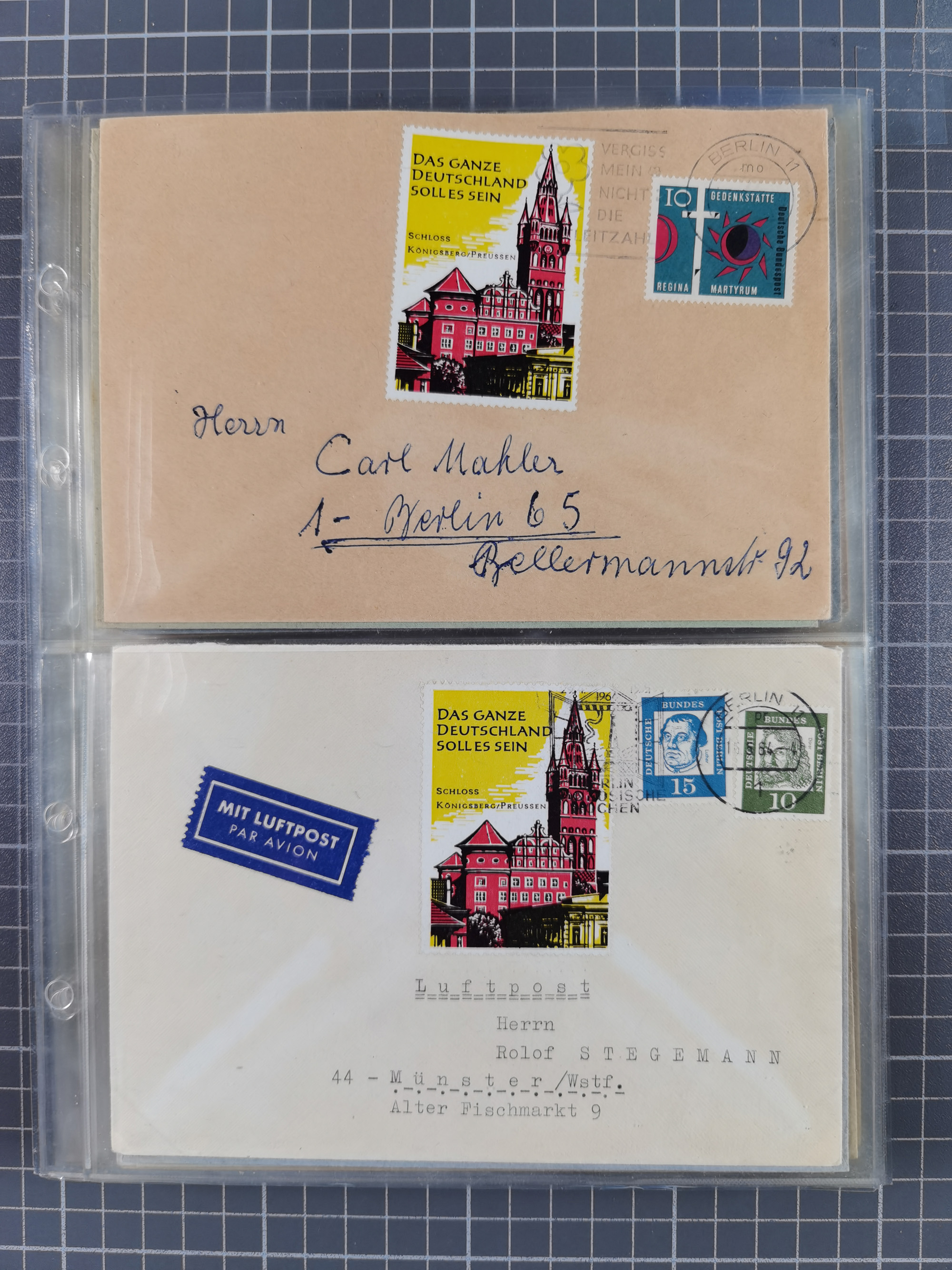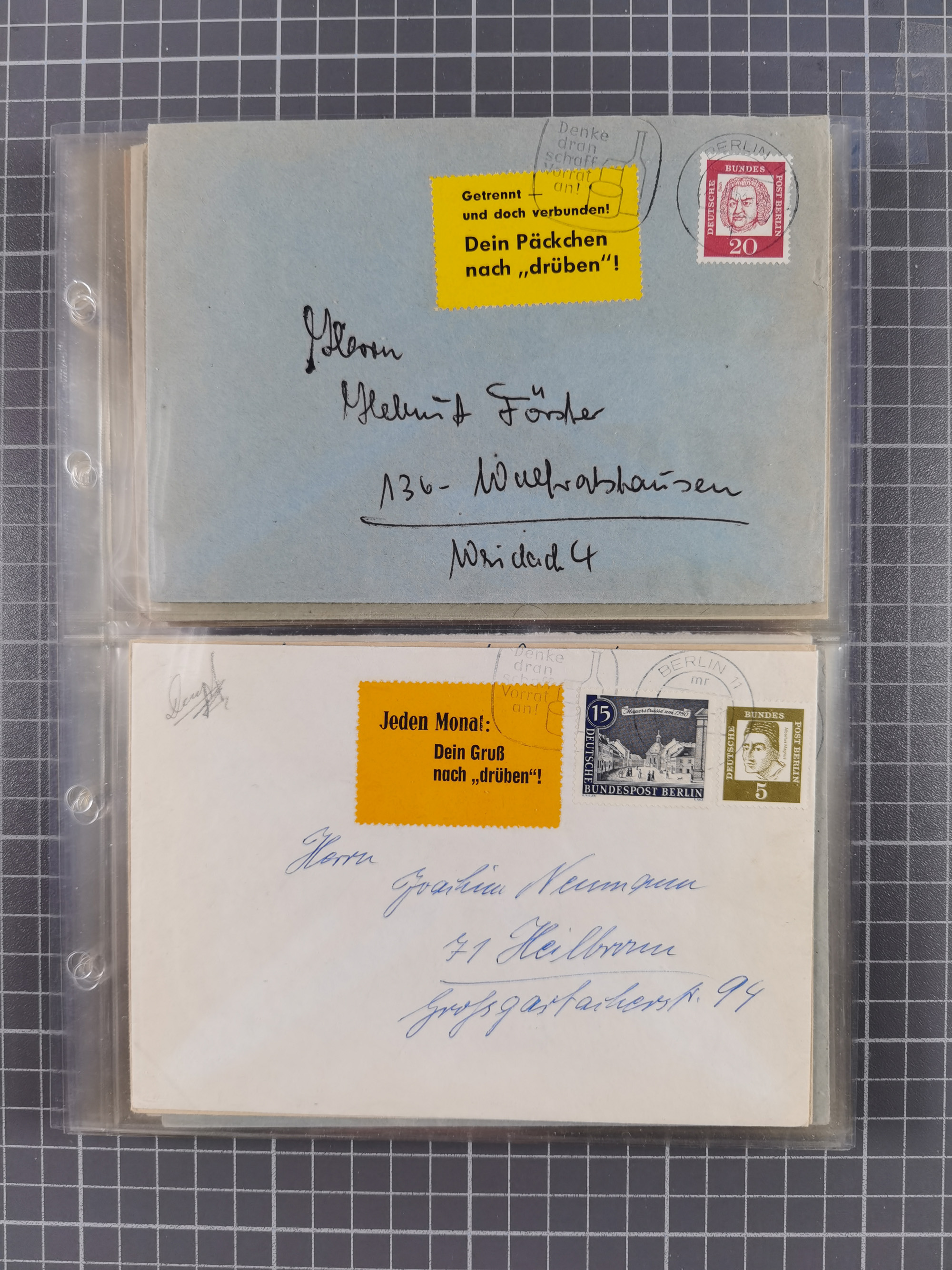 1962/64, Propaganda „Kalter Krieg", Sammlung von 277 Briefen, alle mit Propaganda-Vignetten versehen („Kampf um Wiedervereinigung". 17. Juni", „Die Mauer überwinden", Brücken bauen! Per Post oder Paket". „Wir lassen uns nicht trennen". 3 geteilt niemals!" usw. Alle Vignetten befinden sich auf Bedarfsbriefen und sind postalisch zusammen mit der Normalfrankatur abgestempelt, dabei auch 43 Luftpostbriefe, selten angeboten. Dazu noch 48 Belege Postkrieg".