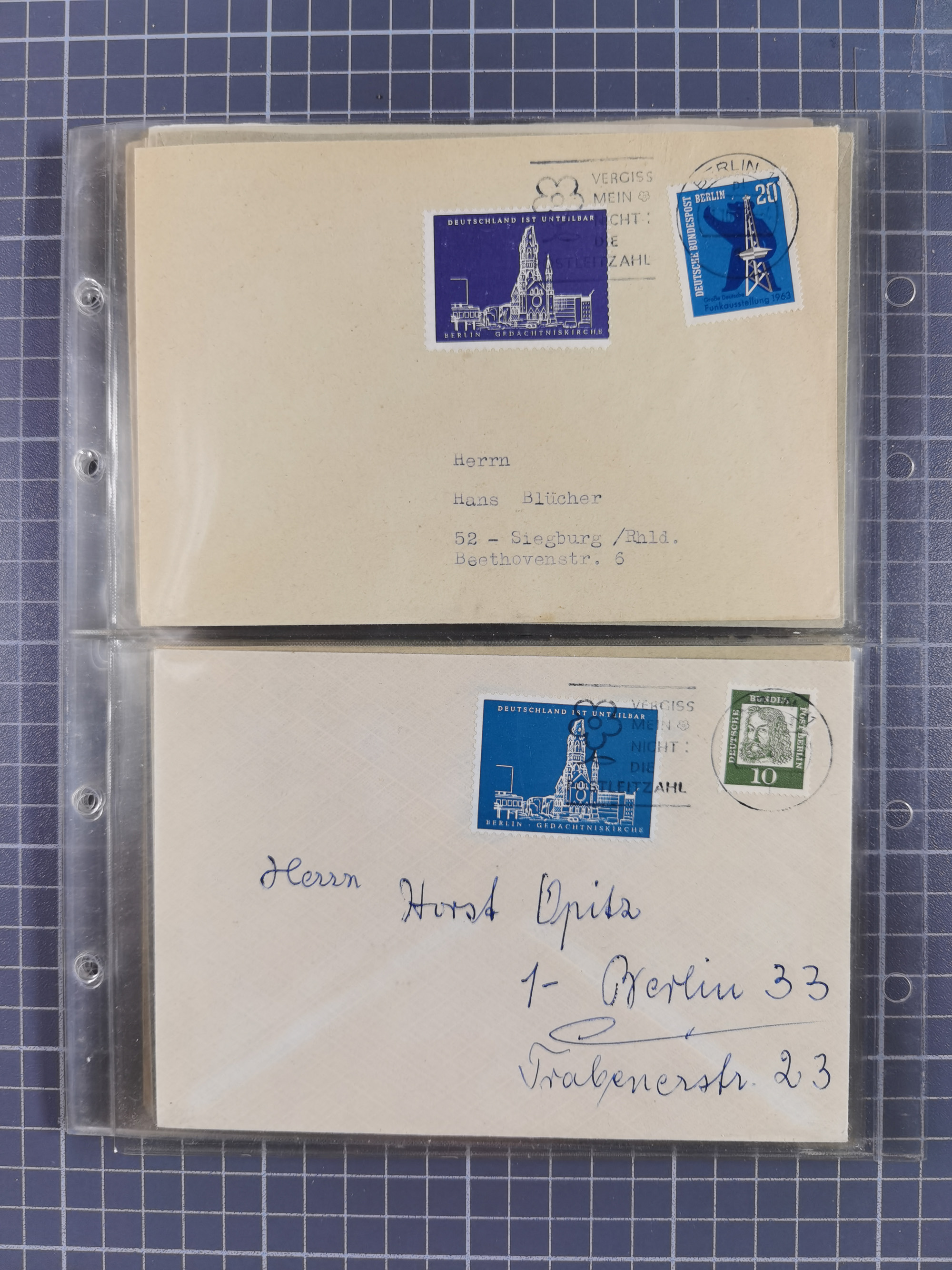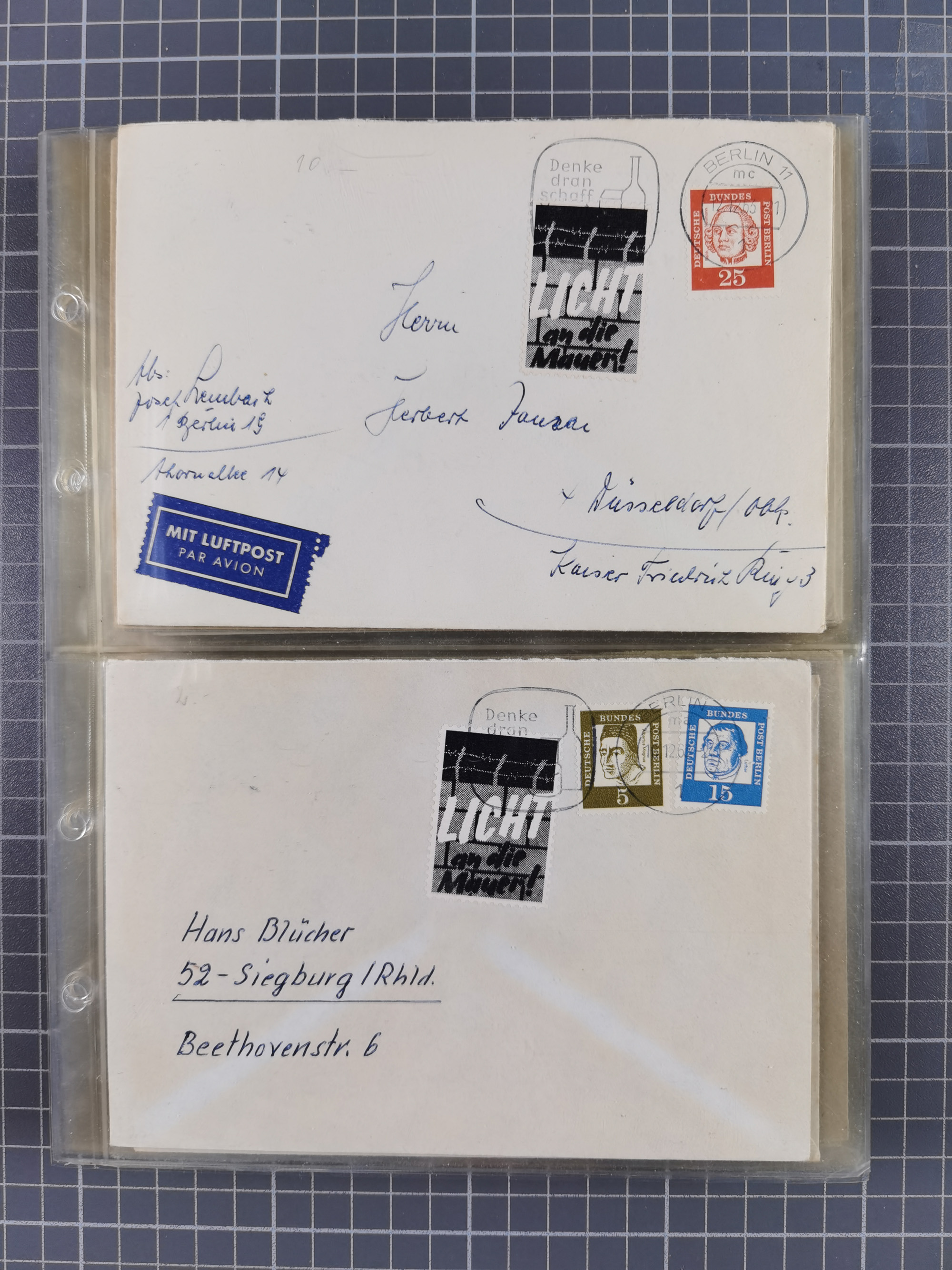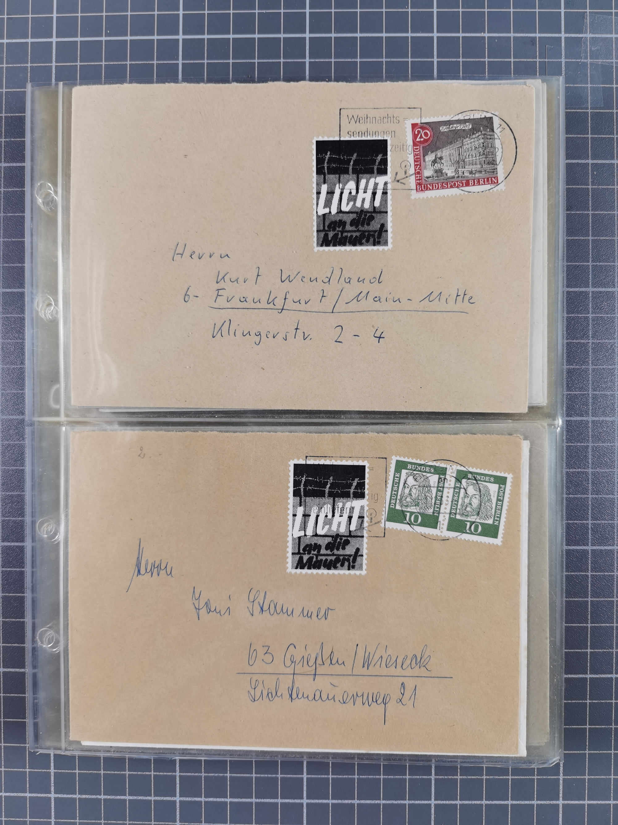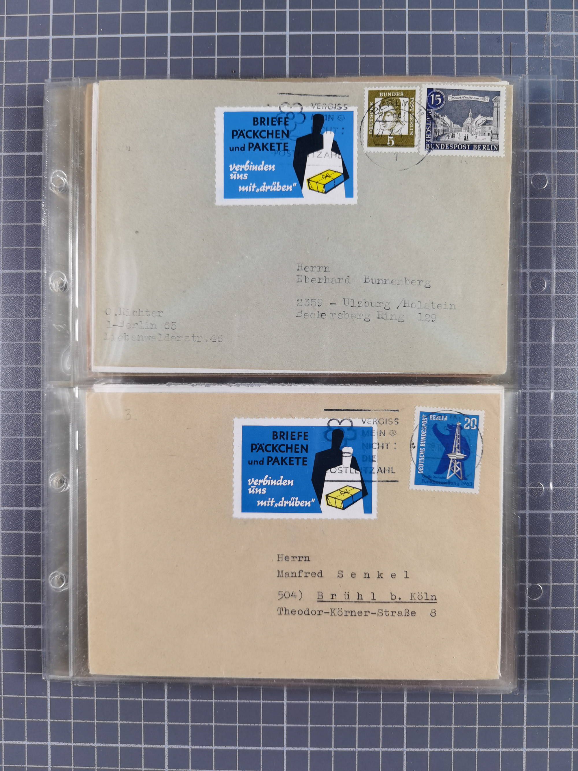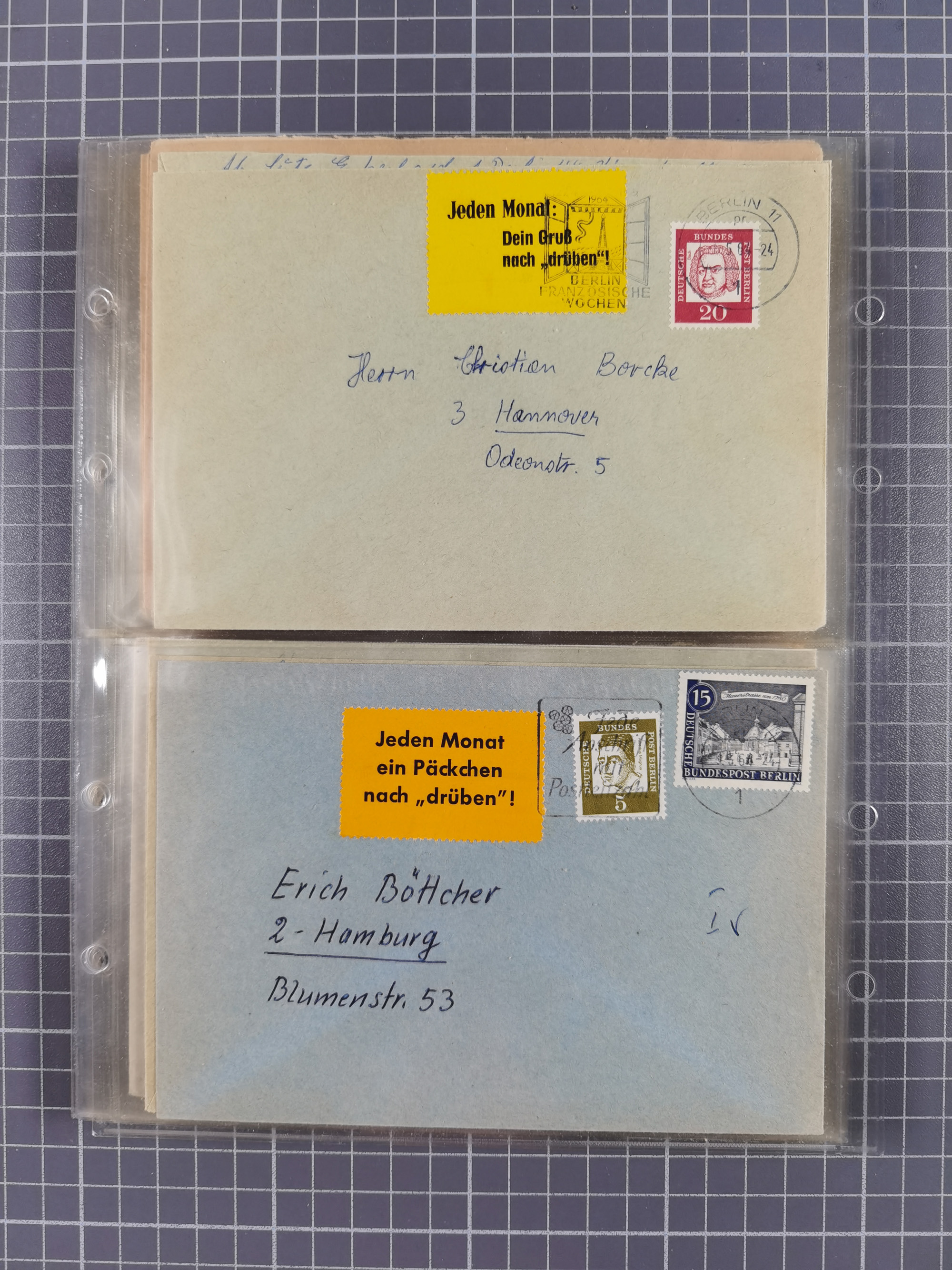 1962/64, Propaganda „Kalter Krieg", Sammlung von 277 Briefen, alle mit Propaganda-Vignetten versehen („Kampf um Wiedervereinigung". 17. Juni", „Die Mauer überwinden", Brücken bauen! Per Post oder Paket". „Wir lassen uns nicht trennen". 3 geteilt niemals!" usw. Alle Vignetten befinden sich auf Bedarfsbriefen und sind postalisch zusammen mit der Normalfrankatur abgestempelt, dabei auch 43 Luftpostbriefe, selten angeboten. Dazu noch 48 Belege Postkrieg".