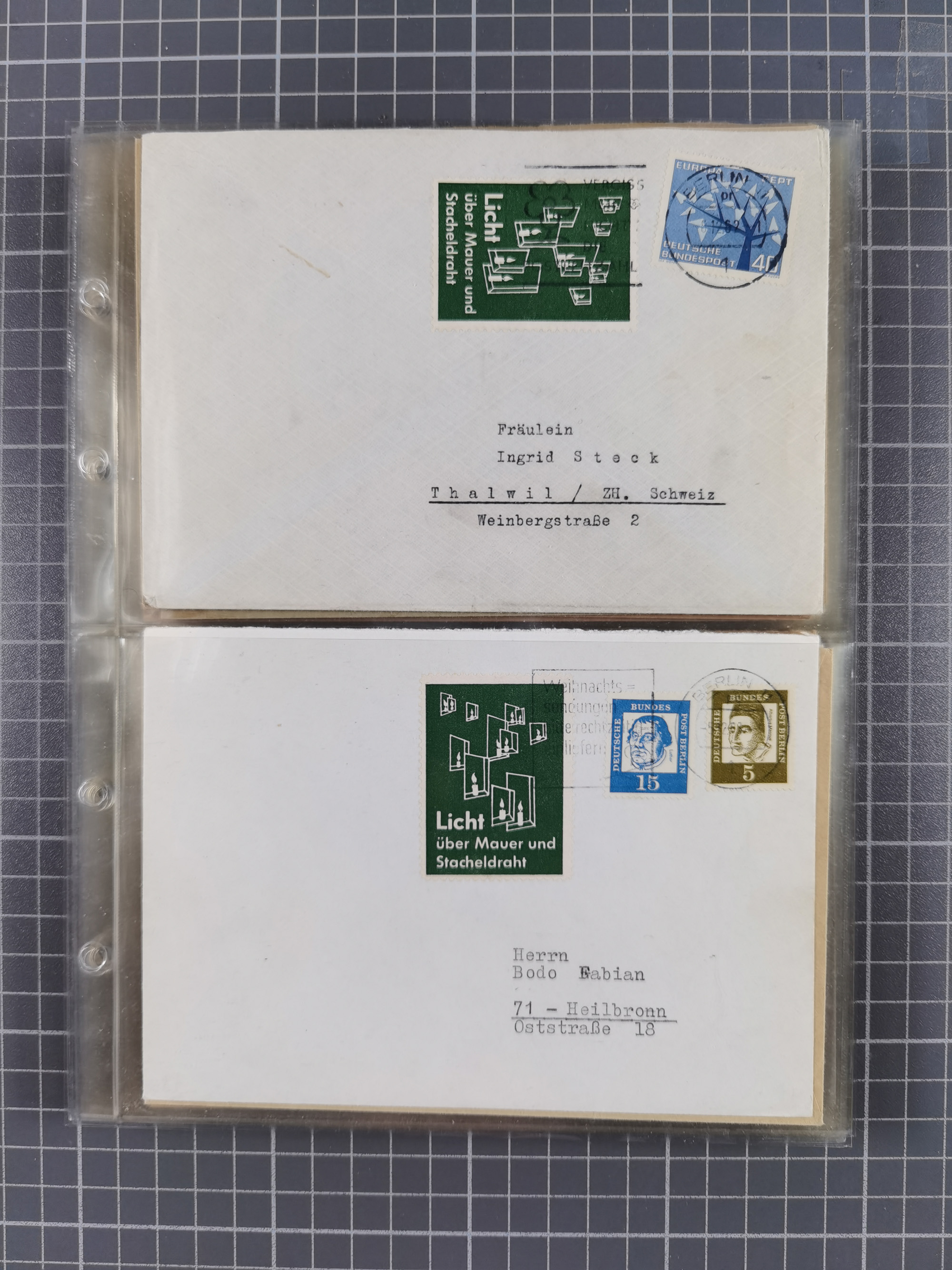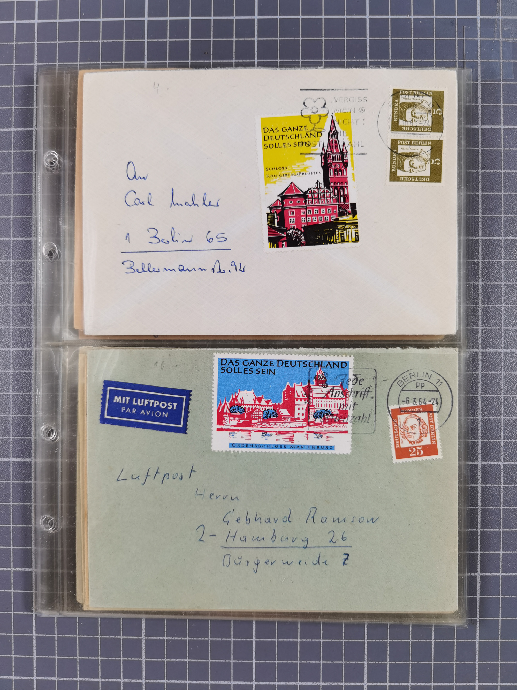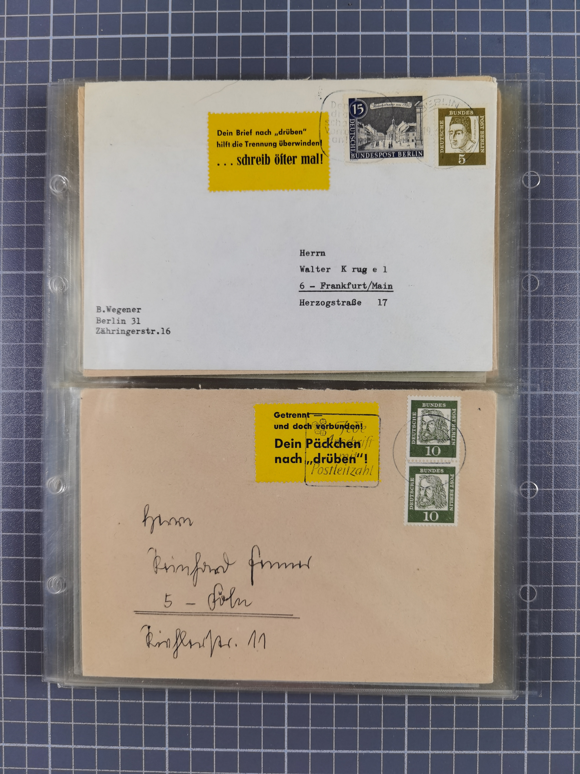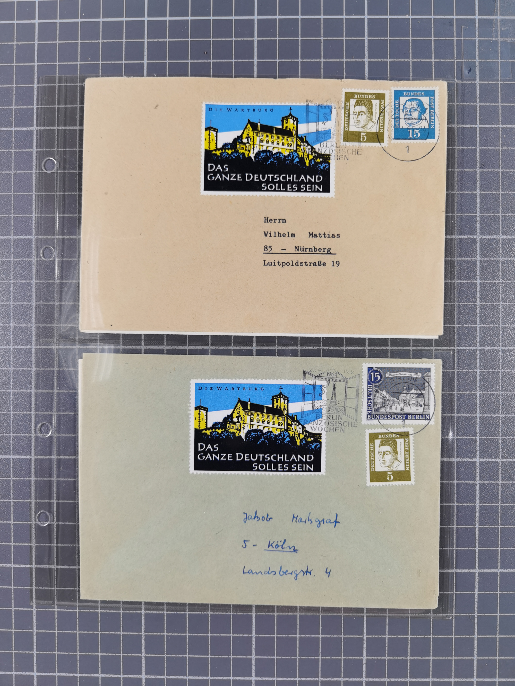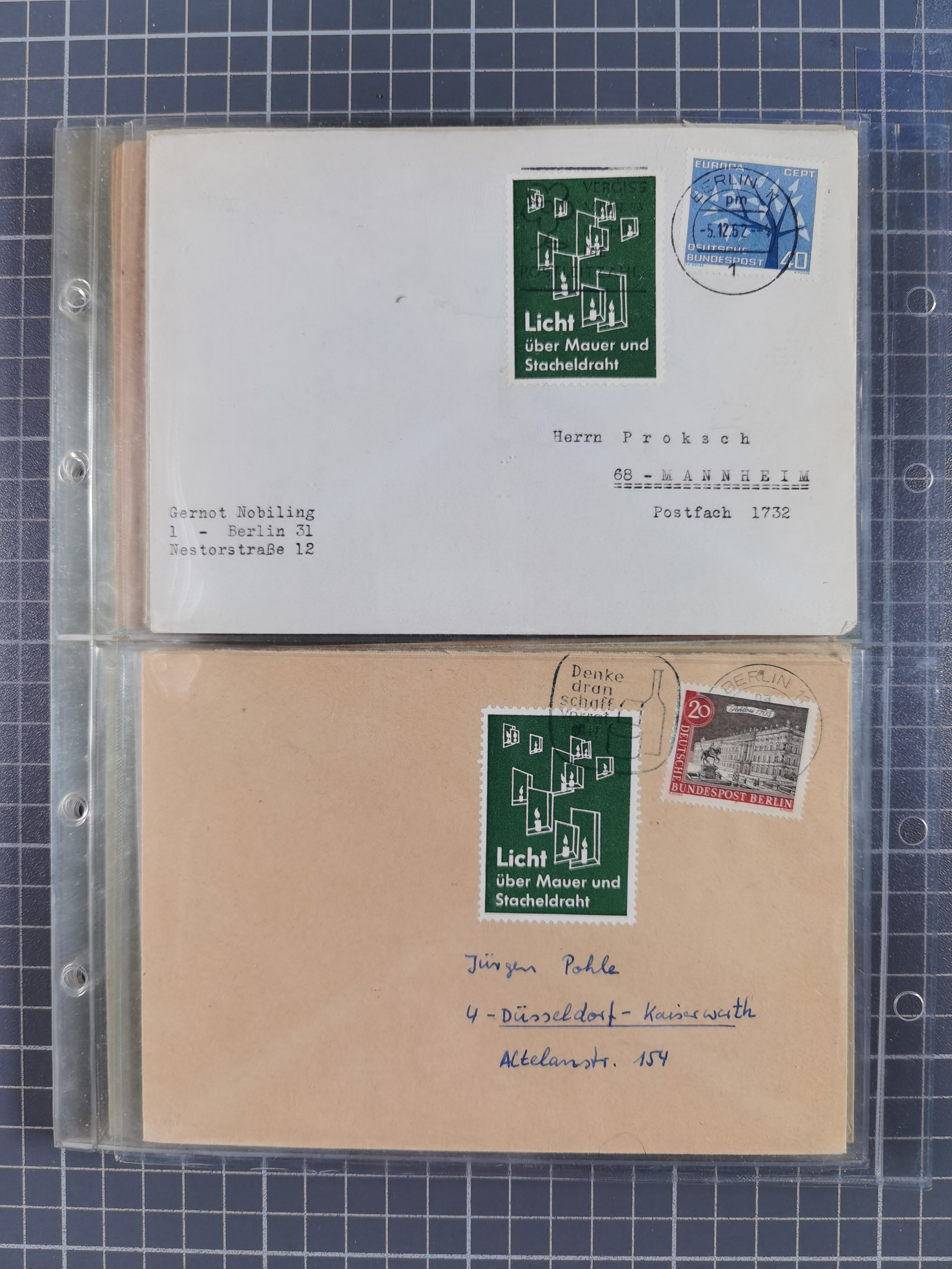 1962/64, Propaganda „Kalter Krieg", Sammlung von 277 Briefen, alle mit Propaganda-Vignetten versehen („Kampf um Wiedervereinigung". 17. Juni", „Die Mauer überwinden", Brücken bauen! Per Post oder Paket". „Wir lassen uns nicht trennen". 3 geteilt niemals!" usw. Alle Vignetten befinden sich auf Bedarfsbriefen und sind postalisch zusammen mit der Normalfrankatur abgestempelt, dabei auch 43 Luftpostbriefe, selten angeboten. Dazu noch 48 Belege Postkrieg".