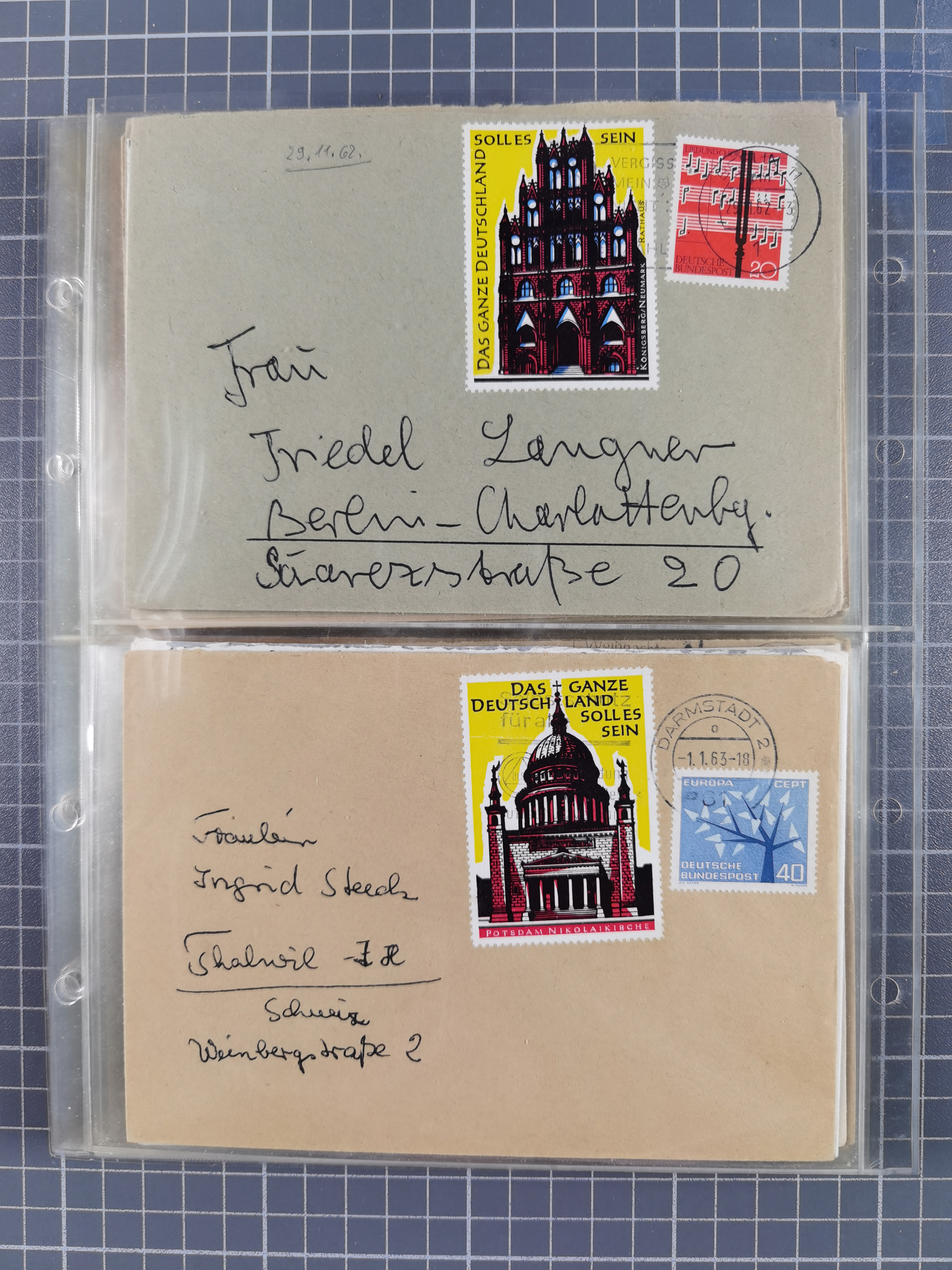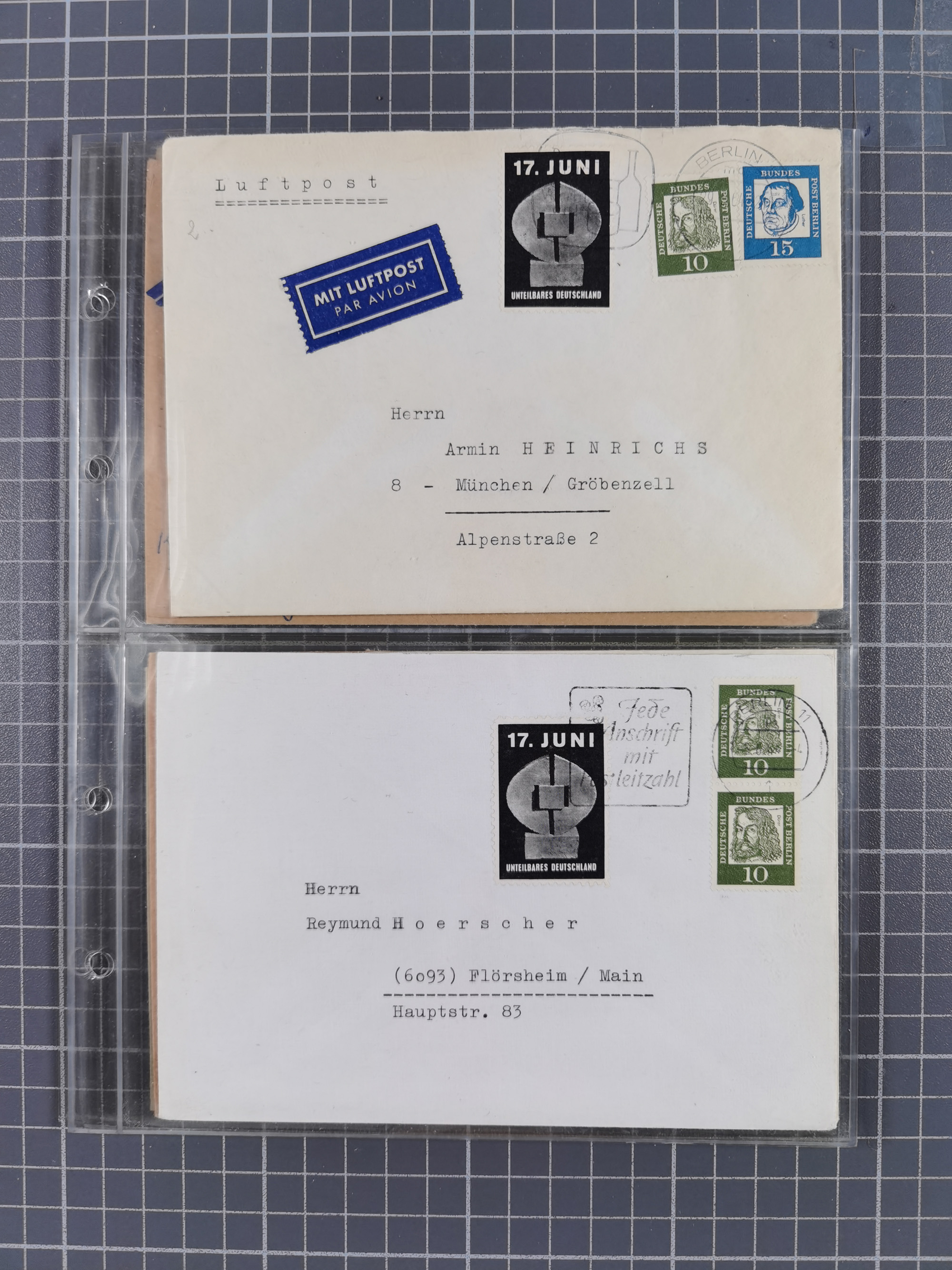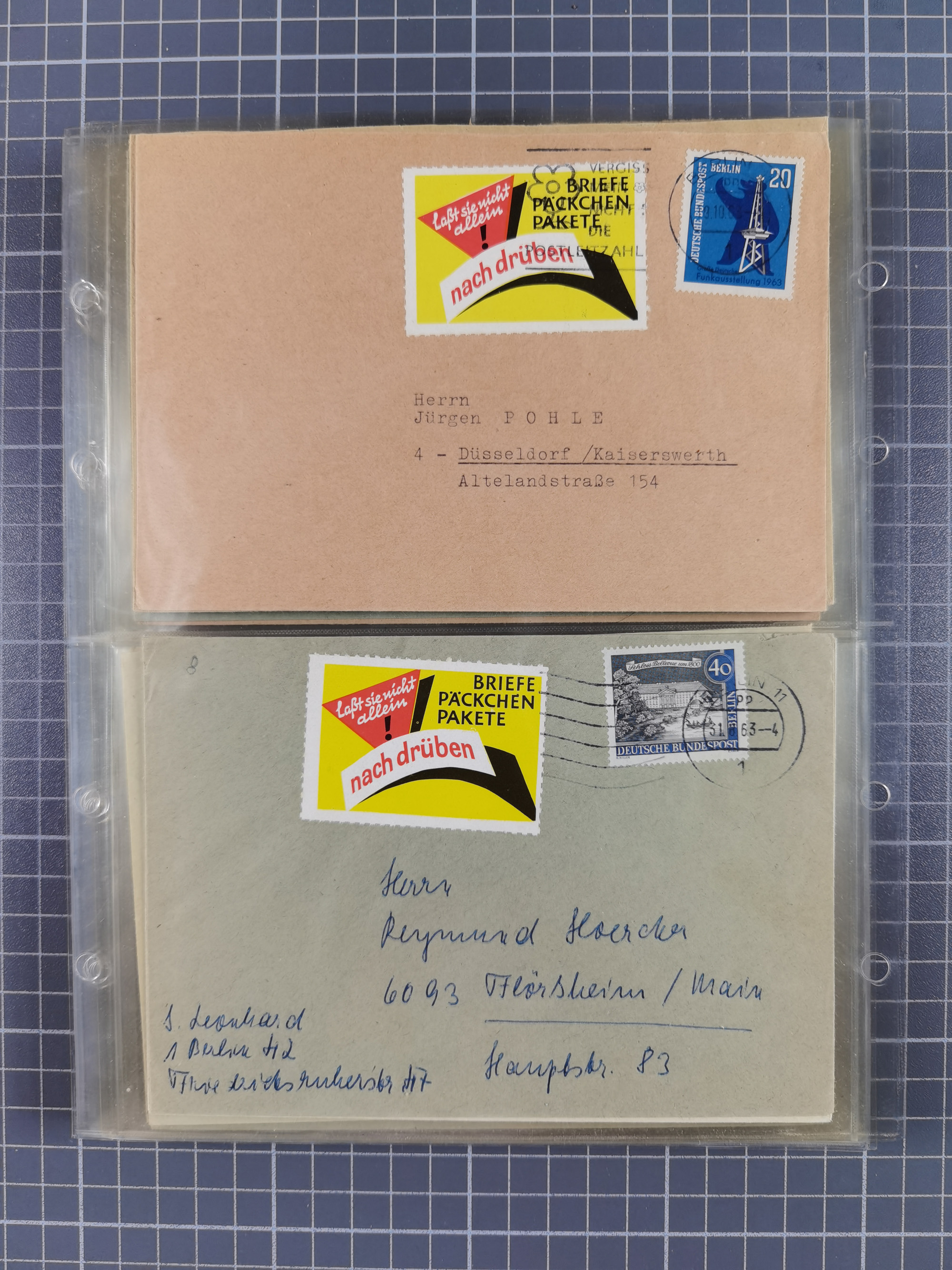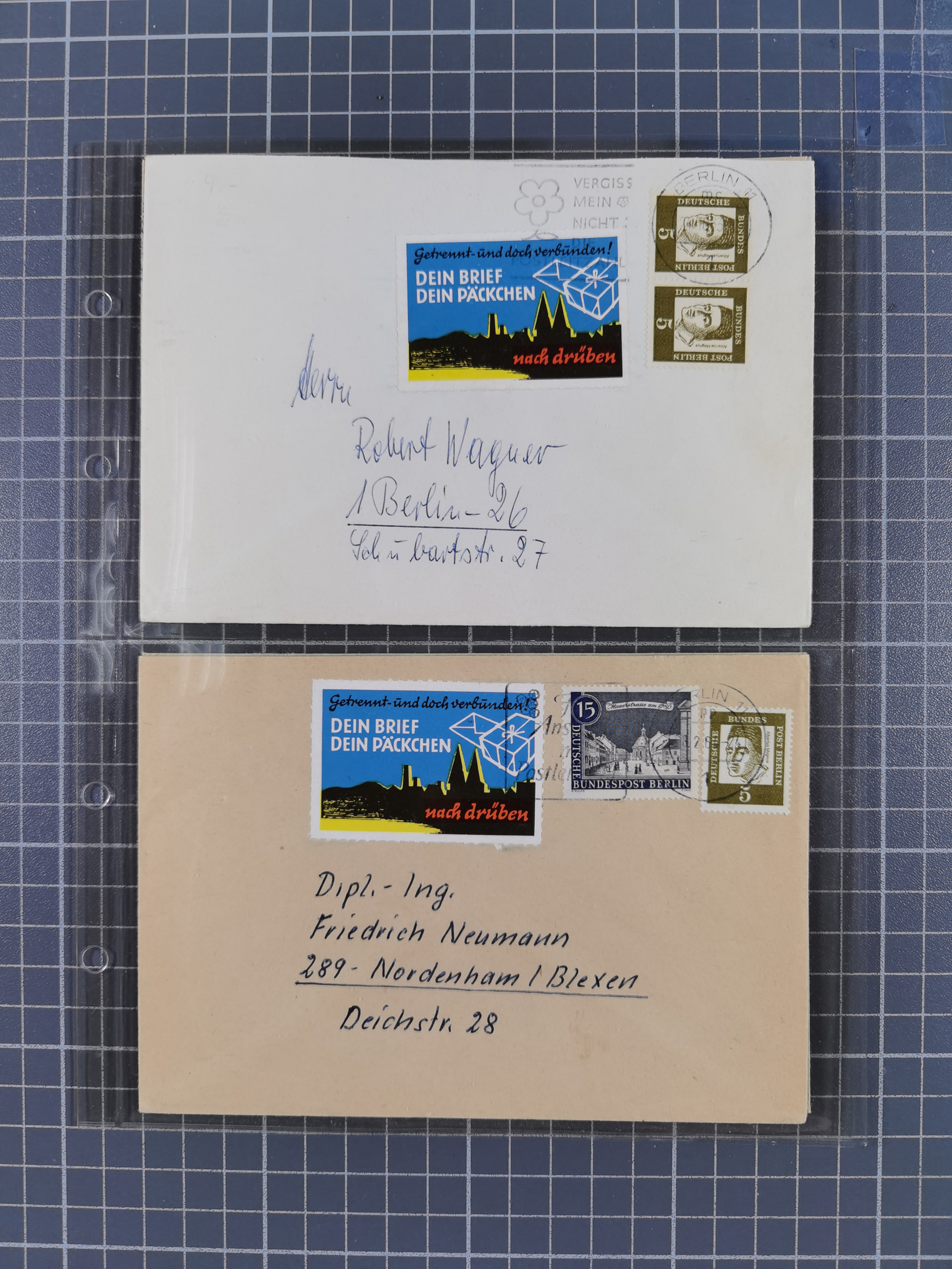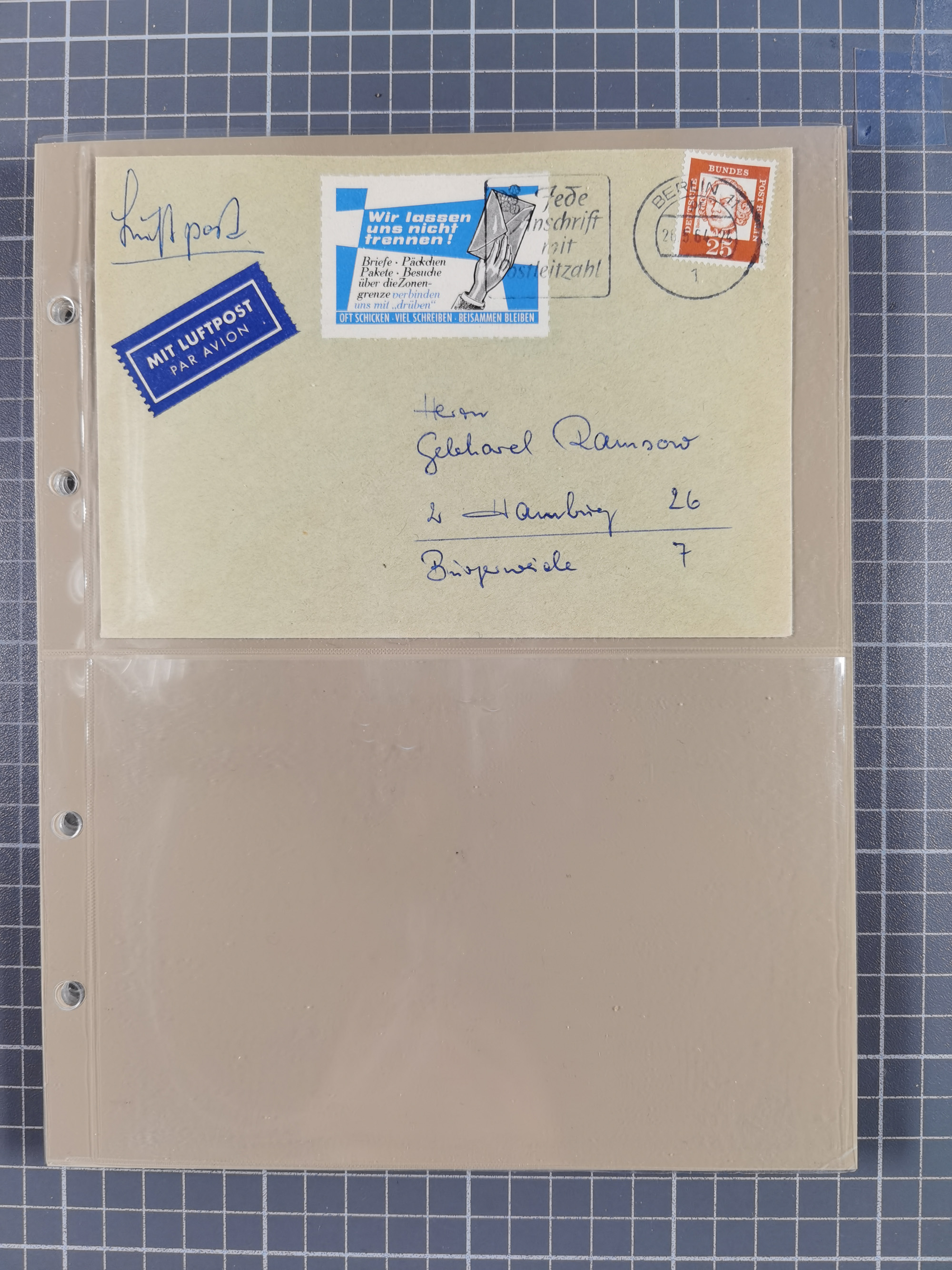 1962/64, Propaganda „Kalter Krieg", Sammlung von 277 Briefen, alle mit Propaganda-Vignetten versehen („Kampf um Wiedervereinigung". 17. Juni", „Die Mauer überwinden", Brücken bauen! Per Post oder Paket". „Wir lassen uns nicht trennen". 3 geteilt niemals!" usw. Alle Vignetten befinden sich auf Bedarfsbriefen und sind postalisch zusammen mit der Normalfrankatur abgestempelt, dabei auch 43 Luftpostbriefe, selten angeboten. Dazu noch 48 Belege Postkrieg".