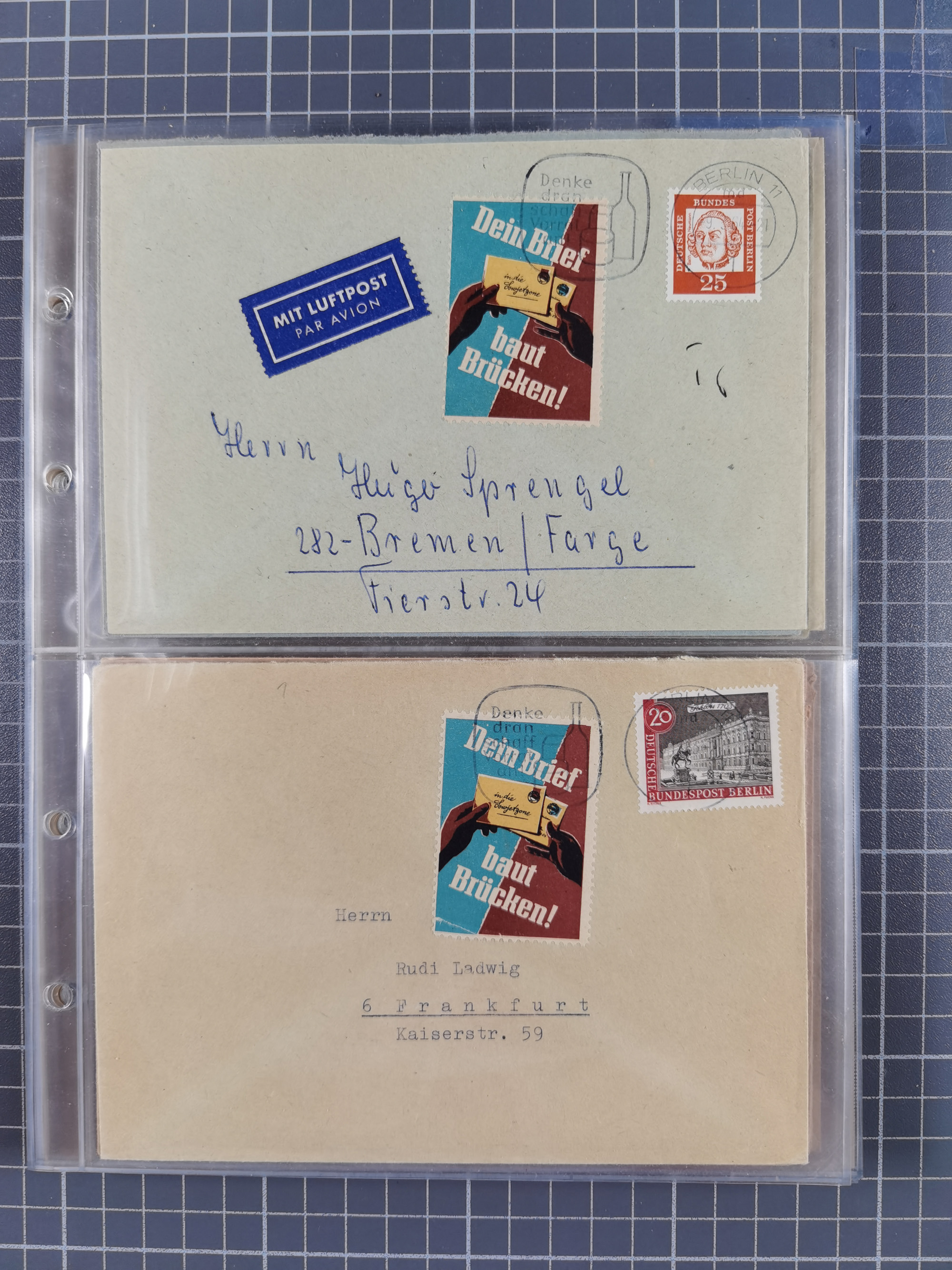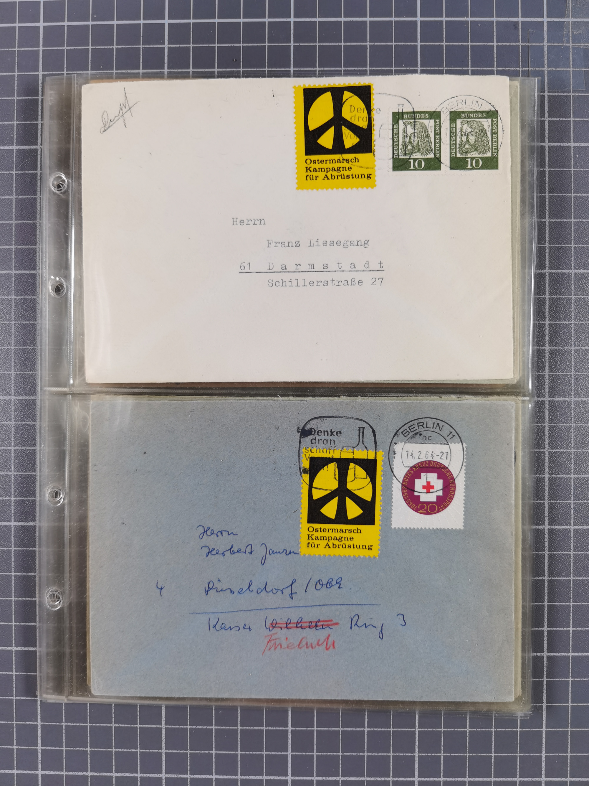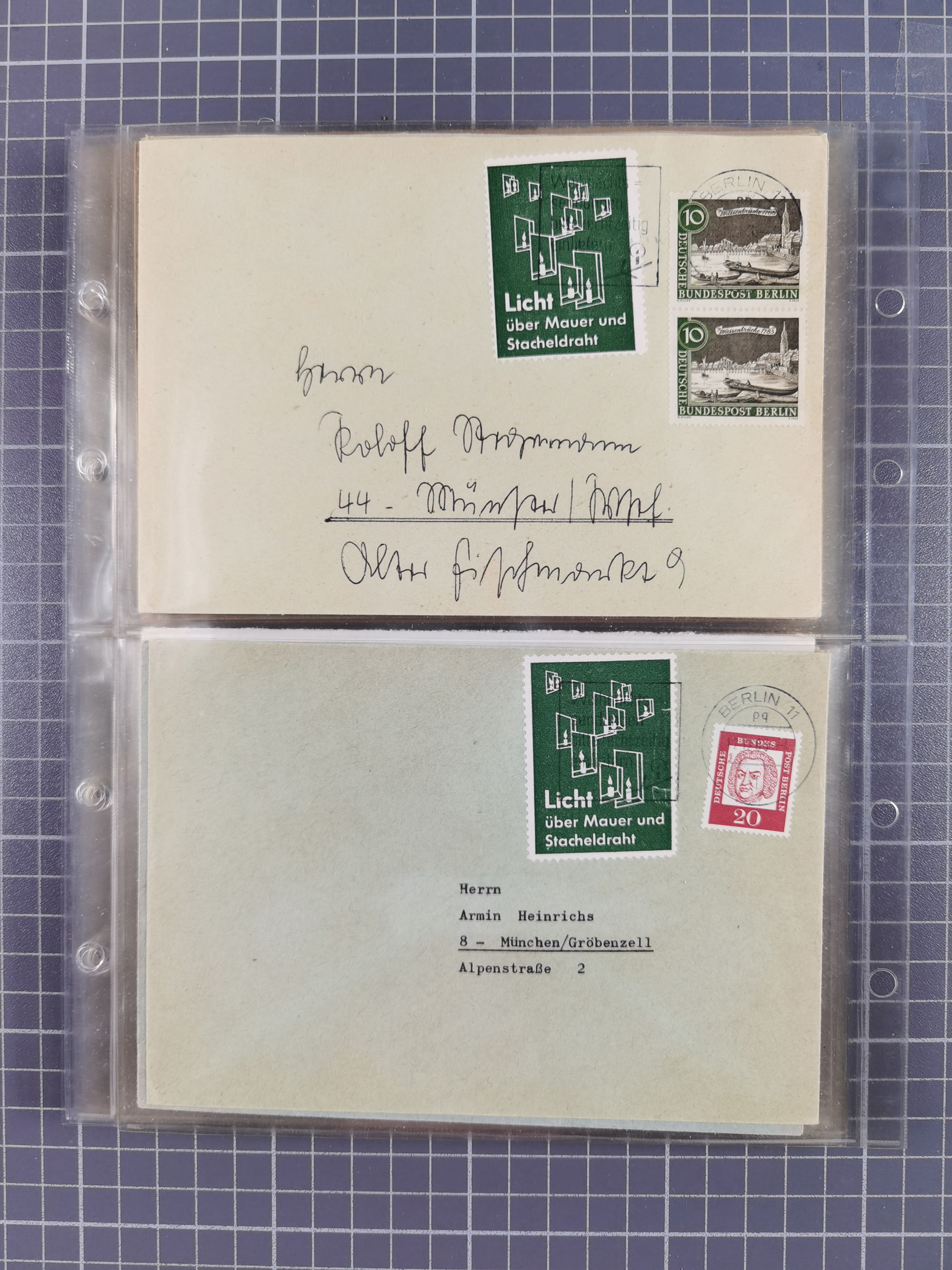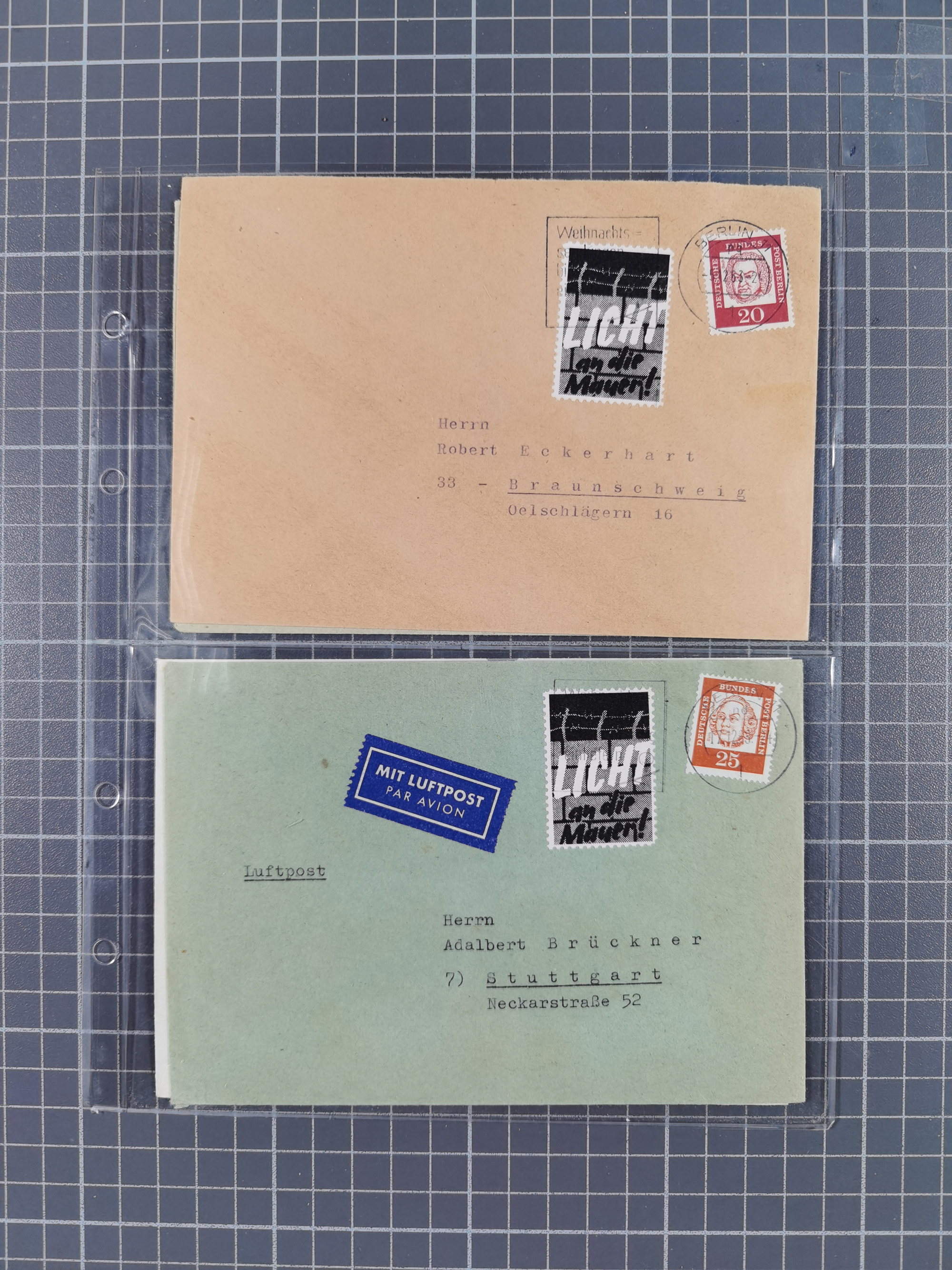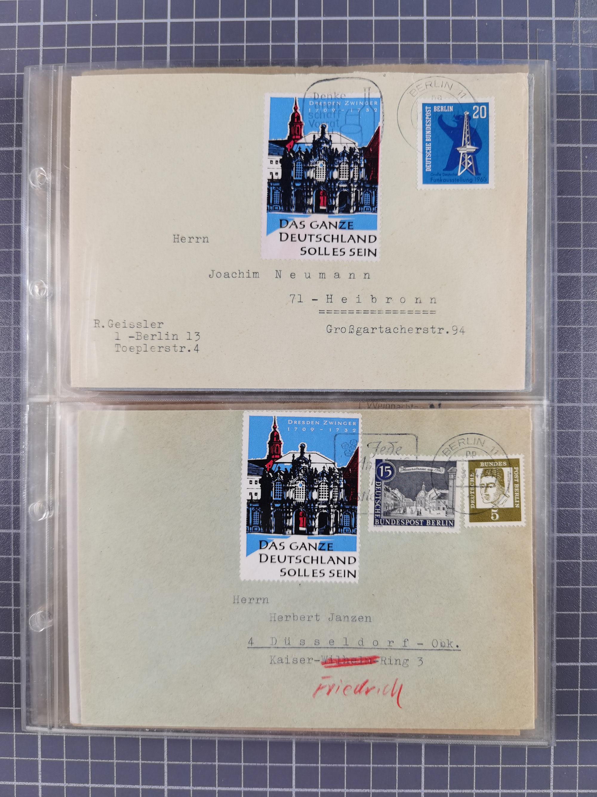 1962/64, Propaganda „Kalter Krieg", Sammlung von 277 Briefen, alle mit Propaganda-Vignetten versehen („Kampf um Wiedervereinigung". 17. Juni", „Die Mauer überwinden", Brücken bauen! Per Post oder Paket". „Wir lassen uns nicht trennen". 3 geteilt niemals!" usw. Alle Vignetten befinden sich auf Bedarfsbriefen und sind postalisch zusammen mit der Normalfrankatur abgestempelt, dabei auch 43 Luftpostbriefe, selten angeboten. Dazu noch 48 Belege Postkrieg".