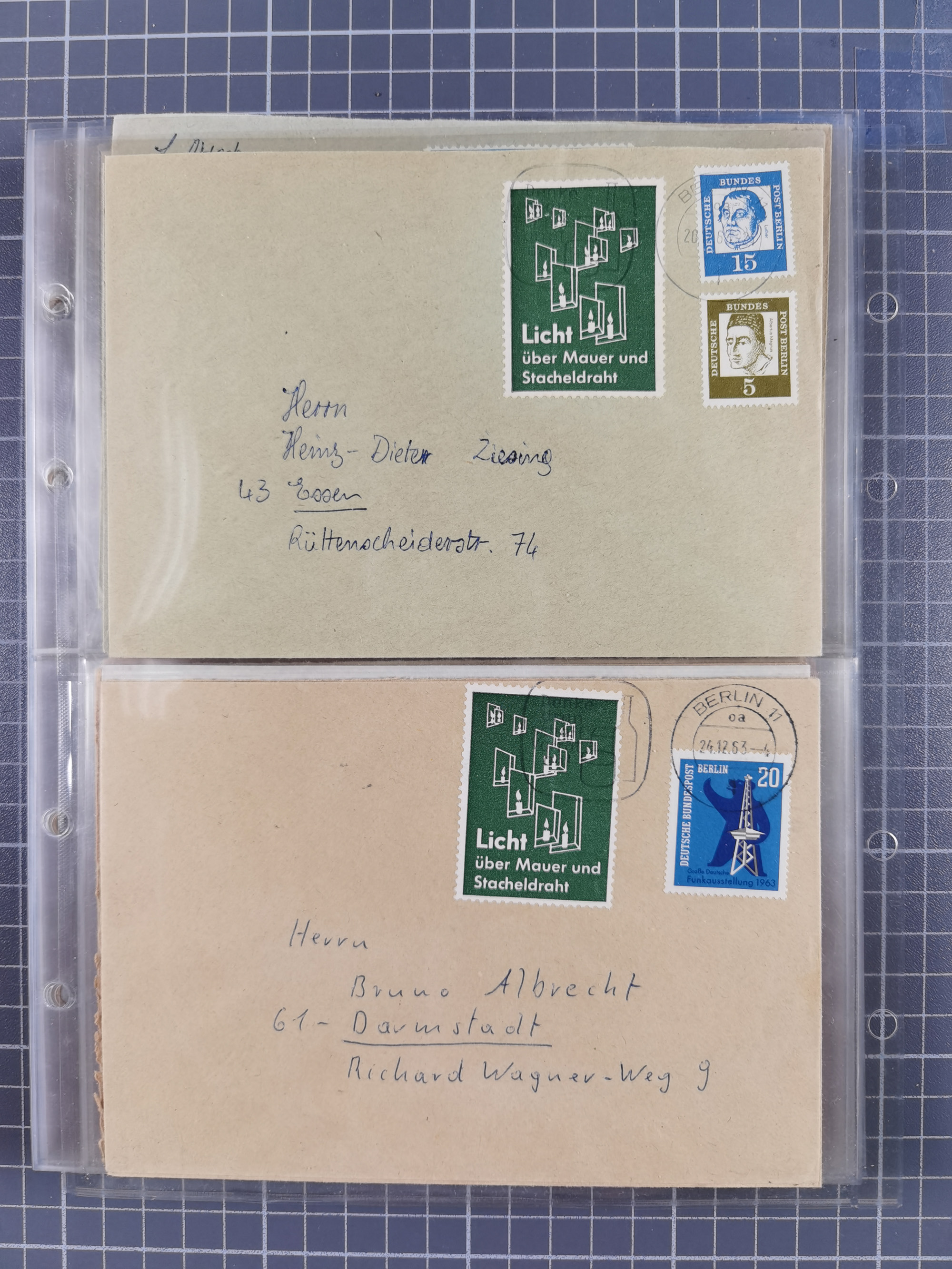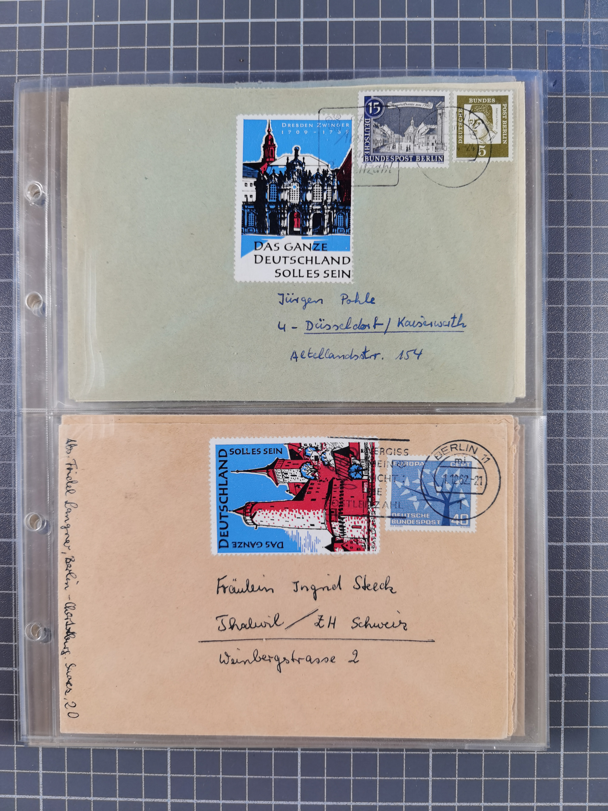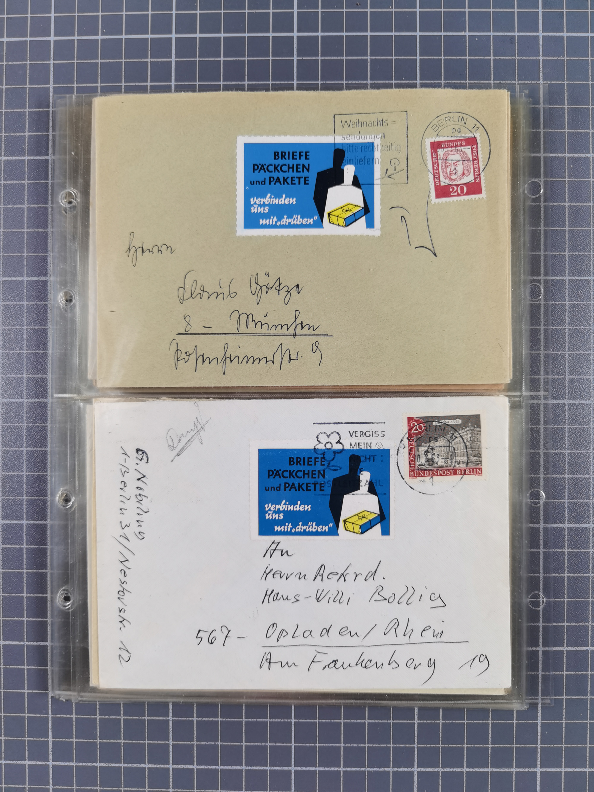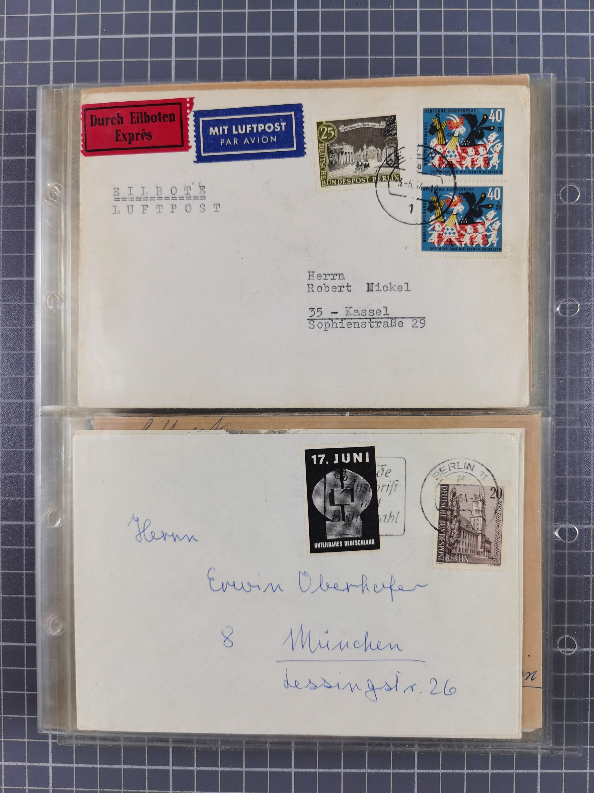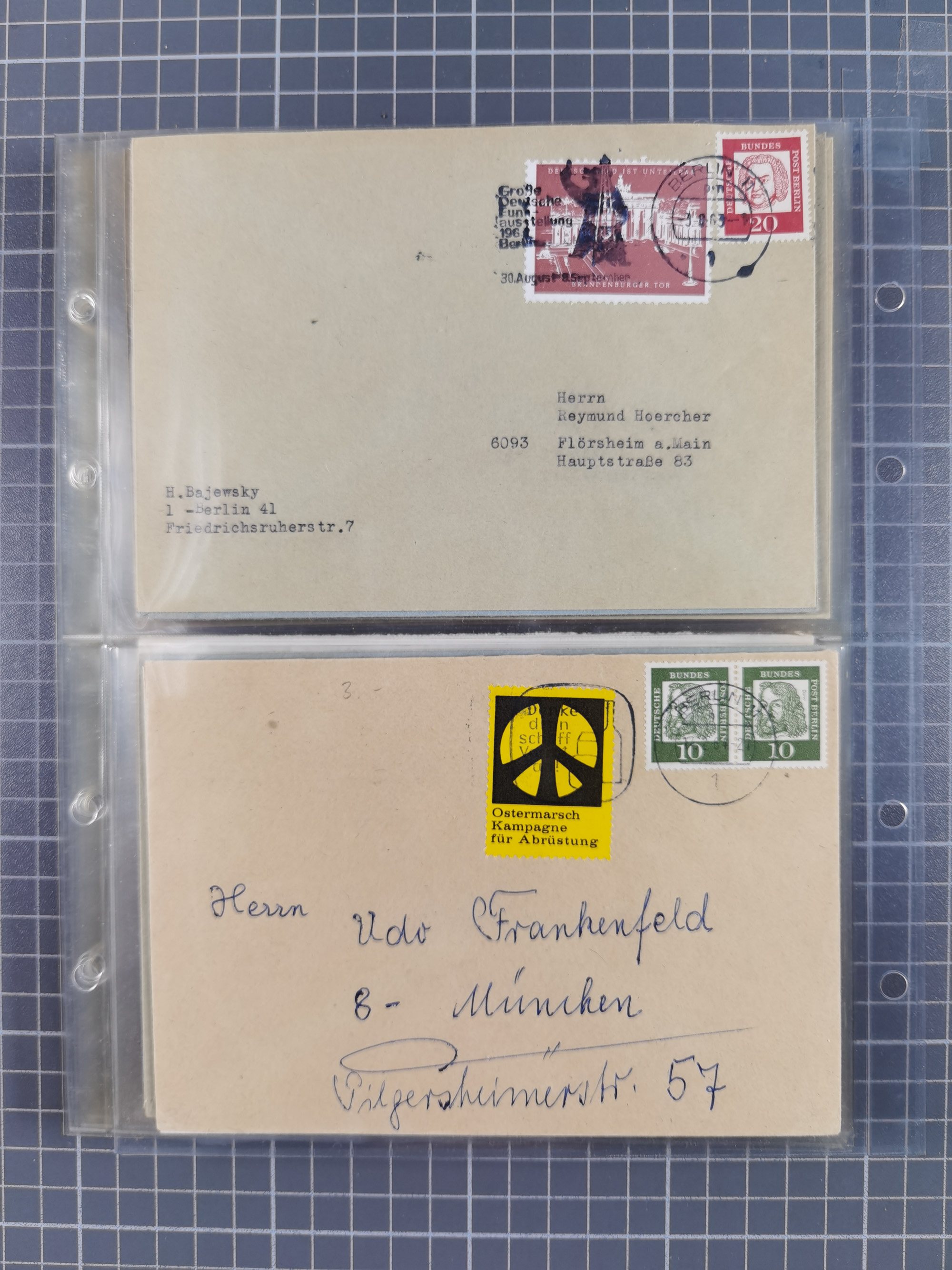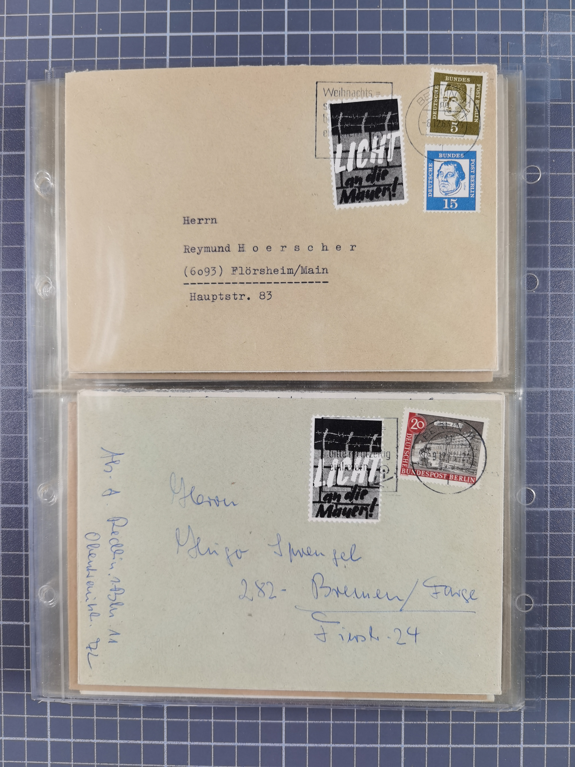 1962/64, Propaganda „Kalter Krieg", Sammlung von 277 Briefen, alle mit Propaganda-Vignetten versehen („Kampf um Wiedervereinigung". 17. Juni", „Die Mauer überwinden", Brücken bauen! Per Post oder Paket". „Wir lassen uns nicht trennen". 3 geteilt niemals!" usw. Alle Vignetten befinden sich auf Bedarfsbriefen und sind postalisch zusammen mit der Normalfrankatur abgestempelt, dabei auch 43 Luftpostbriefe, selten angeboten. Dazu noch 48 Belege Postkrieg".