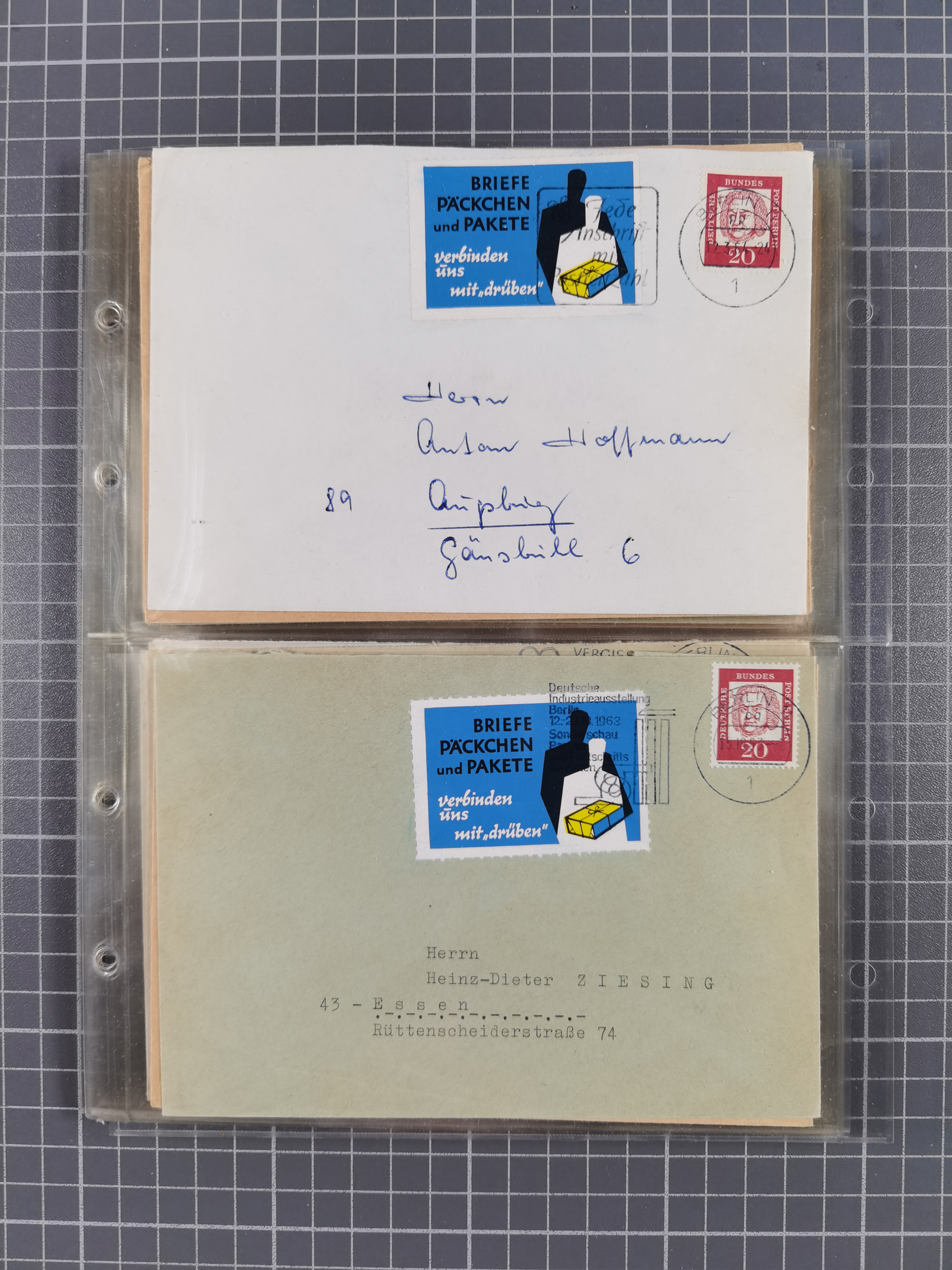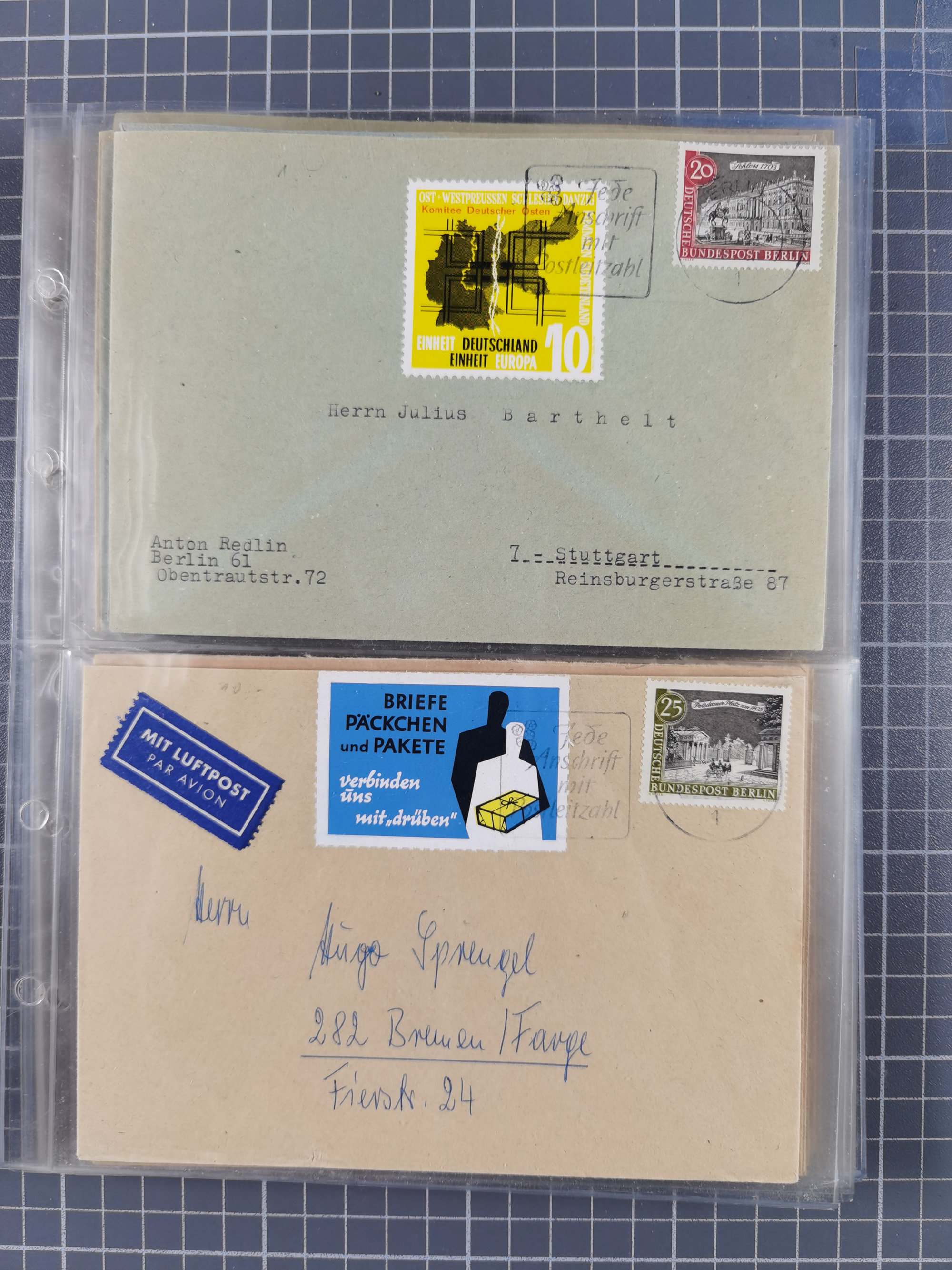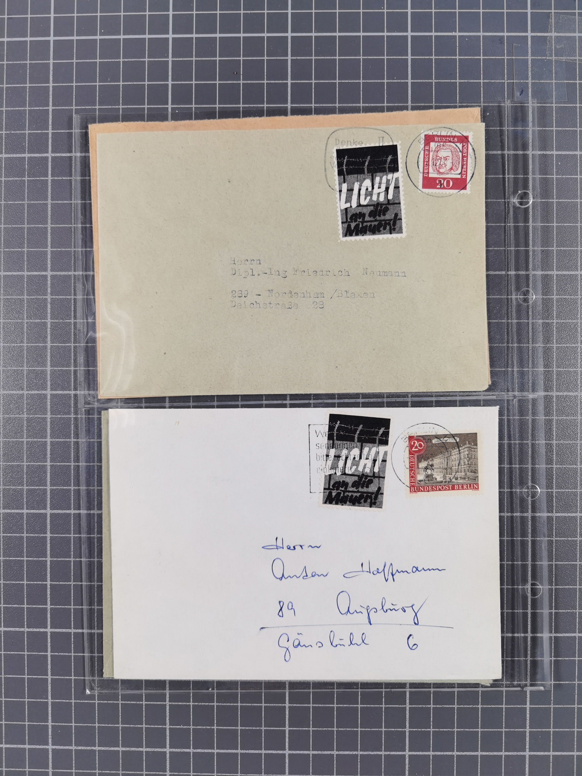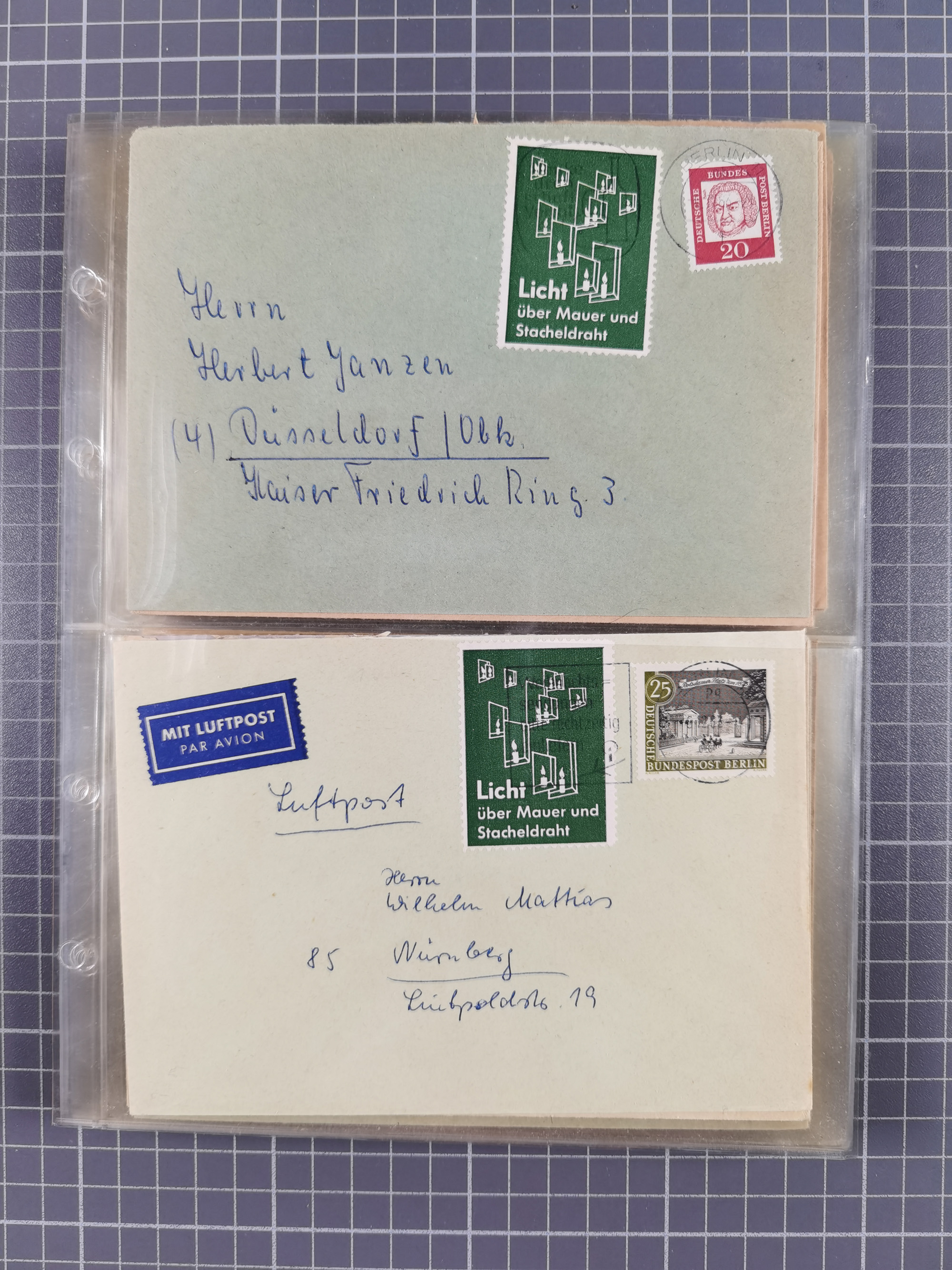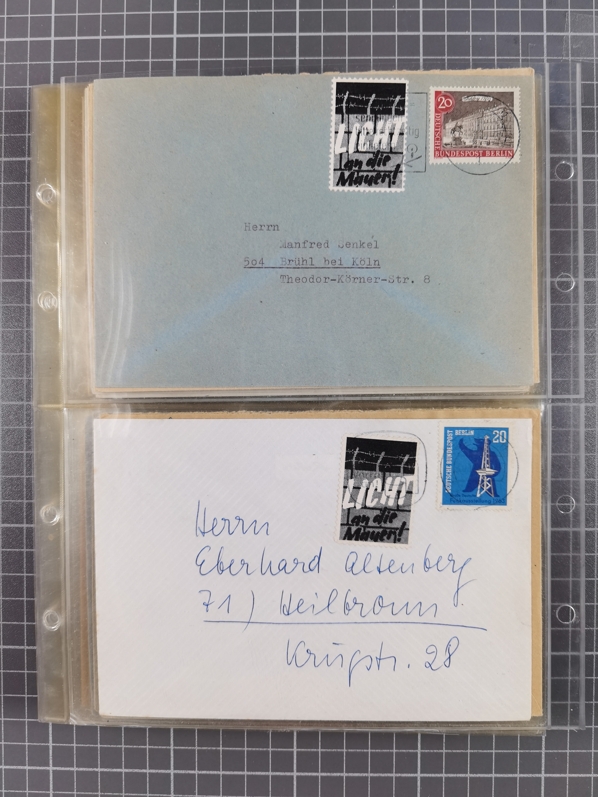 1962/64, Propaganda „Kalter Krieg", Sammlung von 277 Briefen, alle mit Propaganda-Vignetten versehen („Kampf um Wiedervereinigung". 17. Juni", „Die Mauer überwinden", Brücken bauen! Per Post oder Paket". „Wir lassen uns nicht trennen". 3 geteilt niemals!" usw. Alle Vignetten befinden sich auf Bedarfsbriefen und sind postalisch zusammen mit der Normalfrankatur abgestempelt, dabei auch 43 Luftpostbriefe, selten angeboten. Dazu noch 48 Belege Postkrieg".
