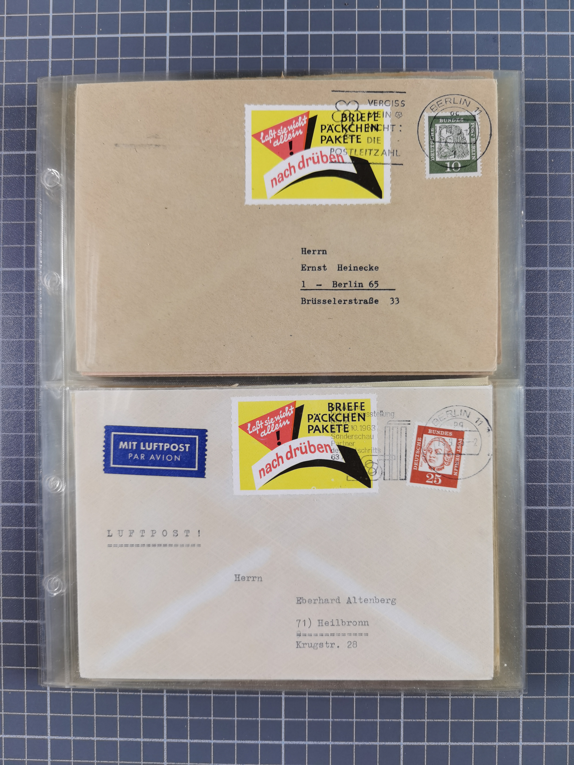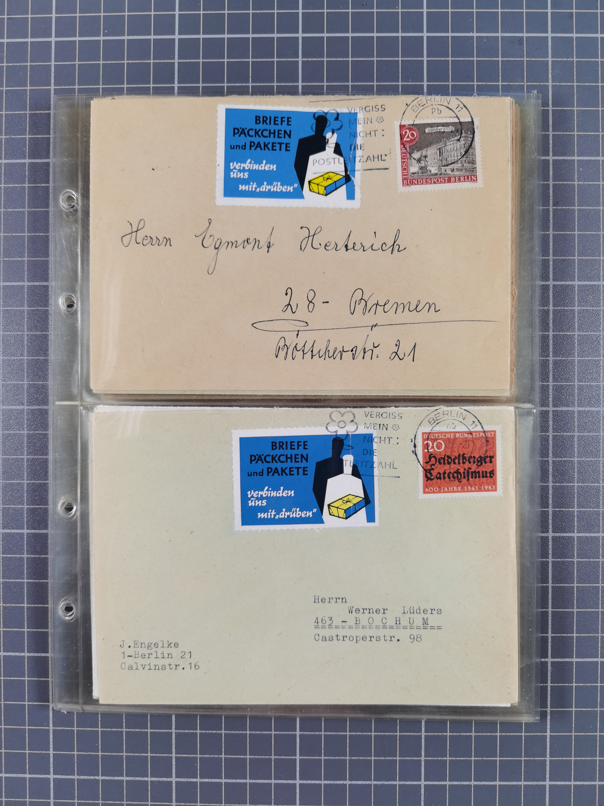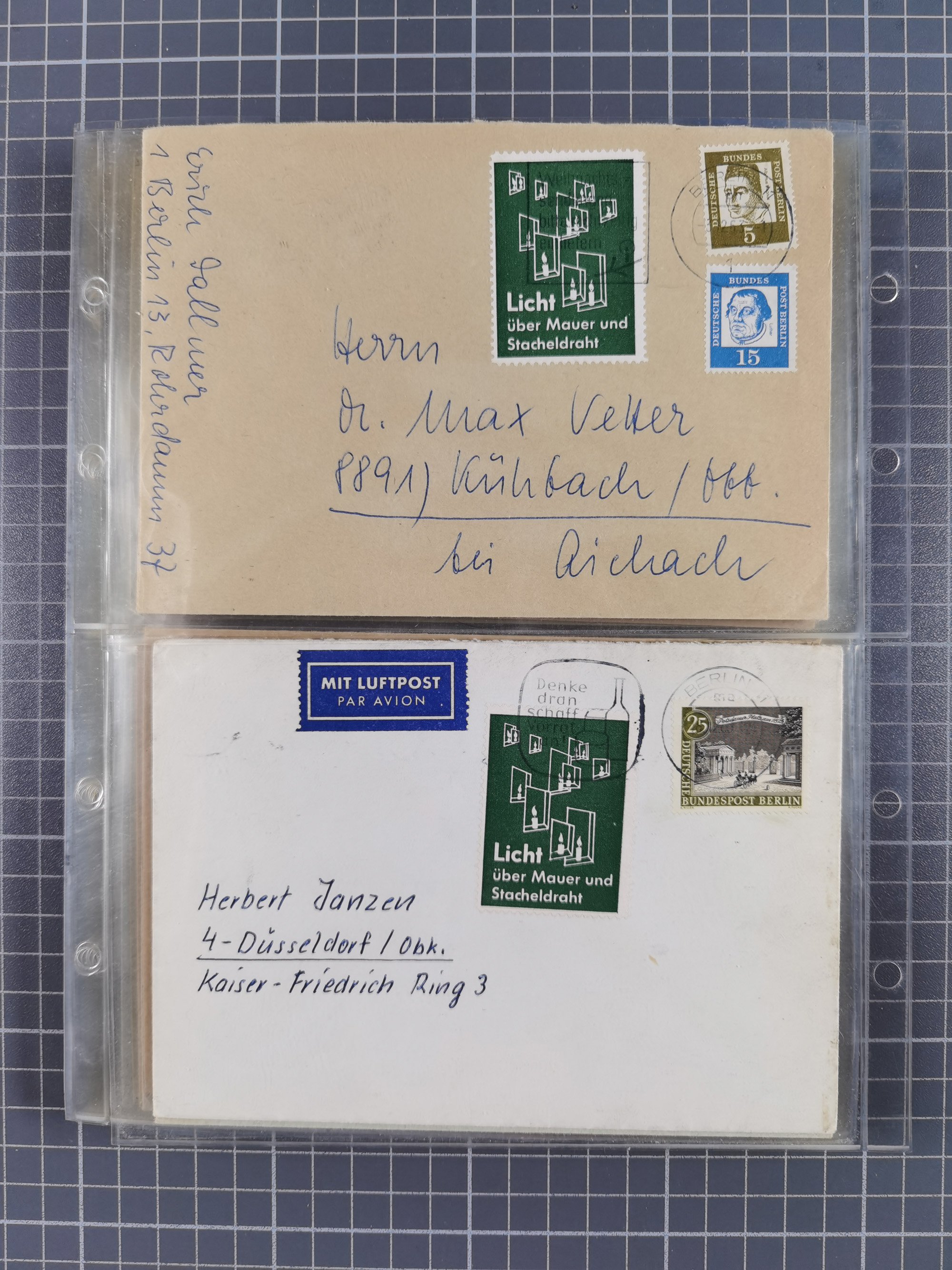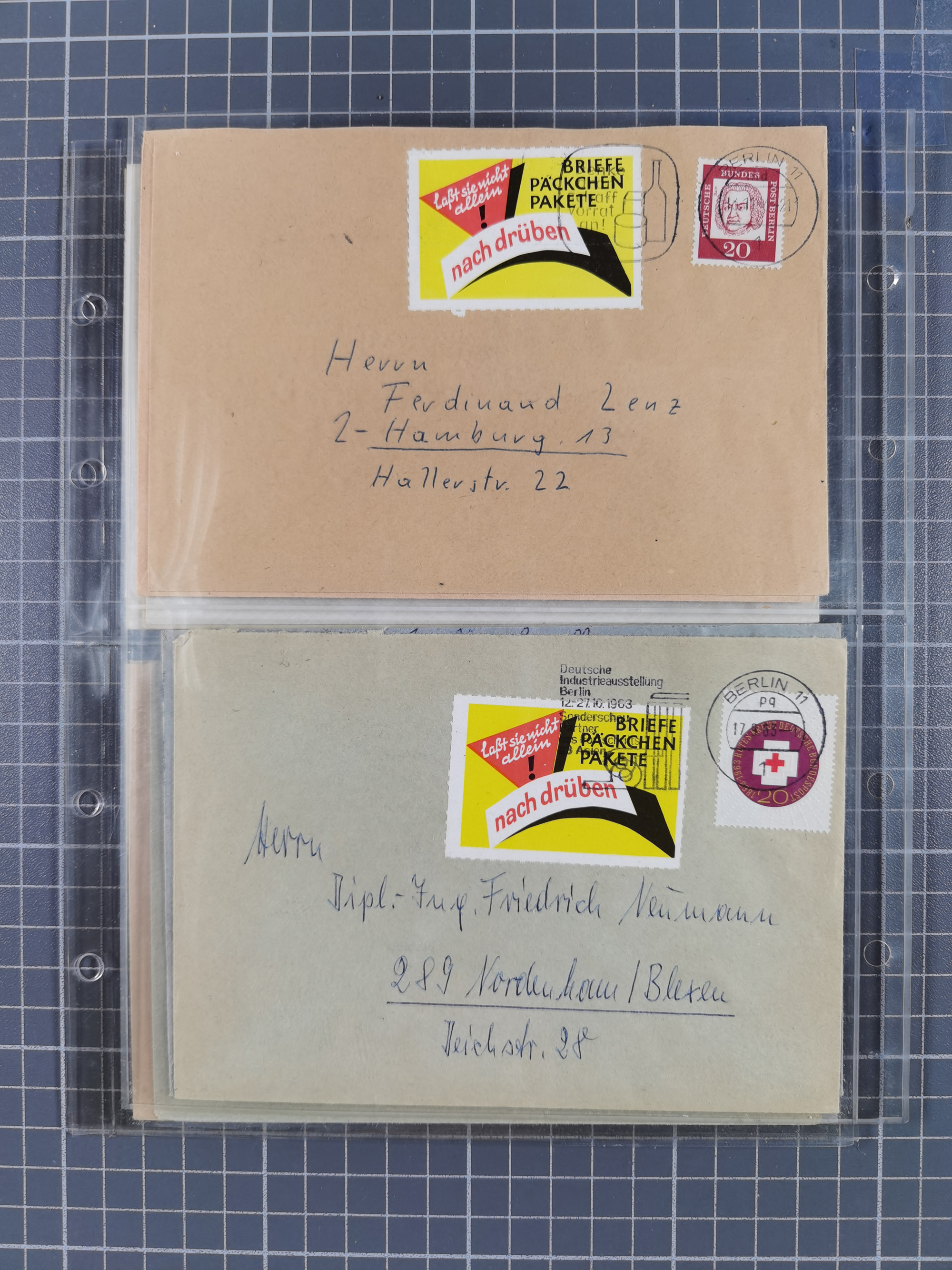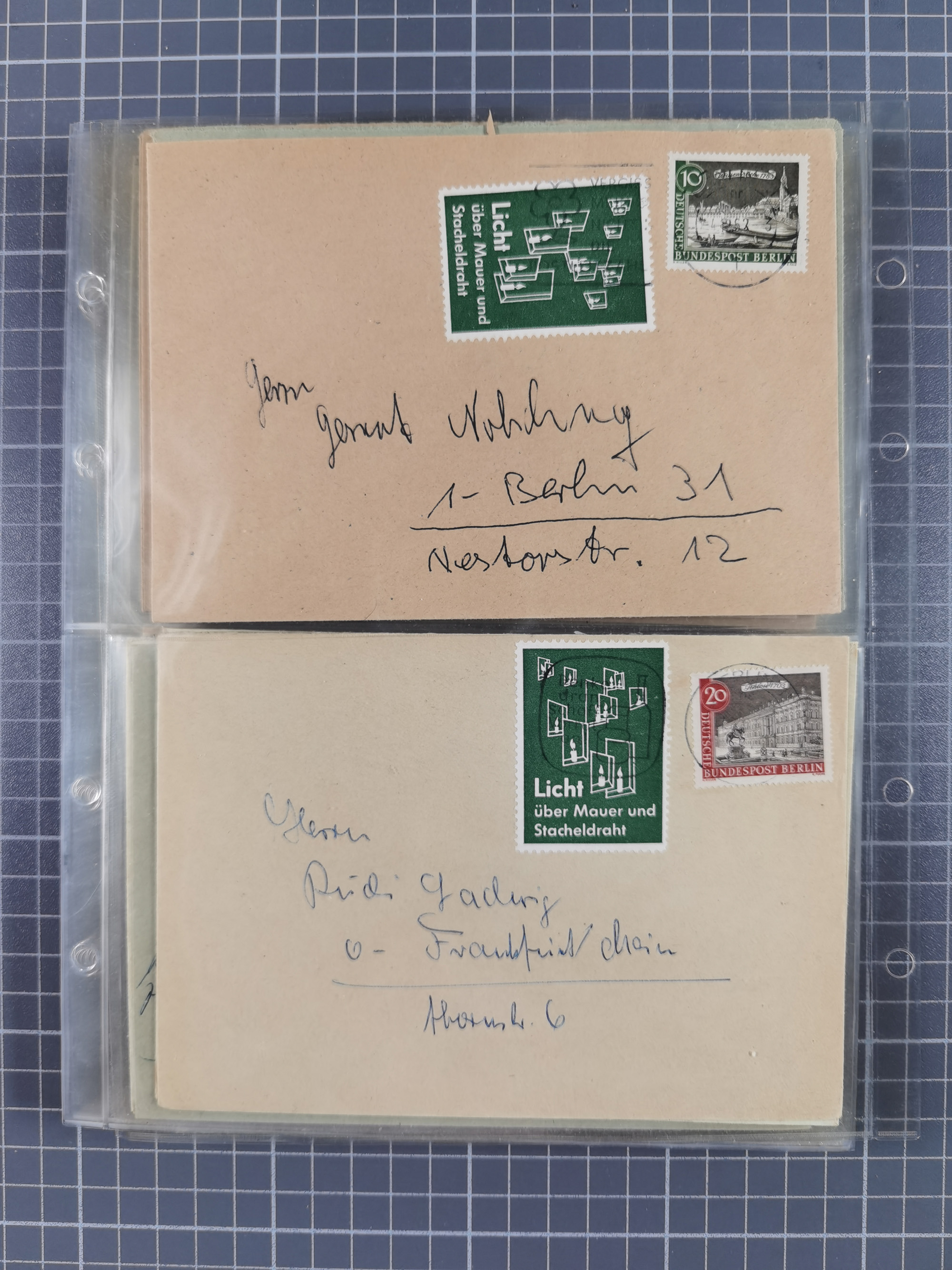 1962/64, Propaganda „Kalter Krieg", Sammlung von 277 Briefen, alle mit Propaganda-Vignetten versehen („Kampf um Wiedervereinigung". 17. Juni", „Die Mauer überwinden", Brücken bauen! Per Post oder Paket". „Wir lassen uns nicht trennen". 3 geteilt niemals!" usw. Alle Vignetten befinden sich auf Bedarfsbriefen und sind postalisch zusammen mit der Normalfrankatur abgestempelt, dabei auch 43 Luftpostbriefe, selten angeboten. Dazu noch 48 Belege Postkrieg".