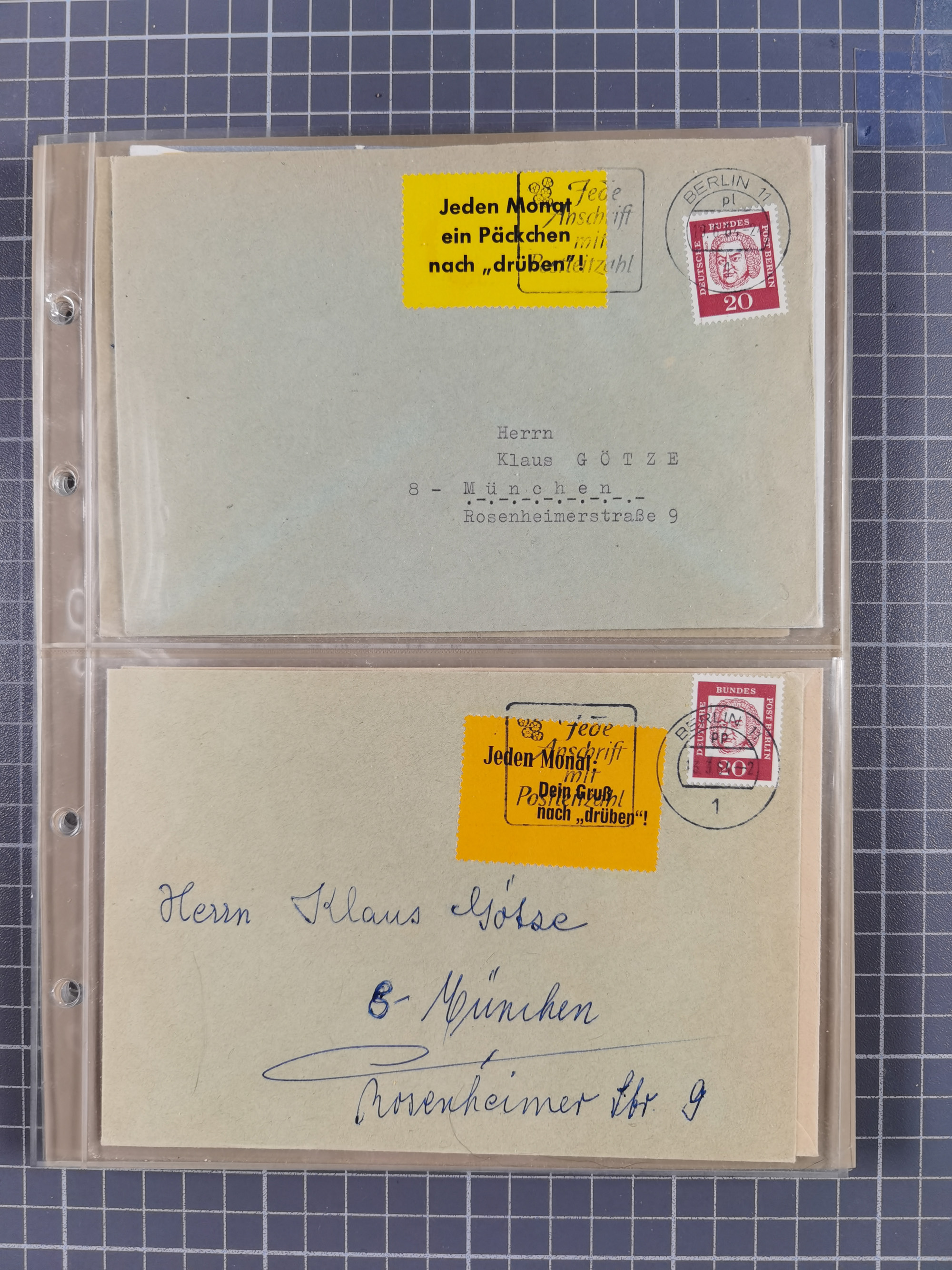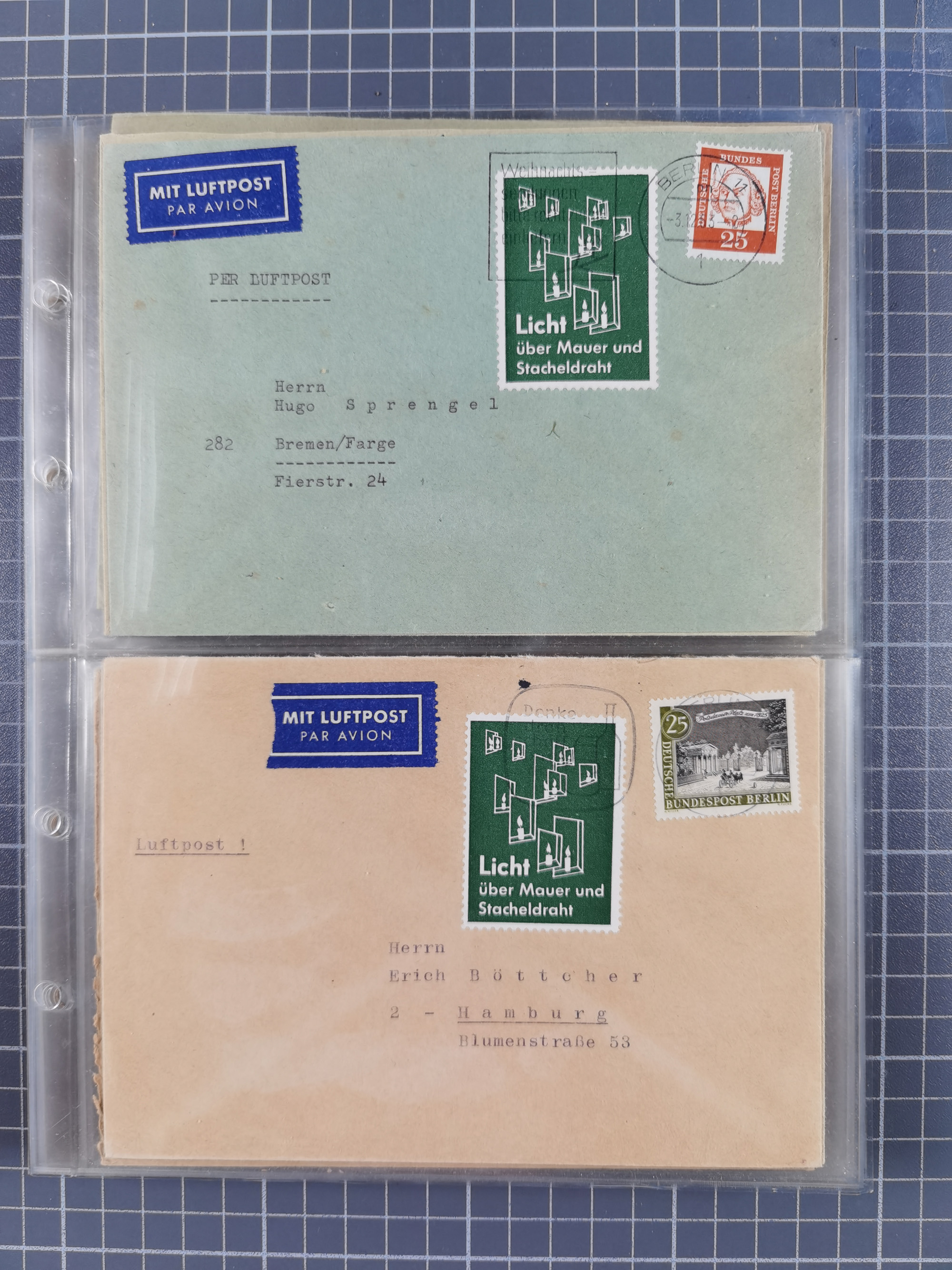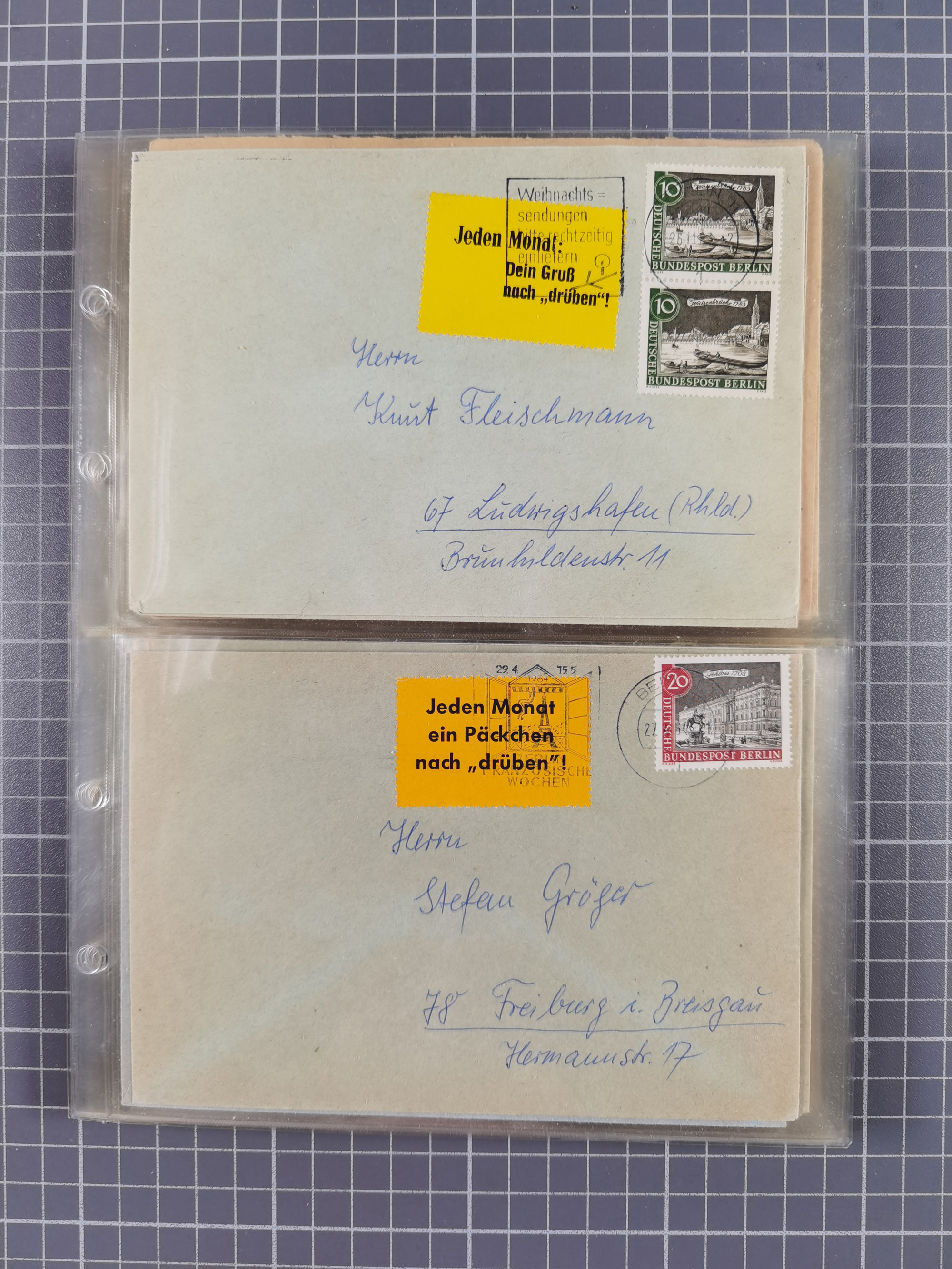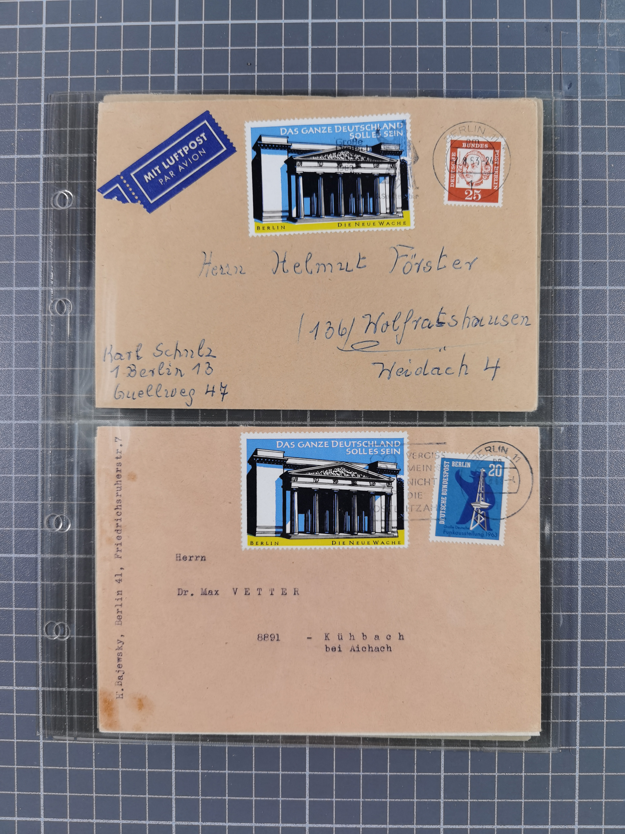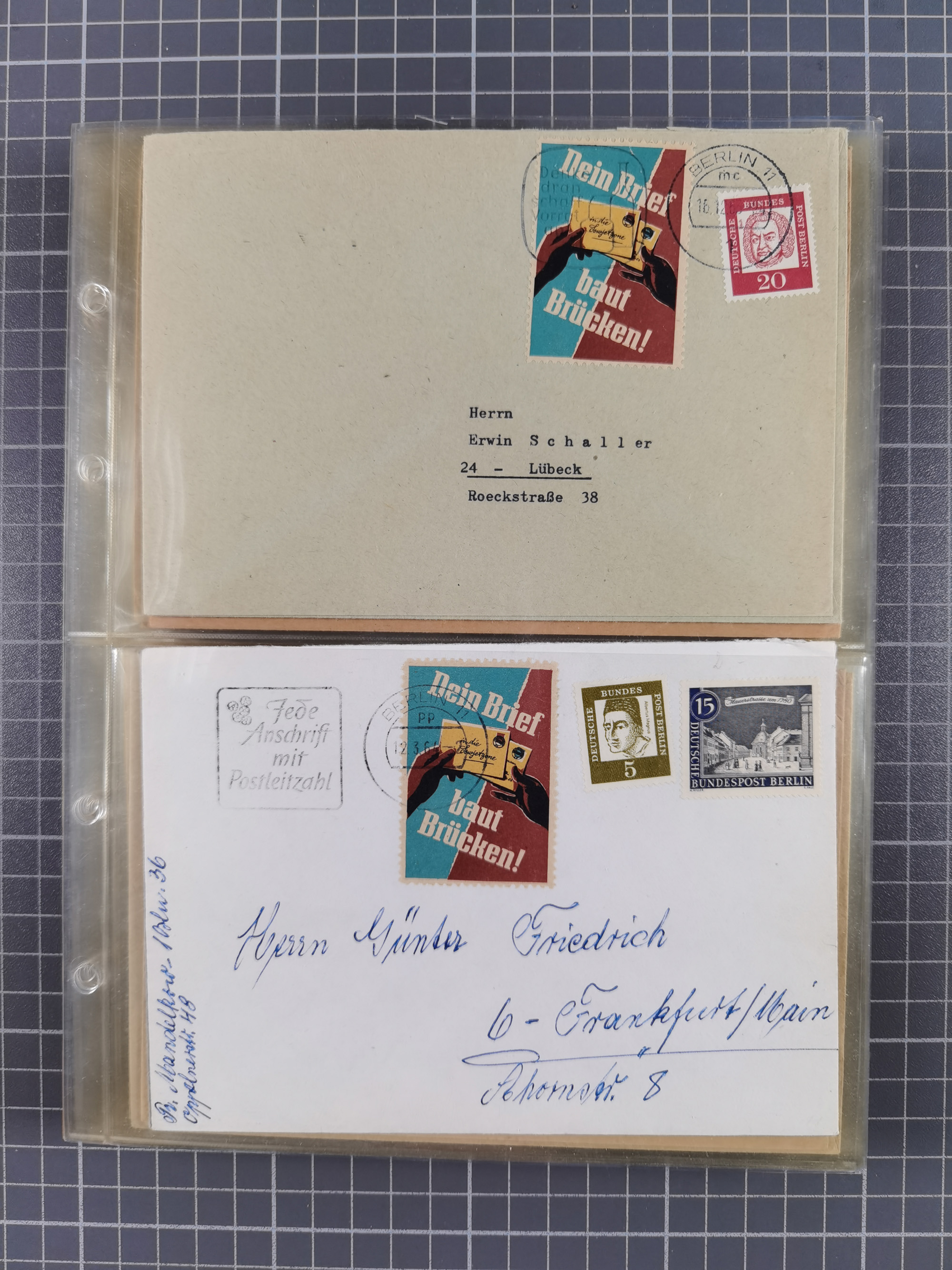 1962/64, Propaganda „Kalter Krieg", Sammlung von 277 Briefen, alle mit Propaganda-Vignetten versehen („Kampf um Wiedervereinigung". 17. Juni", „Die Mauer überwinden", Brücken bauen! Per Post oder Paket". „Wir lassen uns nicht trennen". 3 geteilt niemals!" usw. Alle Vignetten befinden sich auf Bedarfsbriefen und sind postalisch zusammen mit der Normalfrankatur abgestempelt, dabei auch 43 Luftpostbriefe, selten angeboten. Dazu noch 48 Belege Postkrieg".