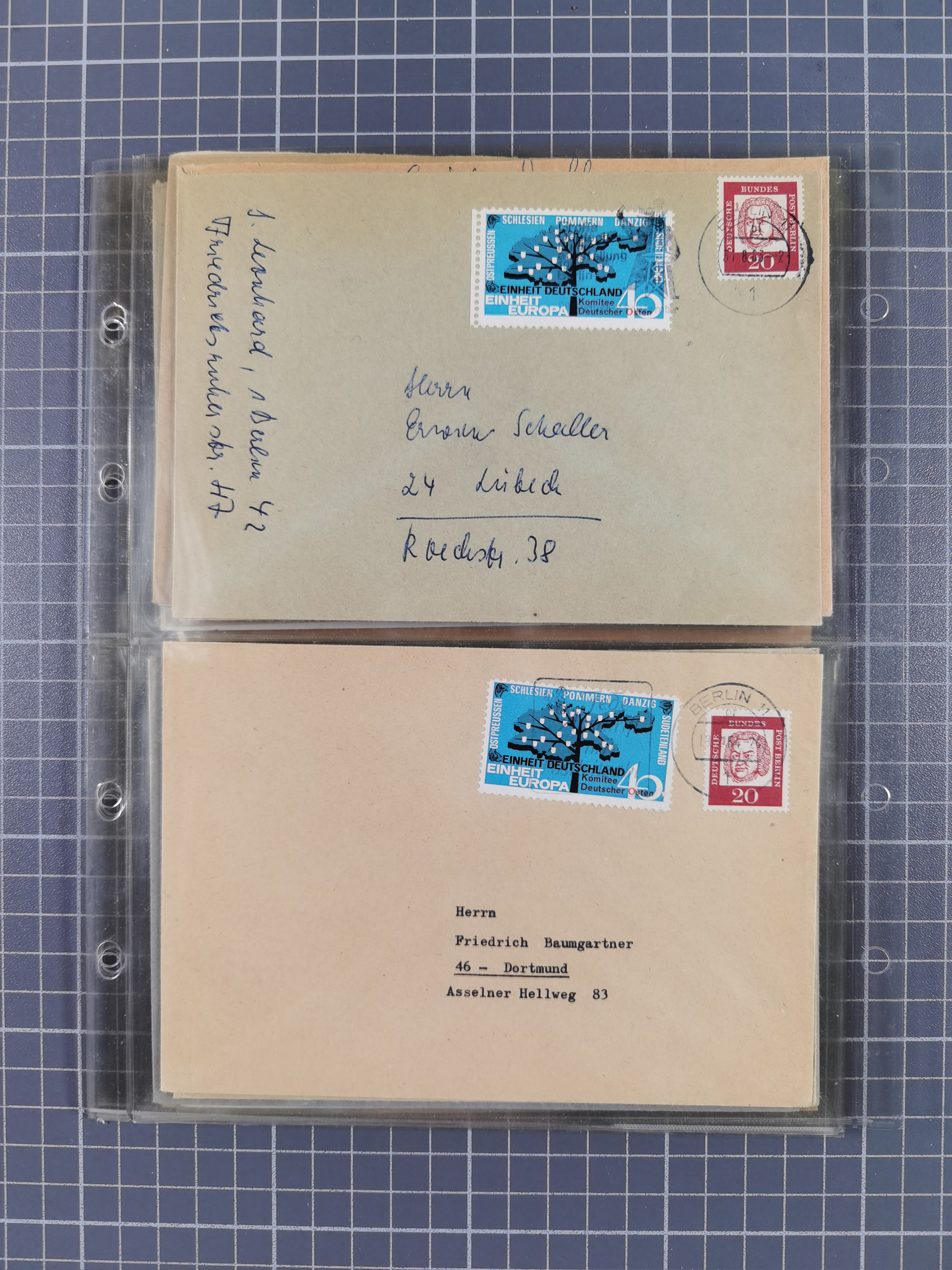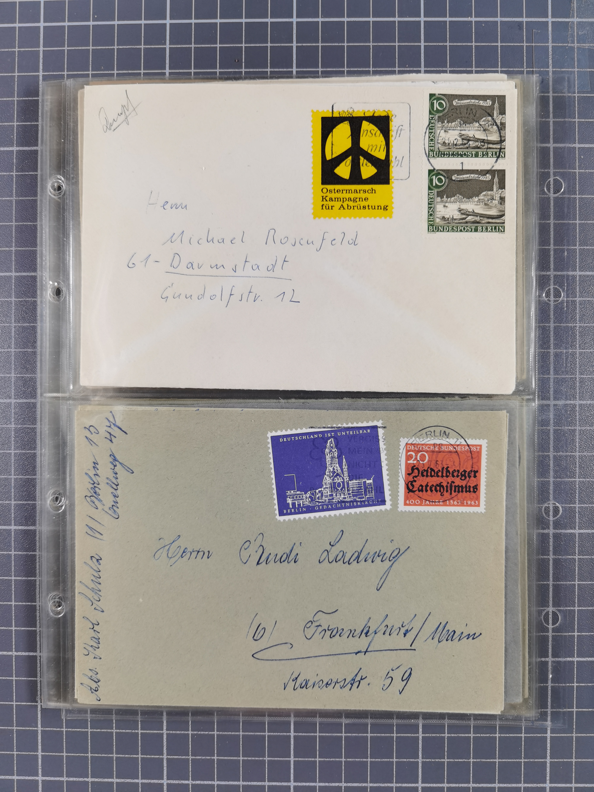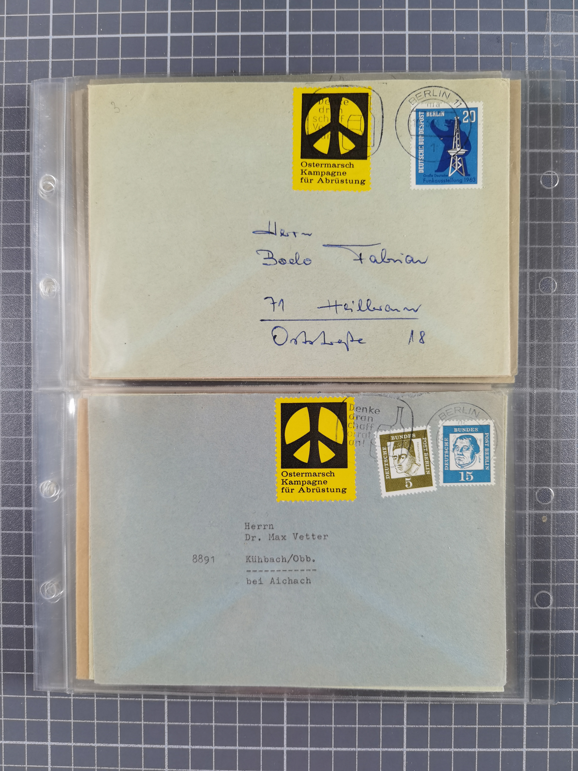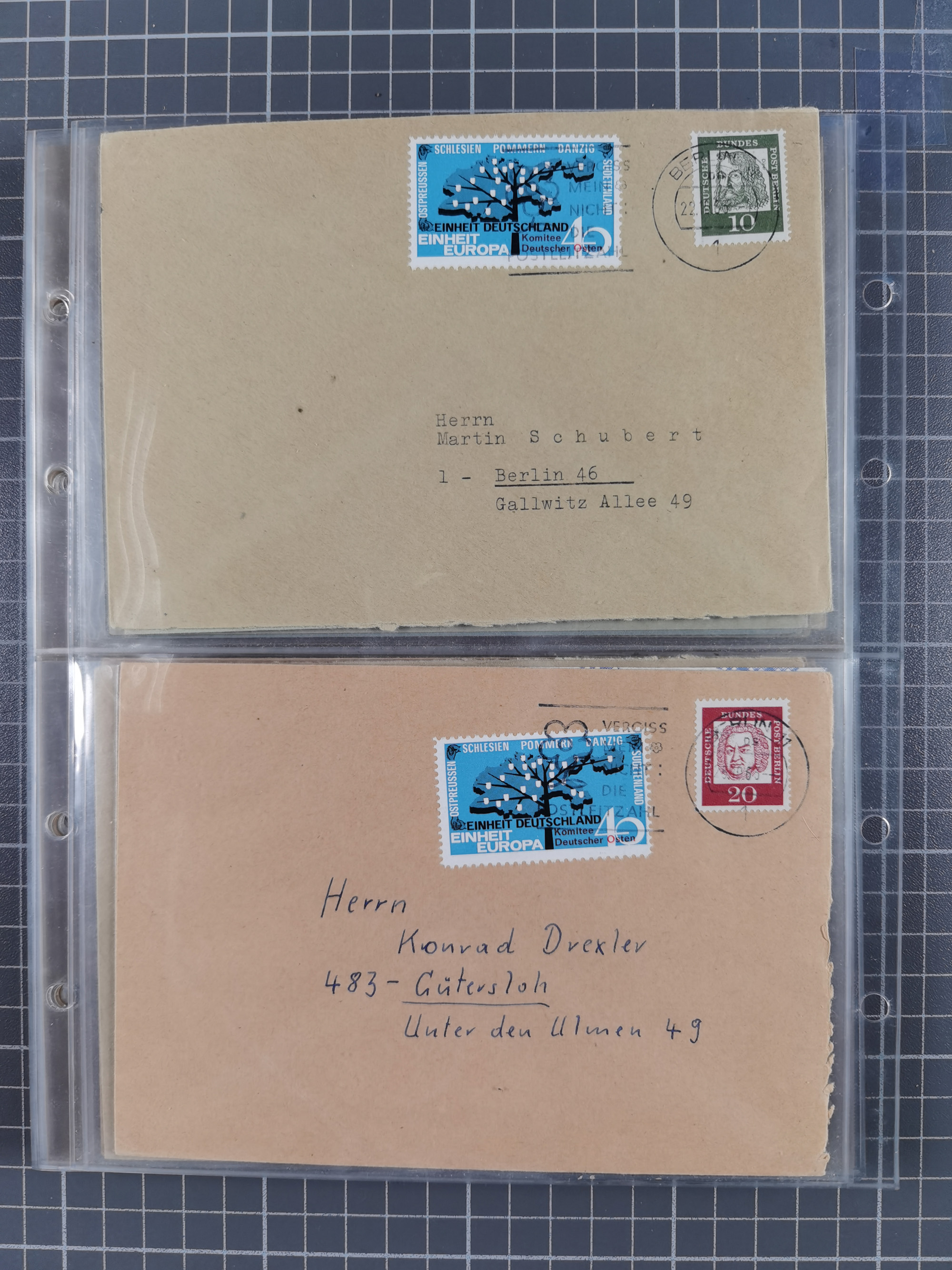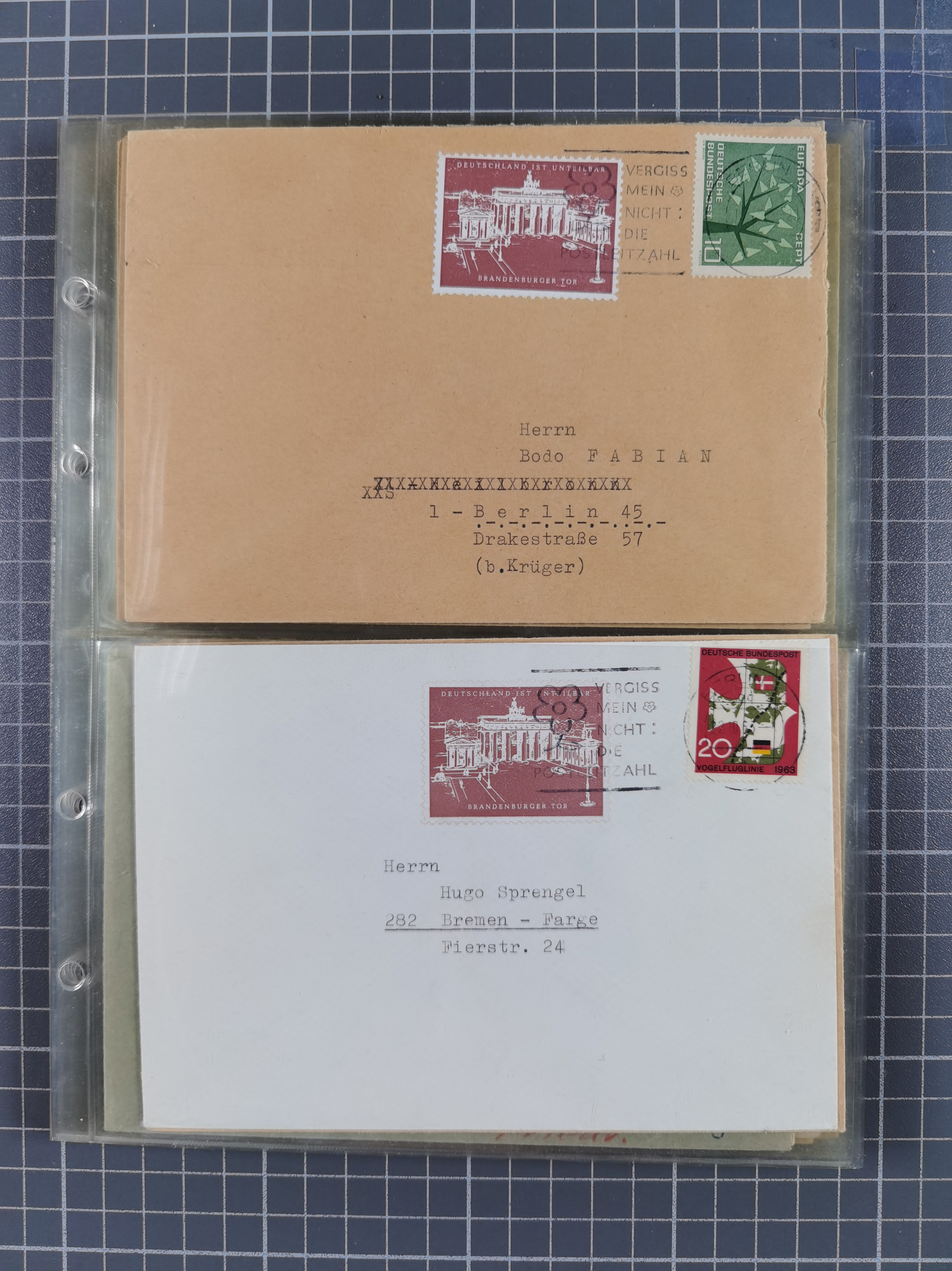 1962/64, Propaganda „Kalter Krieg", Sammlung von 277 Briefen, alle mit Propaganda-Vignetten versehen („Kampf um Wiedervereinigung". 17. Juni", „Die Mauer überwinden", Brücken bauen! Per Post oder Paket". „Wir lassen uns nicht trennen". 3 geteilt niemals!" usw. Alle Vignetten befinden sich auf Bedarfsbriefen und sind postalisch zusammen mit der Normalfrankatur abgestempelt, dabei auch 43 Luftpostbriefe, selten angeboten. Dazu noch 48 Belege Postkrieg".