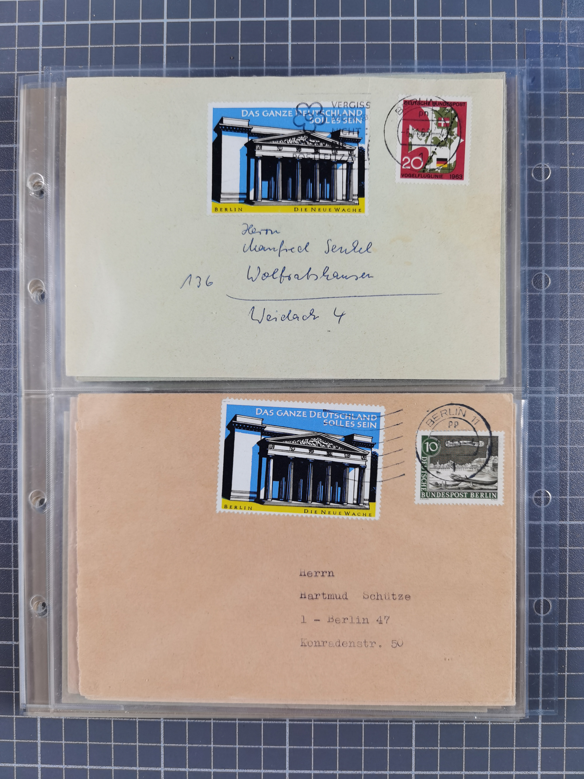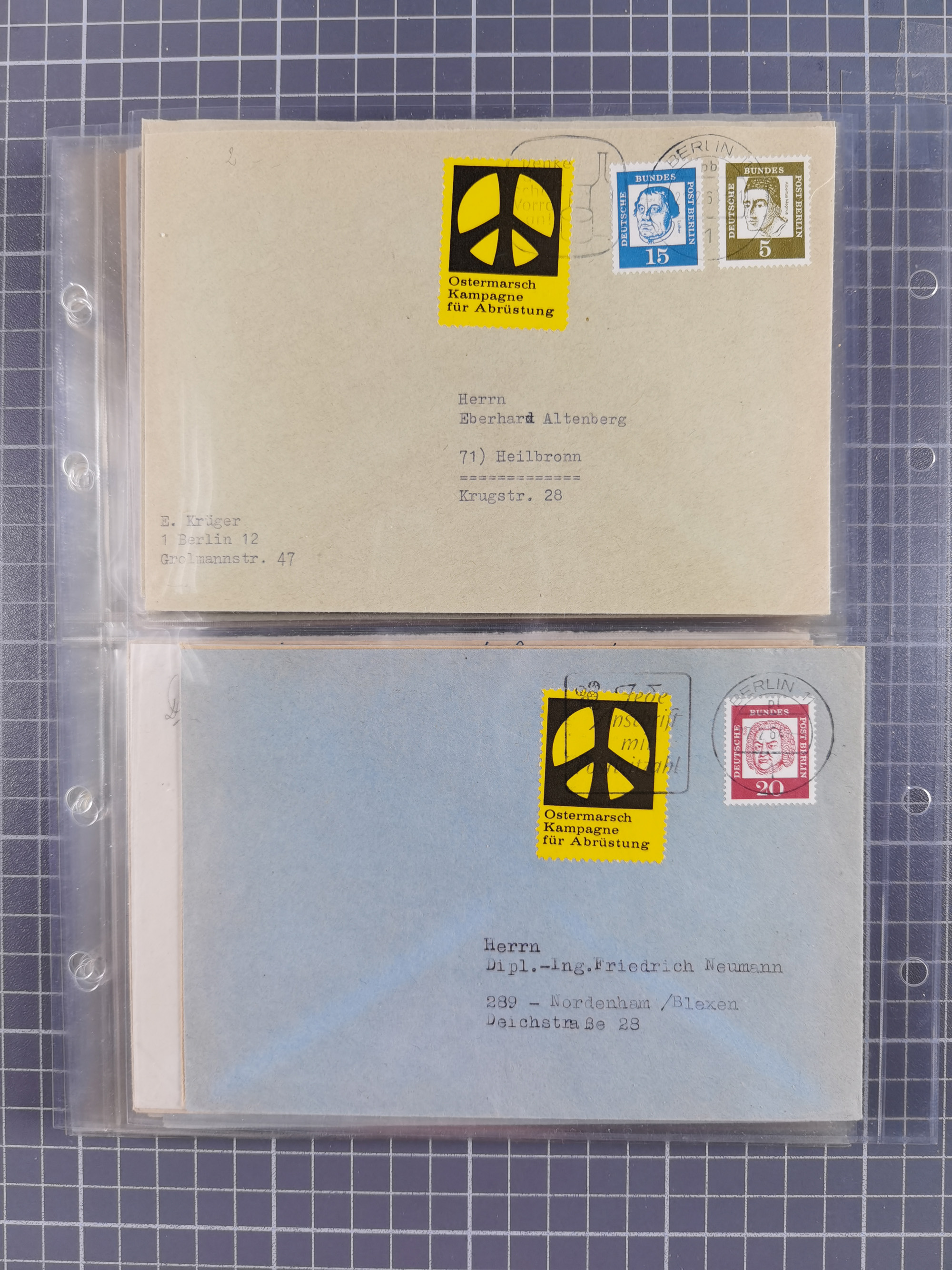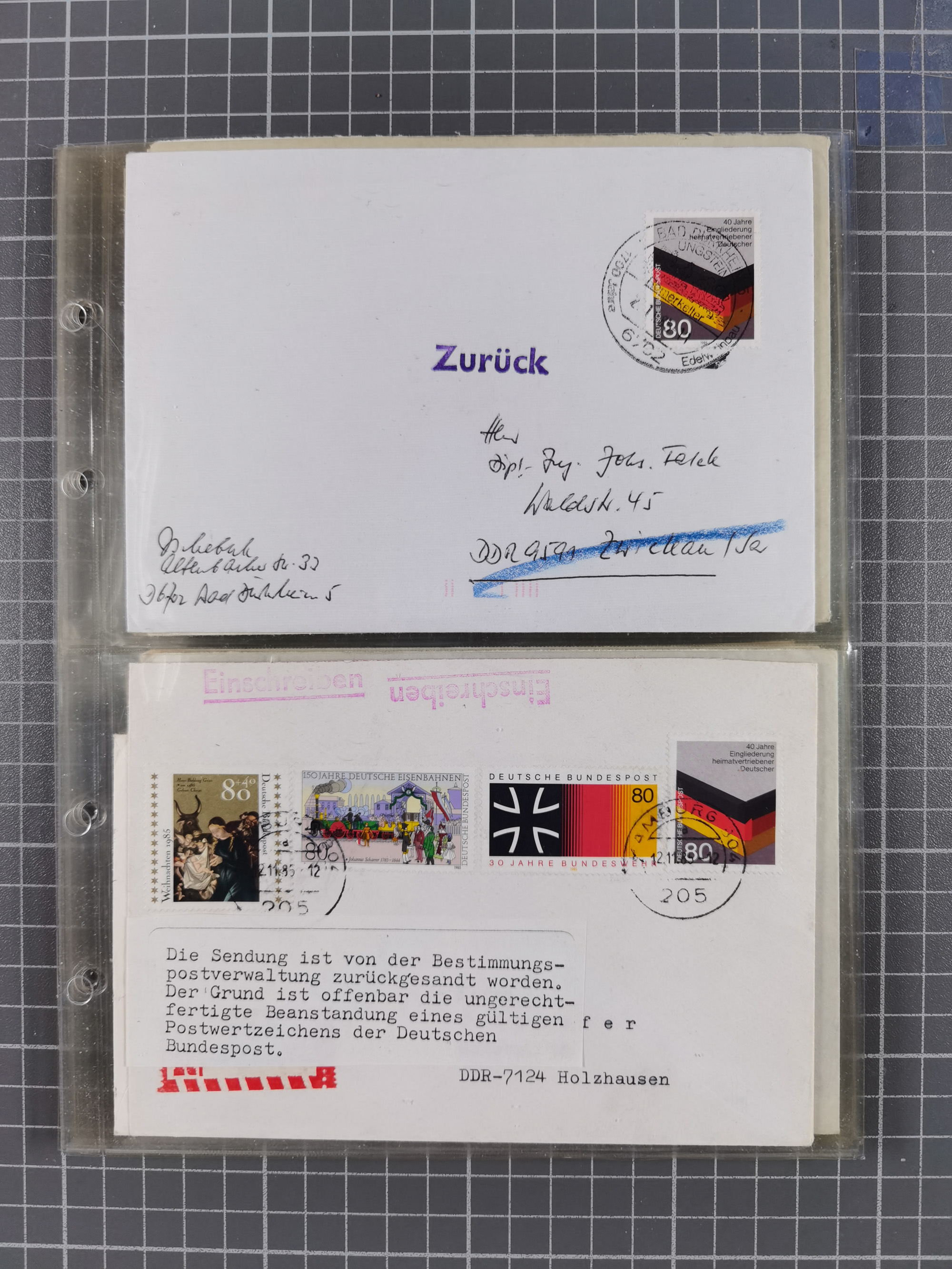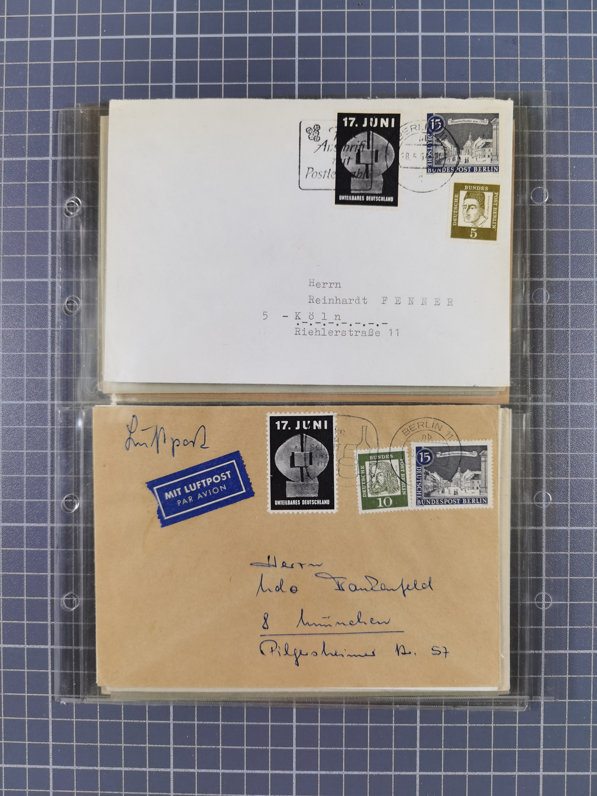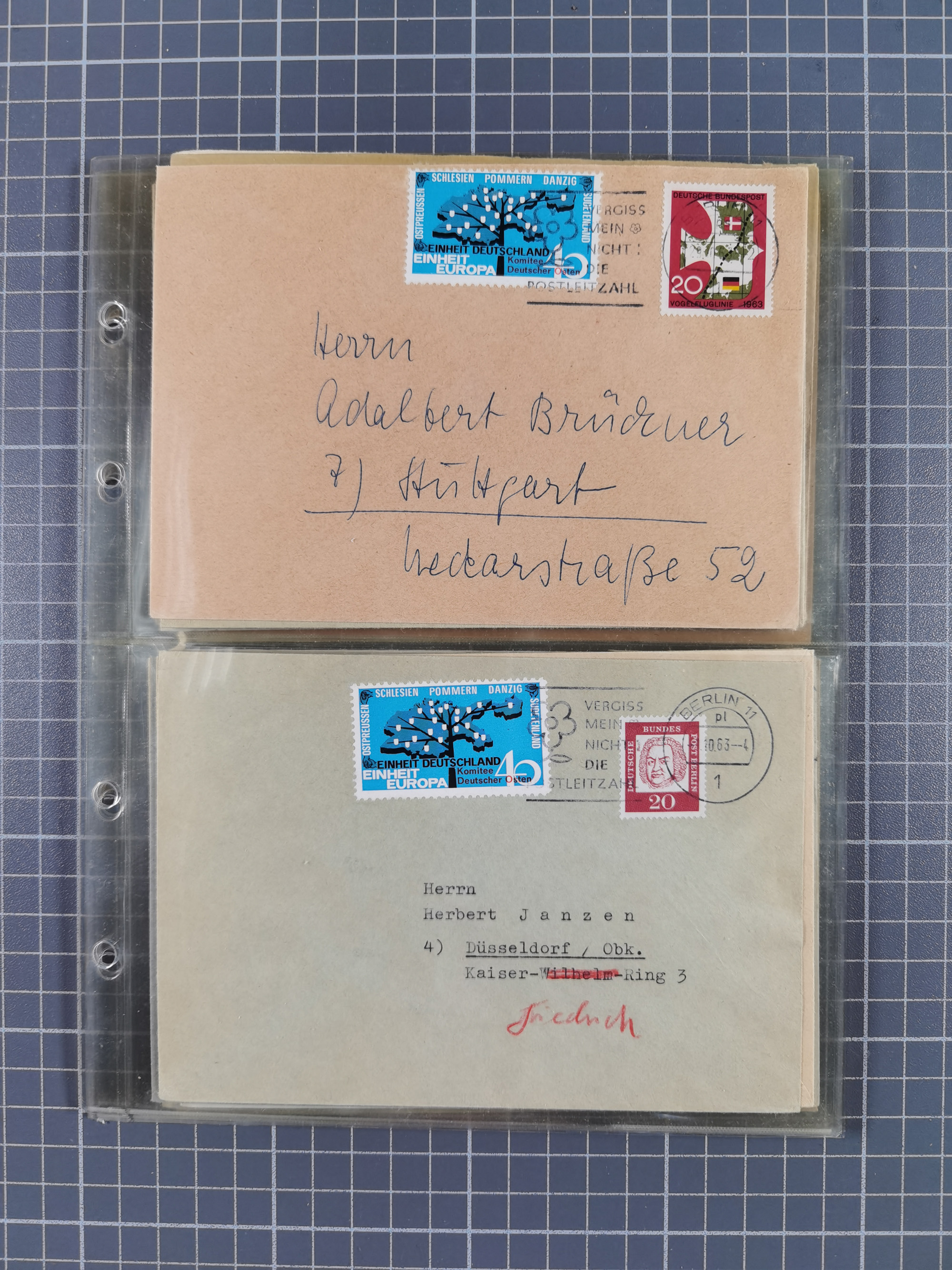 1962/64, Propaganda „Kalter Krieg", Sammlung von 277 Briefen, alle mit Propaganda-Vignetten versehen („Kampf um Wiedervereinigung". 17. Juni", „Die Mauer überwinden", Brücken bauen! Per Post oder Paket". „Wir lassen uns nicht trennen". 3 geteilt niemals!" usw. Alle Vignetten befinden sich auf Bedarfsbriefen und sind postalisch zusammen mit der Normalfrankatur abgestempelt, dabei auch 43 Luftpostbriefe, selten angeboten. Dazu noch 48 Belege Postkrieg".