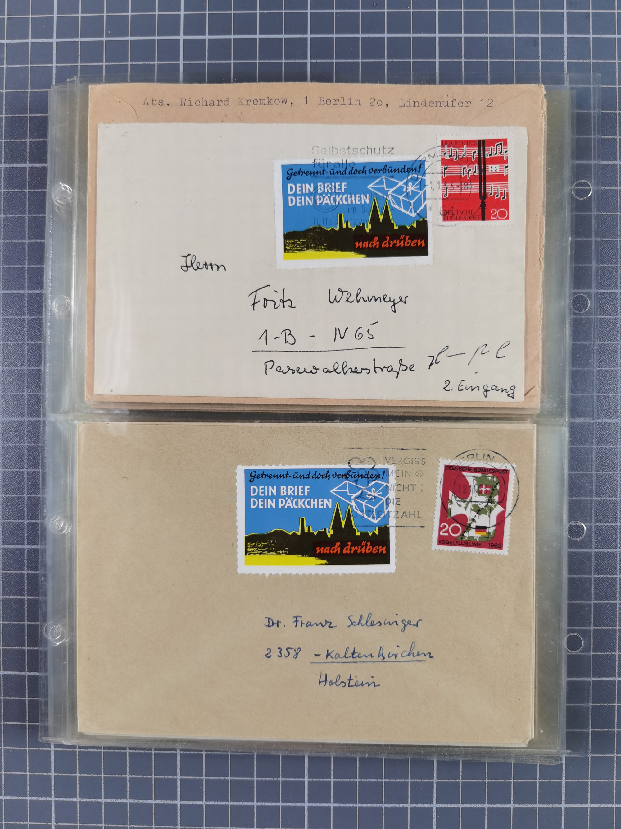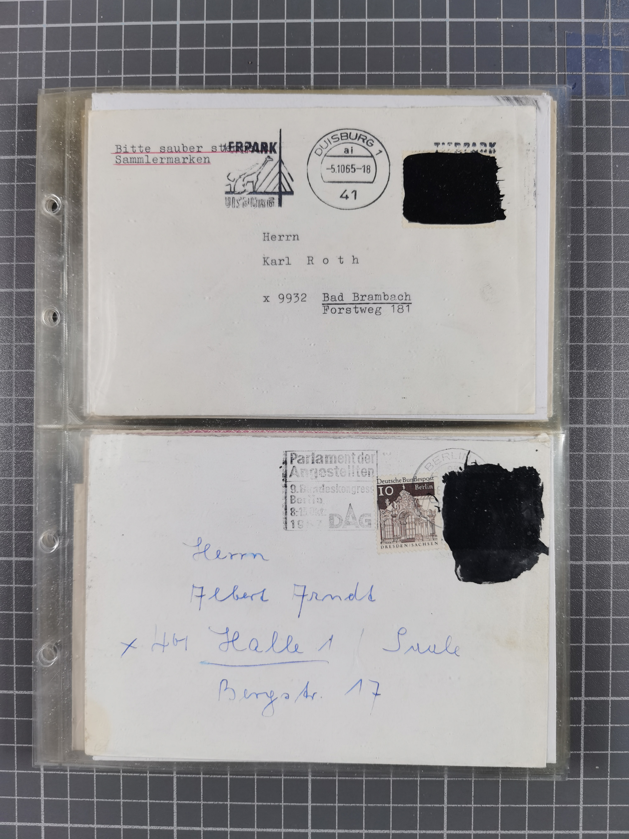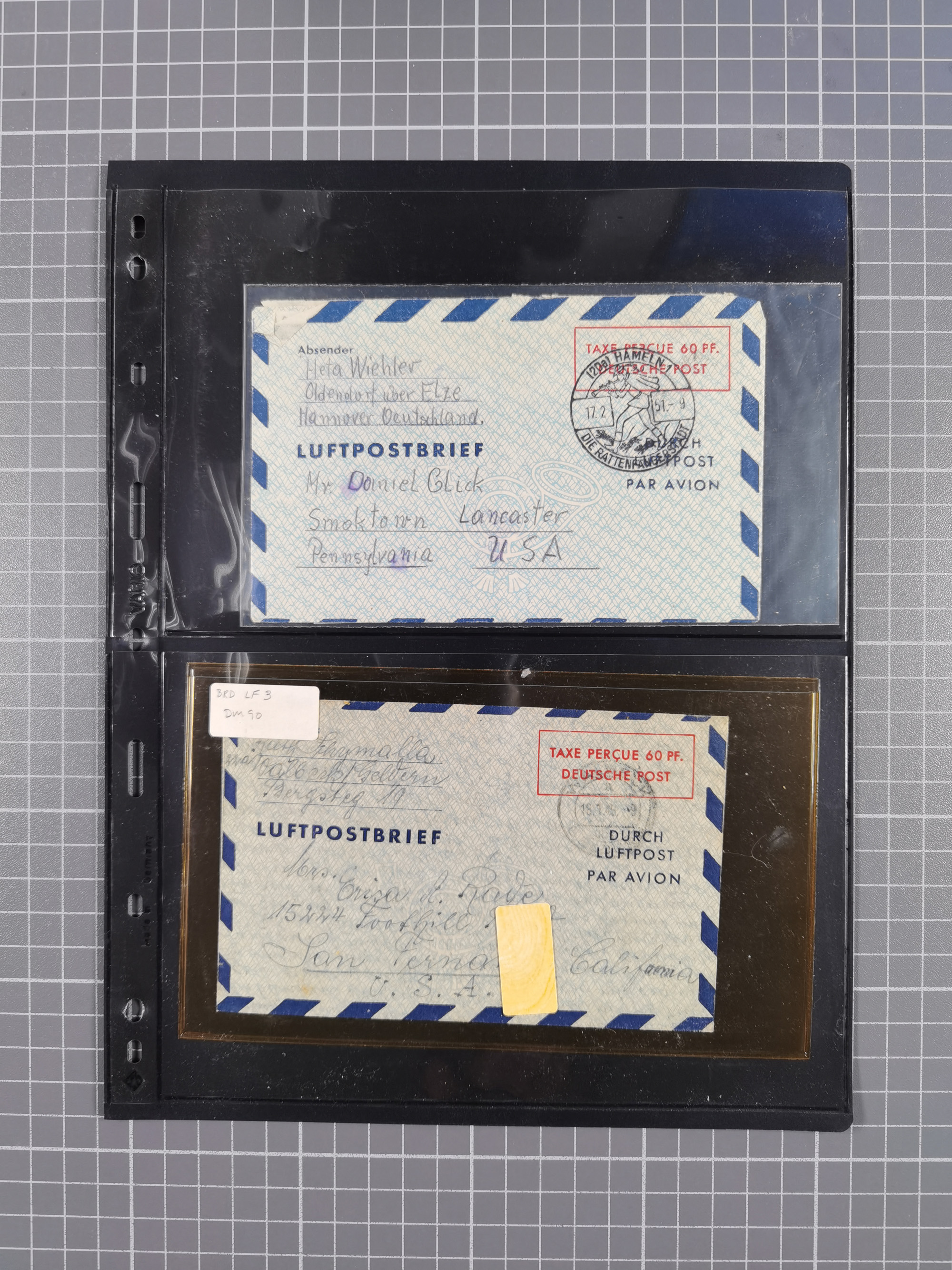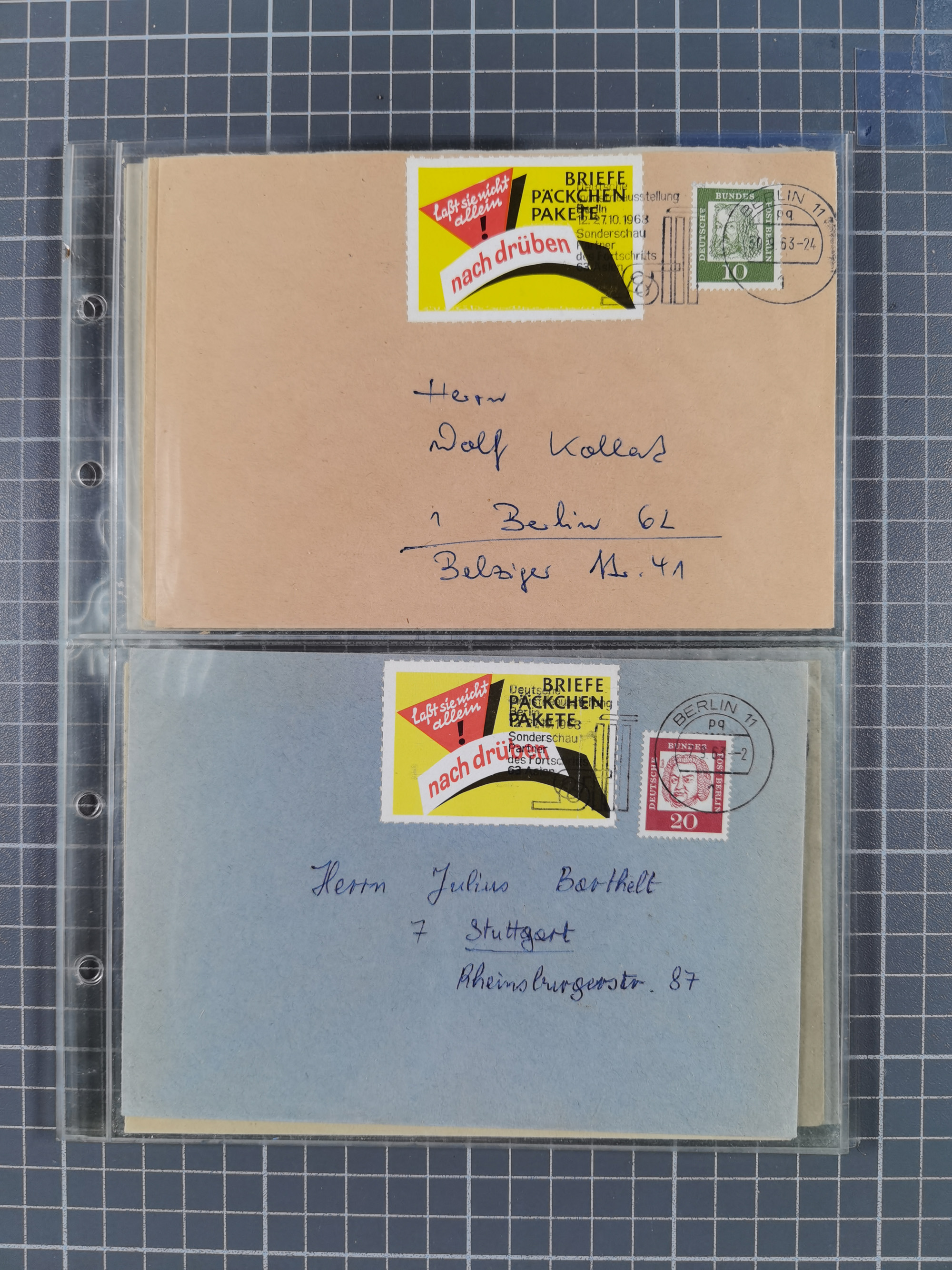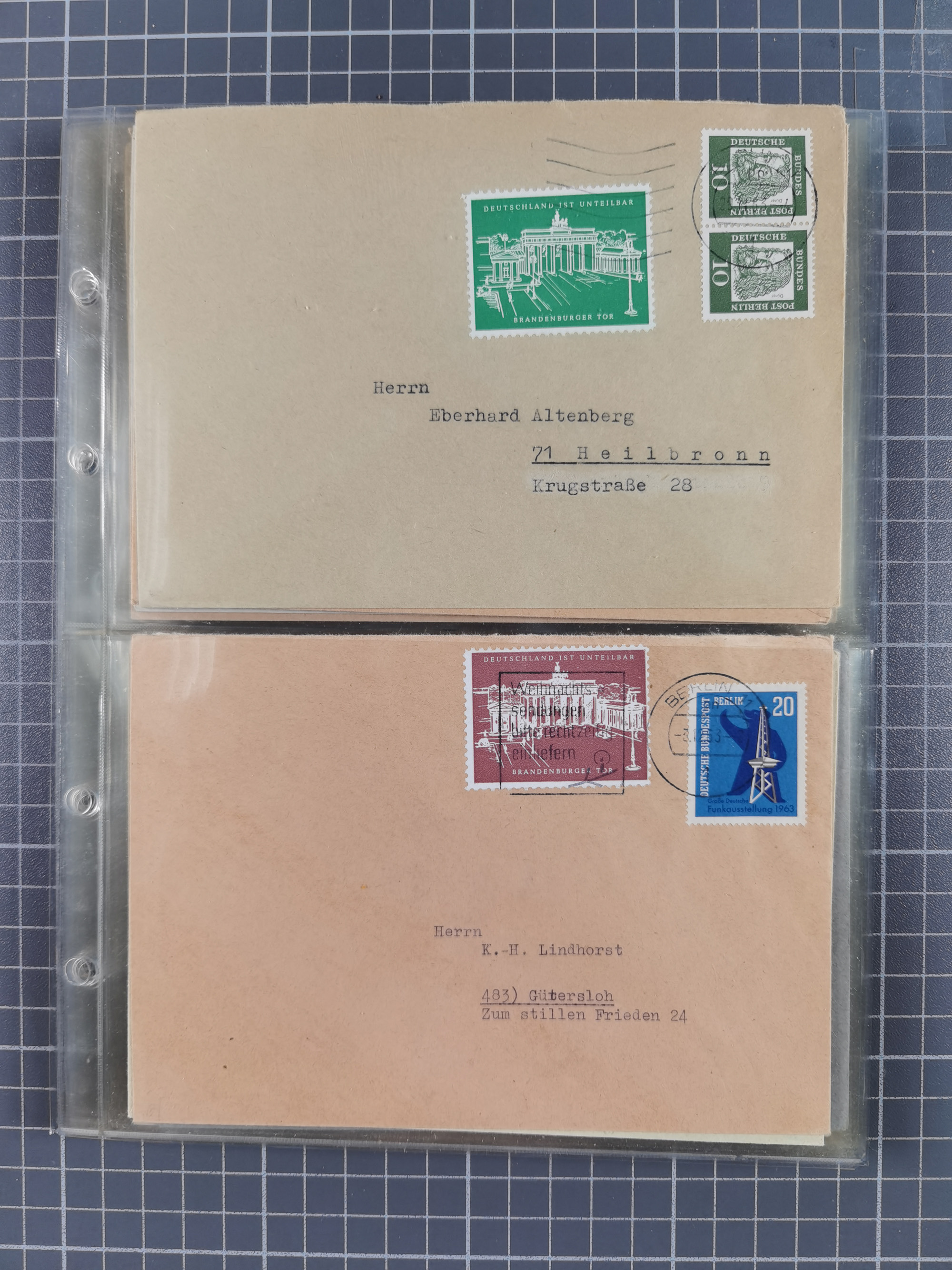 1962/64, Propaganda „Kalter Krieg", Sammlung von 277 Briefen, alle mit Propaganda-Vignetten versehen („Kampf um Wiedervereinigung". 17. Juni", „Die Mauer überwinden", Brücken bauen! Per Post oder Paket". „Wir lassen uns nicht trennen". 3 geteilt niemals!" usw. Alle Vignetten befinden sich auf Bedarfsbriefen und sind postalisch zusammen mit der Normalfrankatur abgestempelt, dabei auch 43 Luftpostbriefe, selten angeboten. Dazu noch 48 Belege Postkrieg".