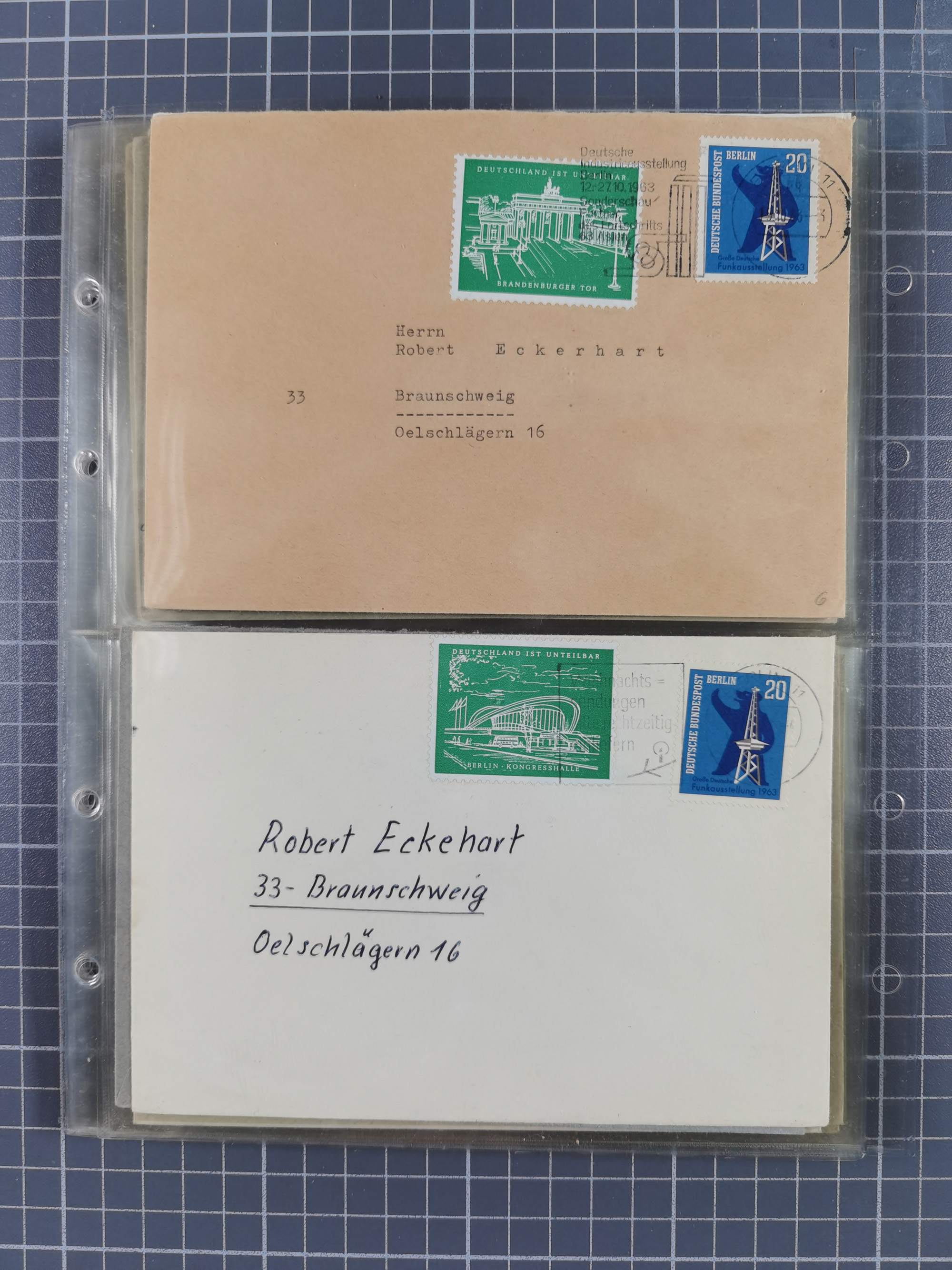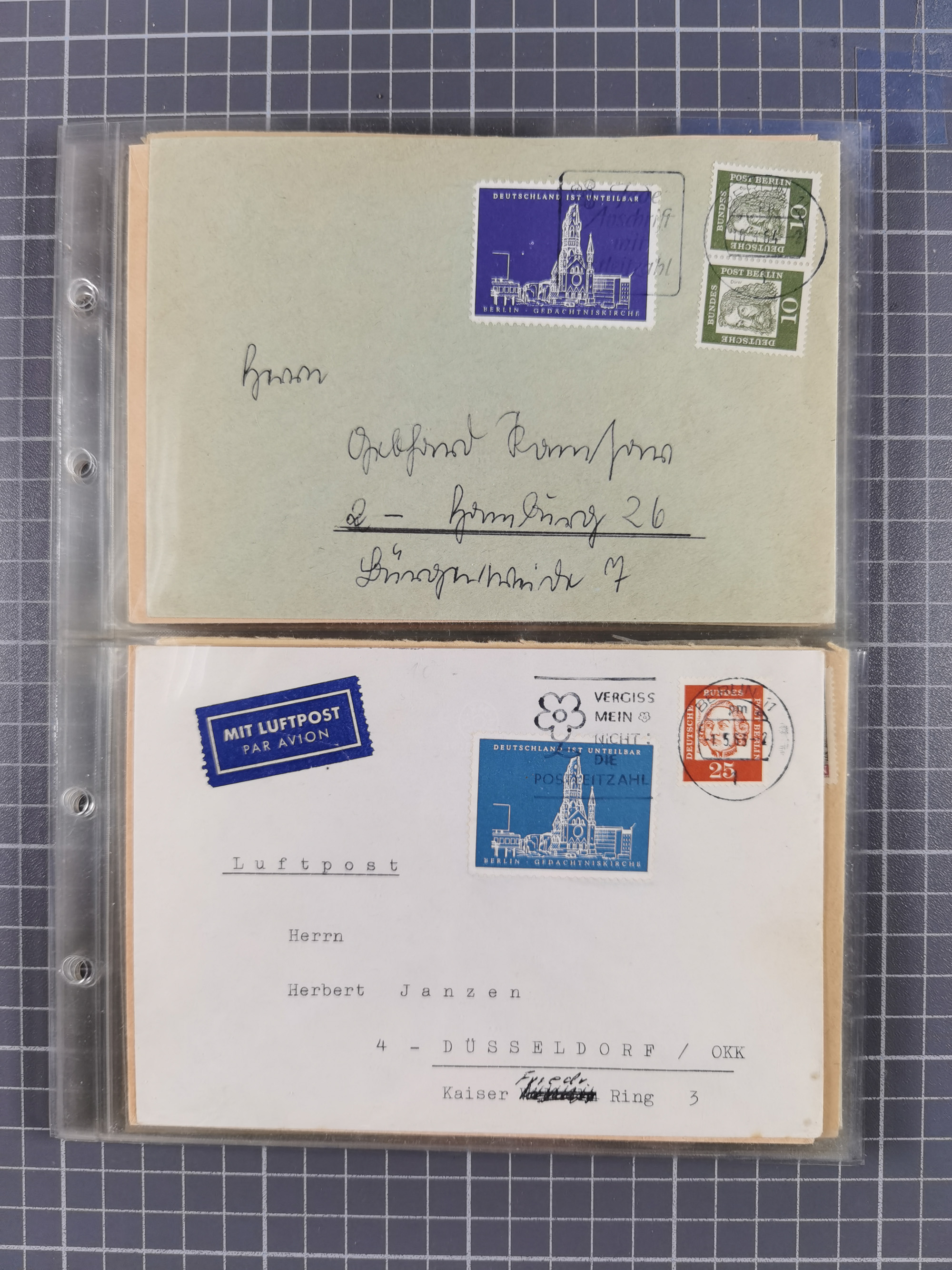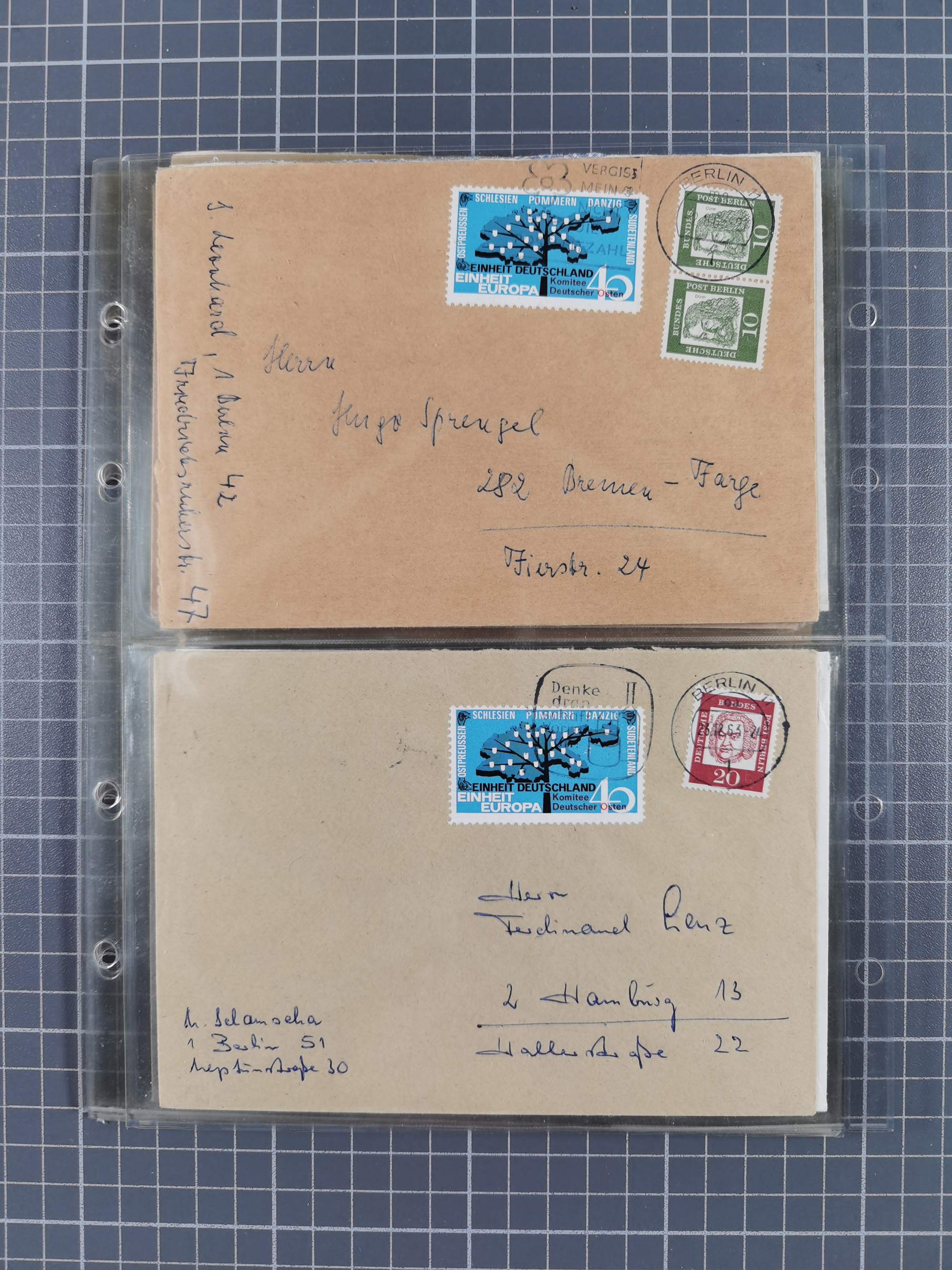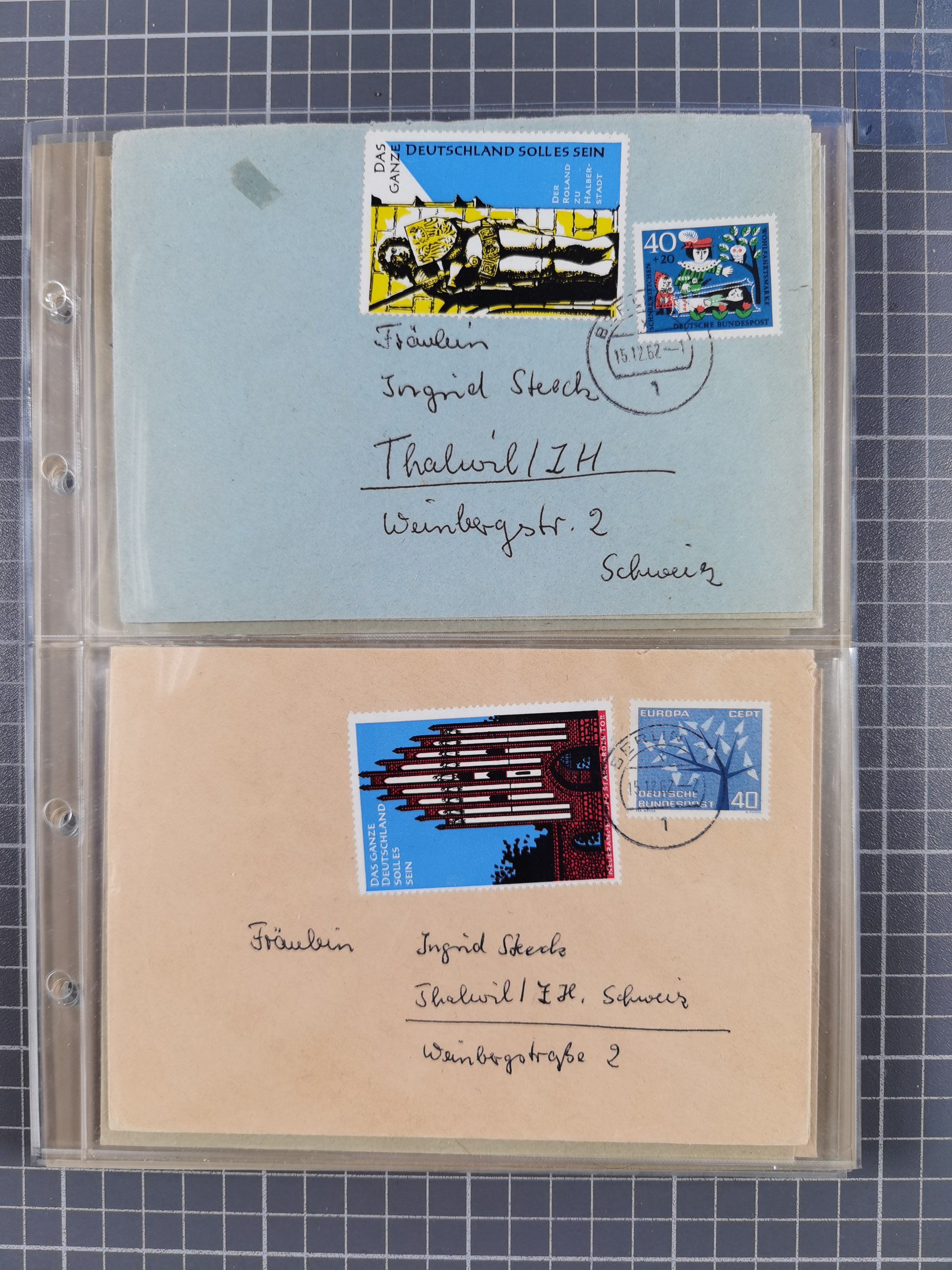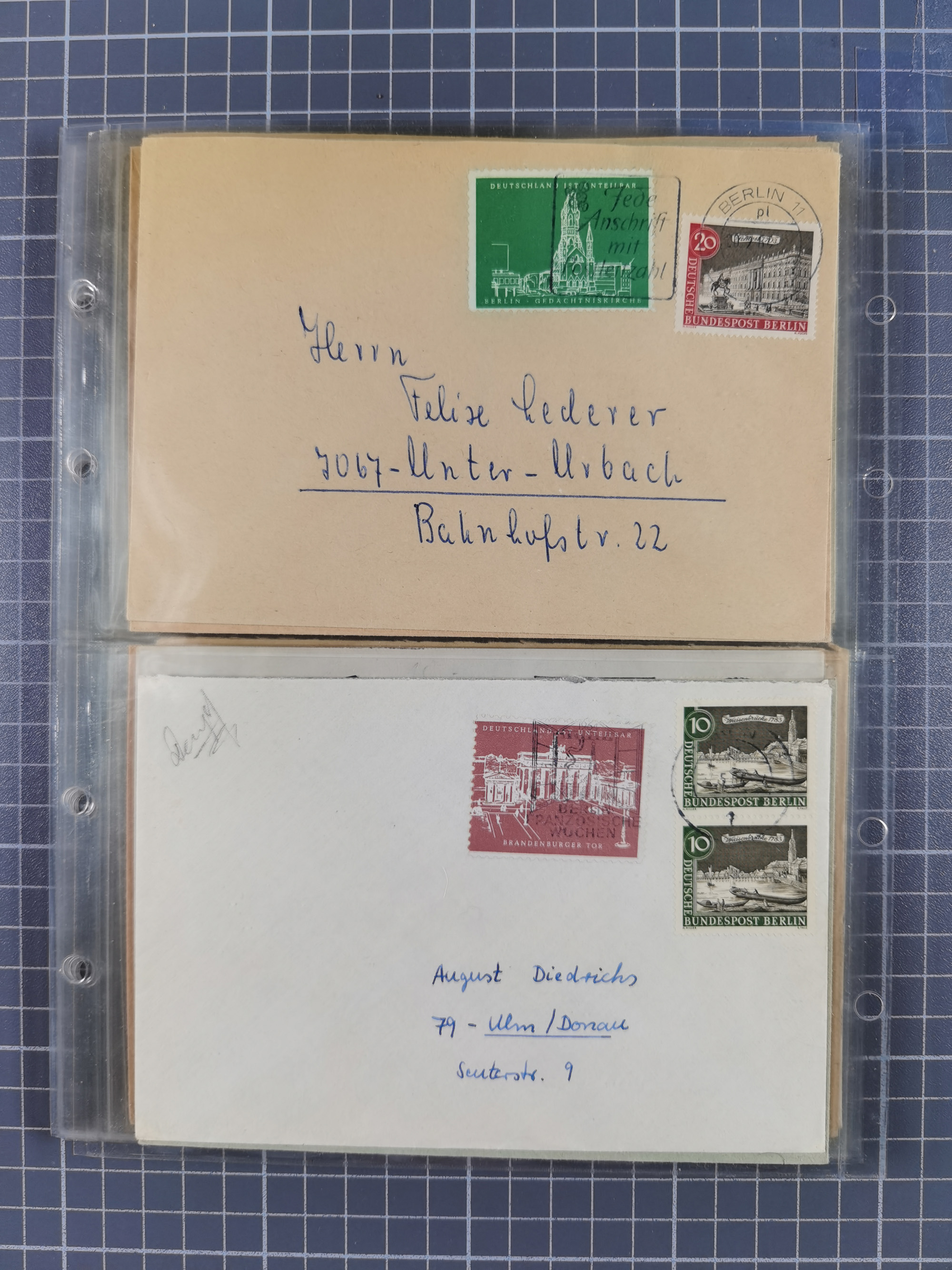 1962/64, Propaganda „Kalter Krieg", Sammlung von 277 Briefen, alle mit Propaganda-Vignetten versehen („Kampf um Wiedervereinigung". 17. Juni", „Die Mauer überwinden", Brücken bauen! Per Post oder Paket". „Wir lassen uns nicht trennen". 3 geteilt niemals!" usw. Alle Vignetten befinden sich auf Bedarfsbriefen und sind postalisch zusammen mit der Normalfrankatur abgestempelt, dabei auch 43 Luftpostbriefe, selten angeboten. Dazu noch 48 Belege Postkrieg".