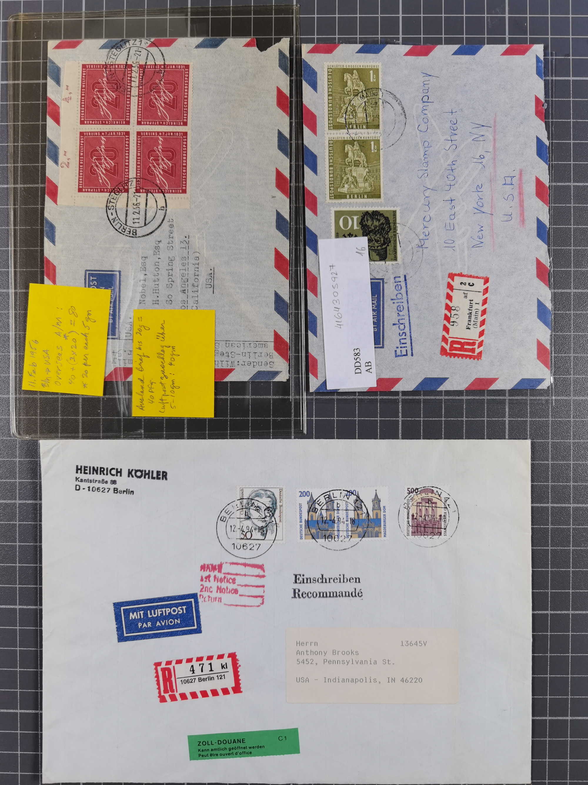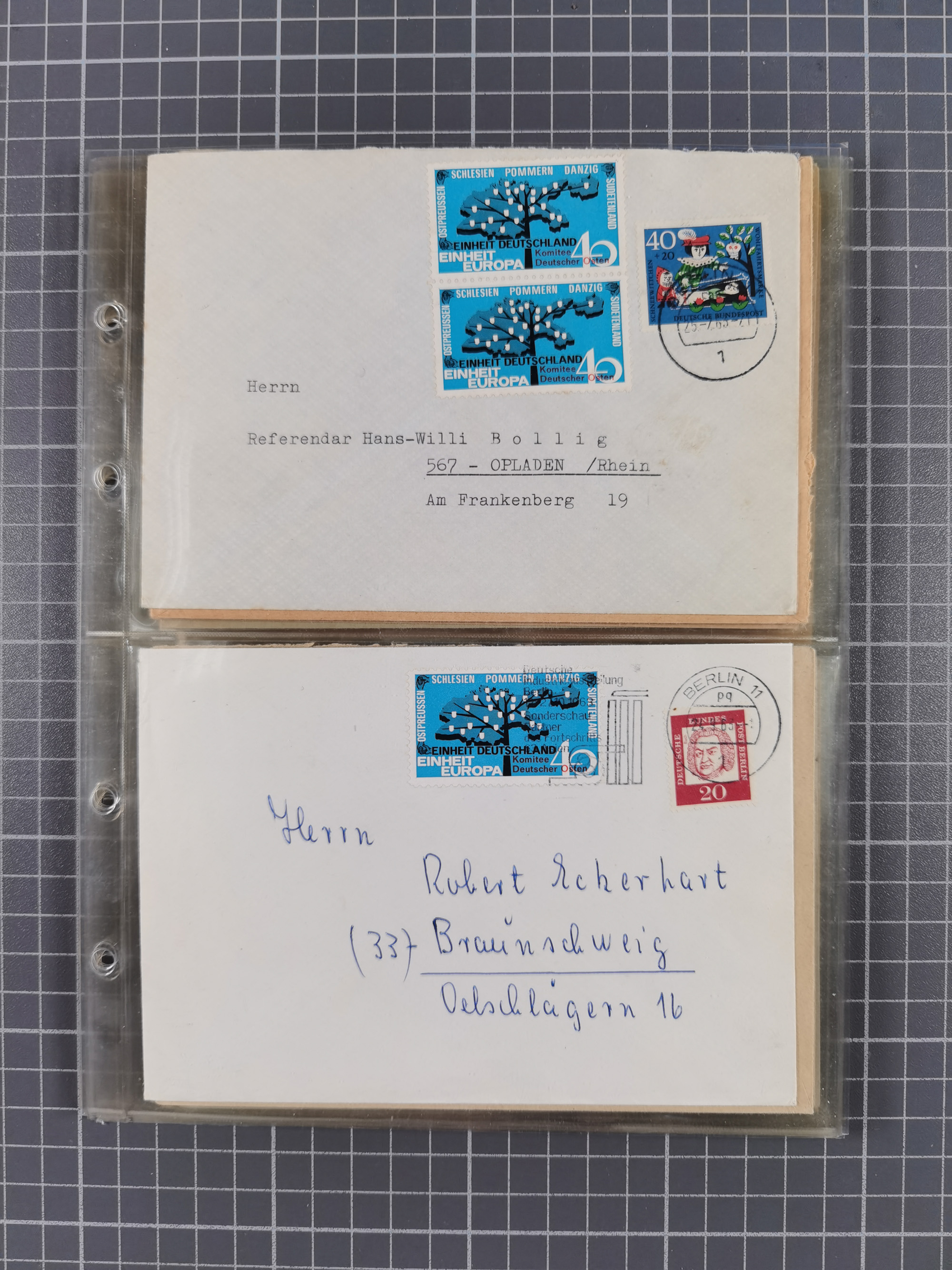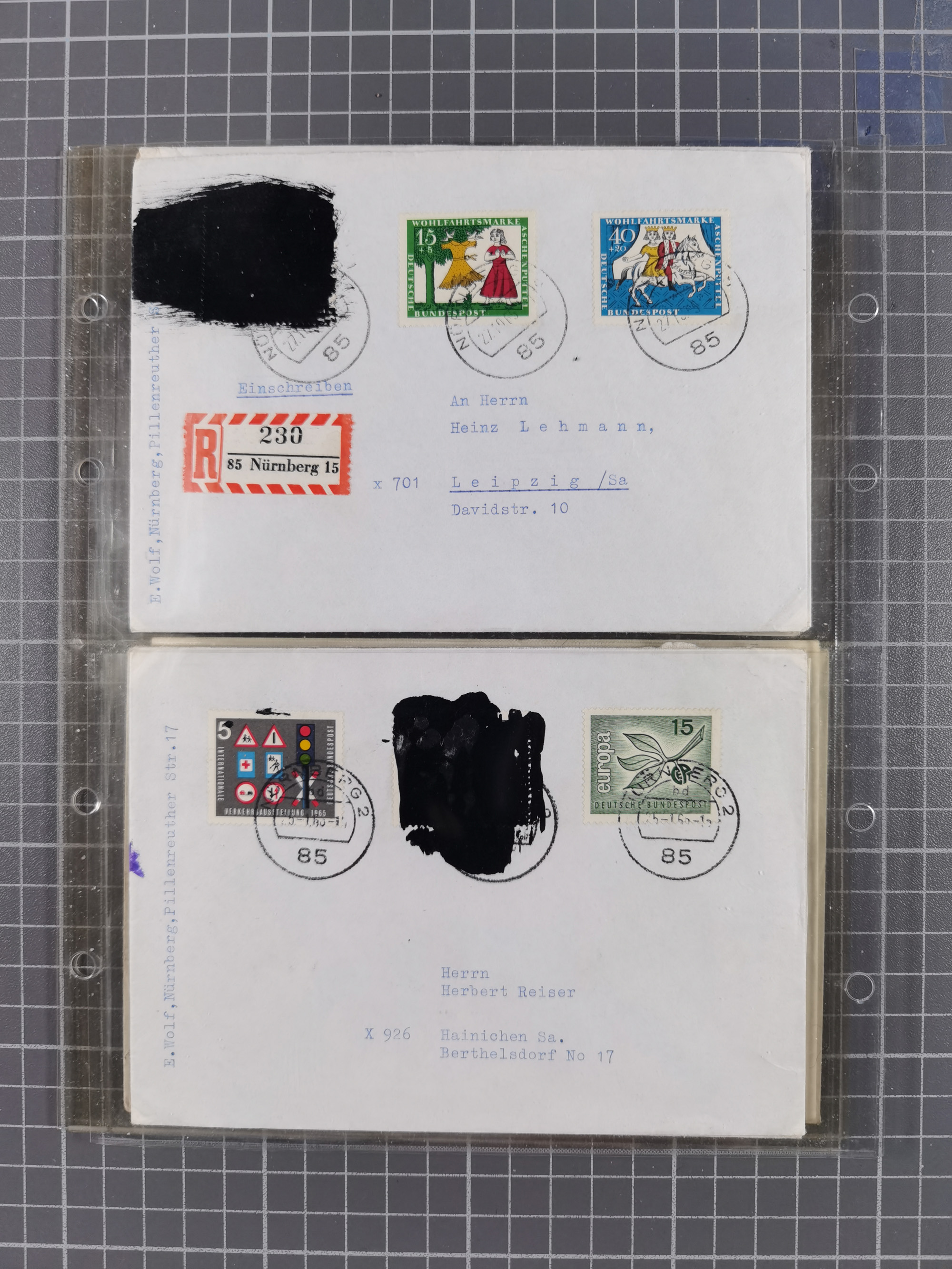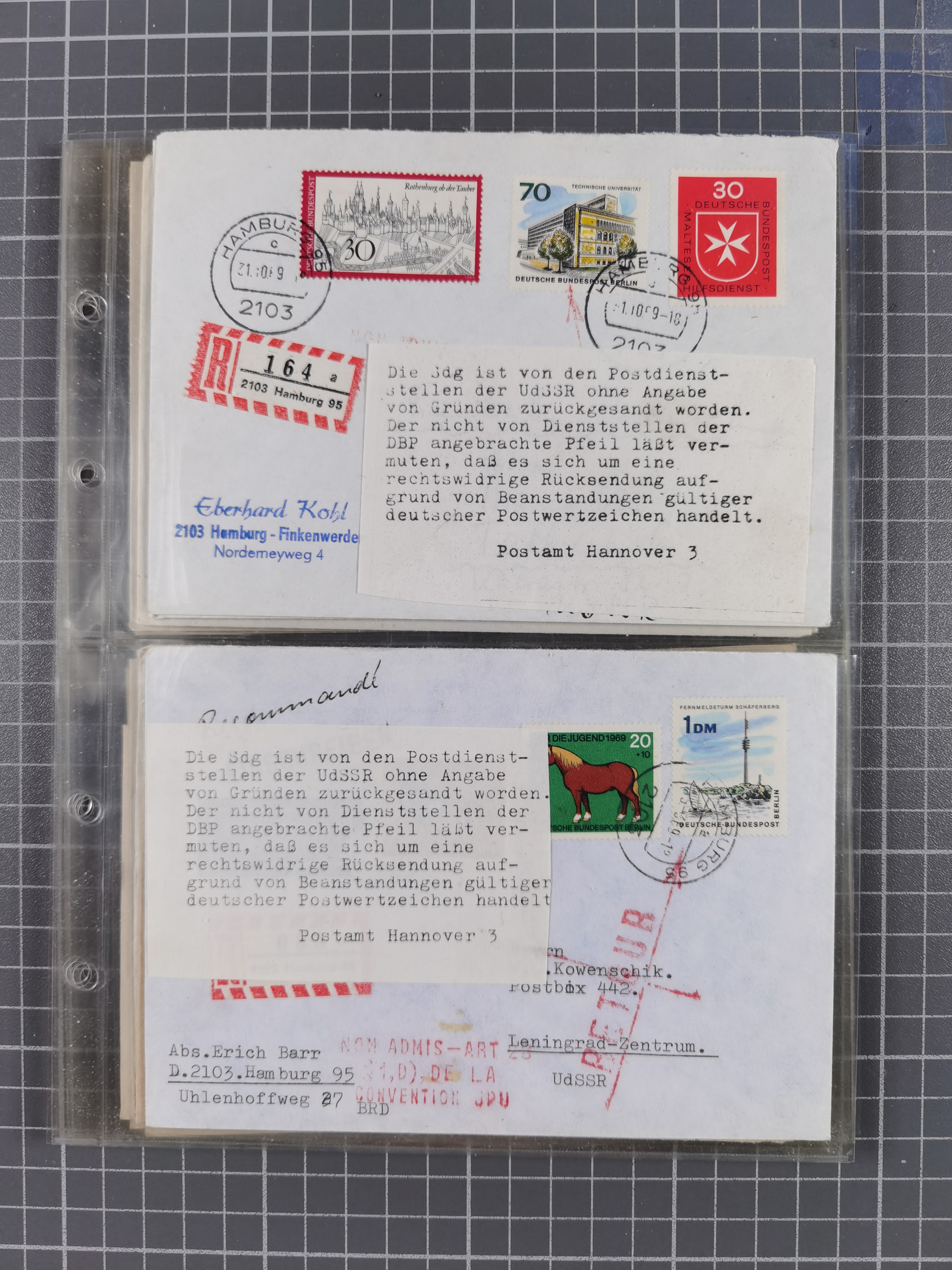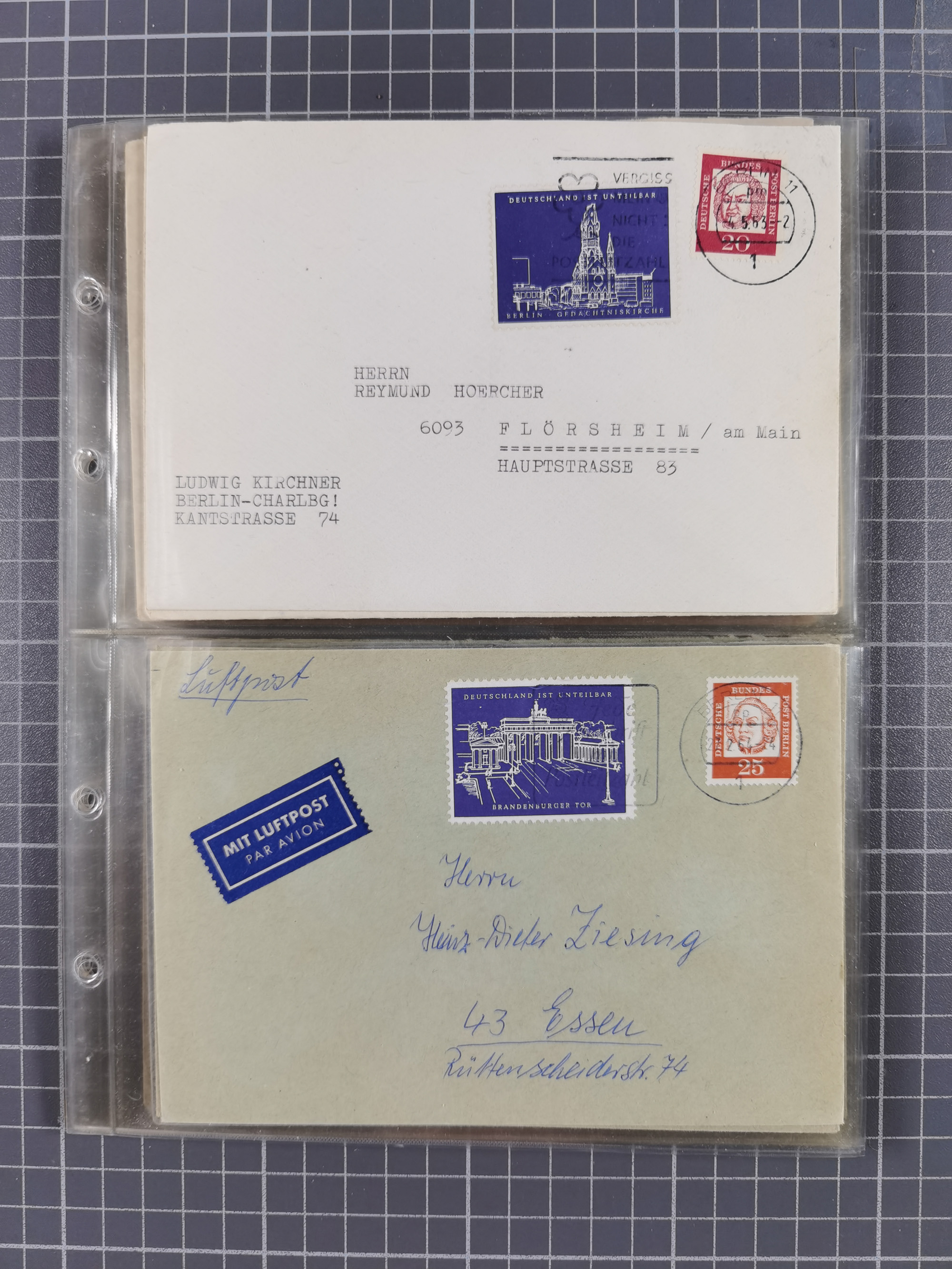 1962/64, Propaganda „Kalter Krieg", Sammlung von 277 Briefen, alle mit Propaganda-Vignetten versehen („Kampf um Wiedervereinigung". 17. Juni", „Die Mauer überwinden", Brücken bauen! Per Post oder Paket". „Wir lassen uns nicht trennen". 3 geteilt niemals!" usw. Alle Vignetten befinden sich auf Bedarfsbriefen und sind postalisch zusammen mit der Normalfrankatur abgestempelt, dabei auch 43 Luftpostbriefe, selten angeboten. Dazu noch 48 Belege Postkrieg".