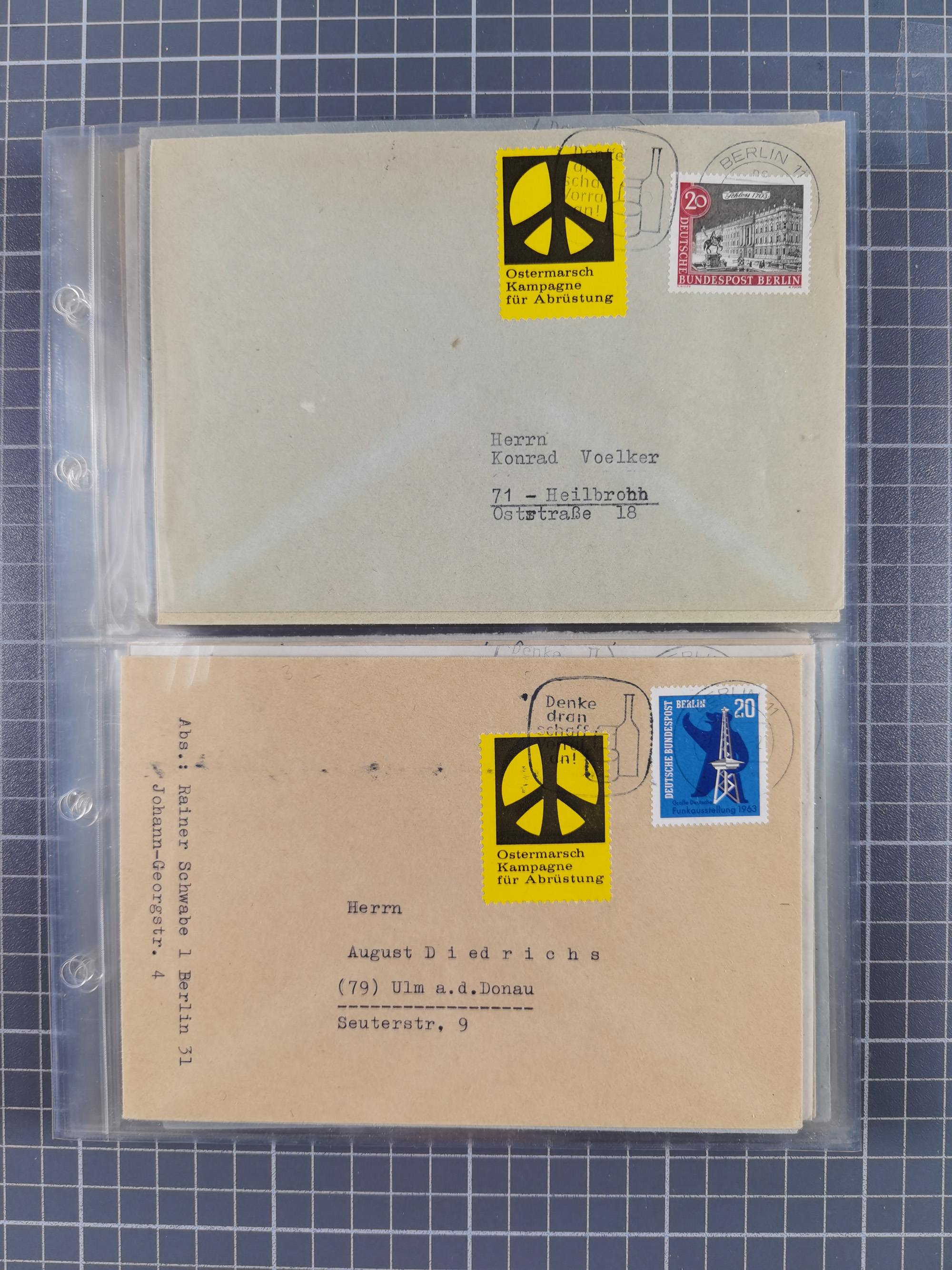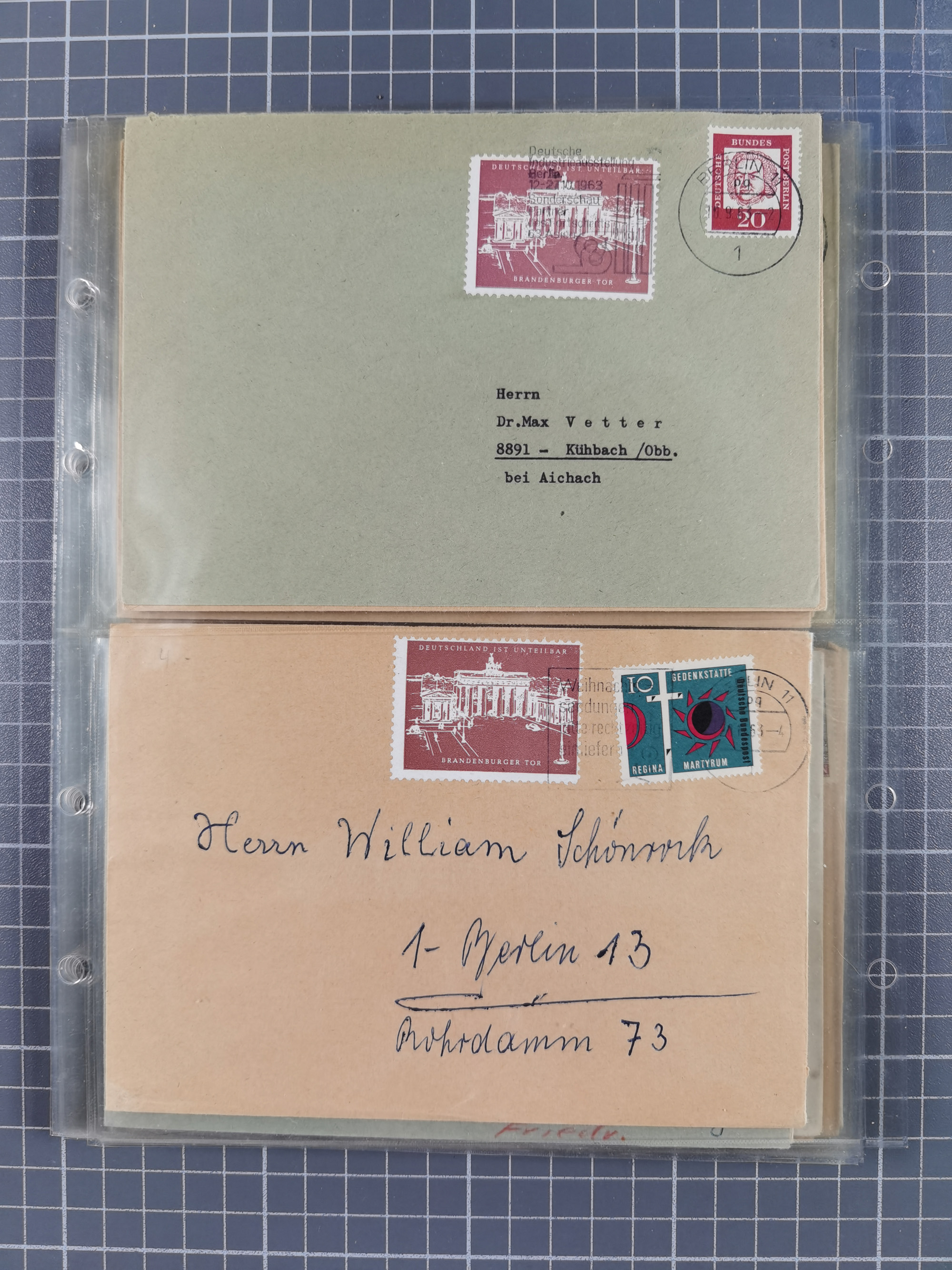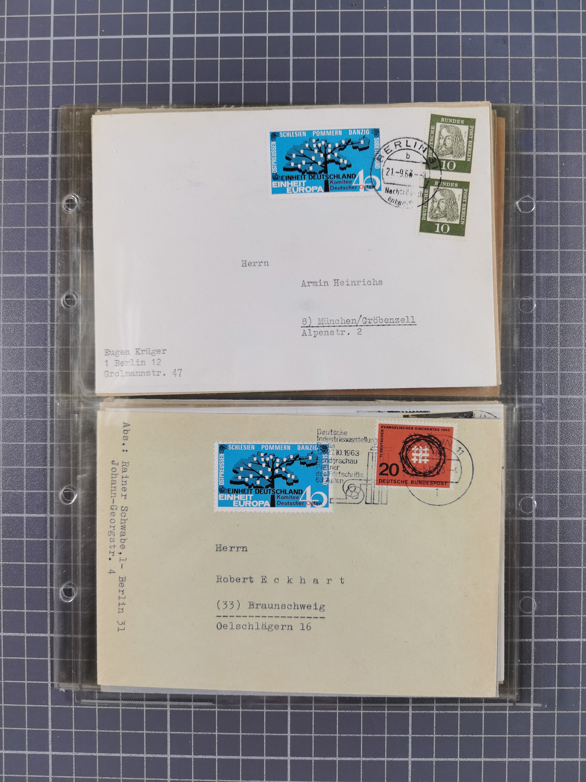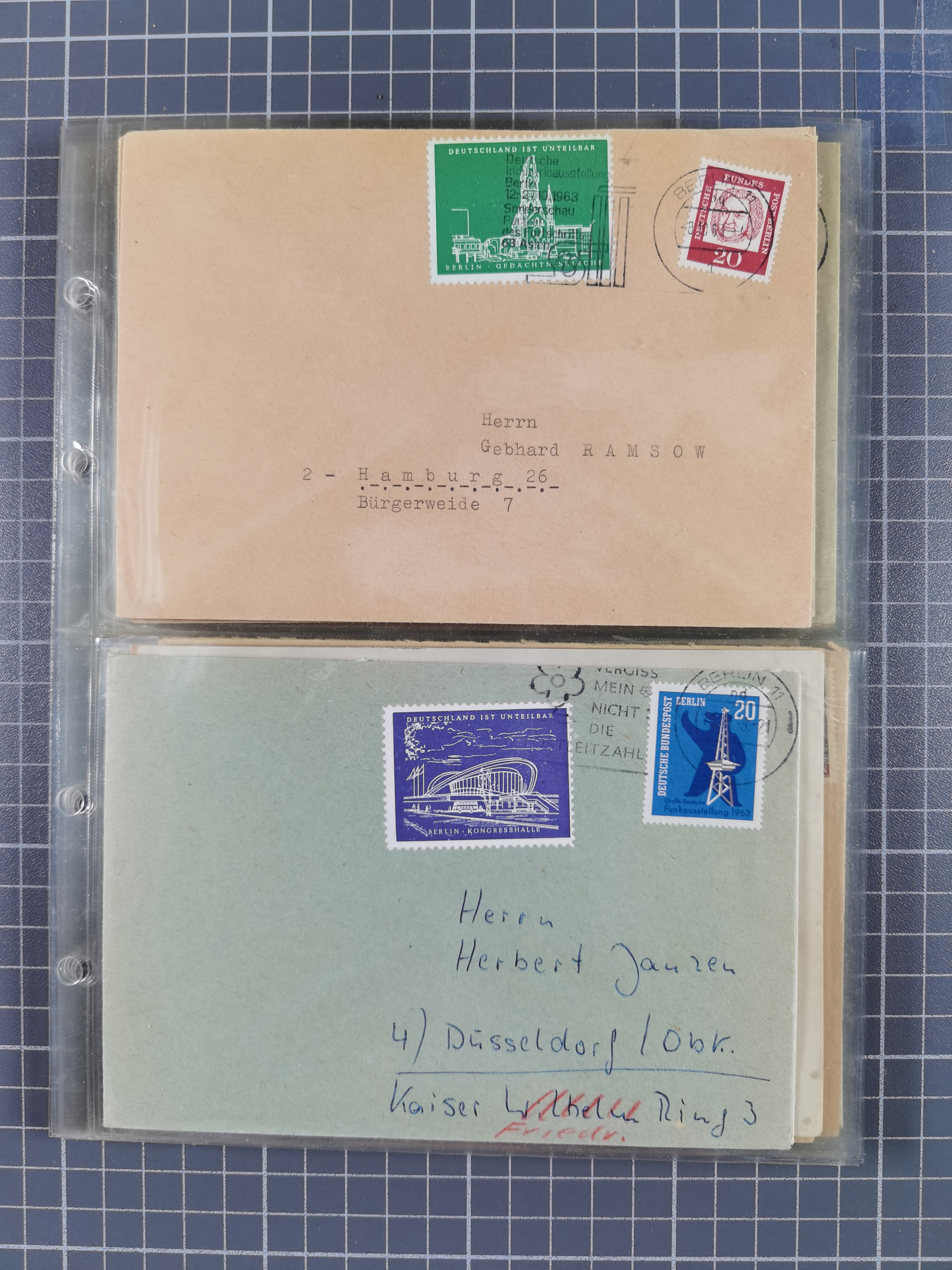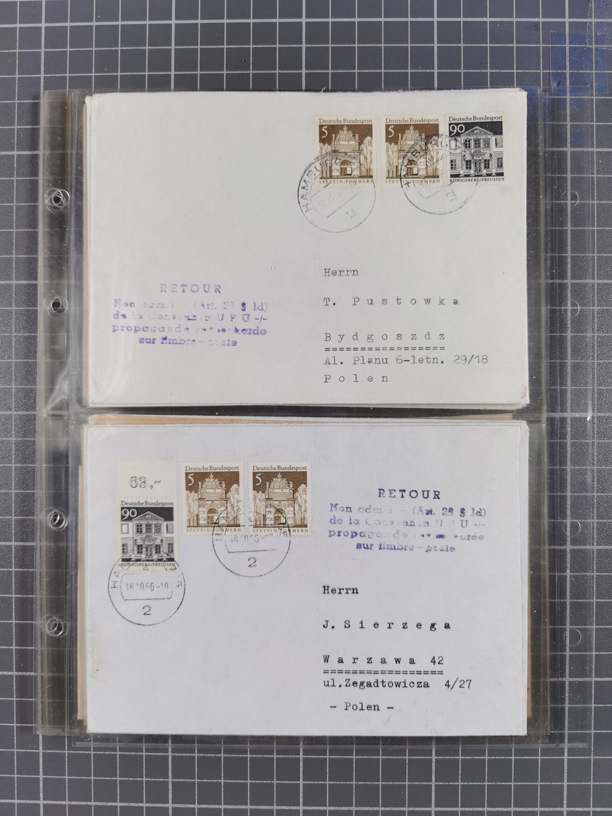 1962/64, Propaganda „Kalter Krieg", Sammlung von 277 Briefen, alle mit Propaganda-Vignetten versehen („Kampf um Wiedervereinigung". 17. Juni", „Die Mauer überwinden", Brücken bauen! Per Post oder Paket". „Wir lassen uns nicht trennen". 3 geteilt niemals!" usw. Alle Vignetten befinden sich auf Bedarfsbriefen und sind postalisch zusammen mit der Normalfrankatur abgestempelt, dabei auch 43 Luftpostbriefe, selten angeboten. Dazu noch 48 Belege Postkrieg".