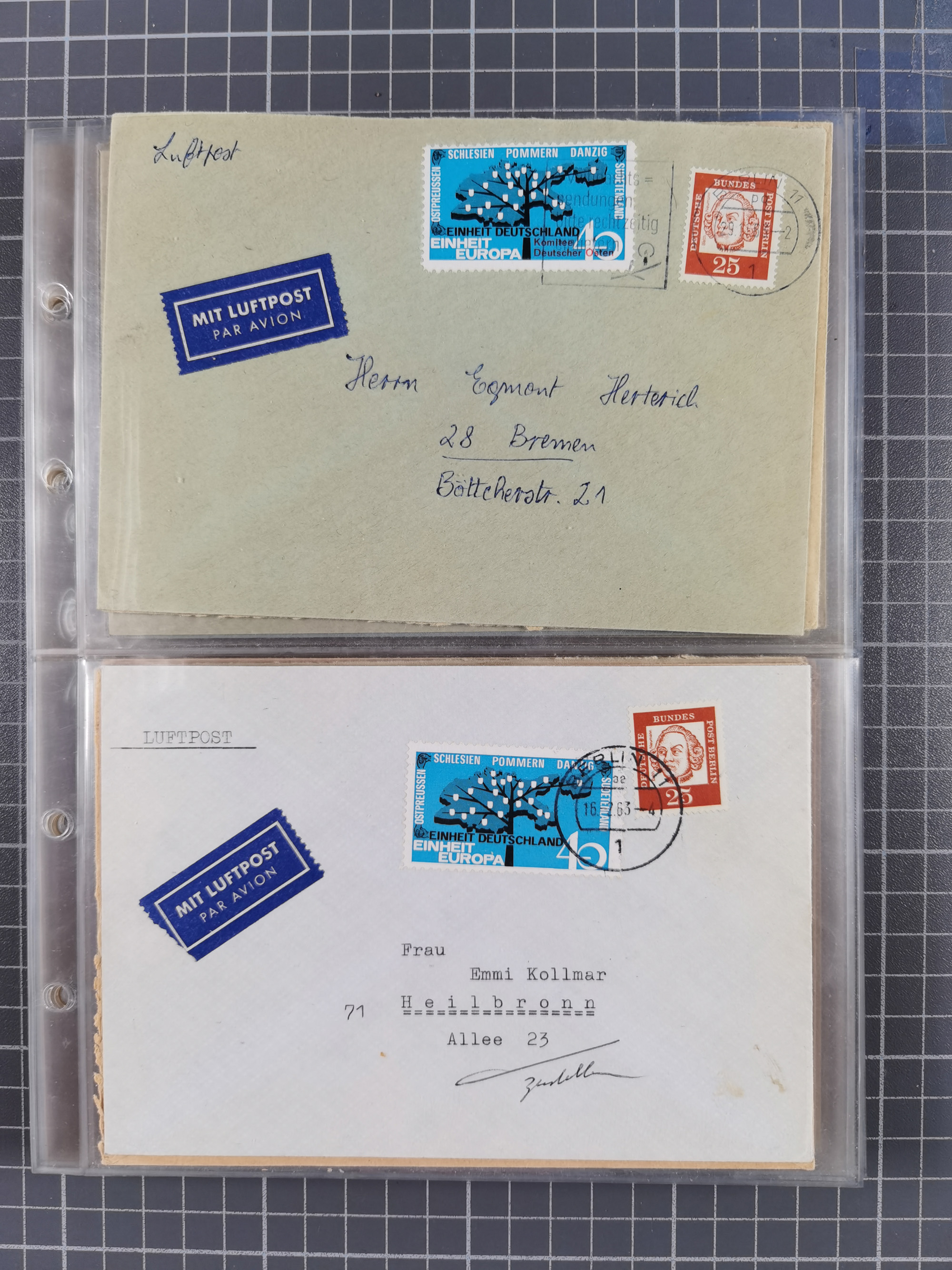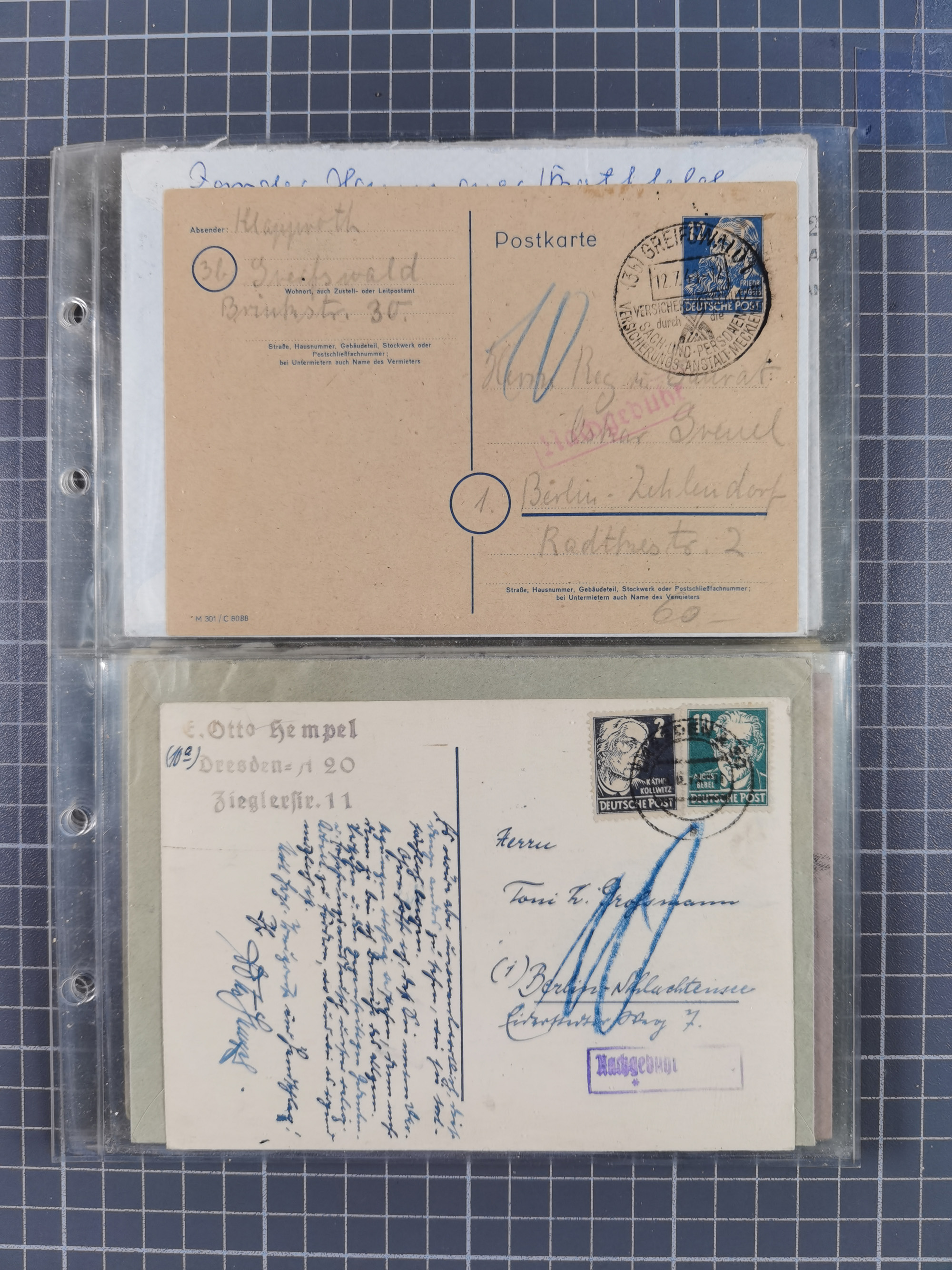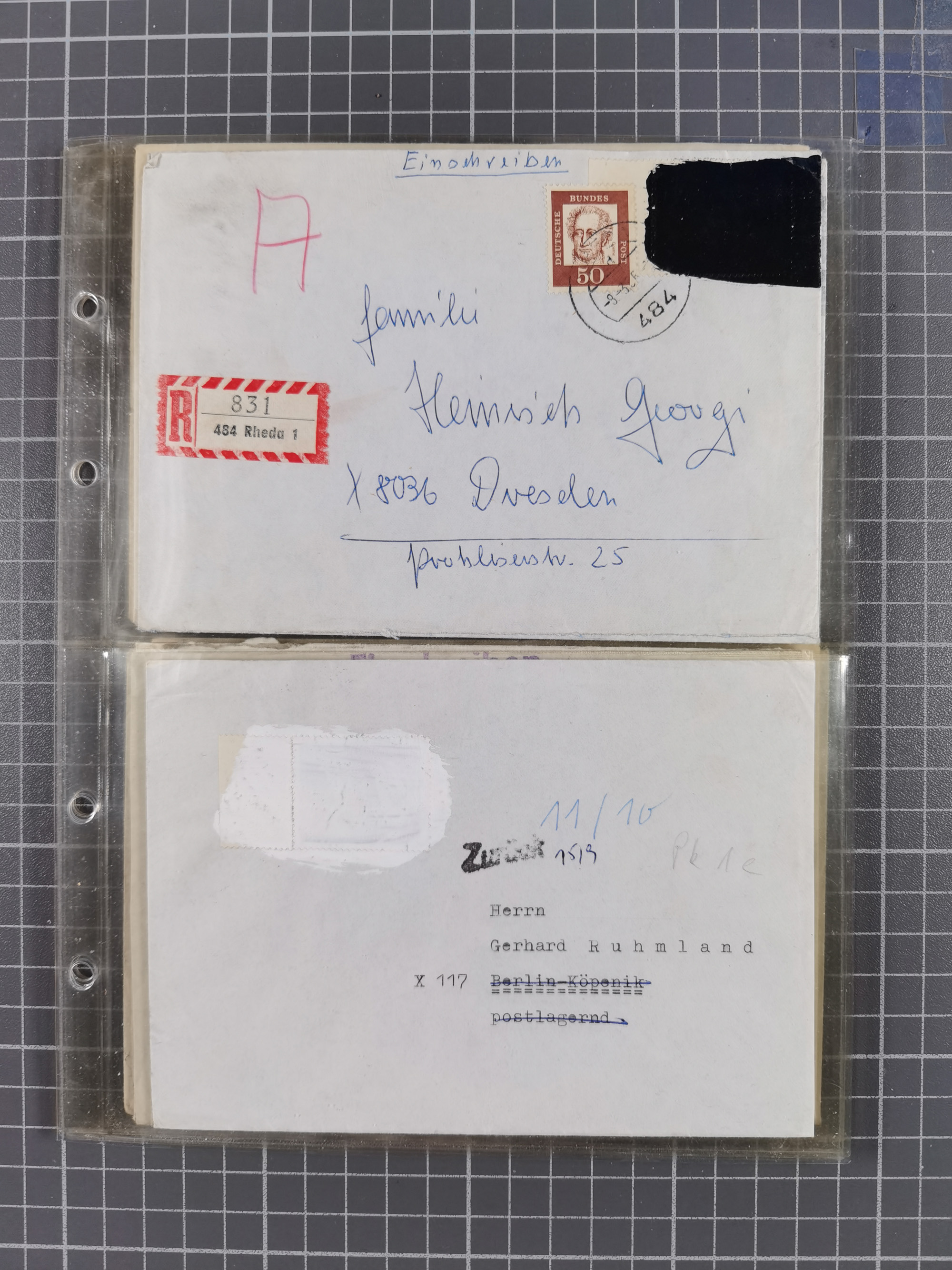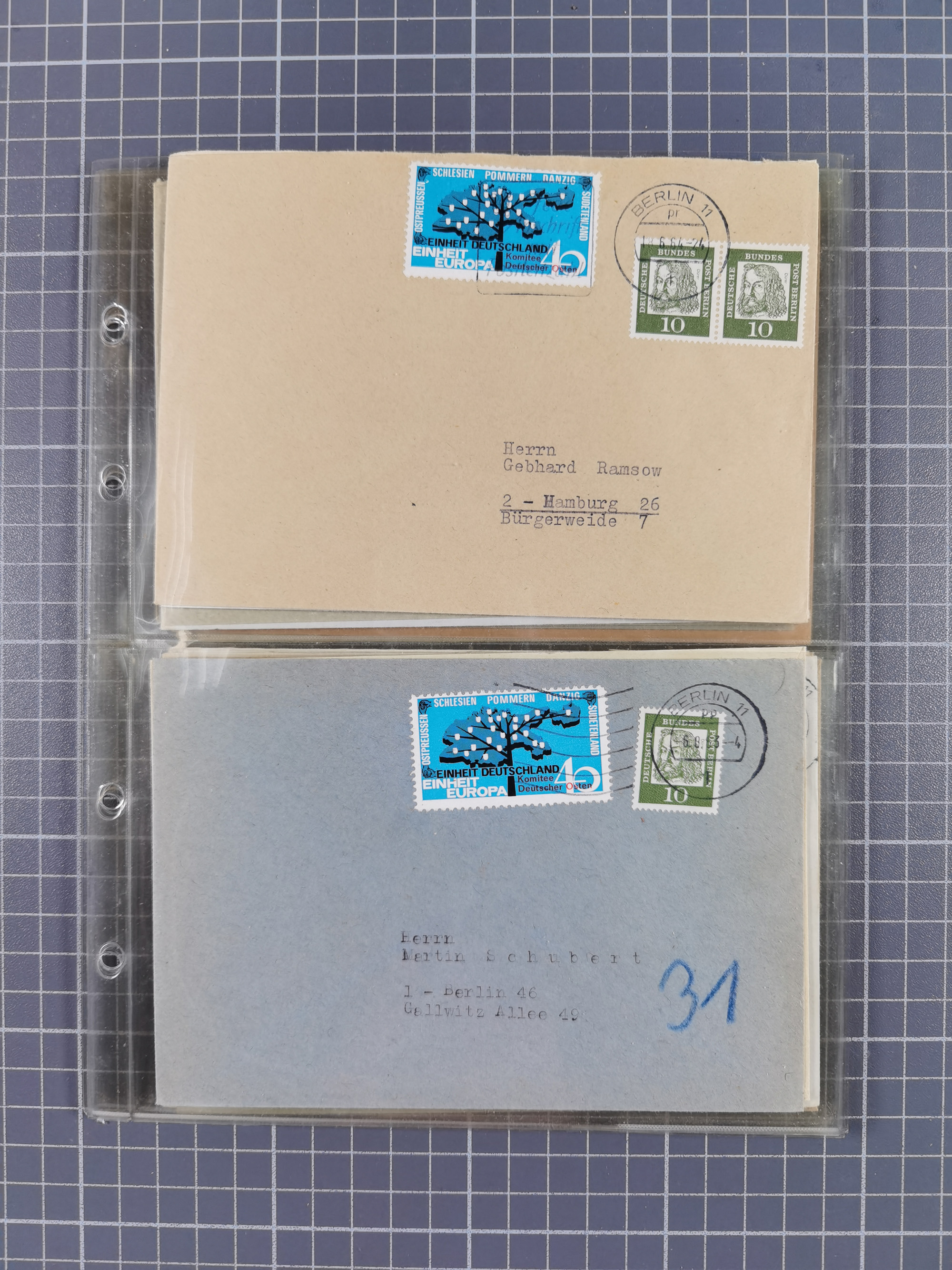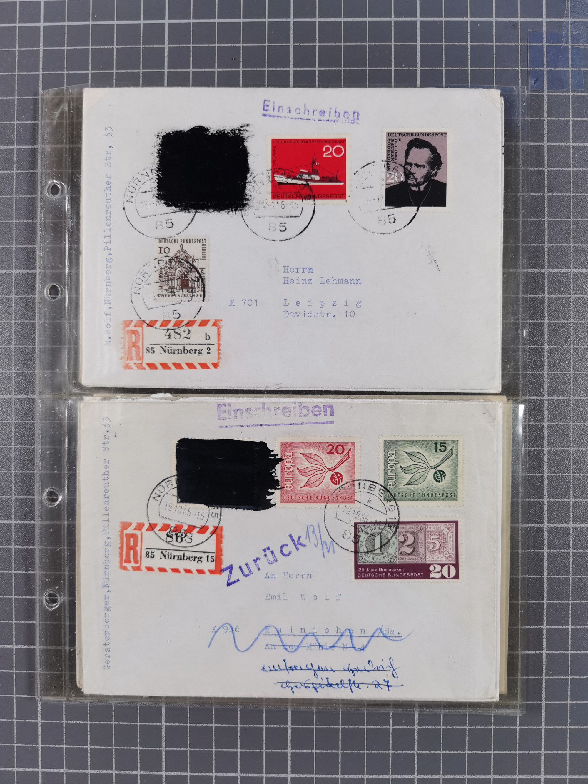 1962/64, Propaganda „Kalter Krieg", Sammlung von 277 Briefen, alle mit Propaganda-Vignetten versehen („Kampf um Wiedervereinigung". 17. Juni", „Die Mauer überwinden", Brücken bauen! Per Post oder Paket". „Wir lassen uns nicht trennen". 3 geteilt niemals!" usw. Alle Vignetten befinden sich auf Bedarfsbriefen und sind postalisch zusammen mit der Normalfrankatur abgestempelt, dabei auch 43 Luftpostbriefe, selten angeboten. Dazu noch 48 Belege Postkrieg".