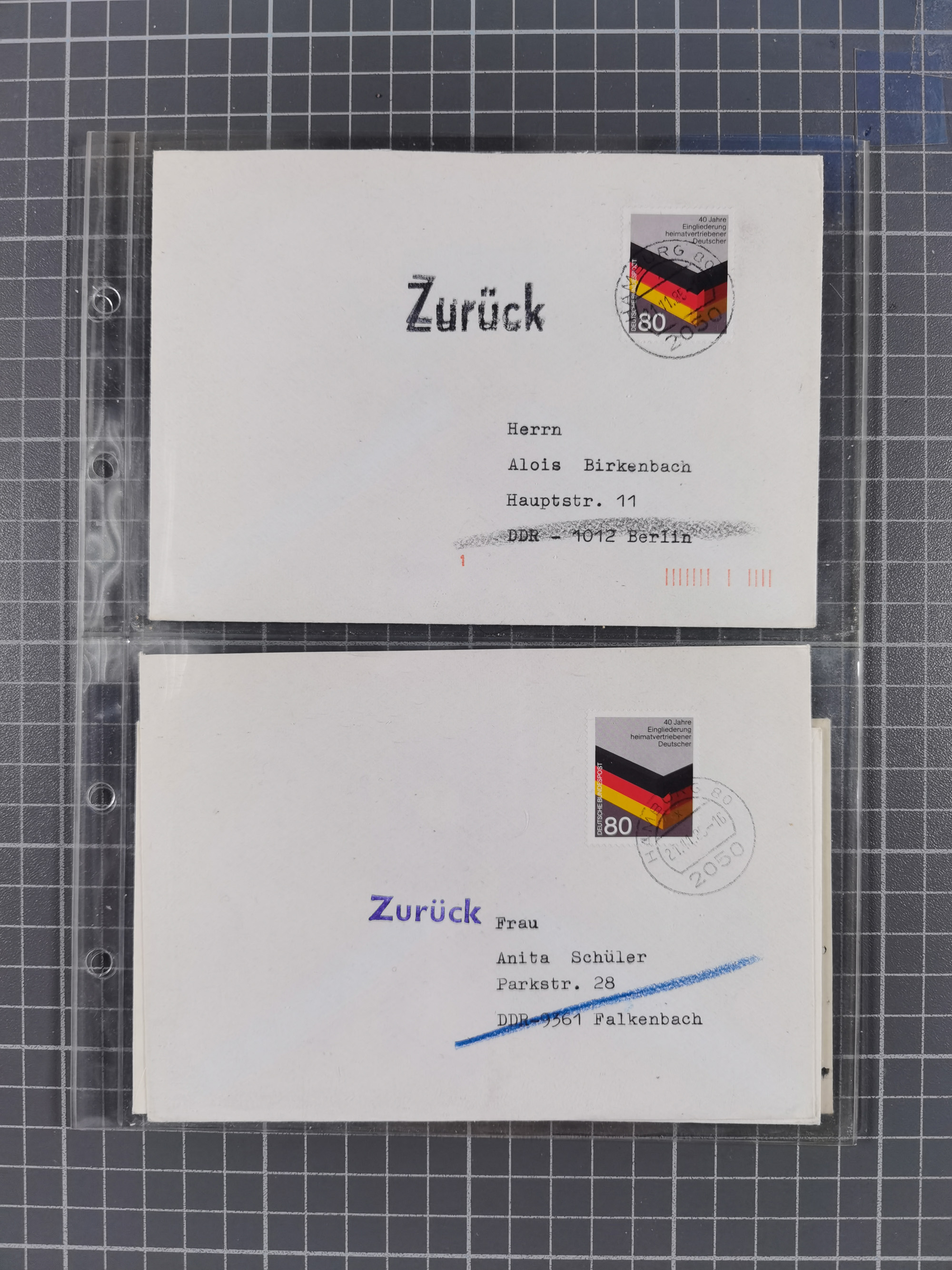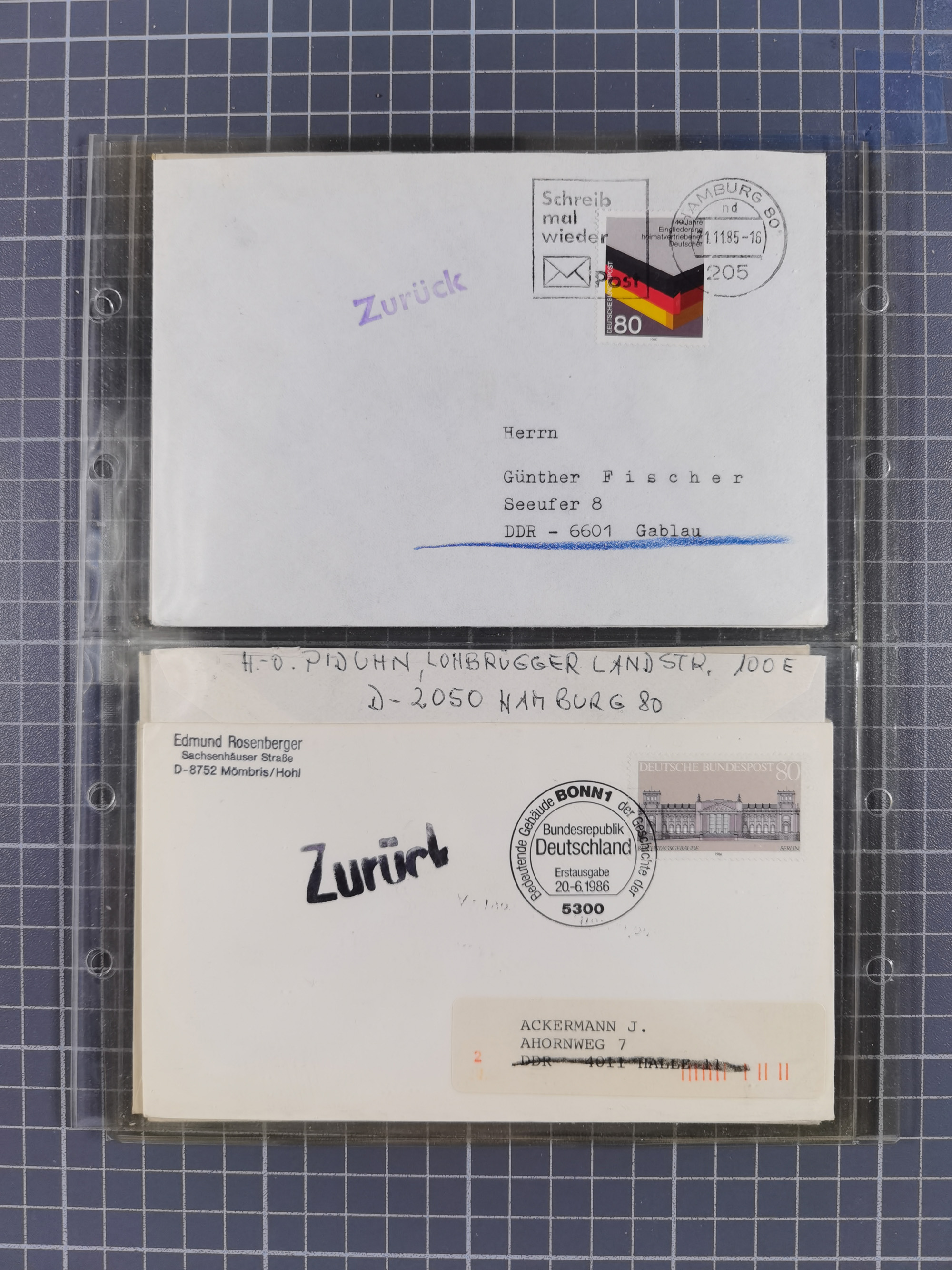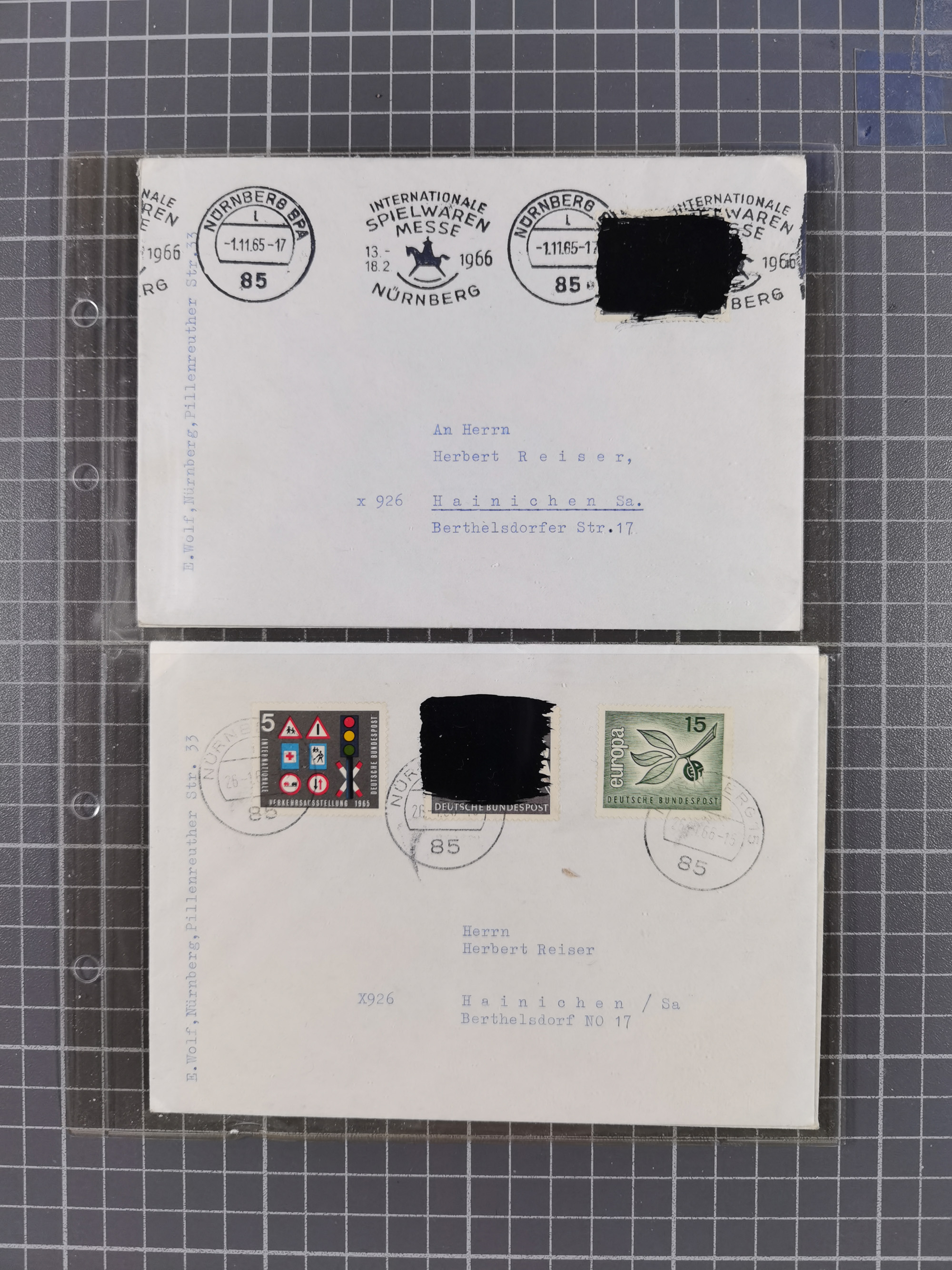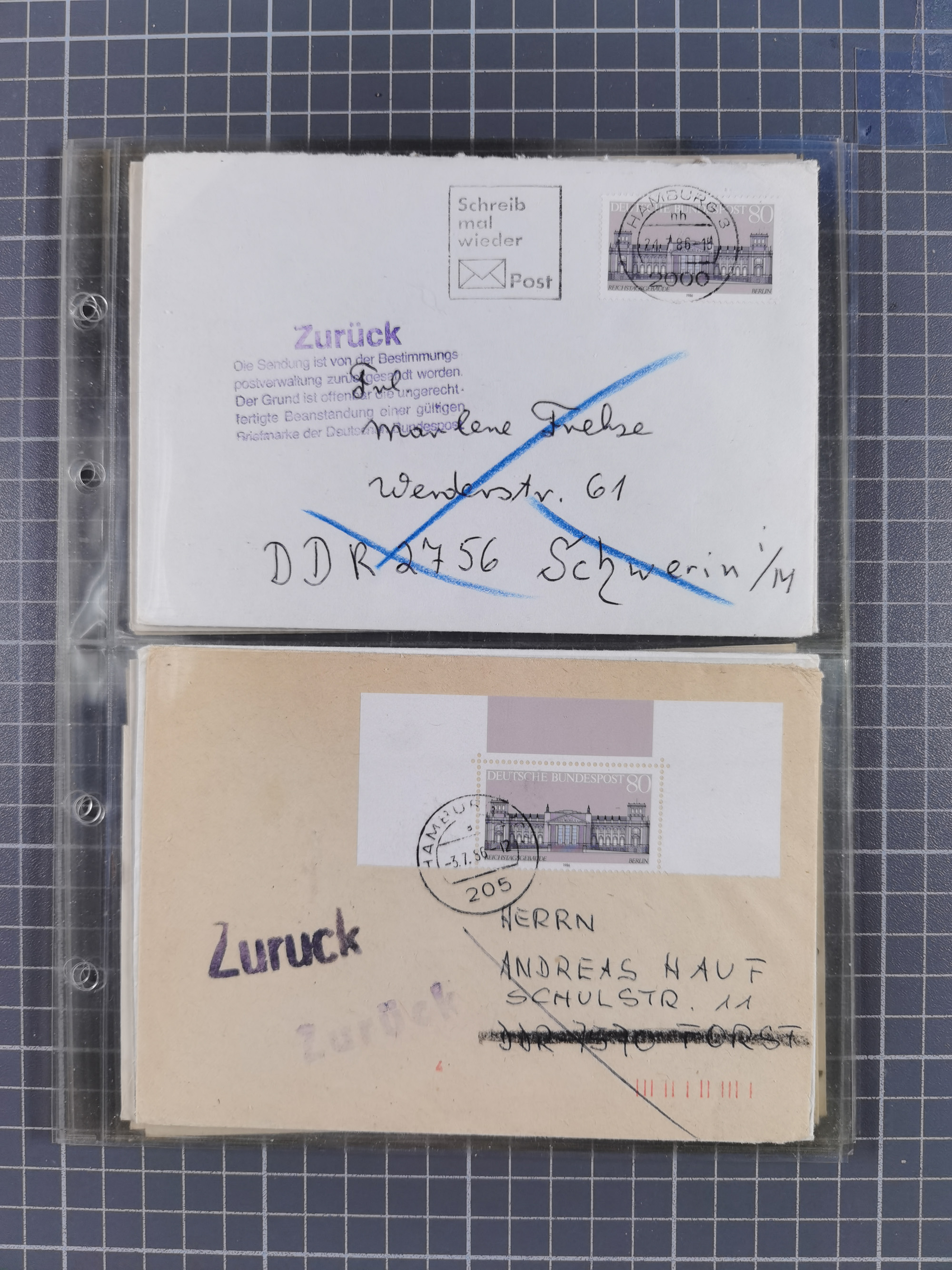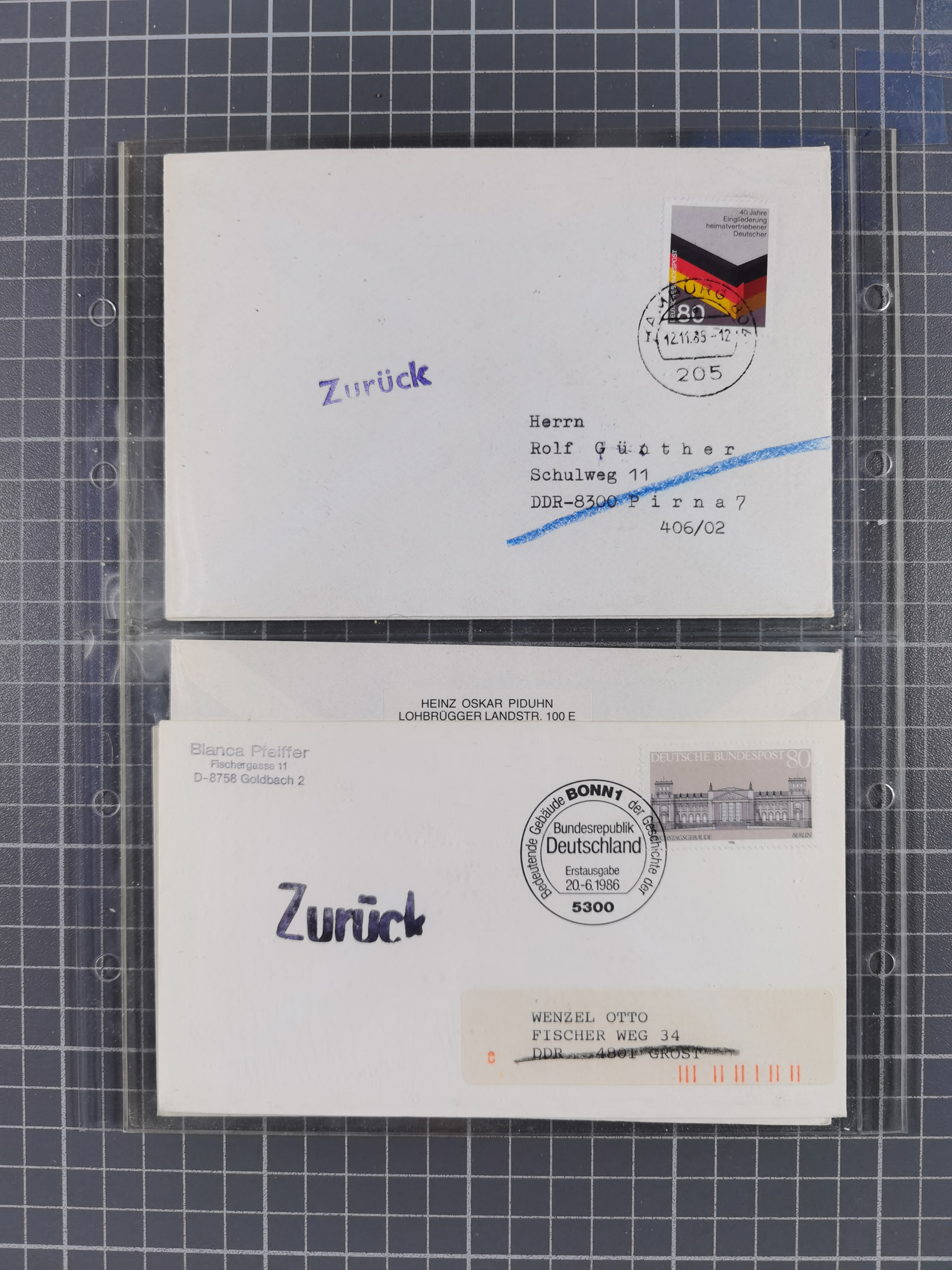 1962/64, Propaganda „Kalter Krieg", Sammlung von 277 Briefen, alle mit Propaganda-Vignetten versehen („Kampf um Wiedervereinigung". 17. Juni", „Die Mauer überwinden", Brücken bauen! Per Post oder Paket". „Wir lassen uns nicht trennen". 3 geteilt niemals!" usw. Alle Vignetten befinden sich auf Bedarfsbriefen und sind postalisch zusammen mit der Normalfrankatur abgestempelt, dabei auch 43 Luftpostbriefe, selten angeboten. Dazu noch 48 Belege Postkrieg".