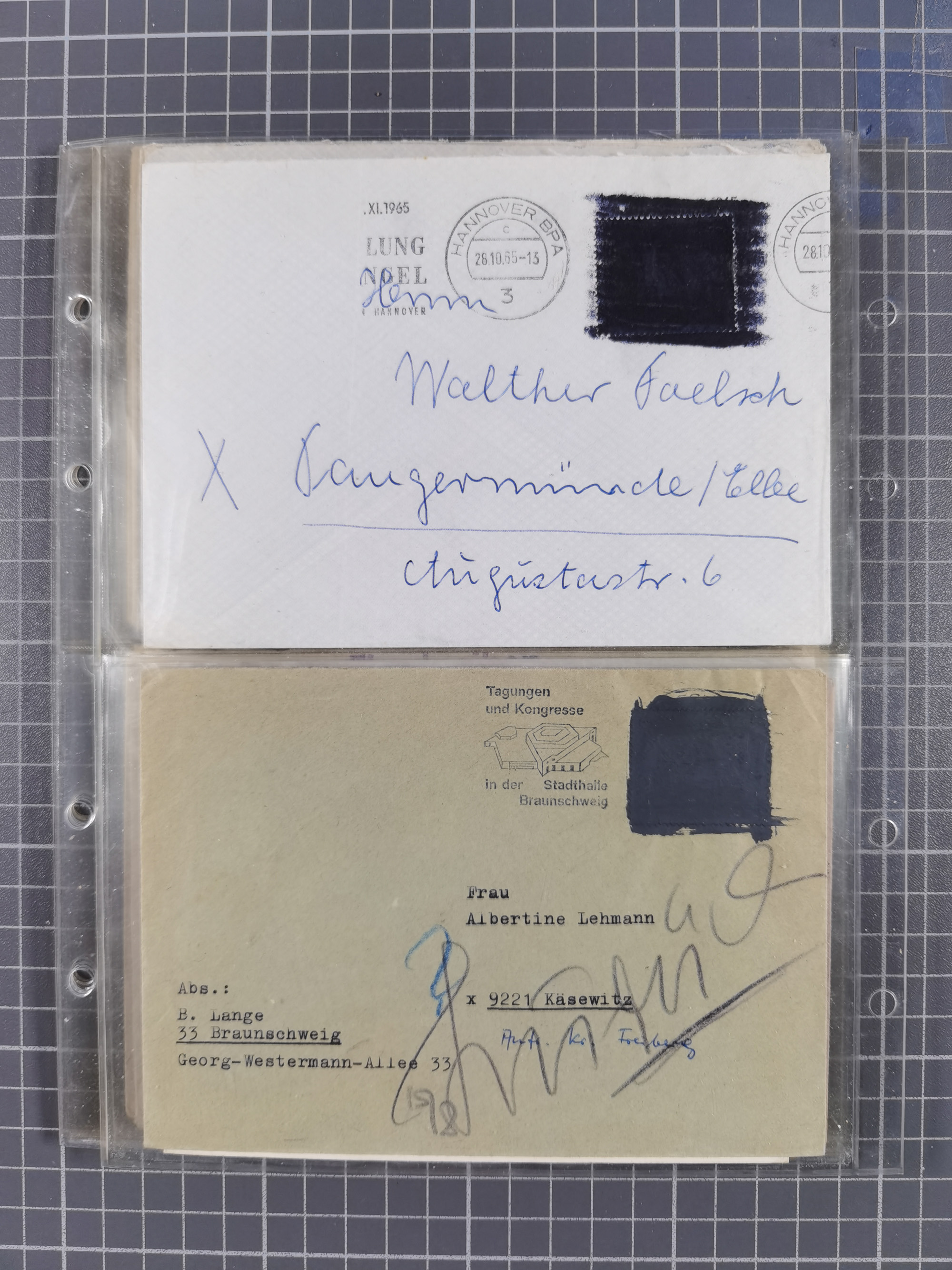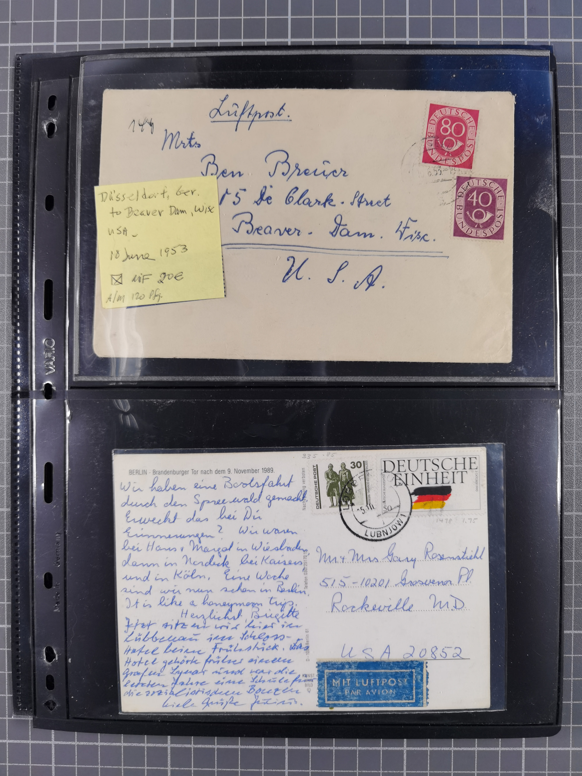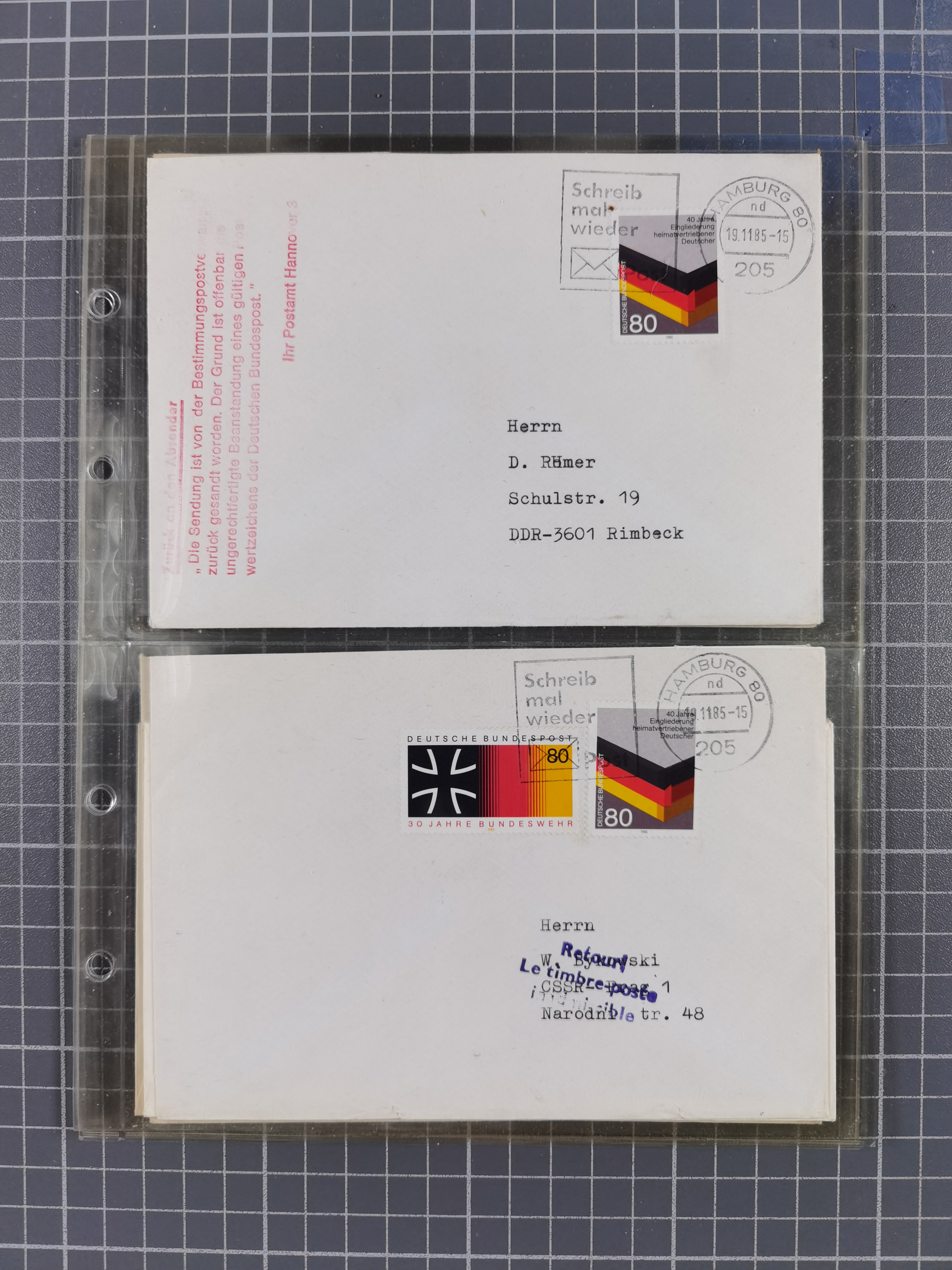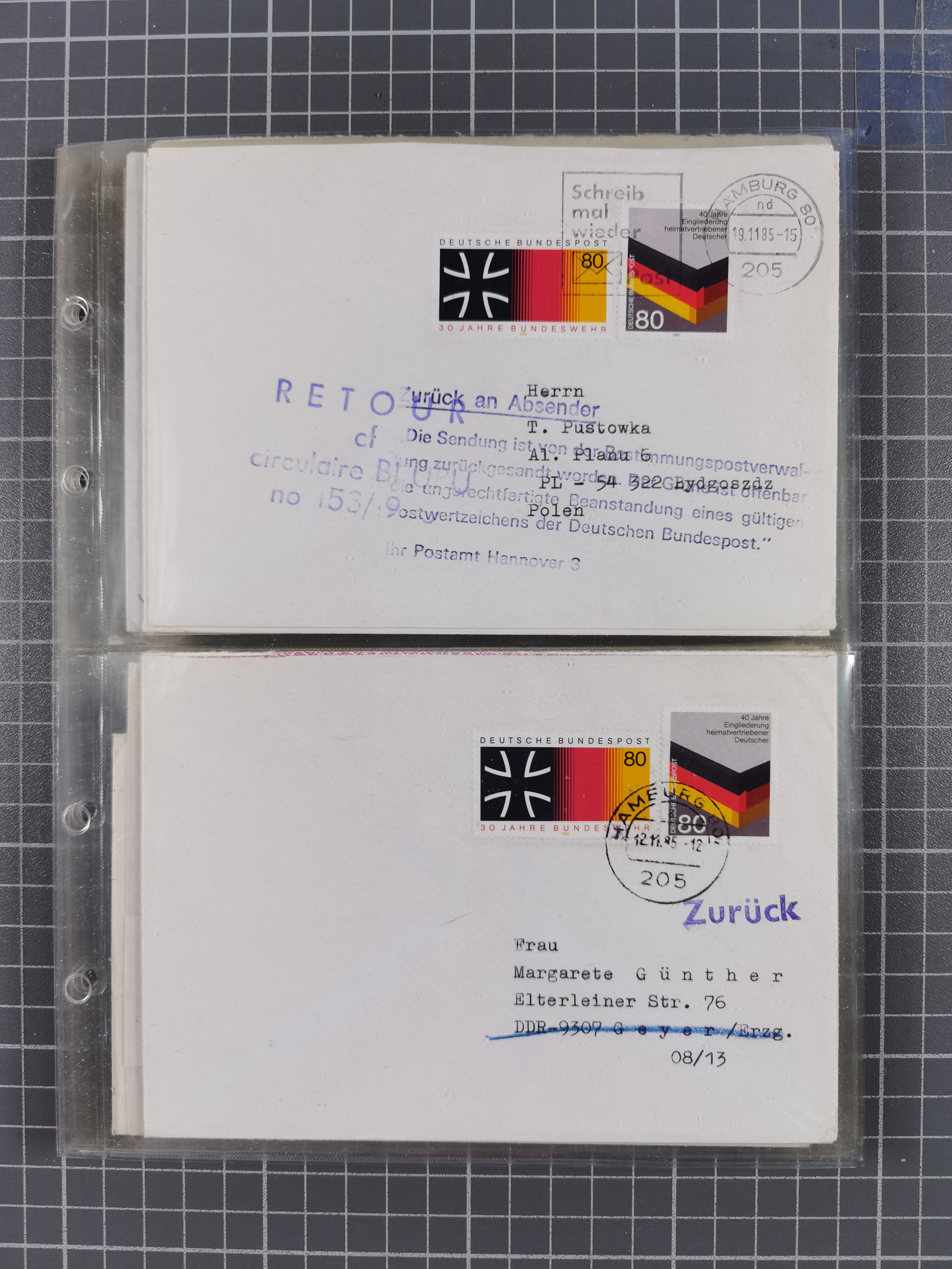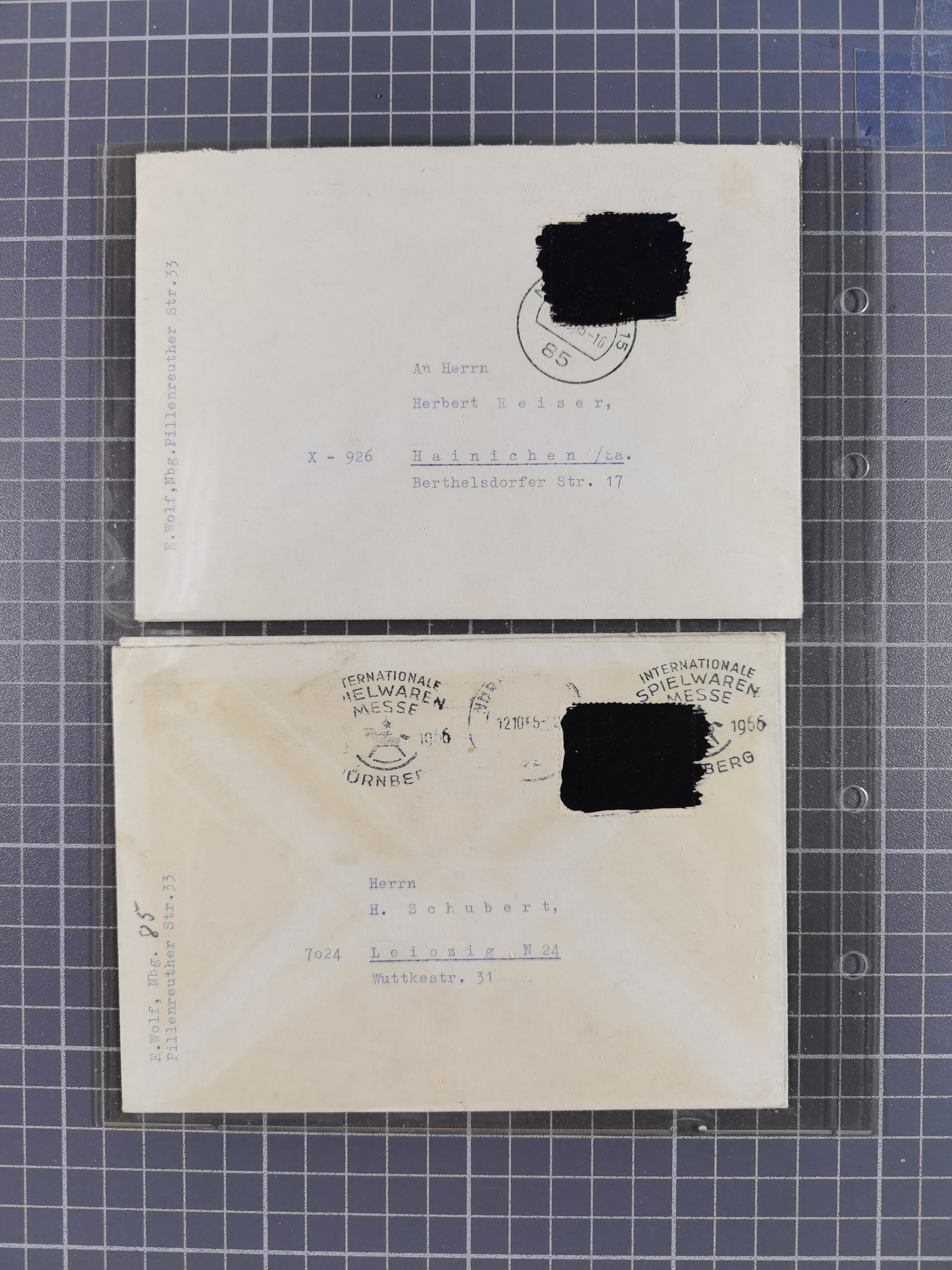 1962/64, Propaganda „Kalter Krieg", Sammlung von 277 Briefen, alle mit Propaganda-Vignetten versehen („Kampf um Wiedervereinigung". 17. Juni", „Die Mauer überwinden", Brücken bauen! Per Post oder Paket". „Wir lassen uns nicht trennen". 3 geteilt niemals!" usw. Alle Vignetten befinden sich auf Bedarfsbriefen und sind postalisch zusammen mit der Normalfrankatur abgestempelt, dabei auch 43 Luftpostbriefe, selten angeboten. Dazu noch 48 Belege Postkrieg".