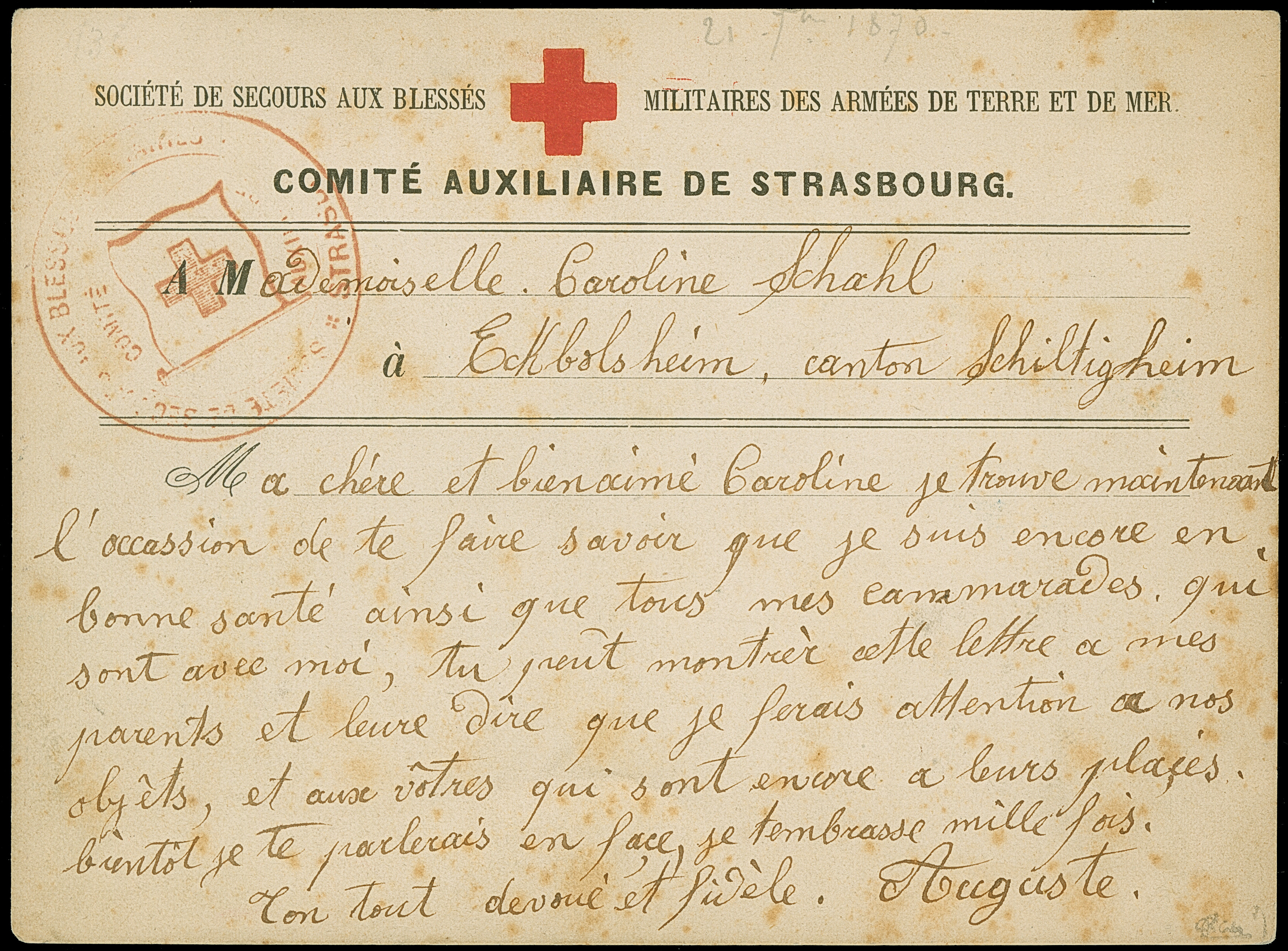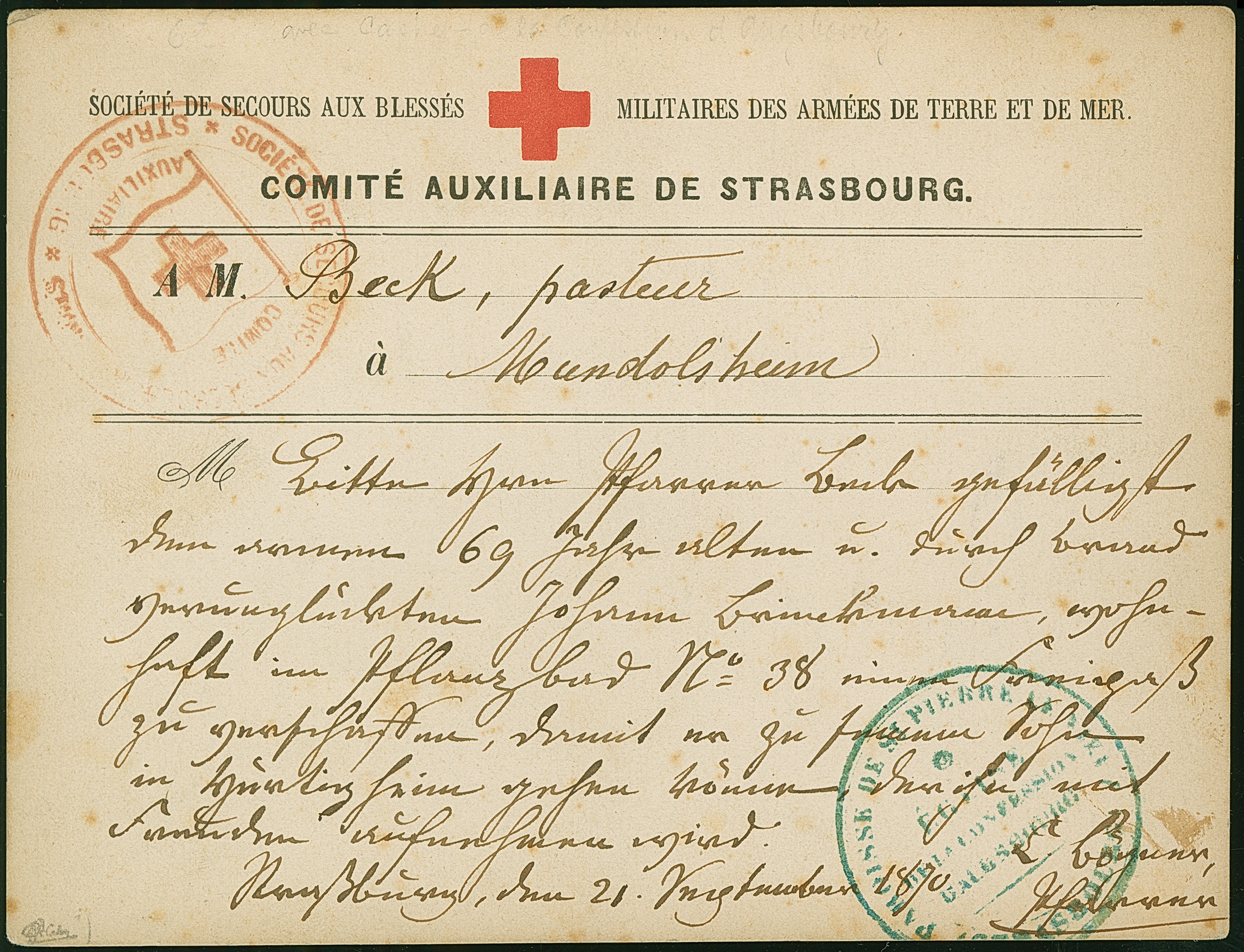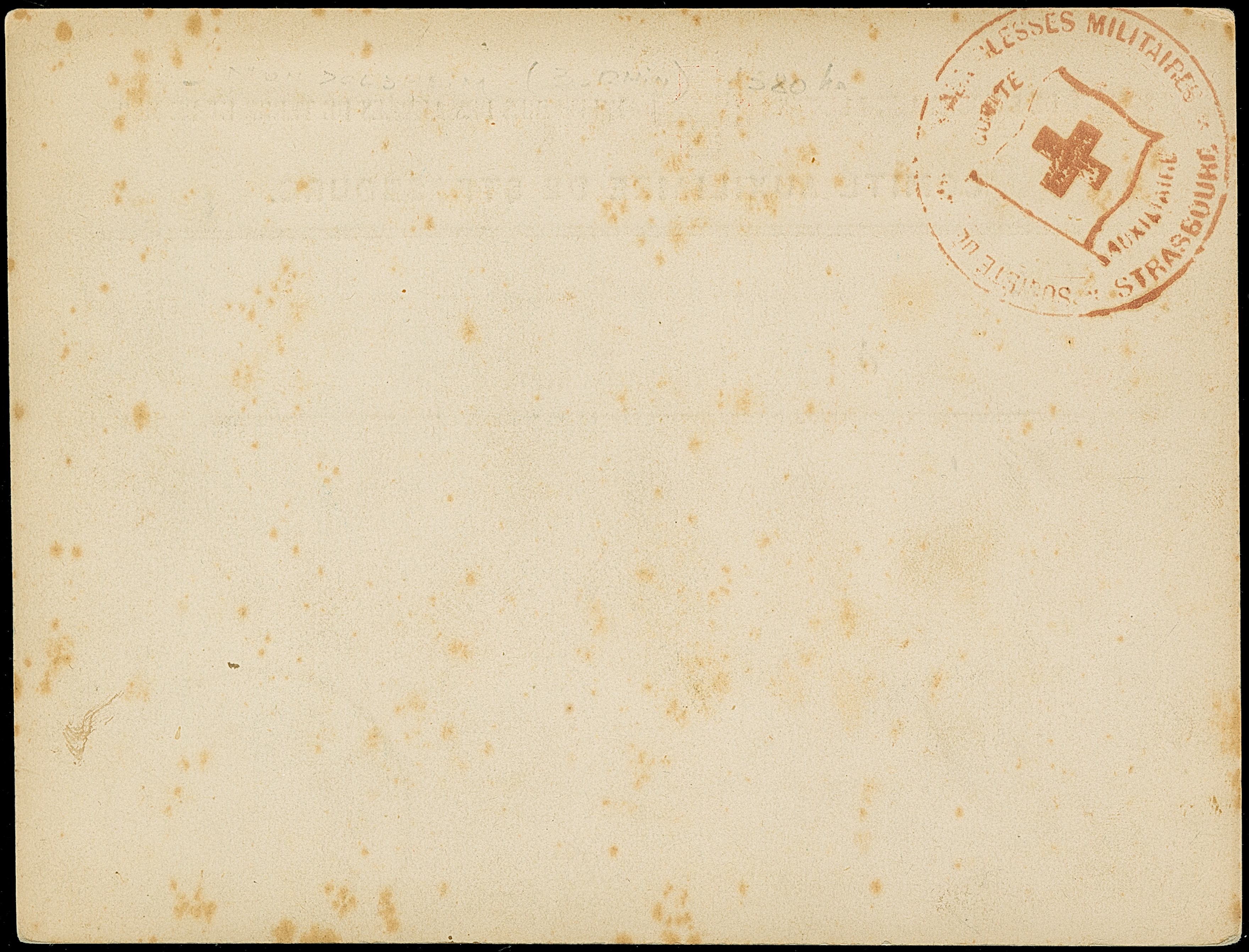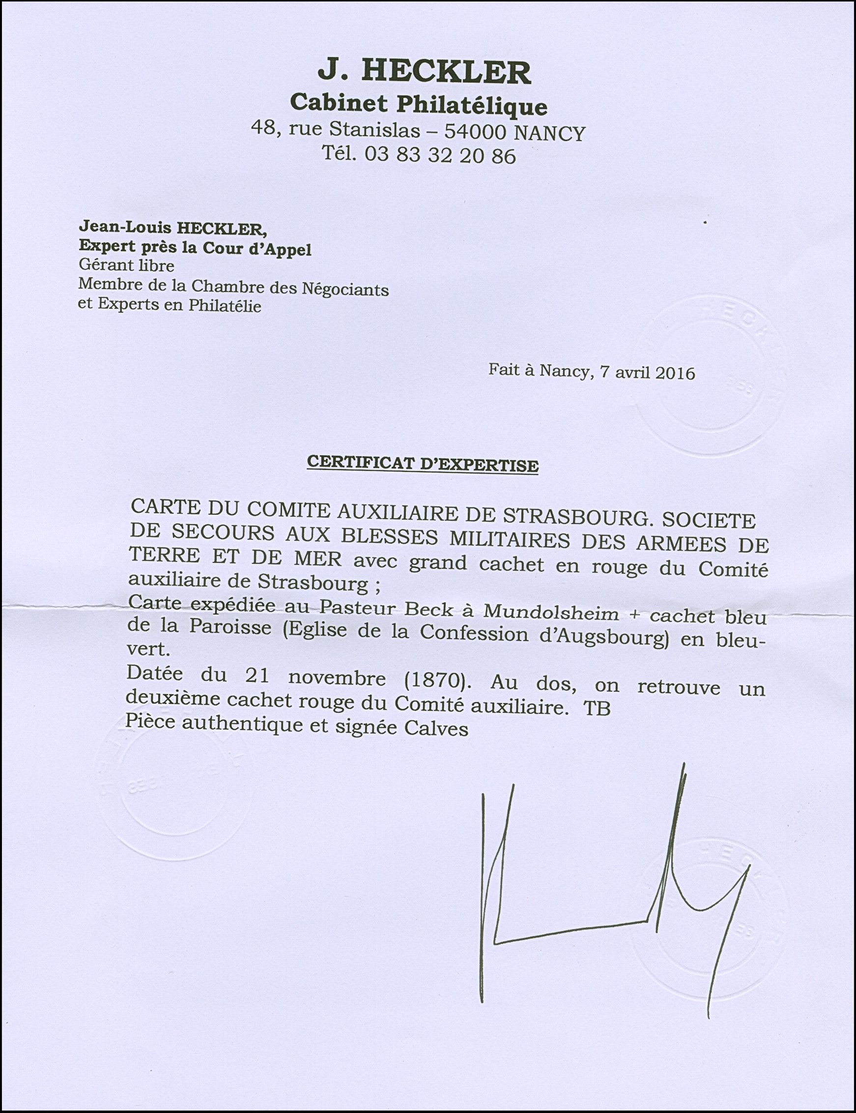FRANCO-PRUSSIAN WAR: “COMITÉ AUXILIAIRE DE STRASBOURG” Private formula card addressed to Mundolsheim with large red ornamented handstamp “SOCIÉTÉ DE SECOURS AUX BLESSÉS MILITAIRES / COMITÉ AUXILIAIRE STRASBOURG” (repeated on reverse) and blue cachet “PAROISSE DE ST PIERRE”, except for some peripheral toning, fine. A very scarce card, signed Calves and certificate Heckler (2016)