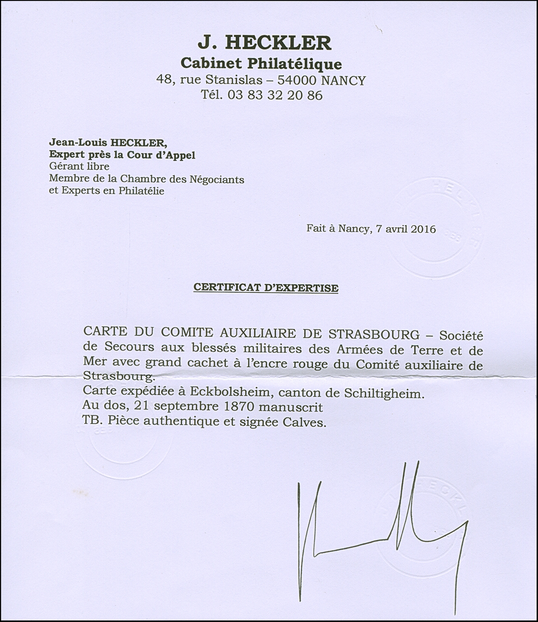FRANCO-PRUSSIAN WAR: “COMITÉ AUXILIAIRE DE STRASBOURG” Private formula card addressed to Eckbolsheim with large red ornamented handstamp “SOCIÉTÉ DE SECOURS AUX BLESSÉS MILITAIRES / COMITÉ AUXILIAIRE STRASBOURG”, dated in manuscript on reverse “le 21 septembre 1870”, some overall toning. Those cards have been printed by the Strasbourg Red Cross Auxiliary Committee during the siege of the city in August/September 1870. Signed Calves and certificate Heckler (2016)