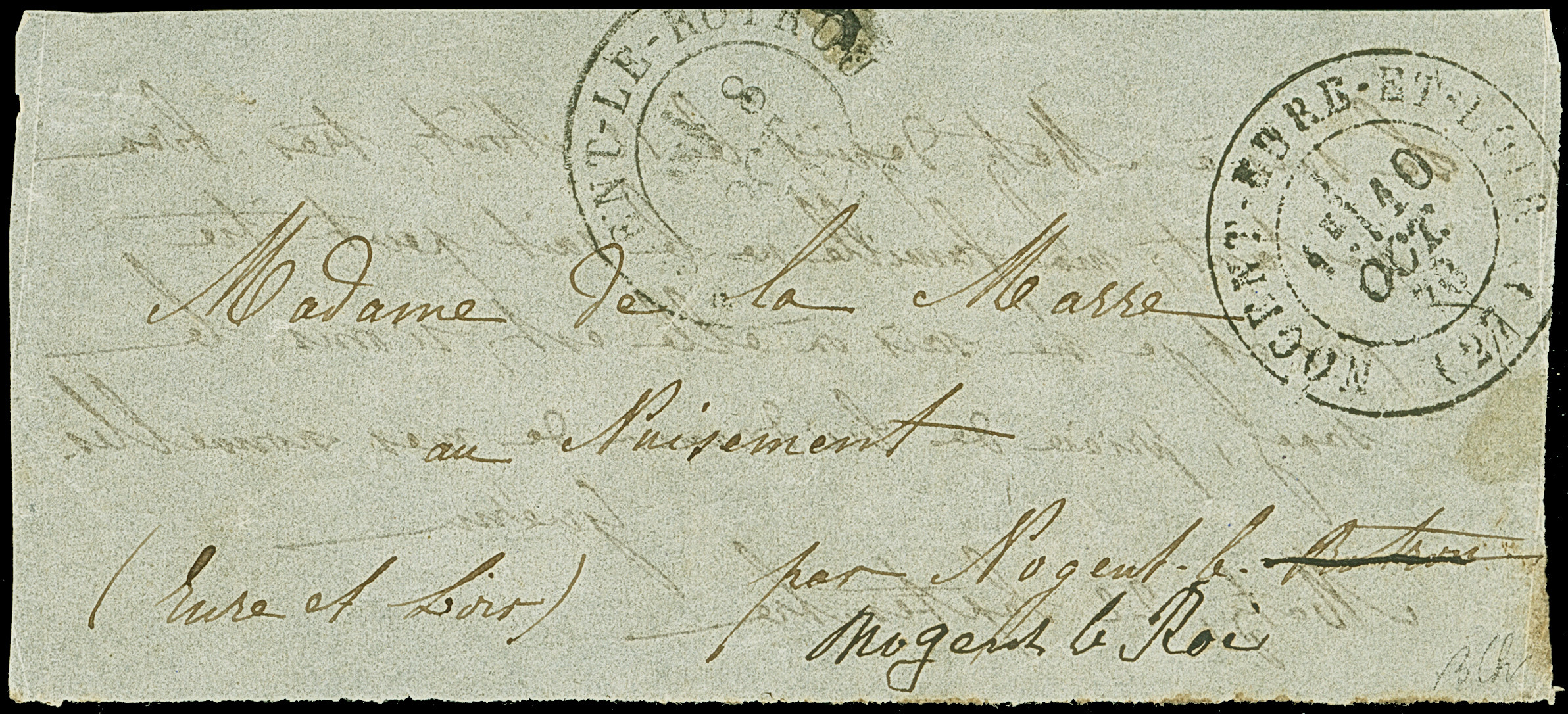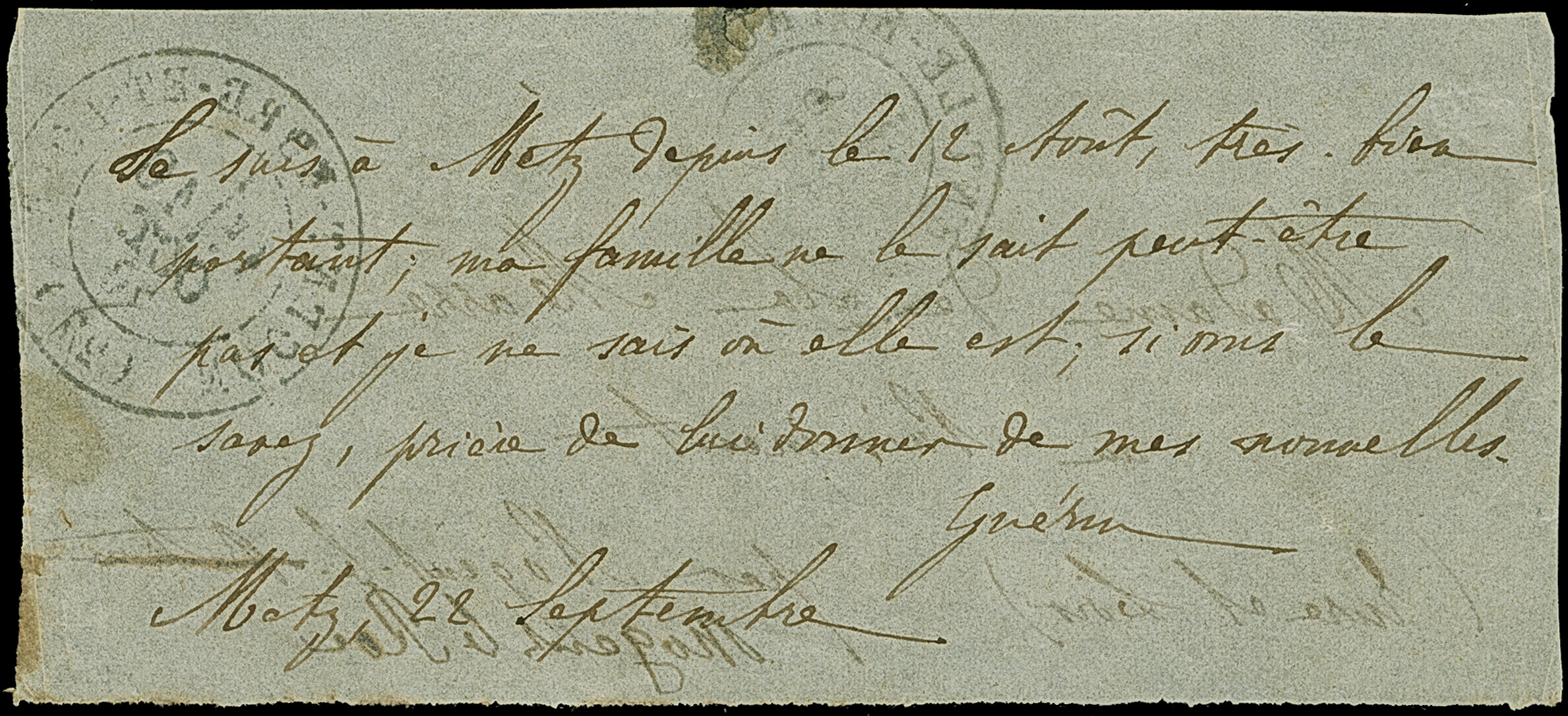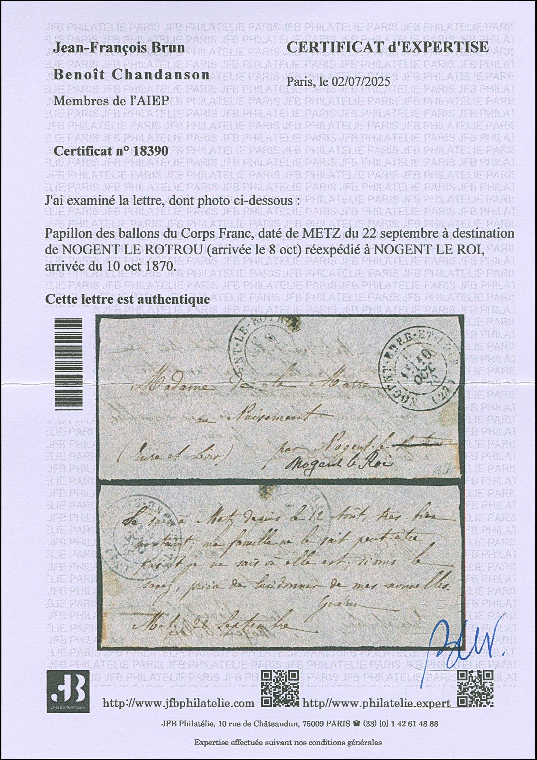 PAPILLON DE METZ: small flimsy letter dated “Metz, 28 septembre”, addressed to “NOGENT LE ROTROU” with arrival cds., from there redirected to Nogent le Roi with final arrival cds. “NOGENT-EURE-ET-LOIRE 10 OCT. 70”, fine. A quite extraordinary balloon from the so-called Corps Franc, possibly unique as redirected with two different postmarks, certificate Brun (2025)