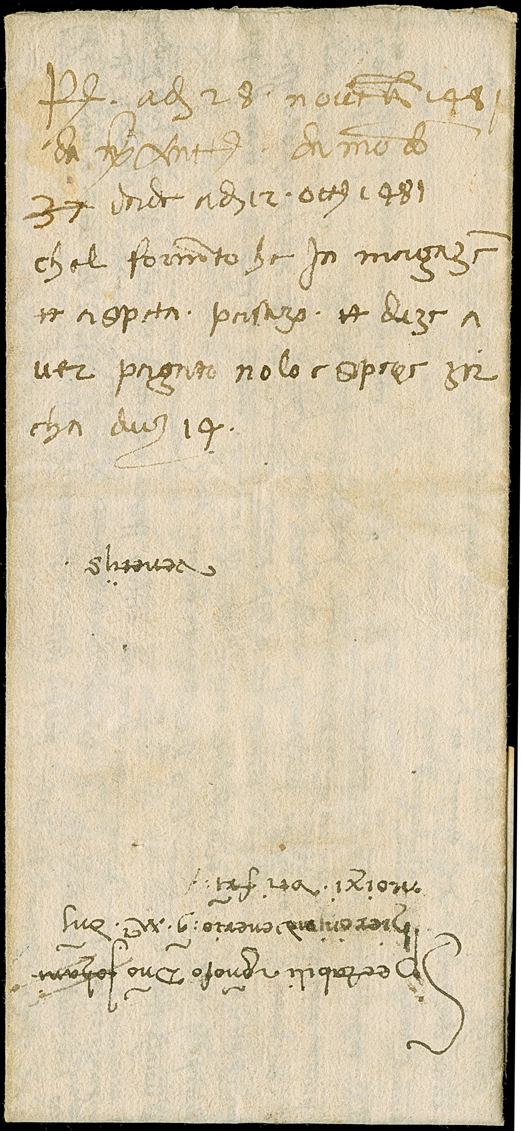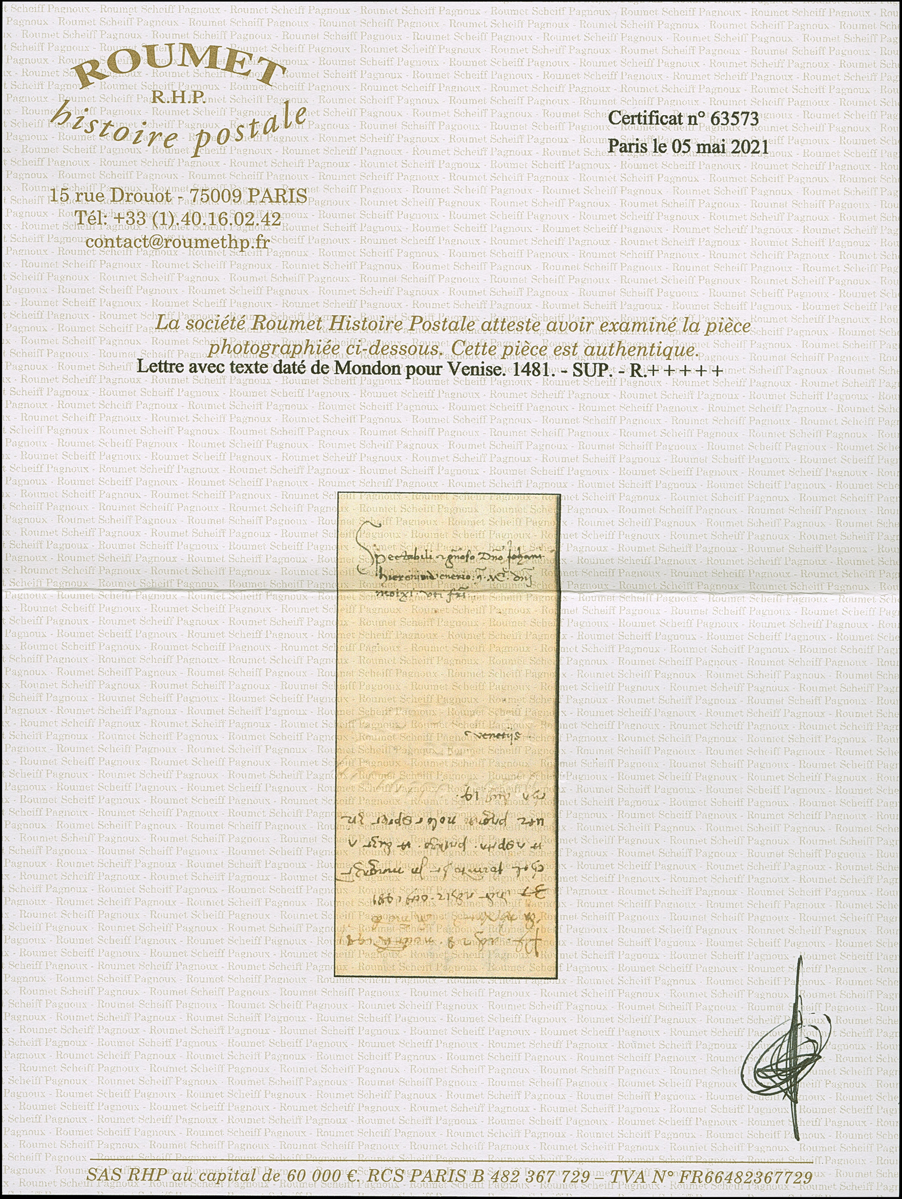 1481, merchant's letter written in Mondon on 28. November 1481 via Lyon to Venice, early forerunner from France to Italy carried by commercial merchant courier service, Cert. Roumet (2021)